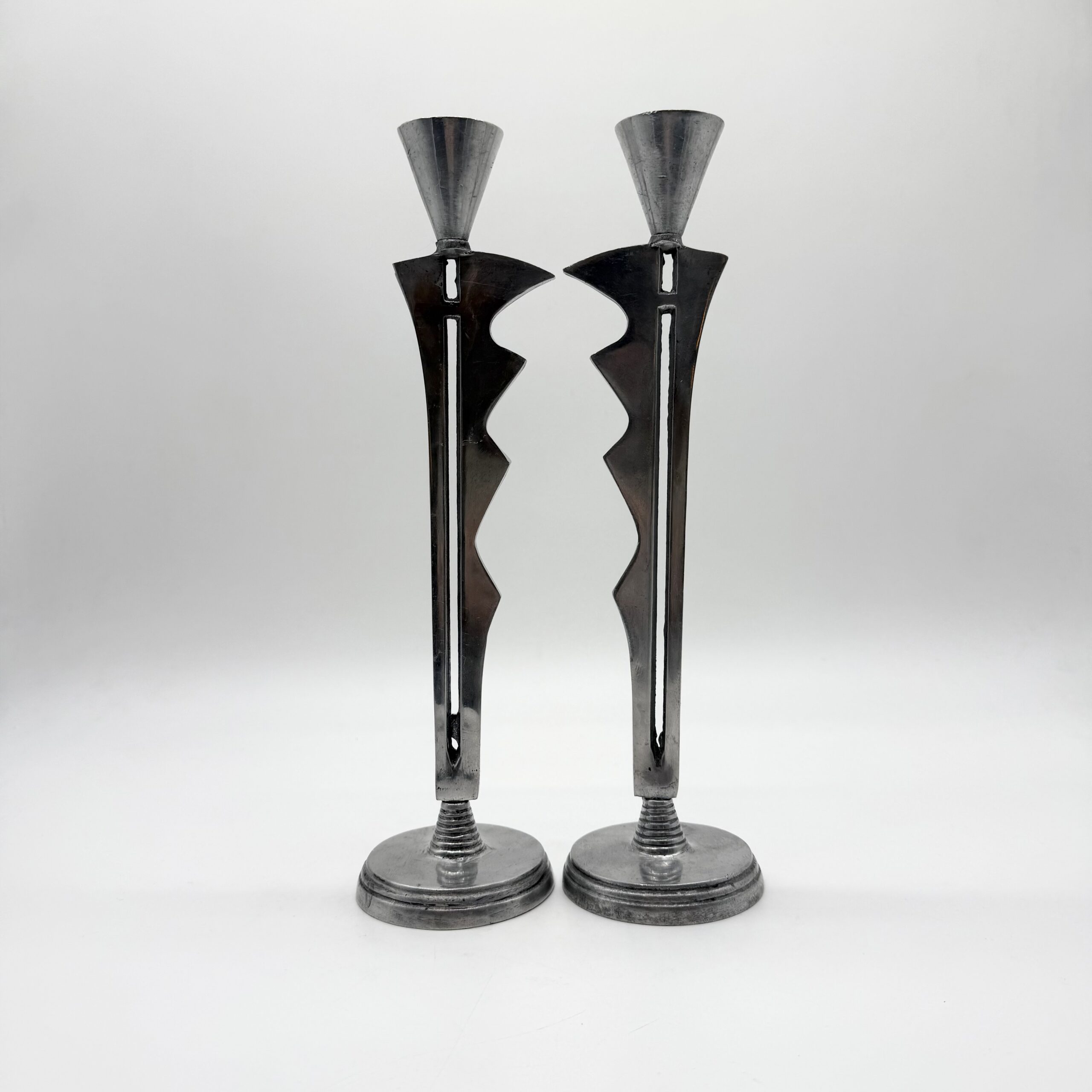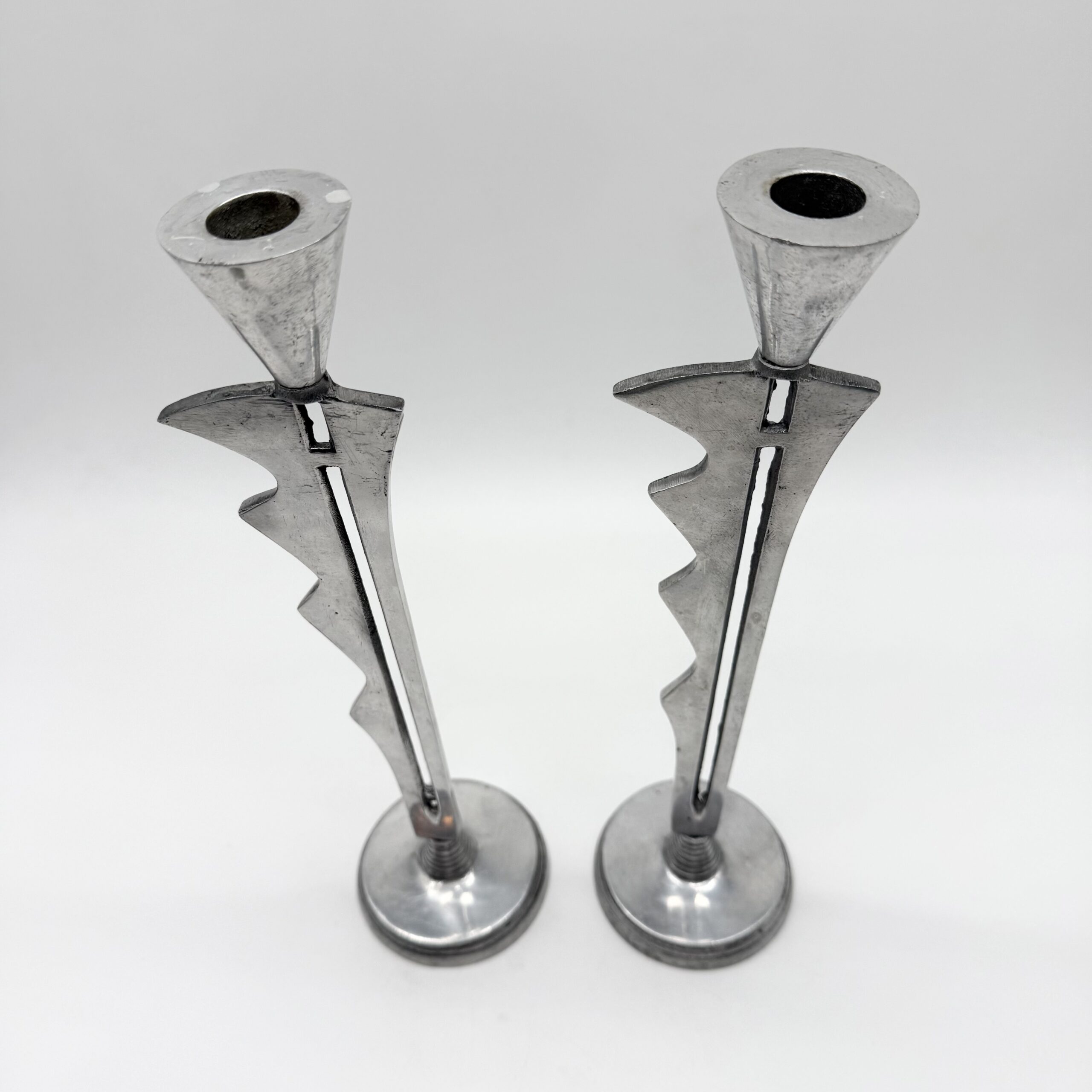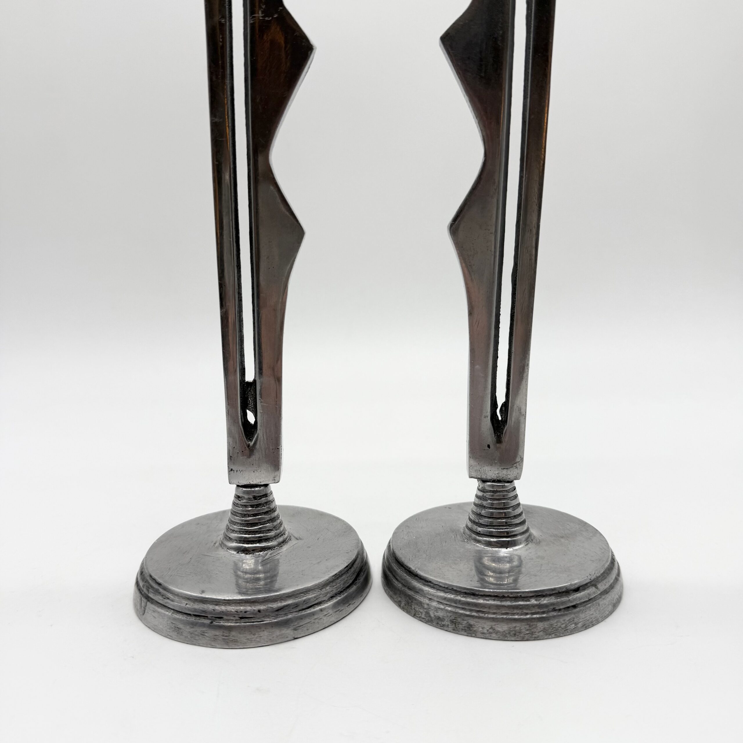 Paire de chandeliers en aluminium au design graphique et sculptural, caractérisée par une silhouette élancée et une découpe ajourée sur toute la hauteur.