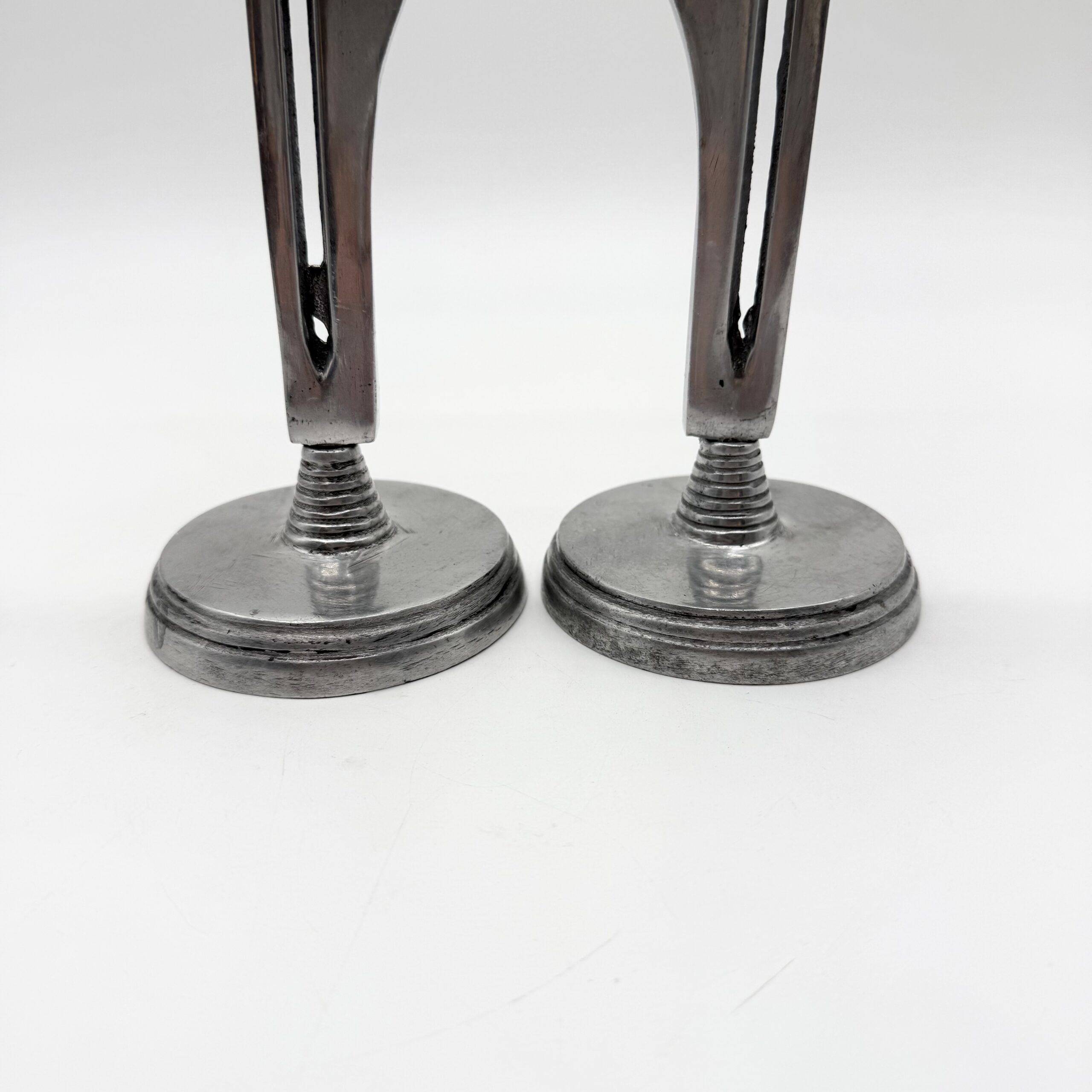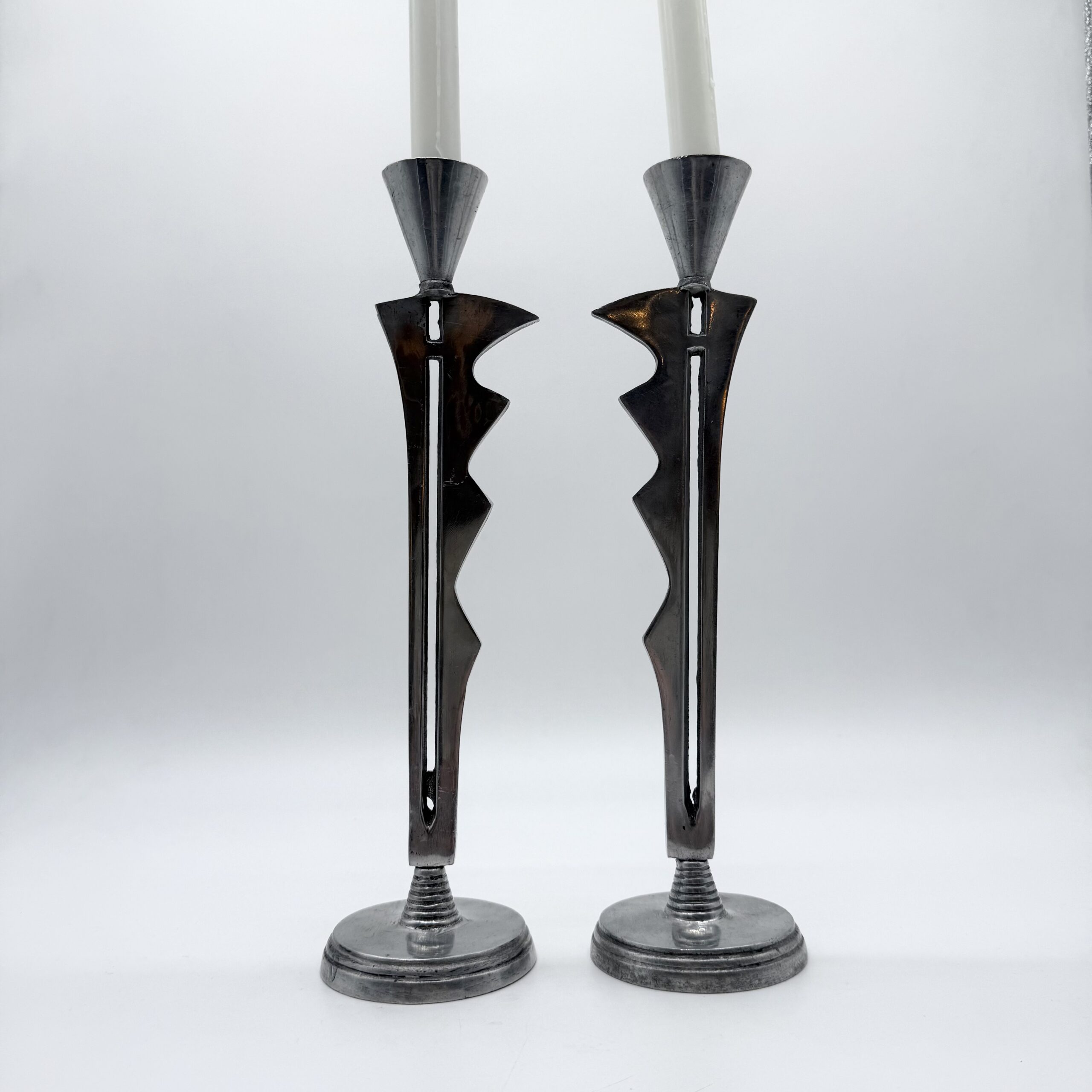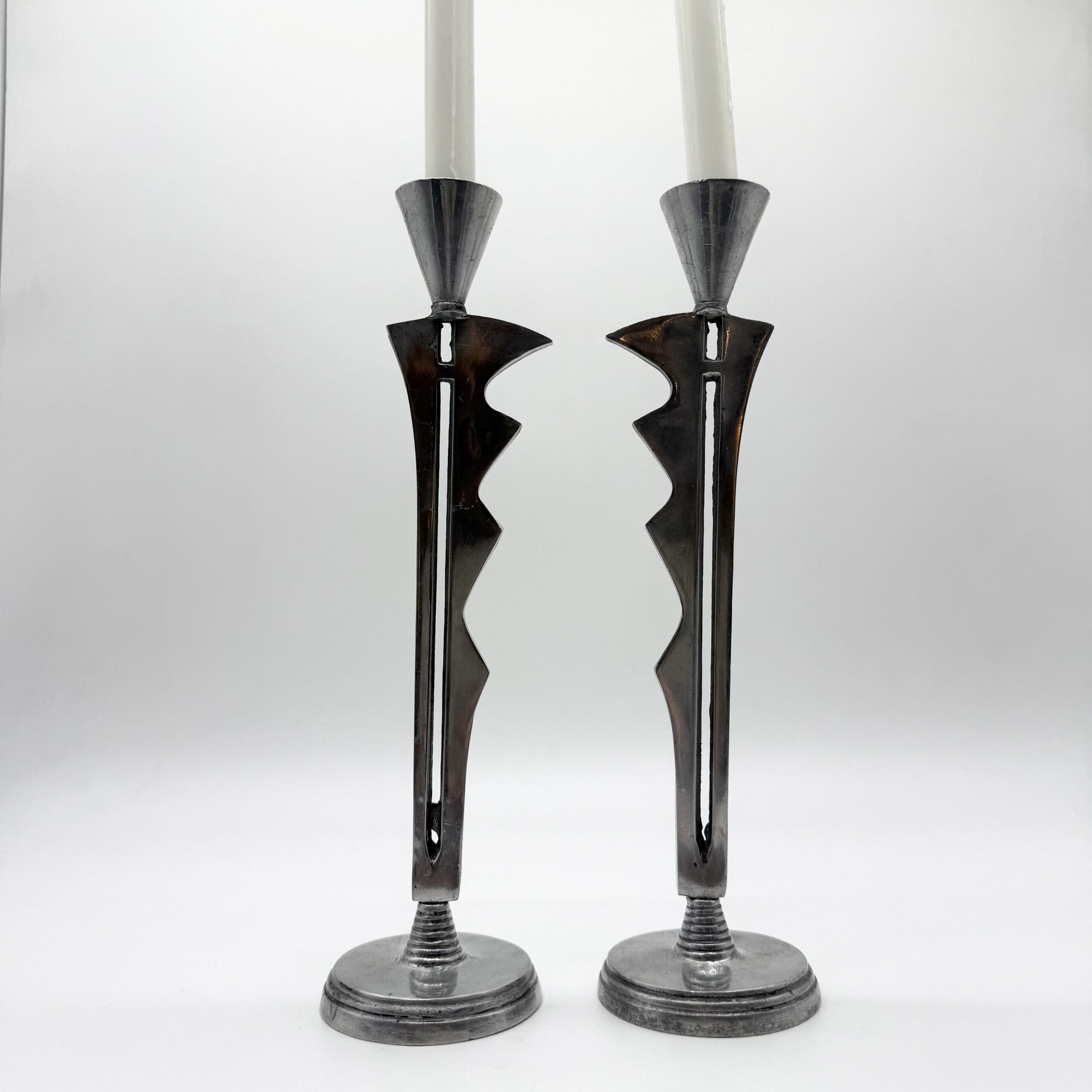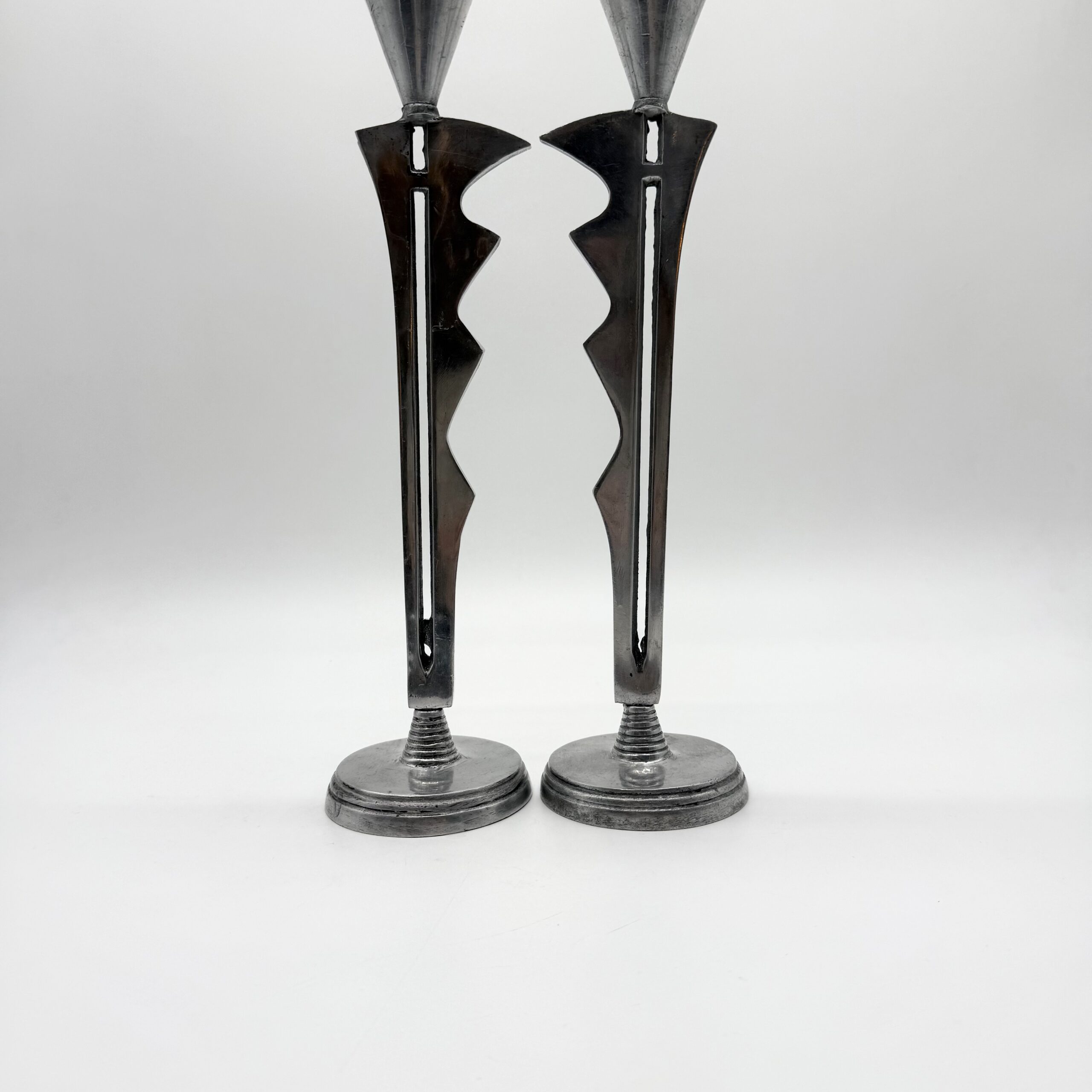 Paire de chandeliers en aluminium au design graphique et sculptural, caractérisée par une silhouette élancée et une découpe ajourée sur toute la hauteur.