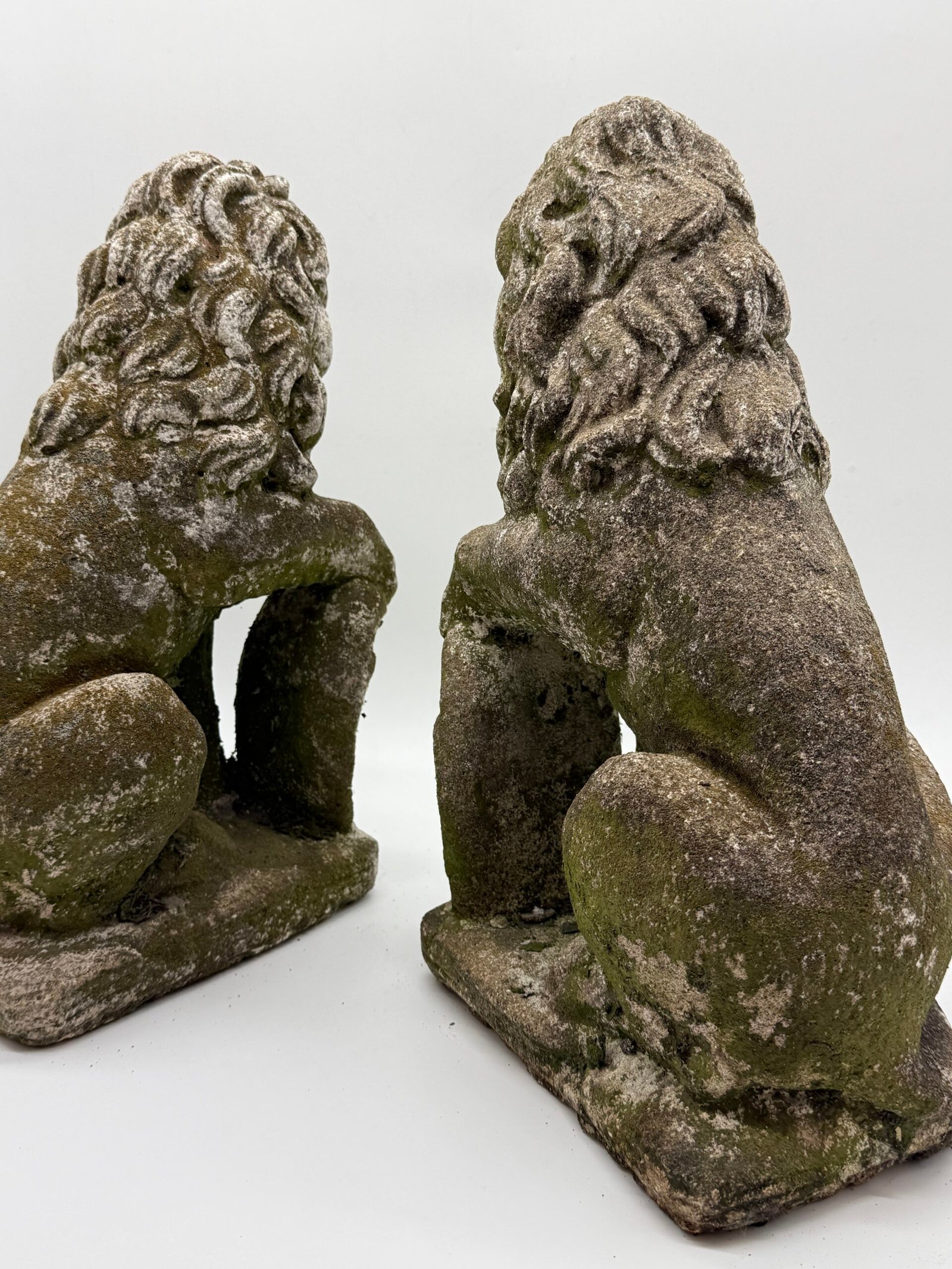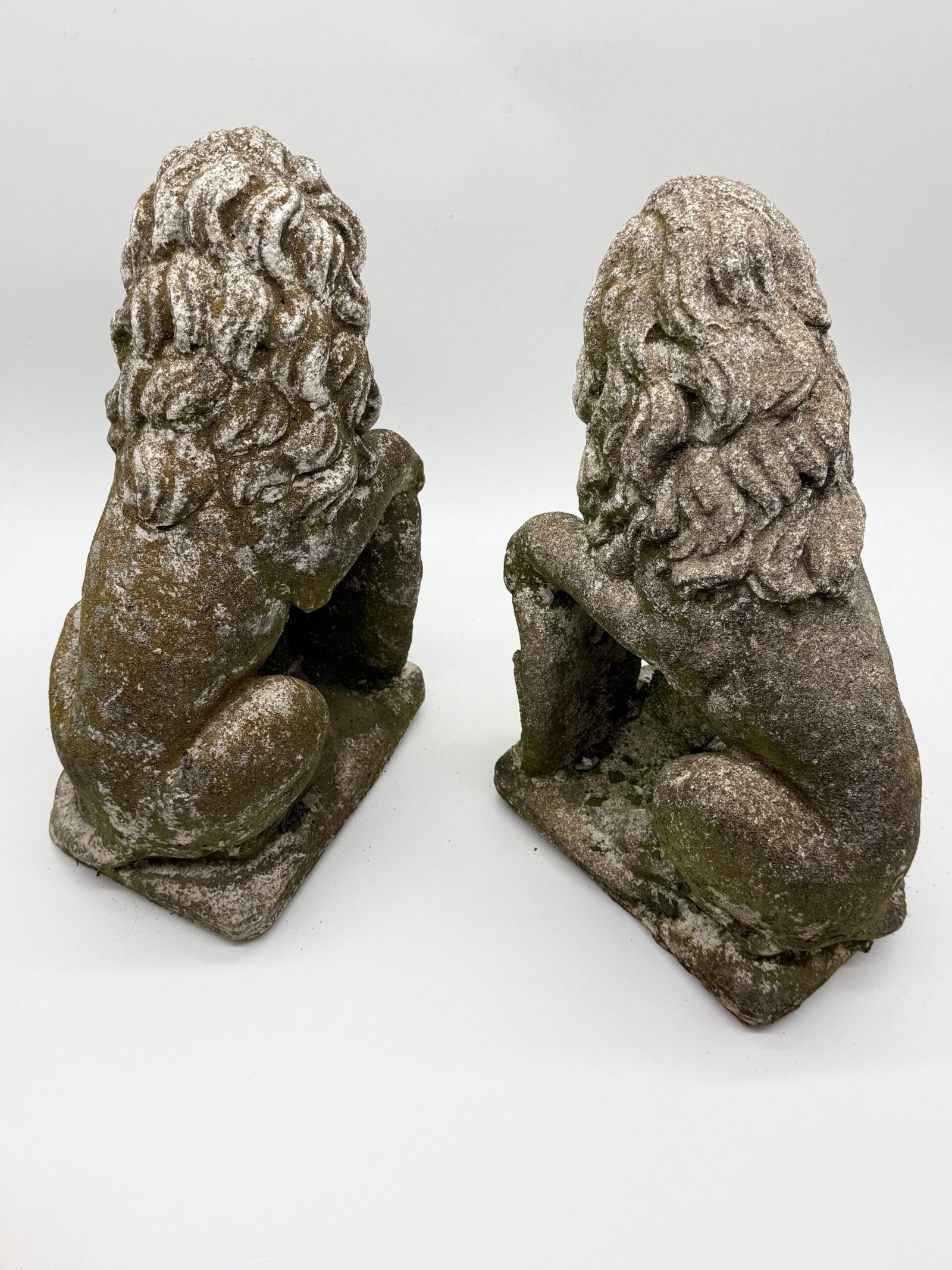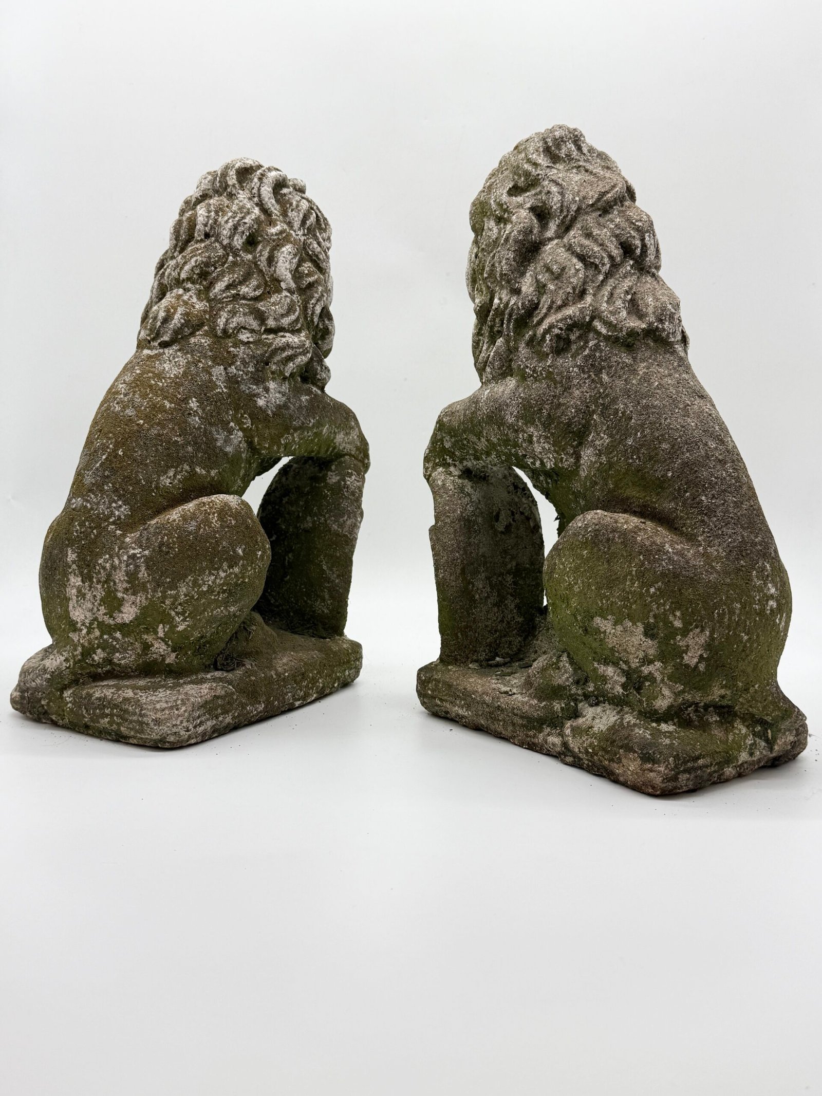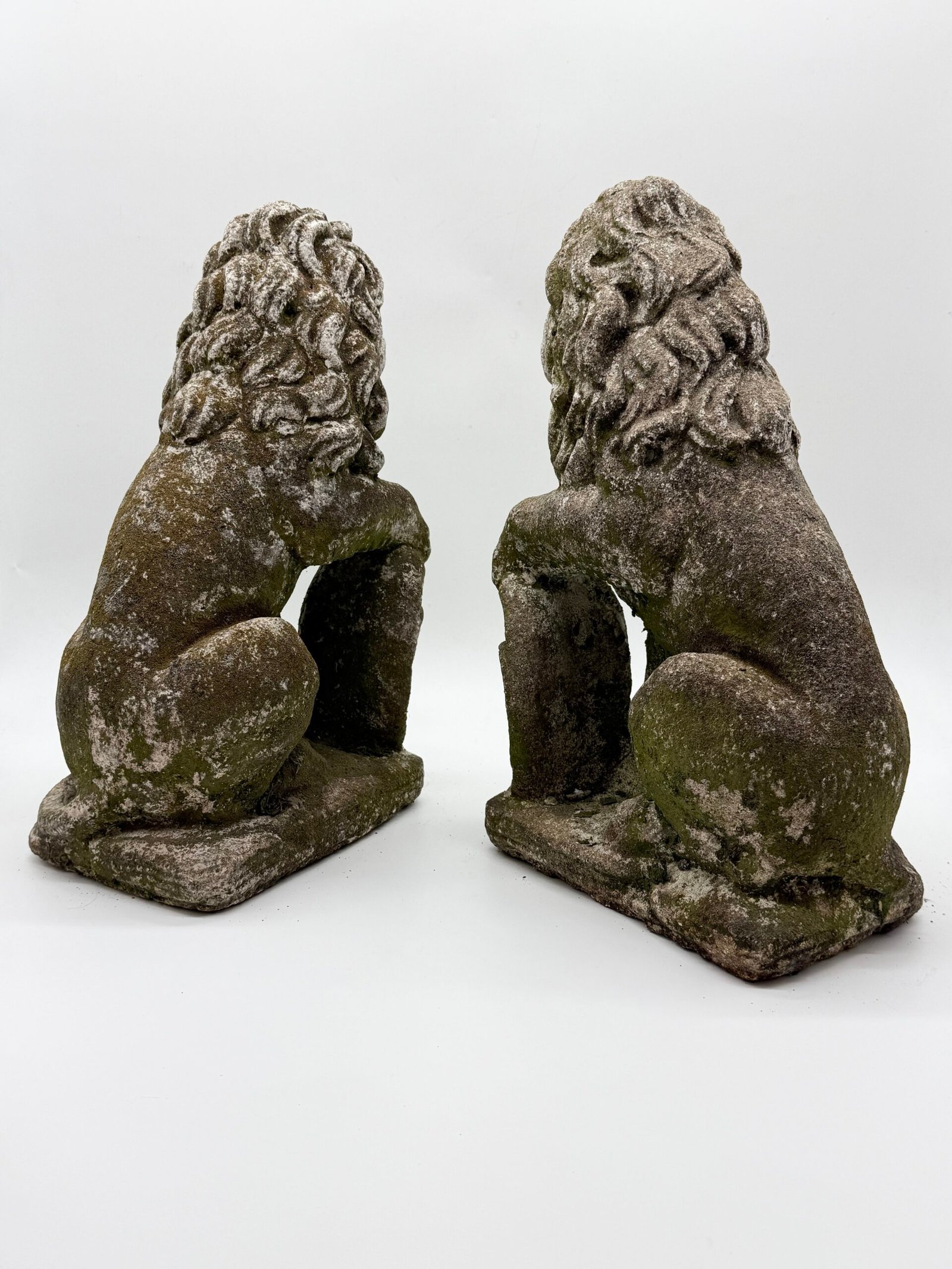 Les lions présentent une crinière stylisée aux mèches généreuses et un modelé volontairement expressif, caractéristiques des productions d’ornements de jardin de cette période. La surface a développé au fil du temps une belle patine d’extérieur avec traces de mousses et de lichens, témoignant d’un long usage en extérieur.
