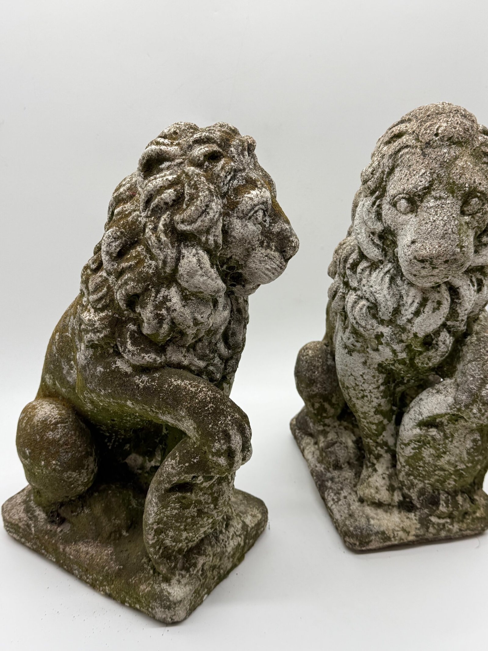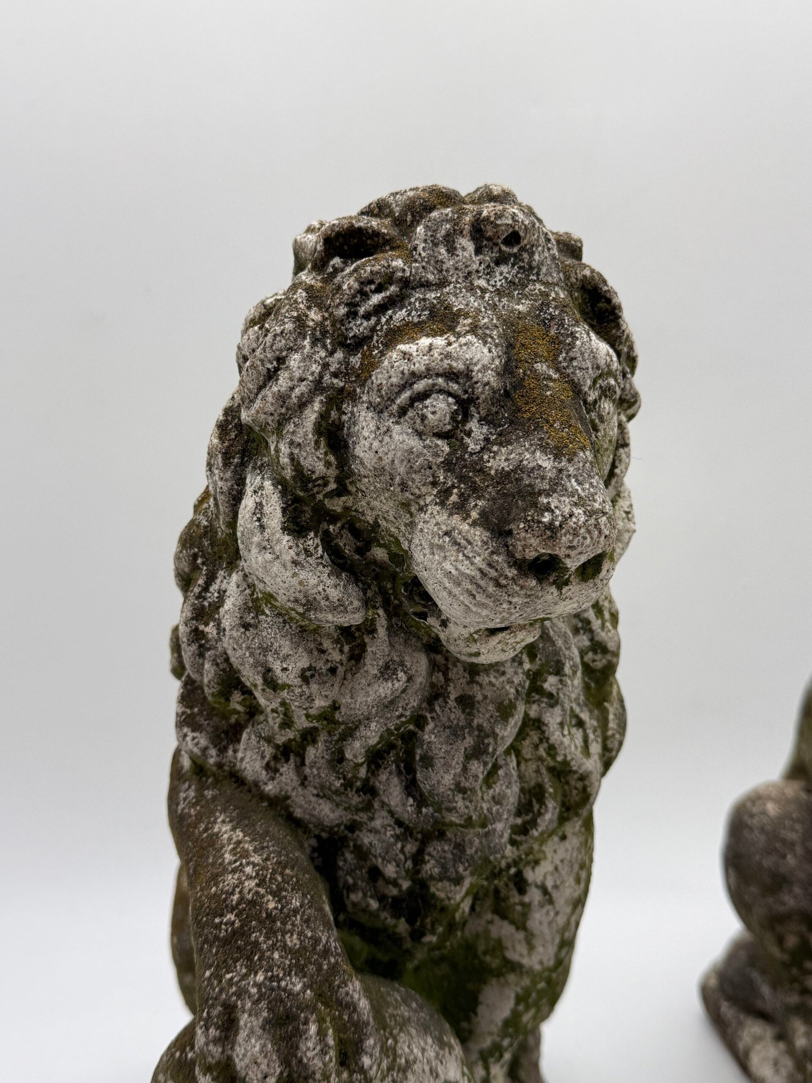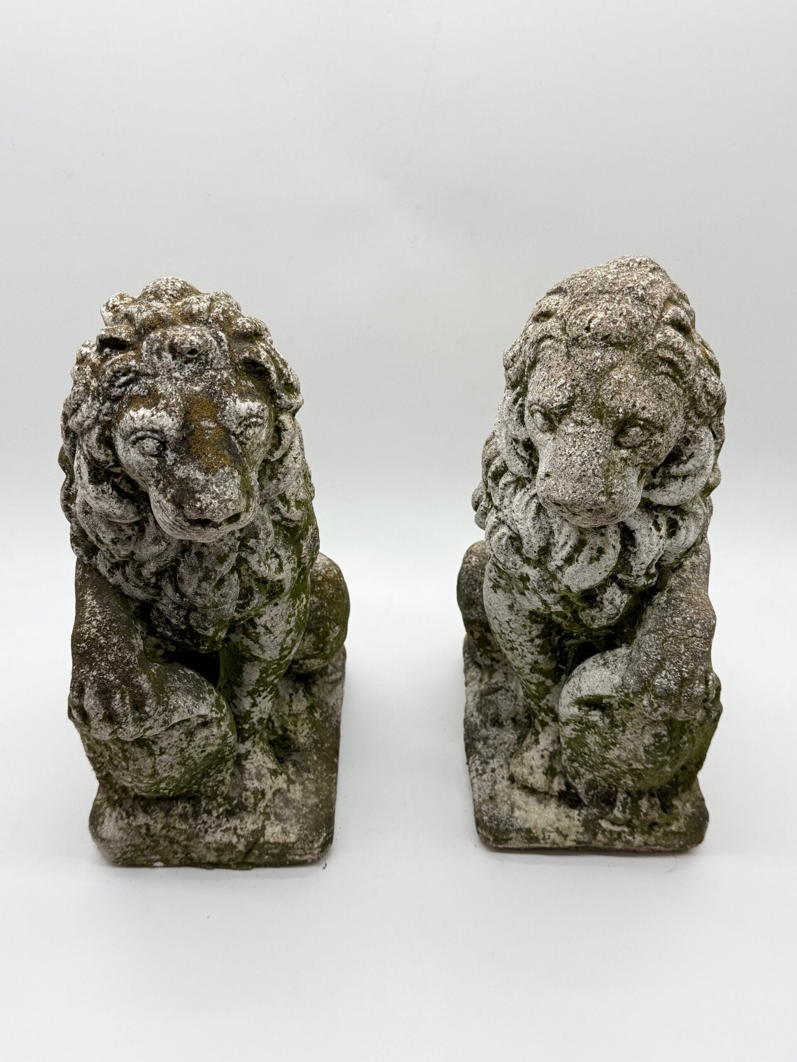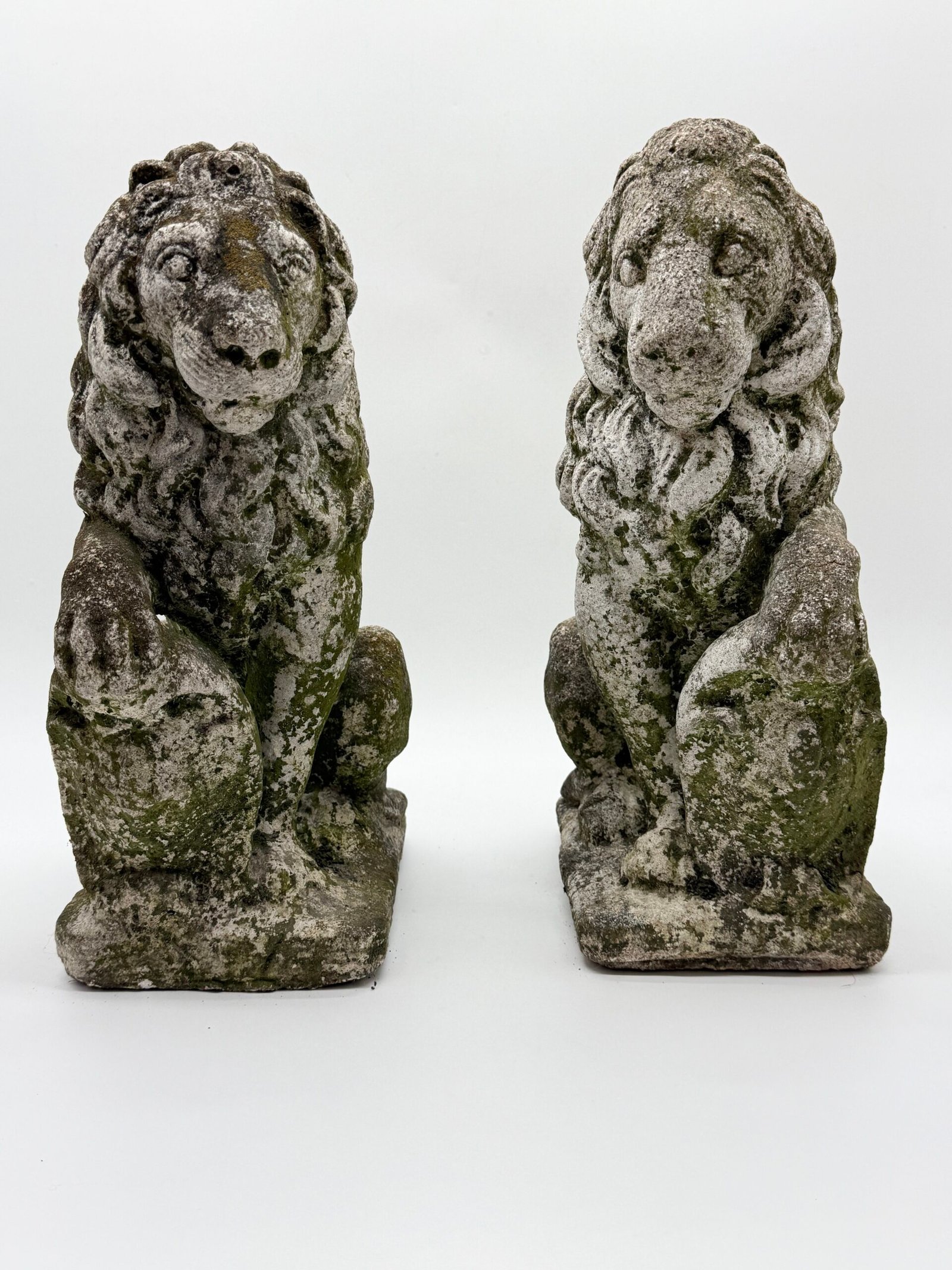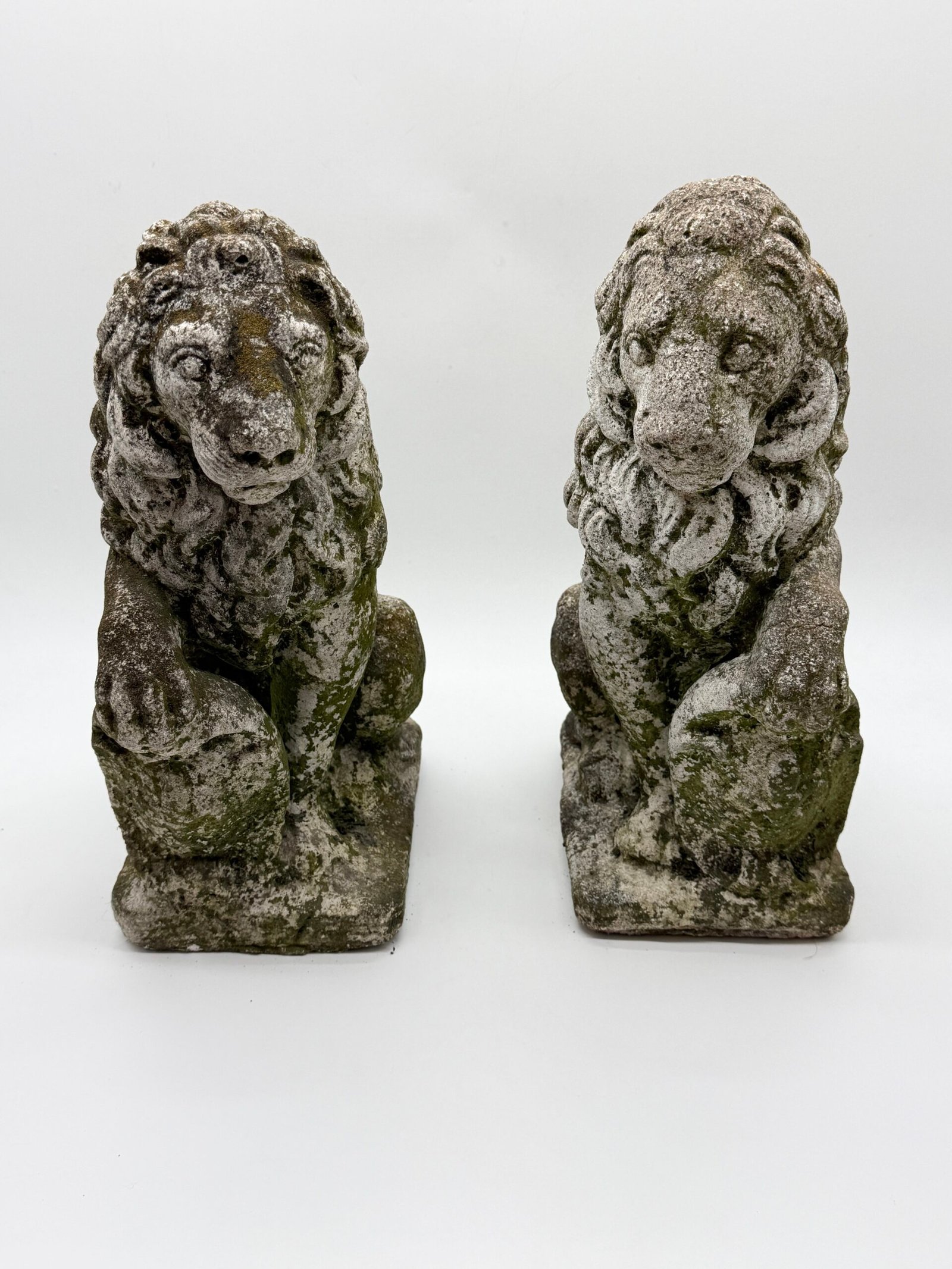 Les lions présentent une crinière stylisée aux mèches généreuses et un modelé volontairement expressif, caractéristiques des productions d’ornements de jardin de cette période. La surface a développé au fil du temps une belle patine d’extérieur avec traces de mousses et de lichens, témoignant d’un long usage en extérieur.