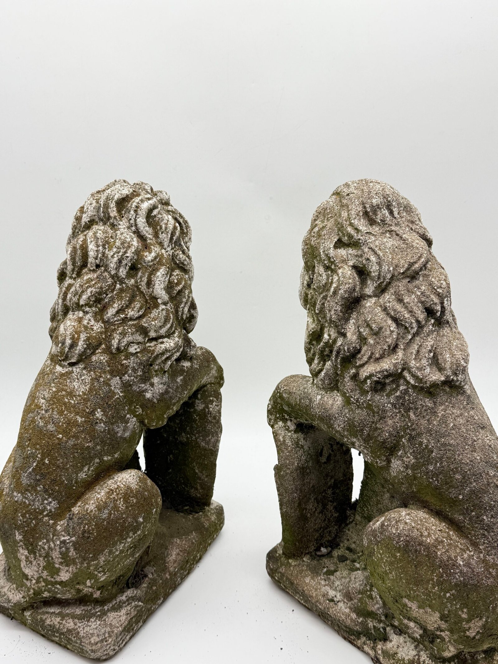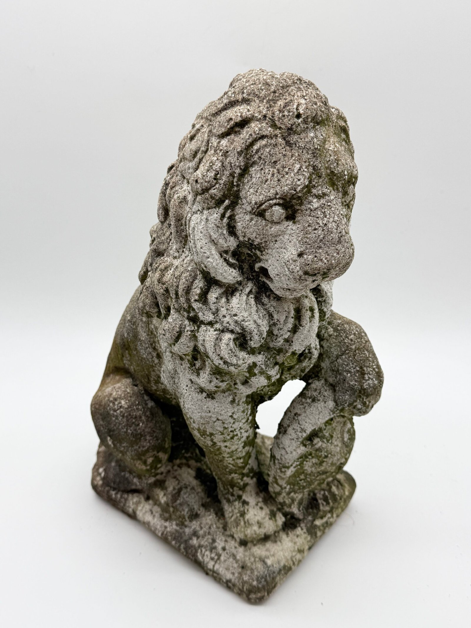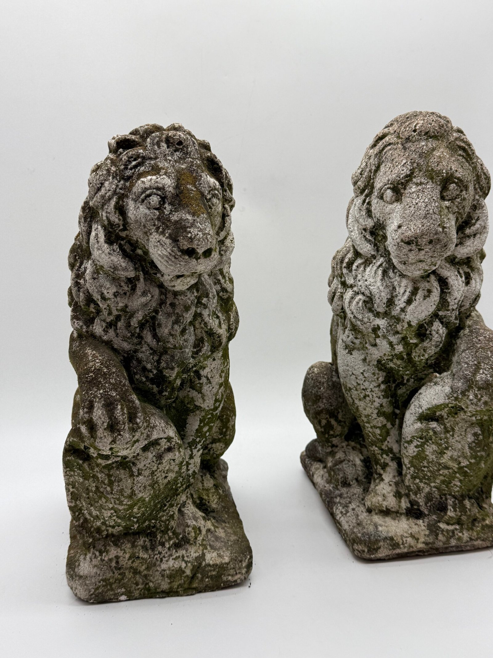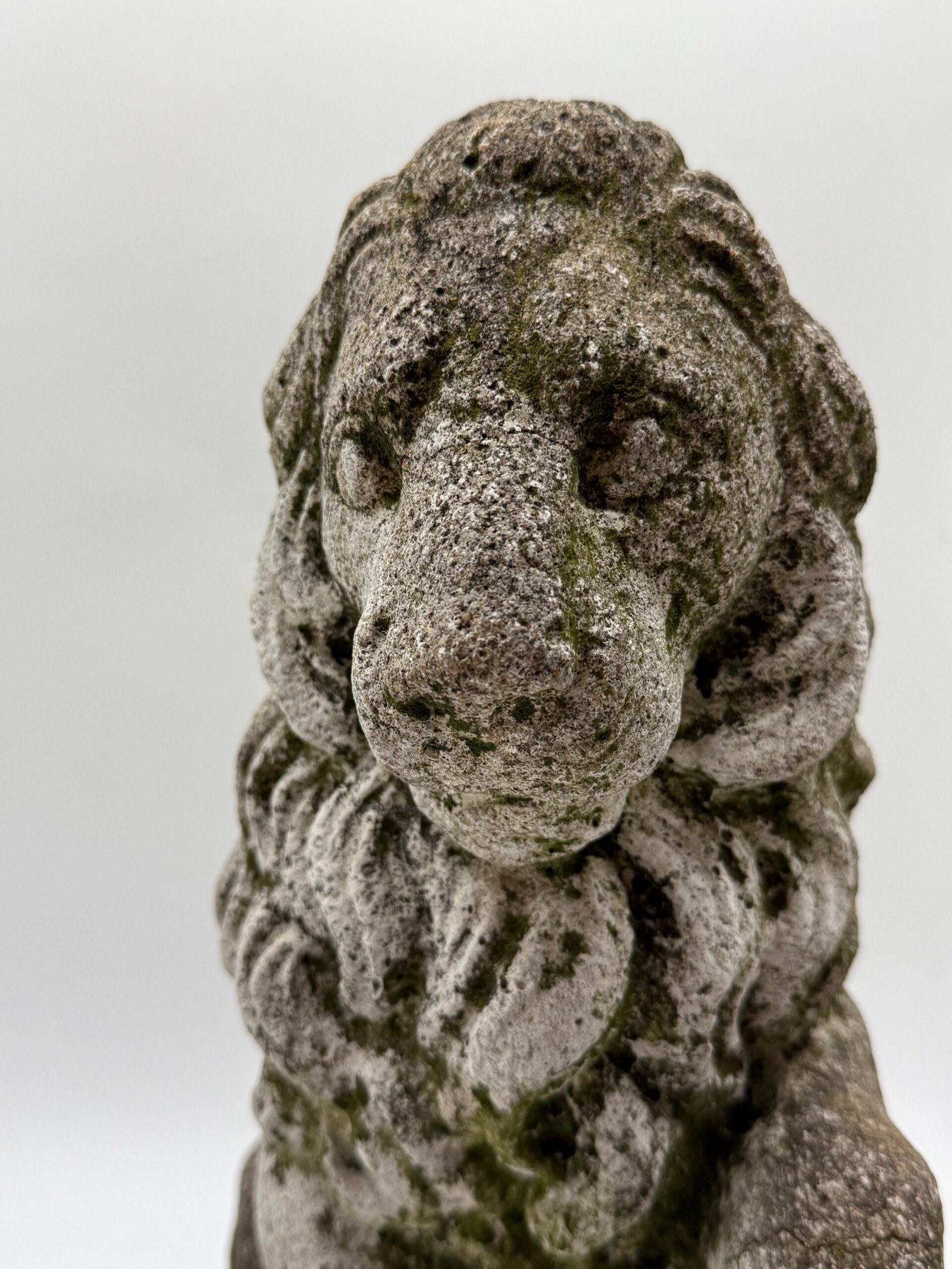 Les lions présentent une crinière stylisée aux mèches généreuses et un modelé volontairement expressif, caractéristiques des productions d’ornements de jardin de cette période. La surface a développé au fil du temps une belle patine d’extérieur avec traces de mousses et de lichens, témoignant d’un long usage en extérieur.