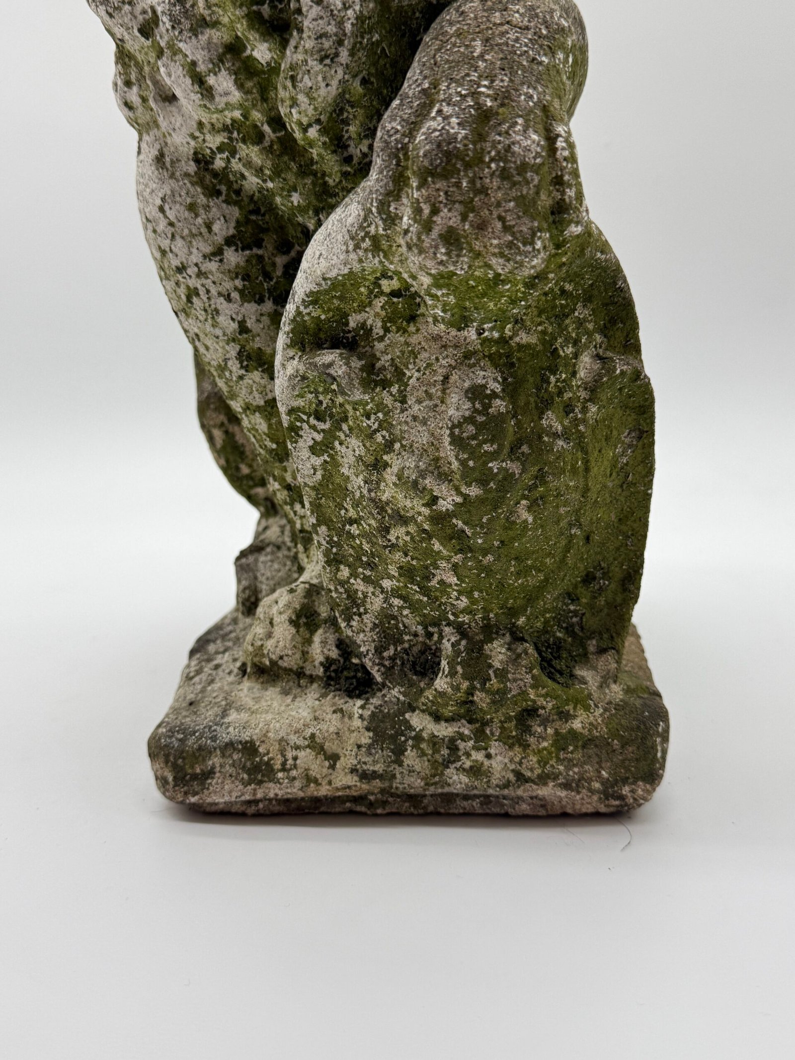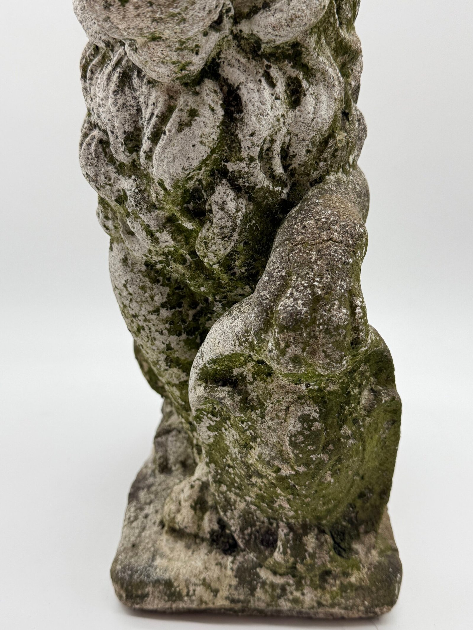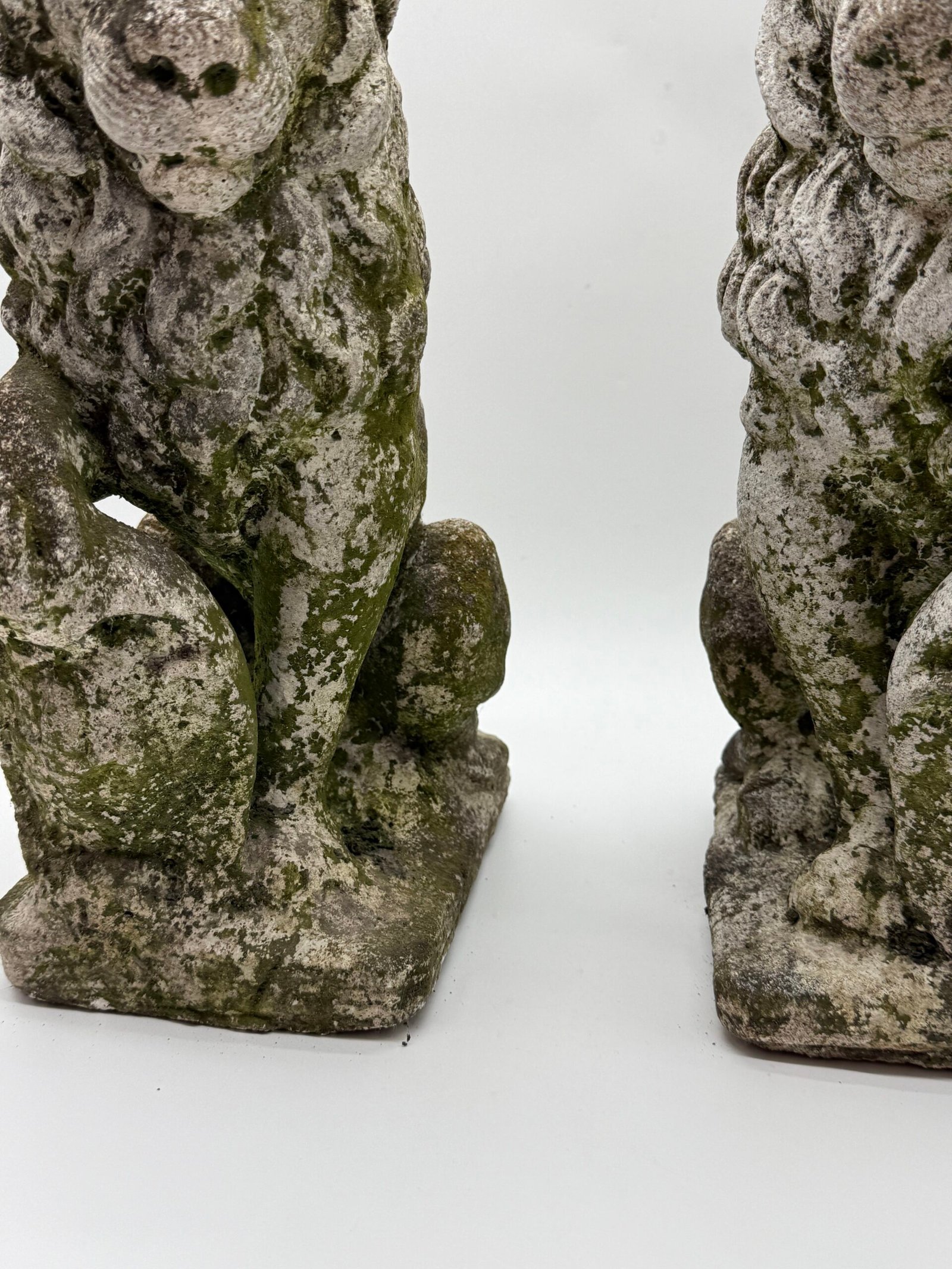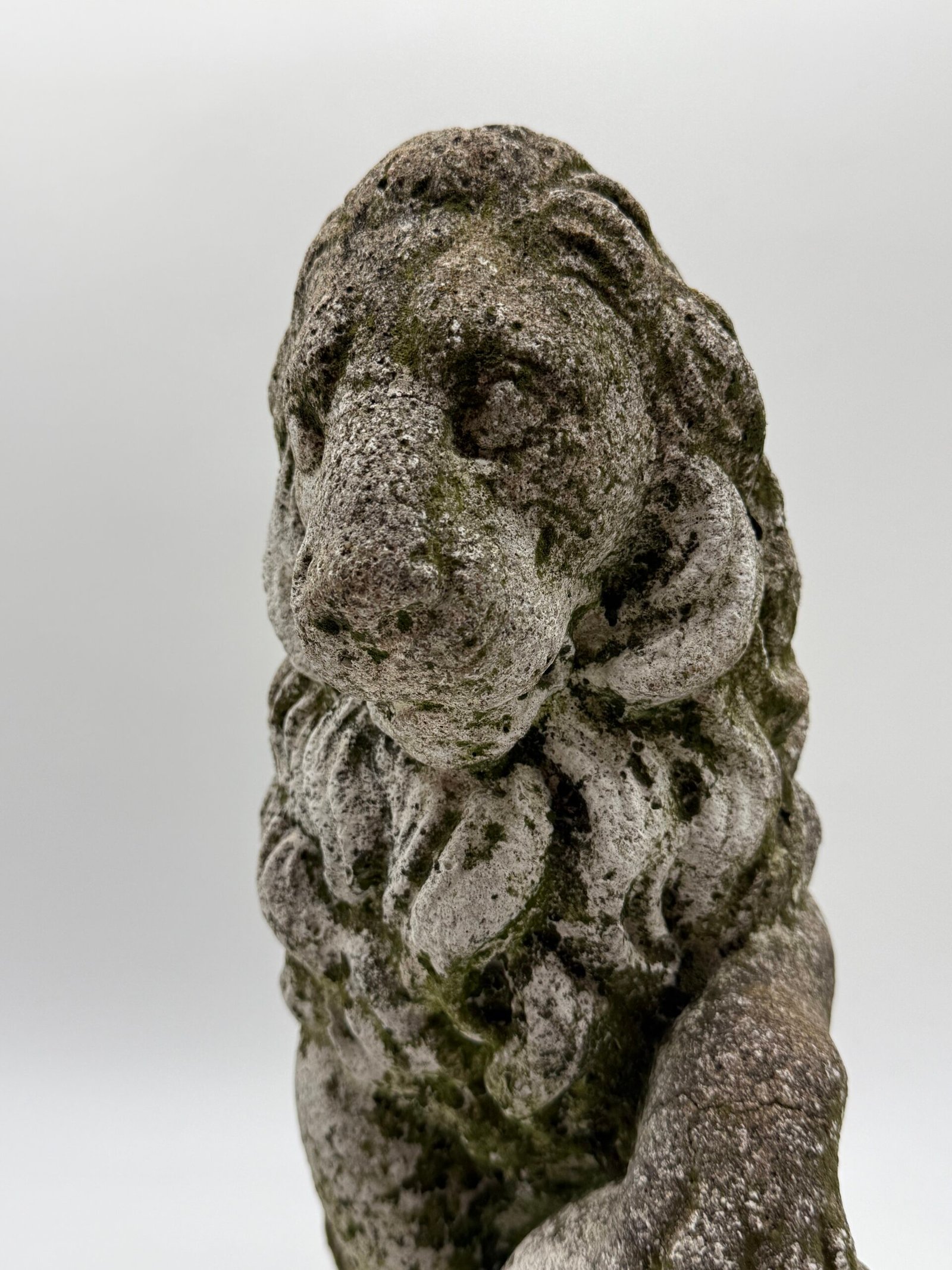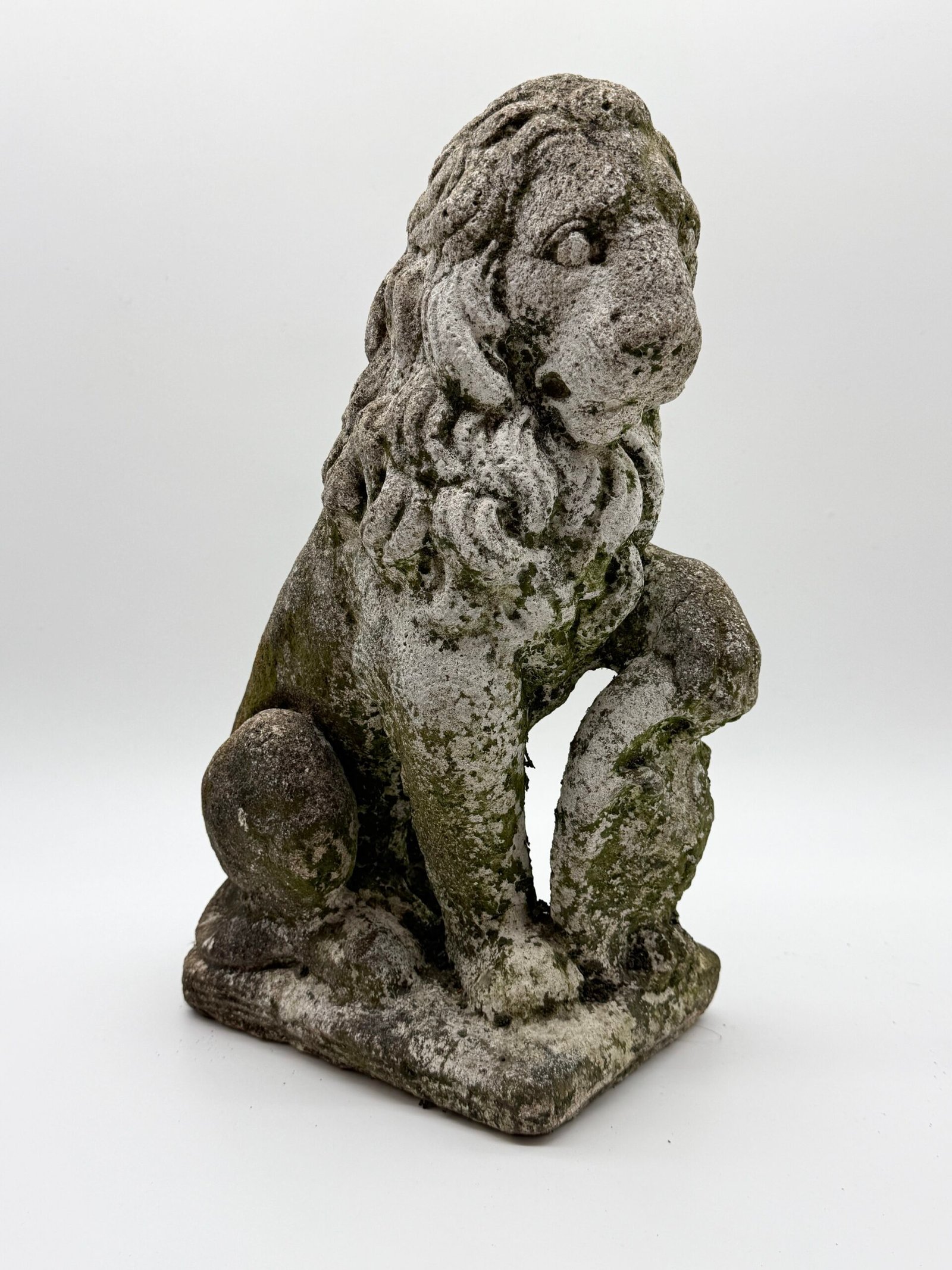 Les lions présentent une crinière stylisée aux mèches généreuses et un modelé volontairement expressif, caractéristiques des productions d’ornements de jardin de cette période. La surface a développé au fil du temps une belle patine d’extérieur avec traces de mousses et de lichens, témoignant d’un long usage en extérieur.
