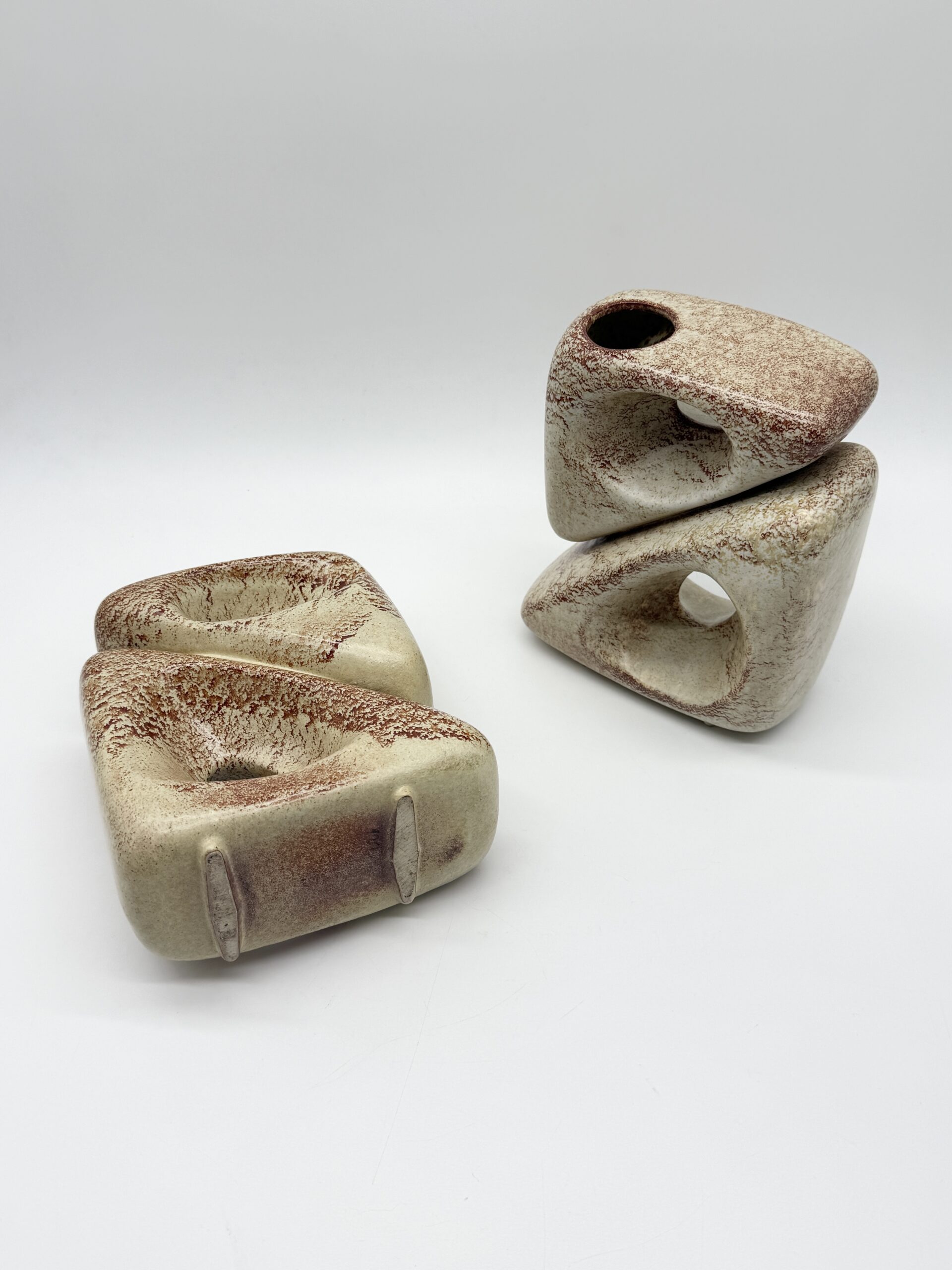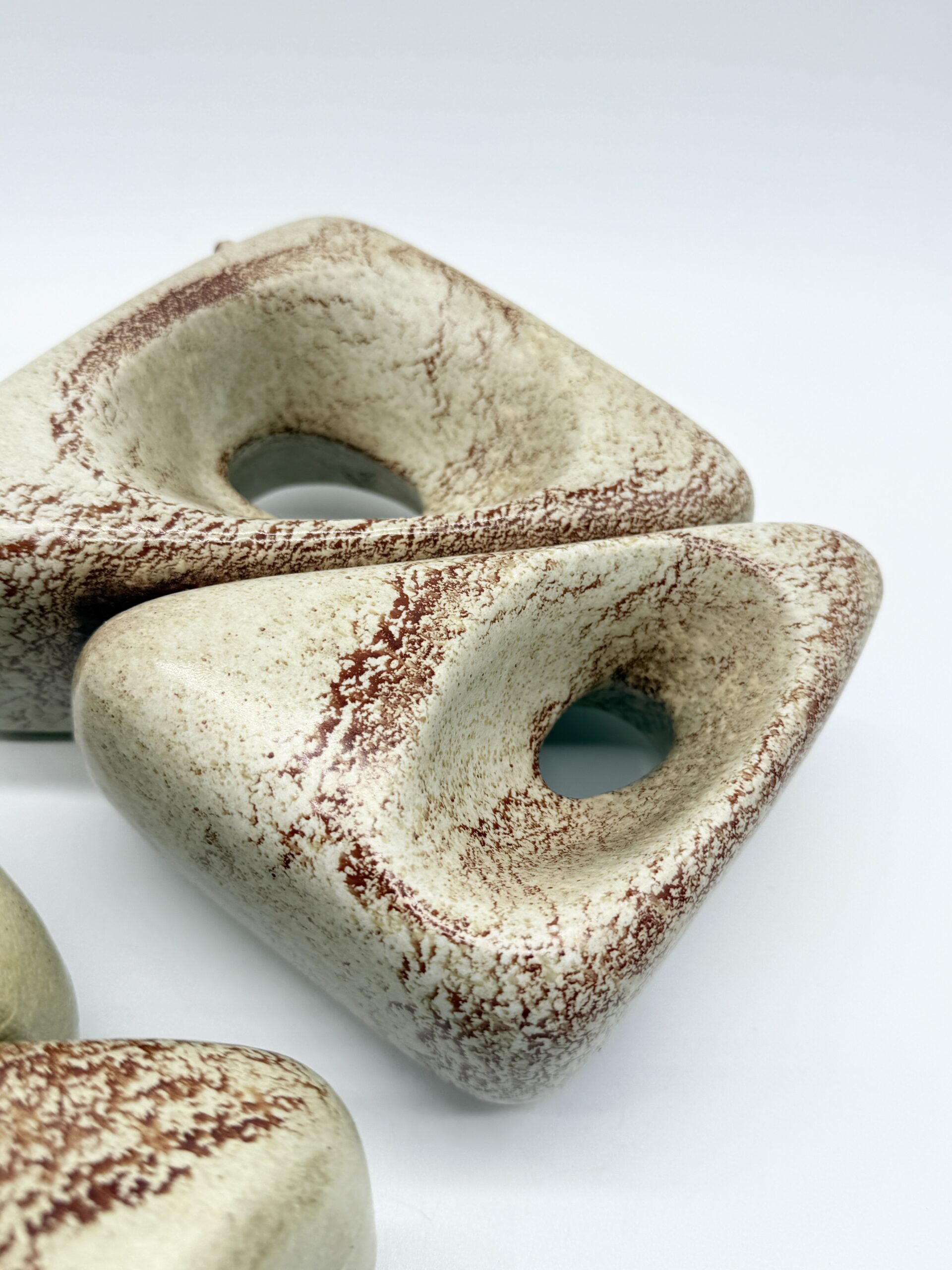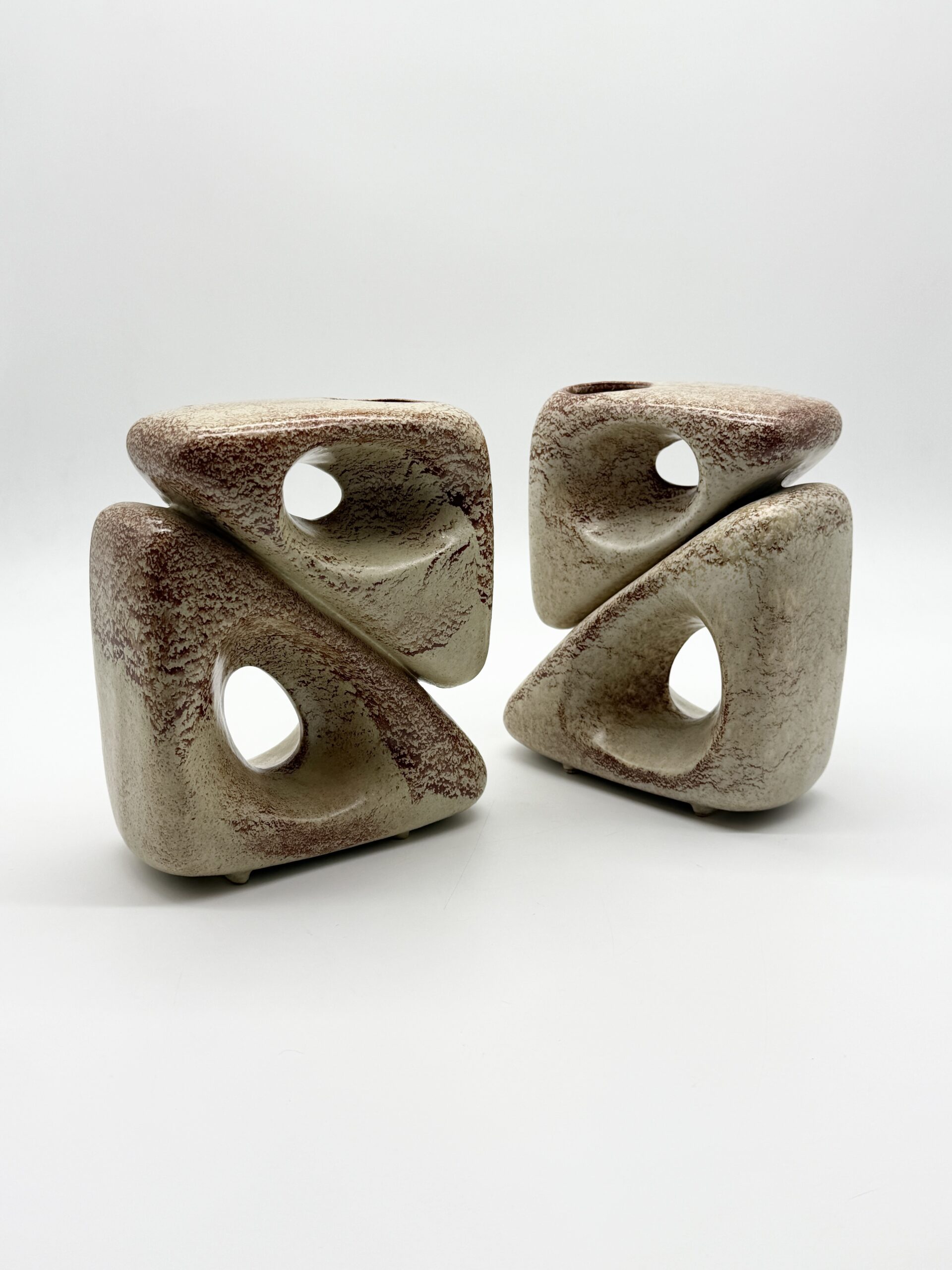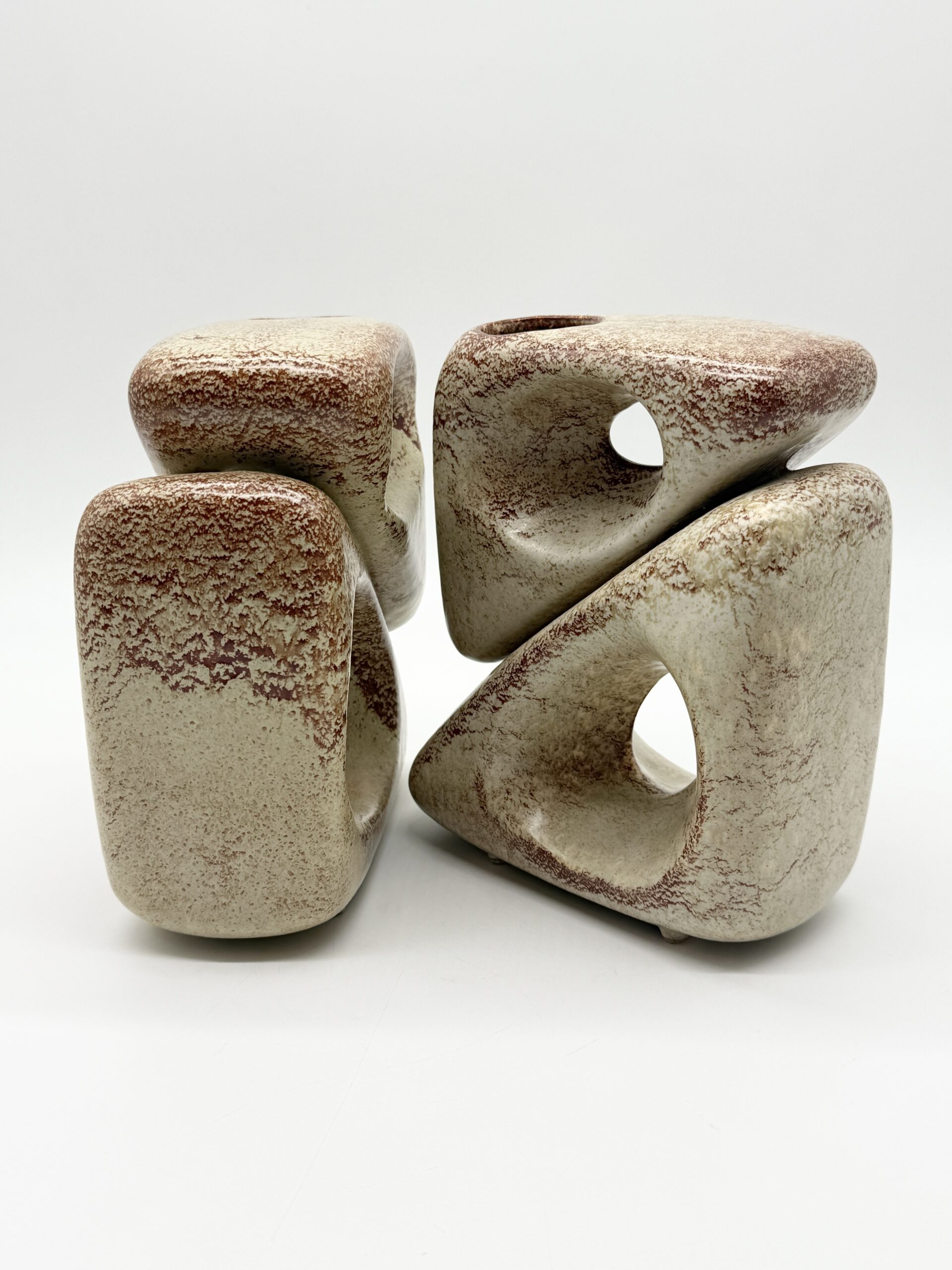 Leur forme triangulaire percée d’ouvertures organiques crée un jeu subtil entre pleins et vides, transformant ces vases en véritables sculptures. L’émail beige nuancé, rehaussé de variations brun-rouge, accentue les reliefs et témoigne du savoir-faire artisanal de la manufacture.