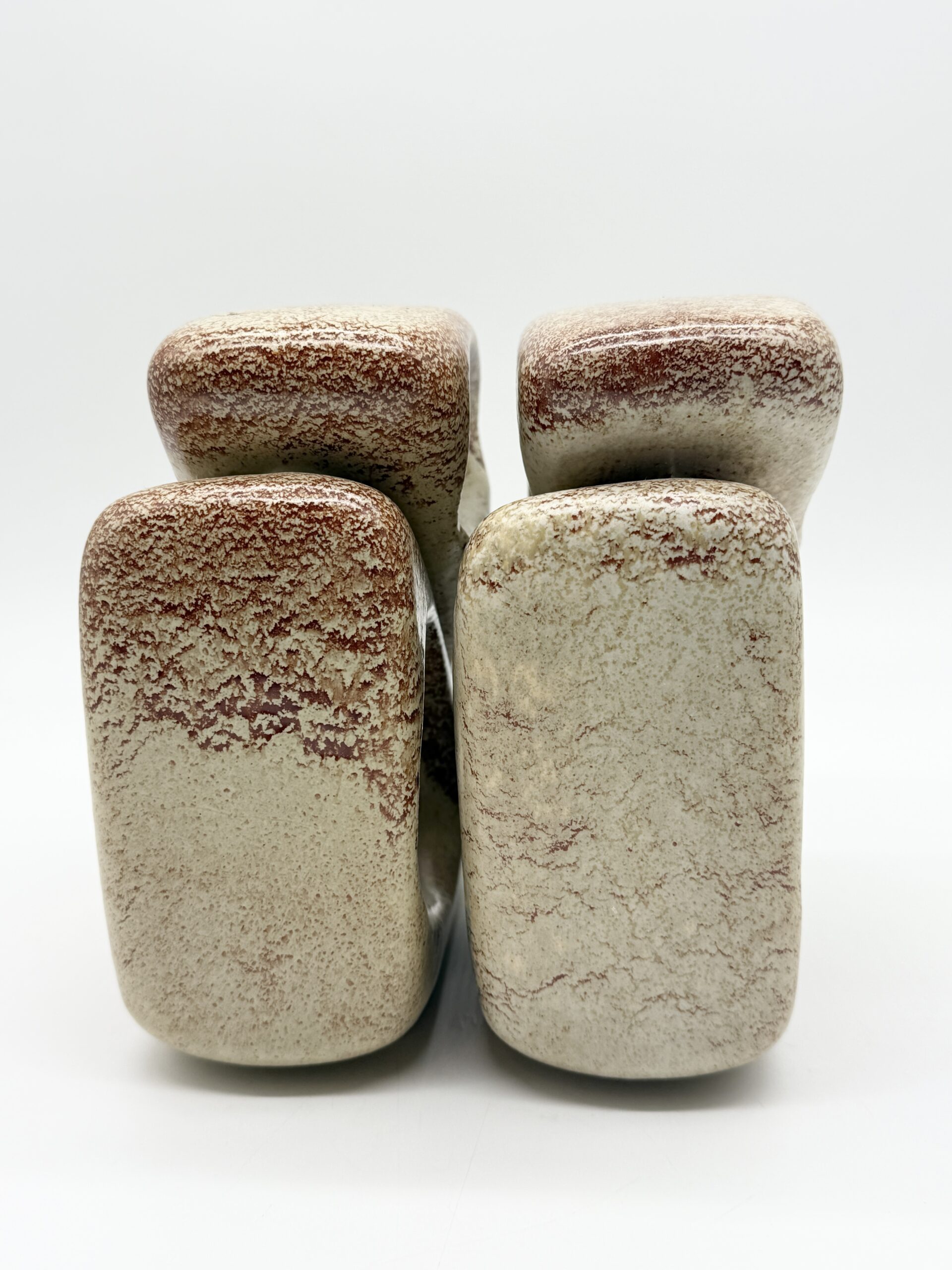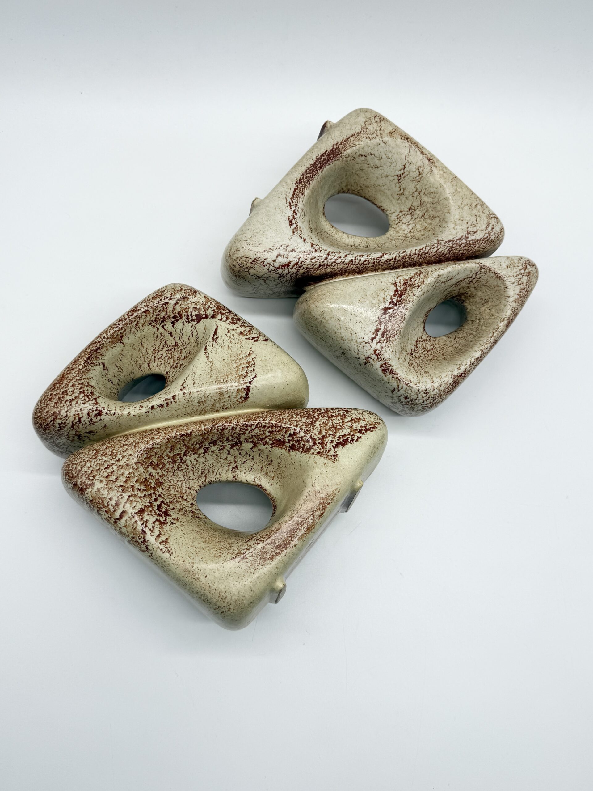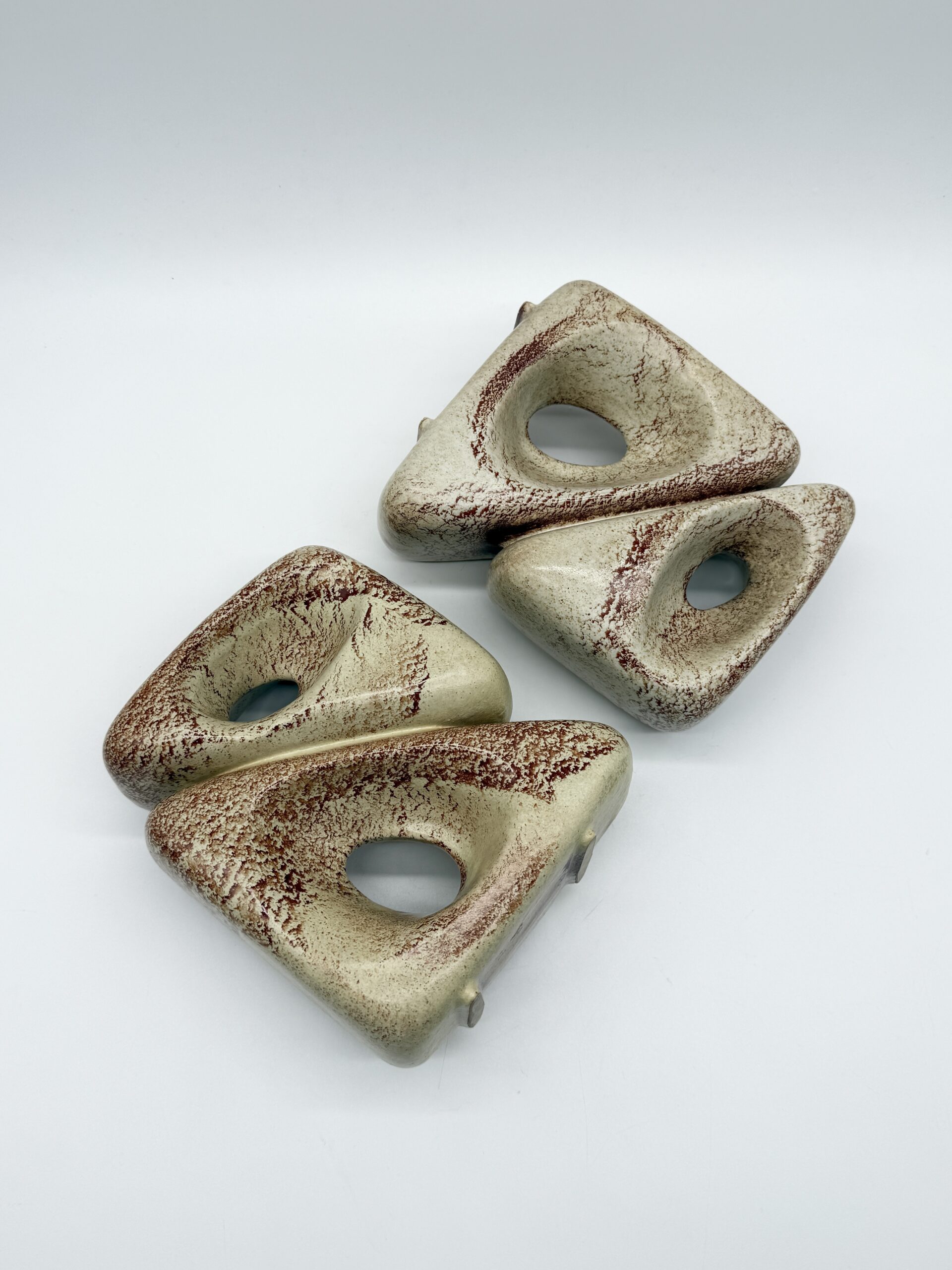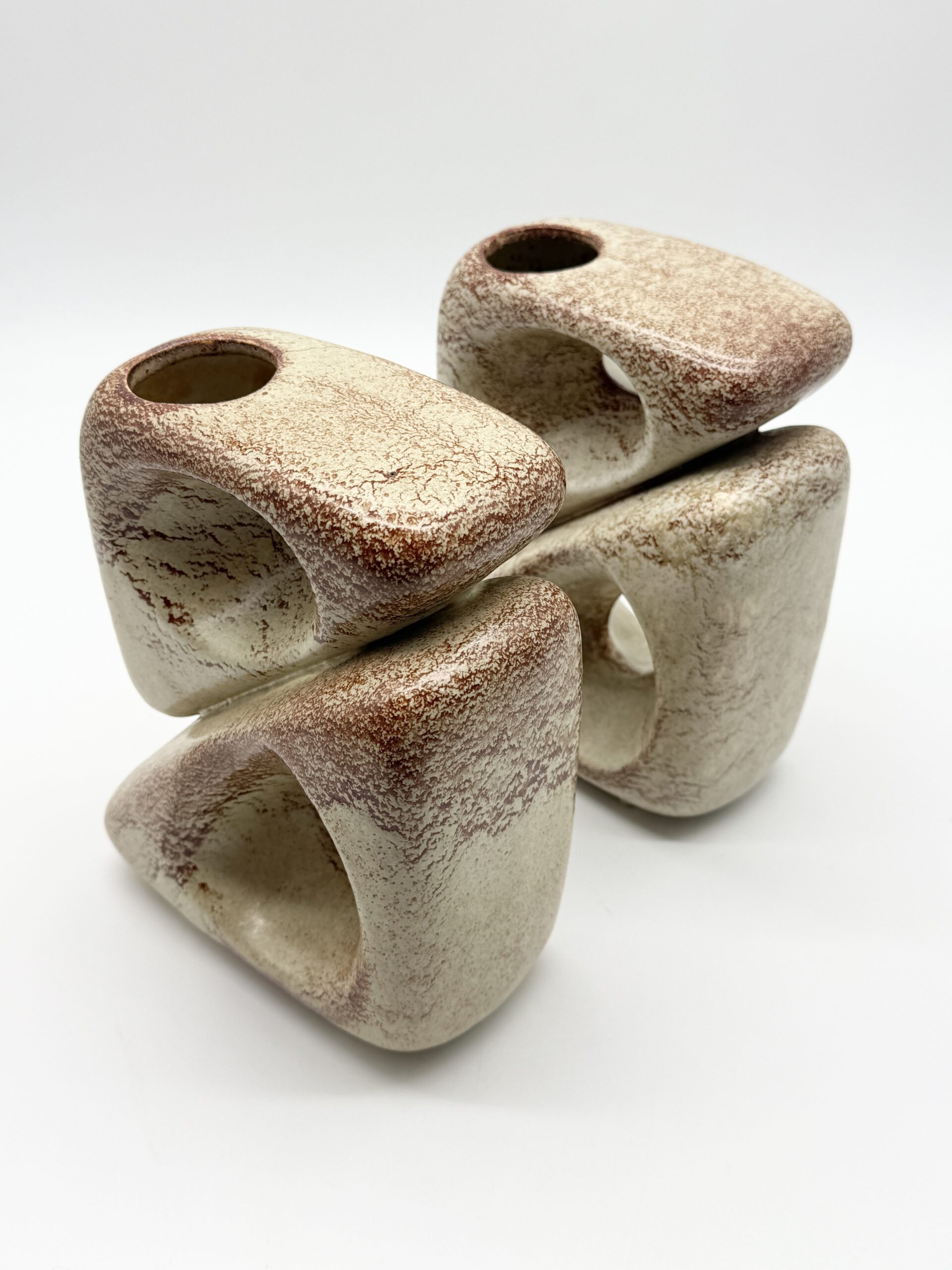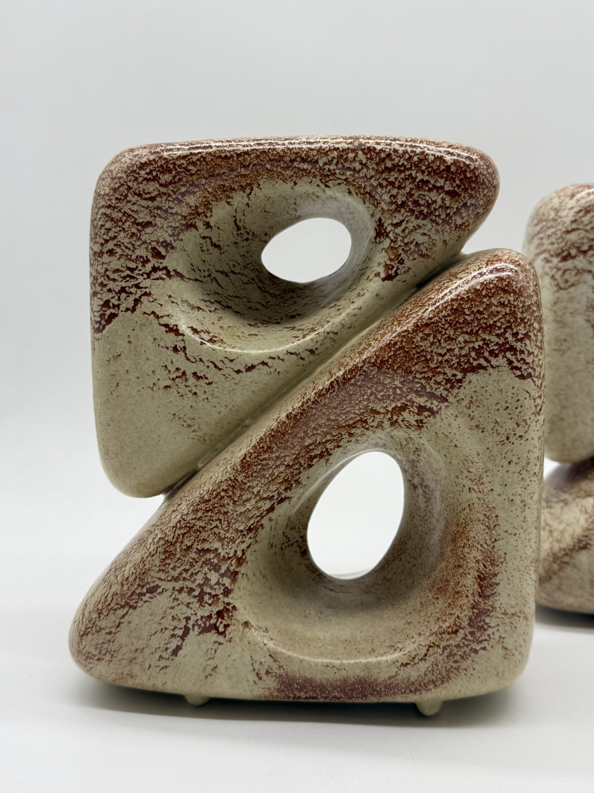 Leur forme triangulaire percée d’ouvertures organiques crée un jeu subtil entre pleins et vides, transformant ces vases en véritables sculptures. L’émail beige nuancé, rehaussé de variations brun-rouge, accentue les reliefs et témoigne du savoir-faire artisanal de la manufacture.