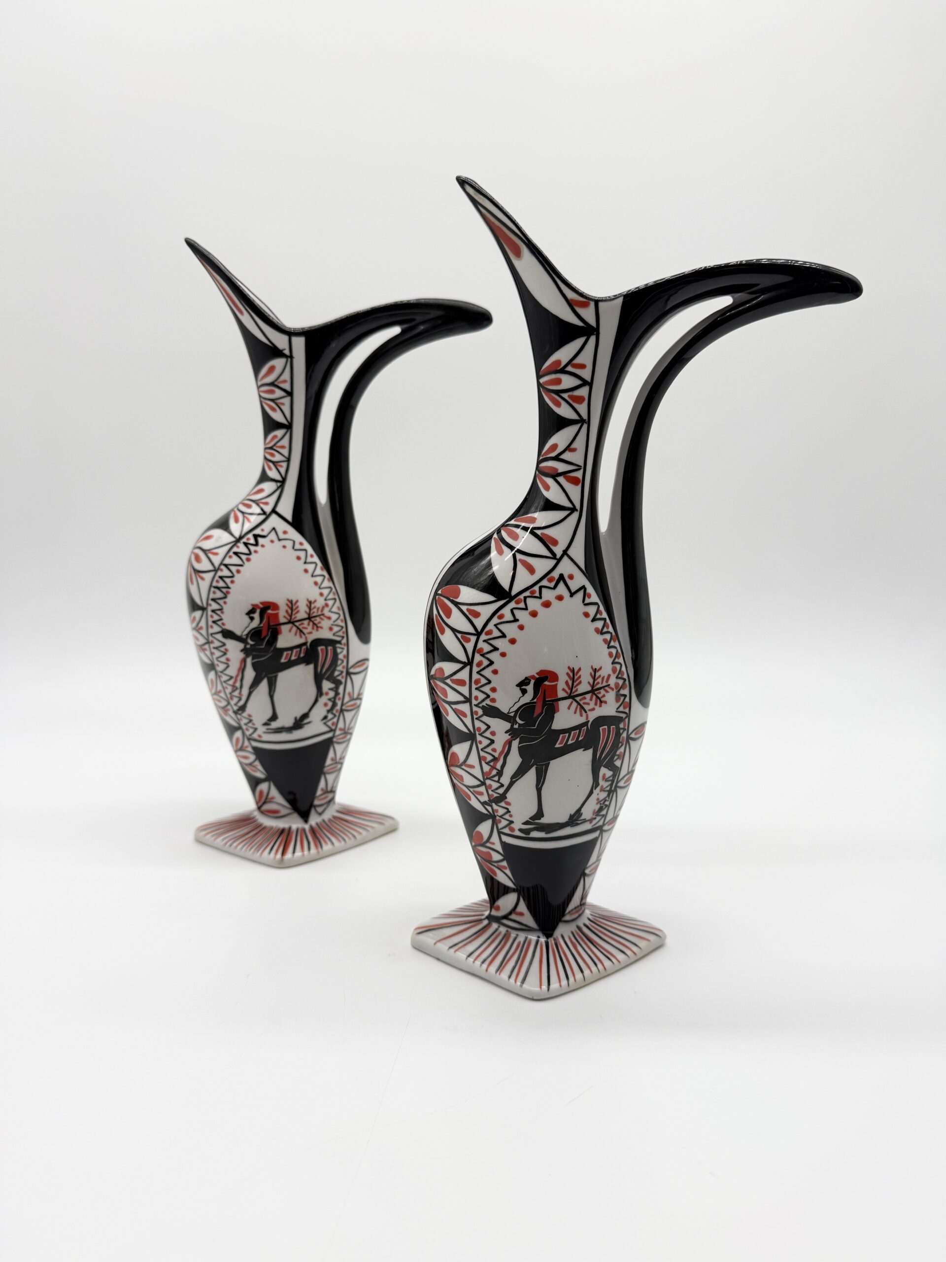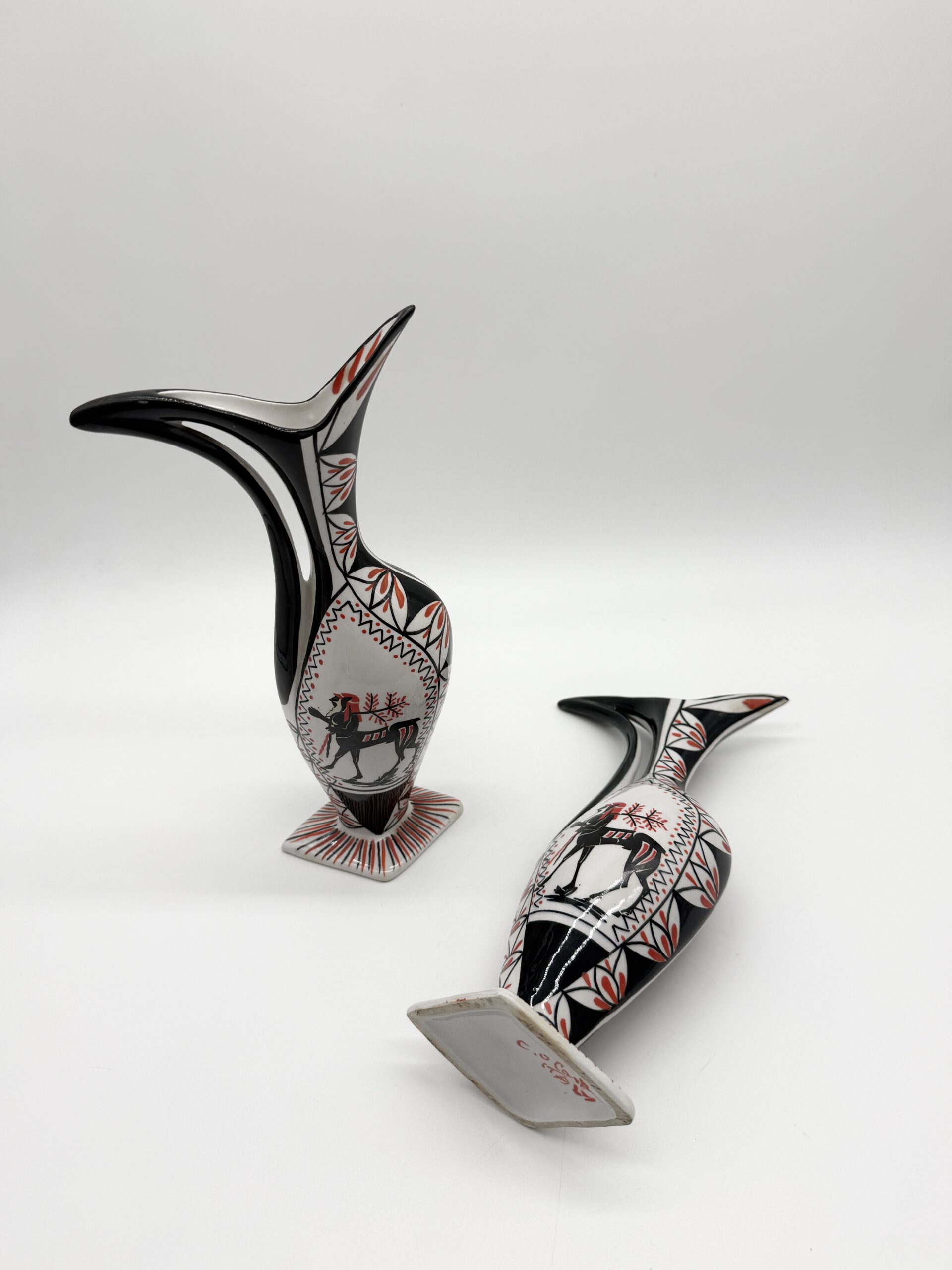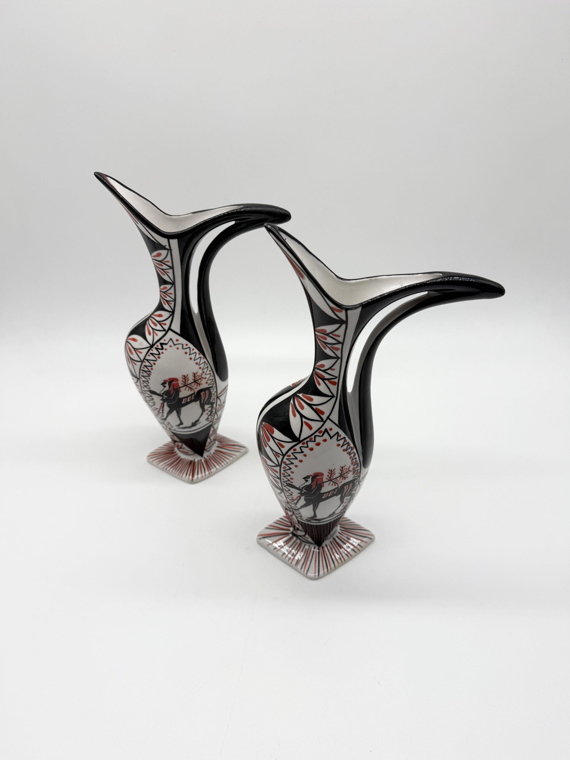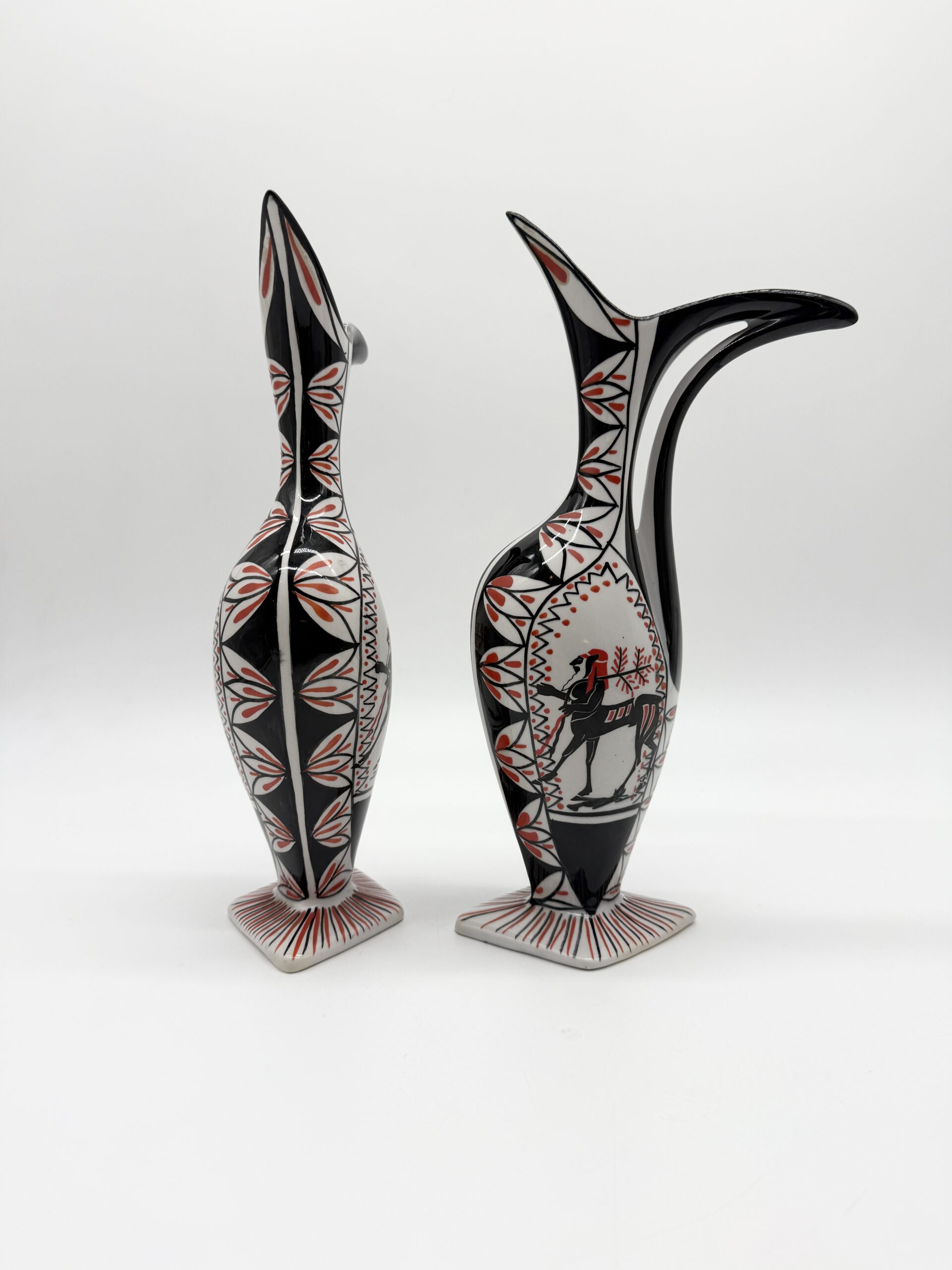 Leur silhouette sculpturale à bec verseur et anse intégrée est sublimée par un décor graphique noir, blanc et rouge représentant un cavalier stylisé, encadré de motifs géométriques.