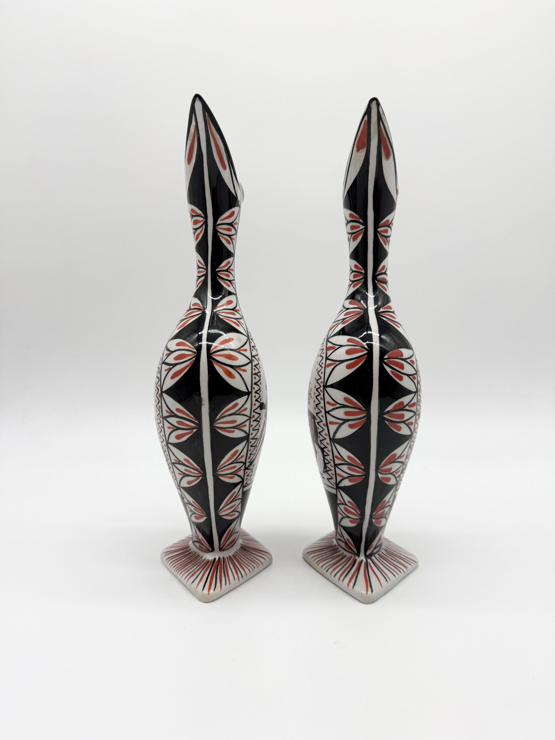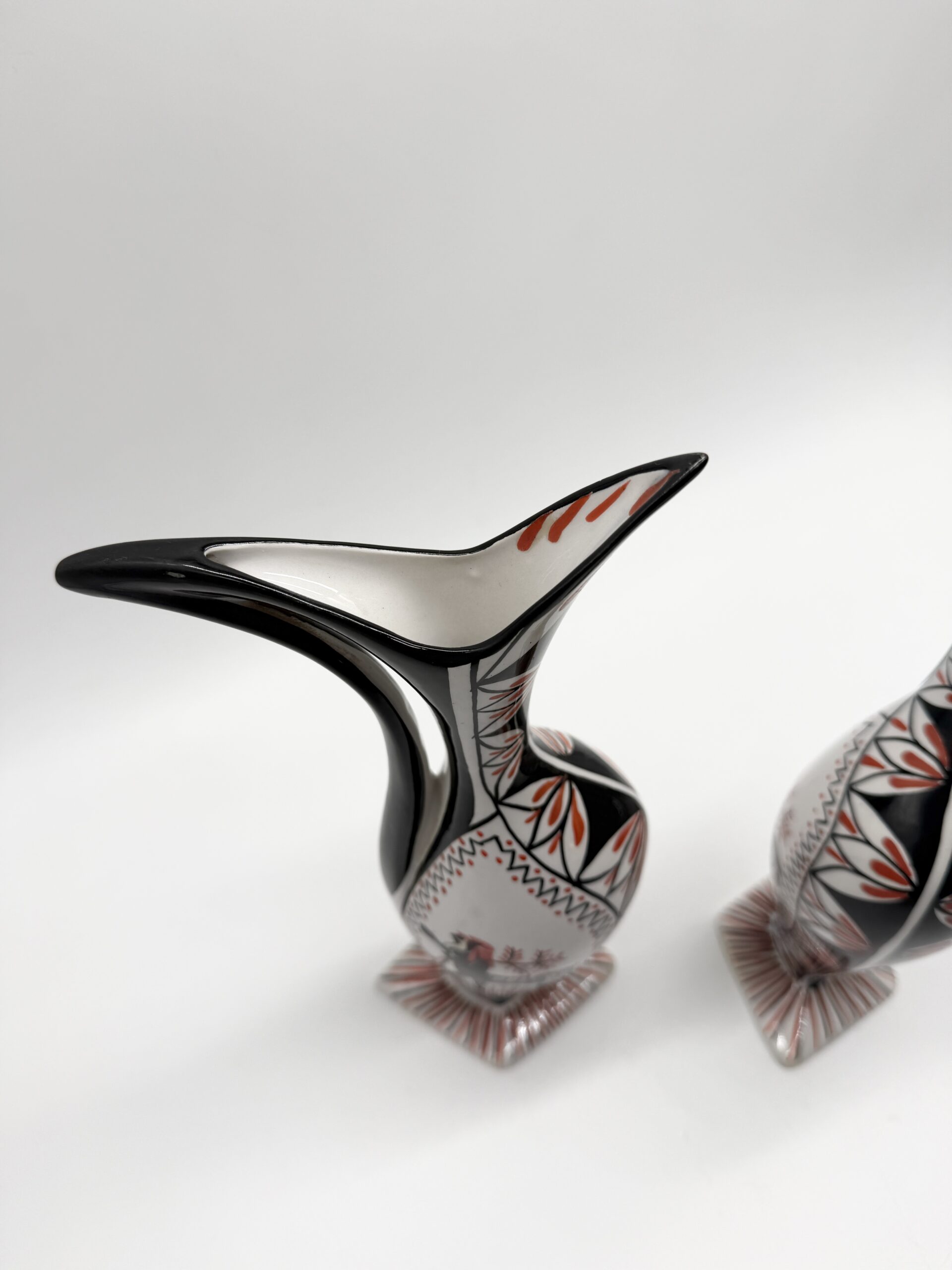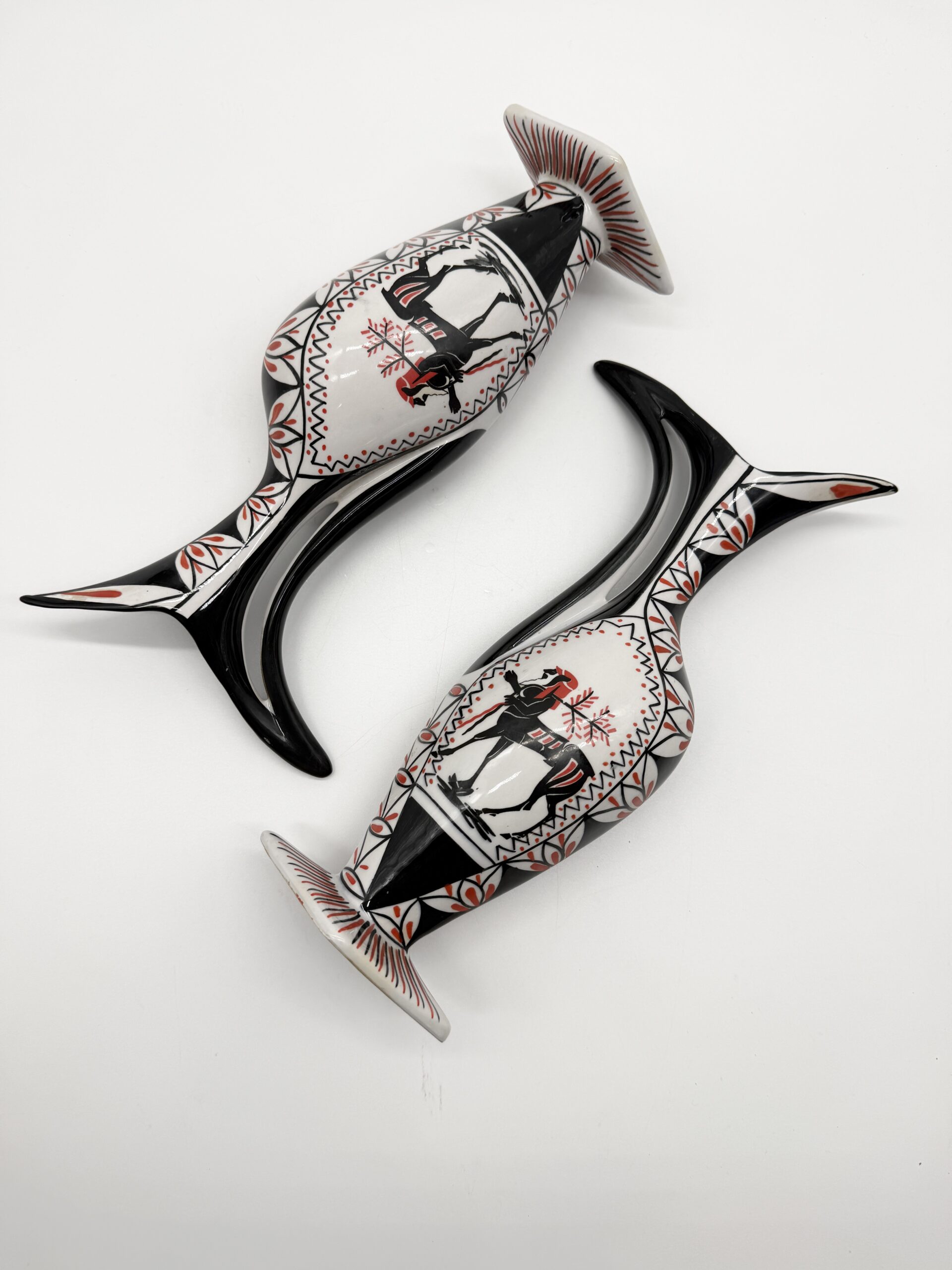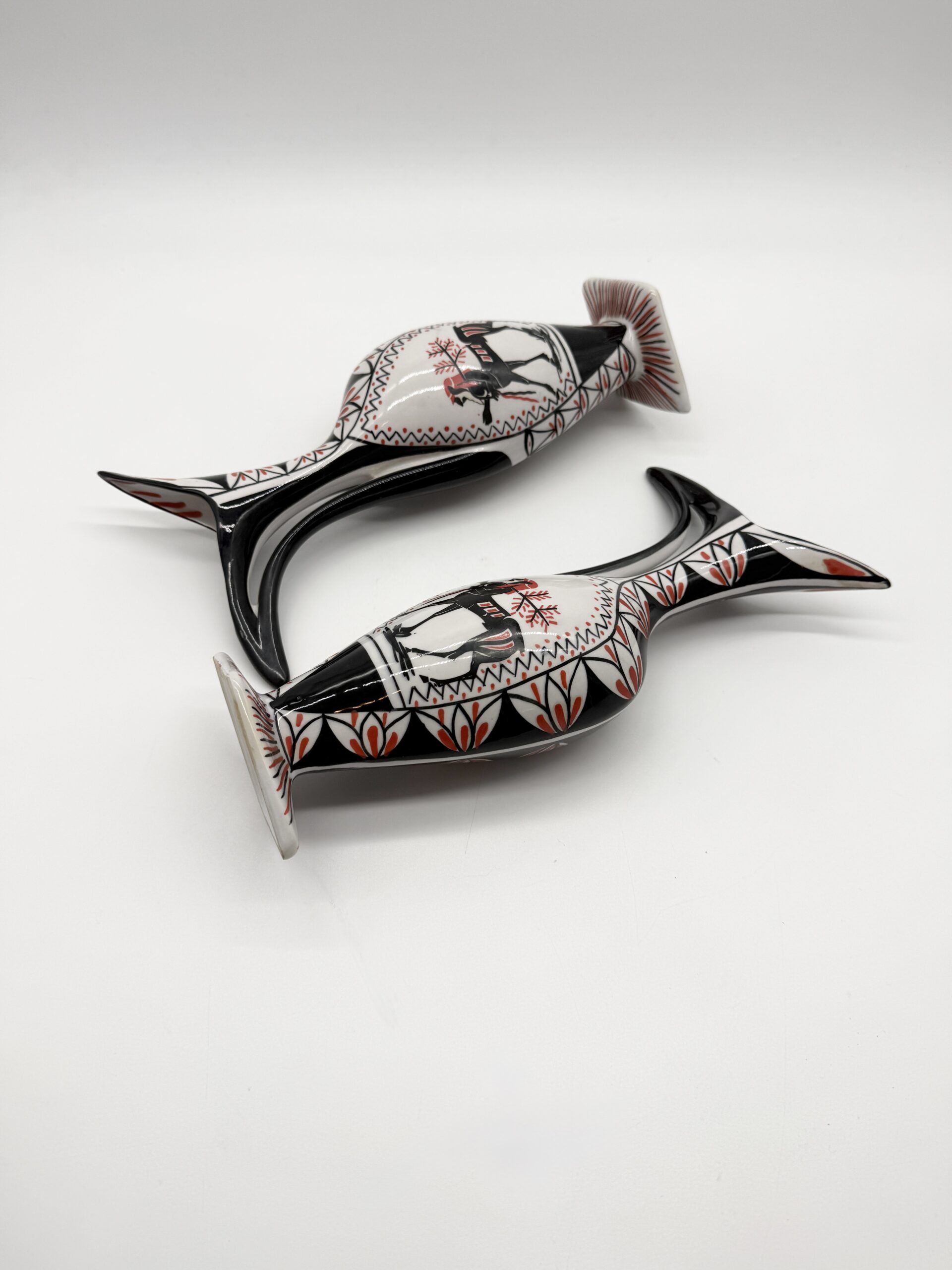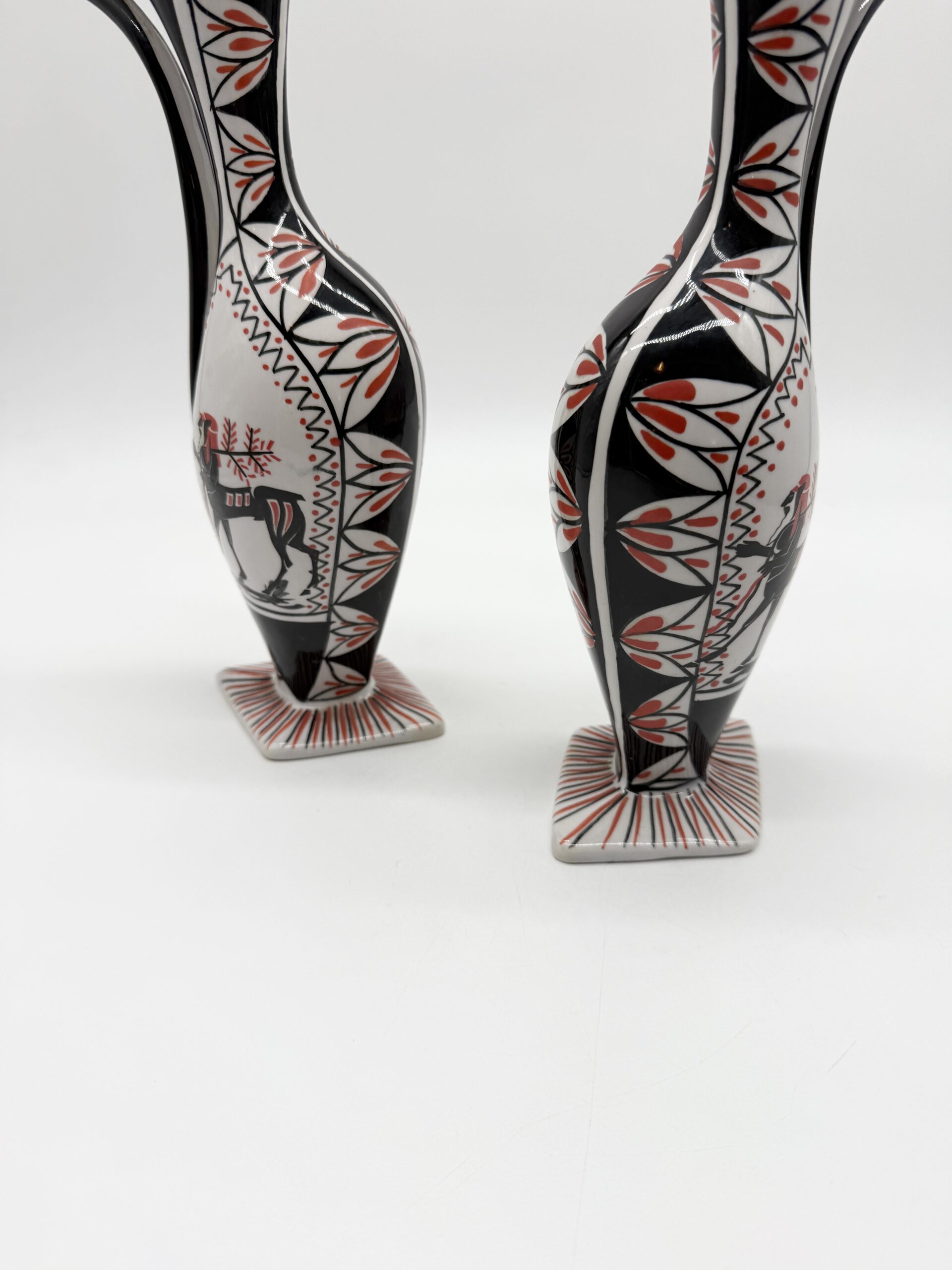 Leur silhouette sculpturale à bec verseur et anse intégrée est sublimée par un décor graphique noir, blanc et rouge représentant un cavalier stylisé, encadré de motifs géométriques.