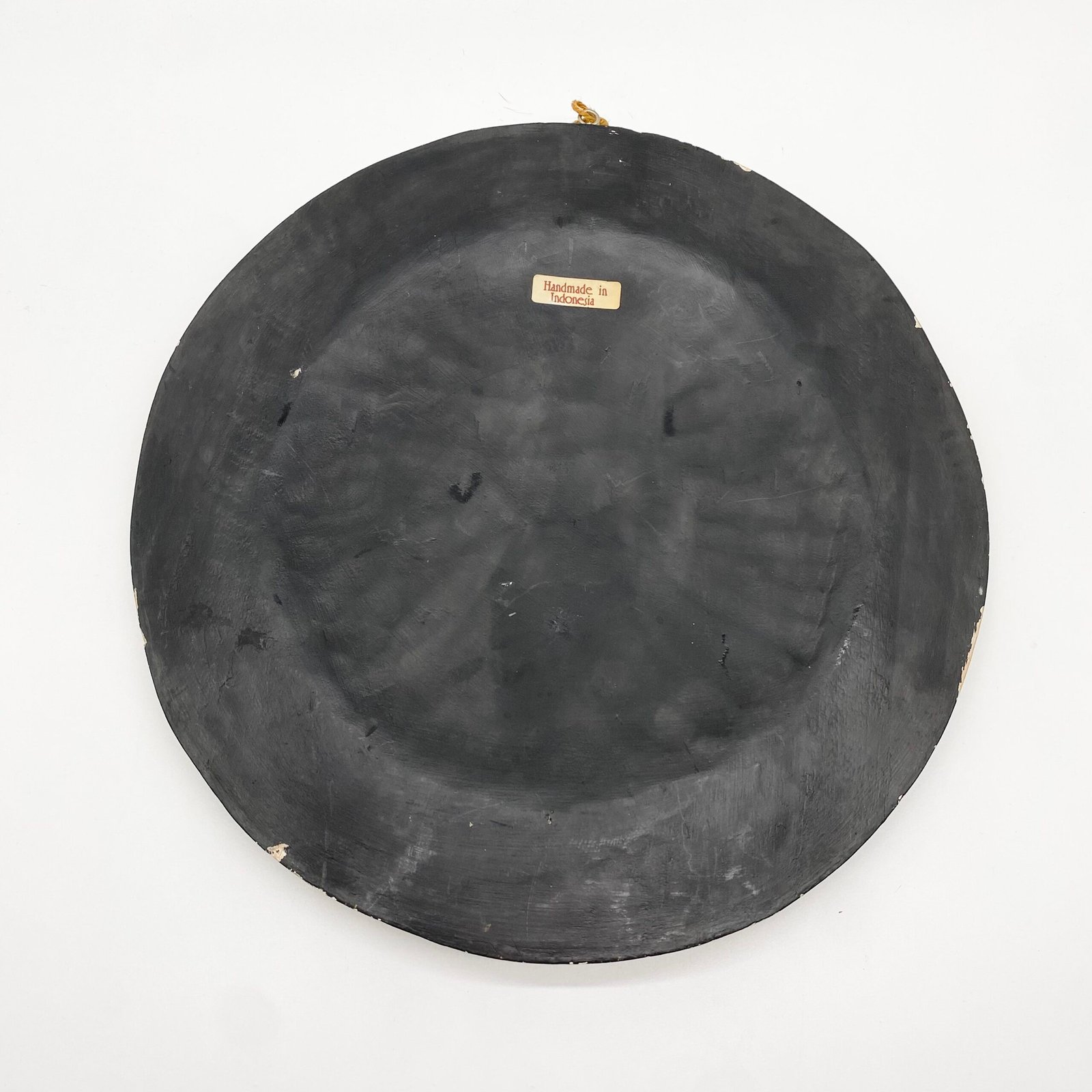 Grand panneau mural sculpté et peint, représentant un visage stylisé inscrit dans un disque solaire. Réalisé en bois polychrome aux teintes vives — jaune, bleu, rouge et rose —, il affiche une esthétique graphique et expressive rappelant l’art populaire latino-américain des années 1970.
