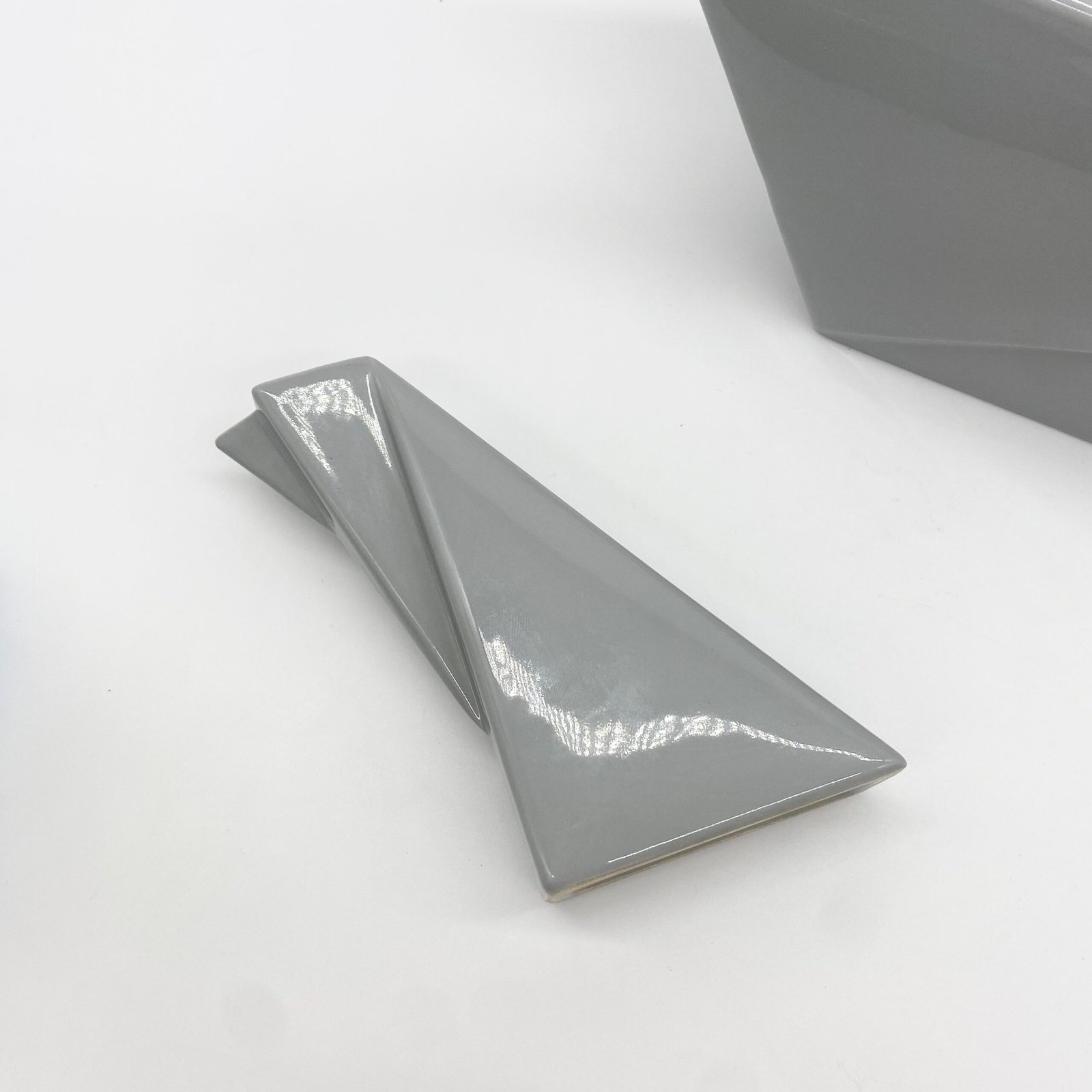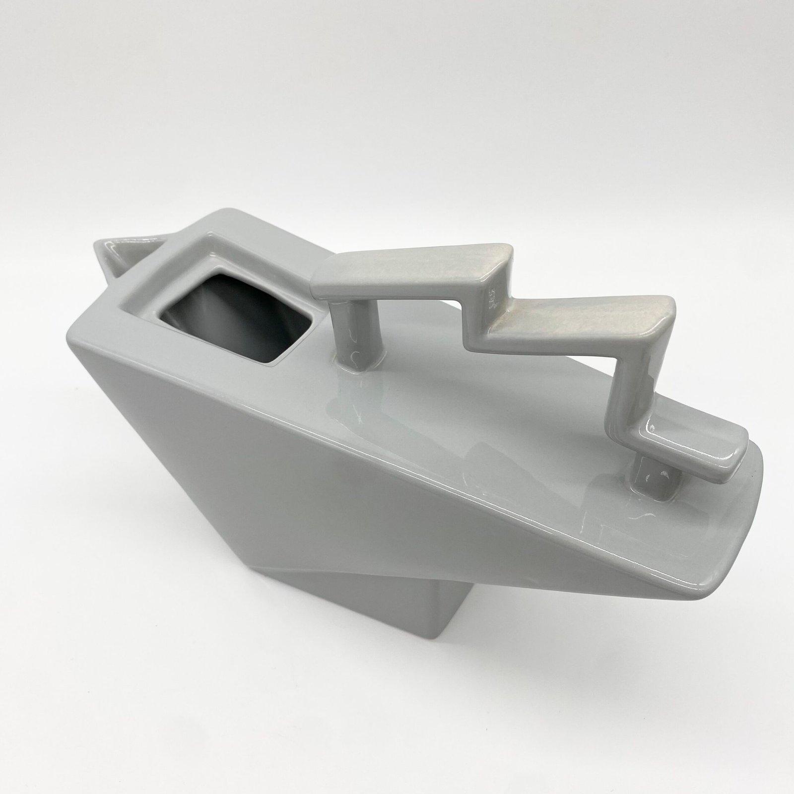 Réalisés en faïence émaillée, ces pièces se distinguent par leurs lignes géométriques audacieuses et leur anse zigzag évoquant l’esthétique Memphis des années 1980.