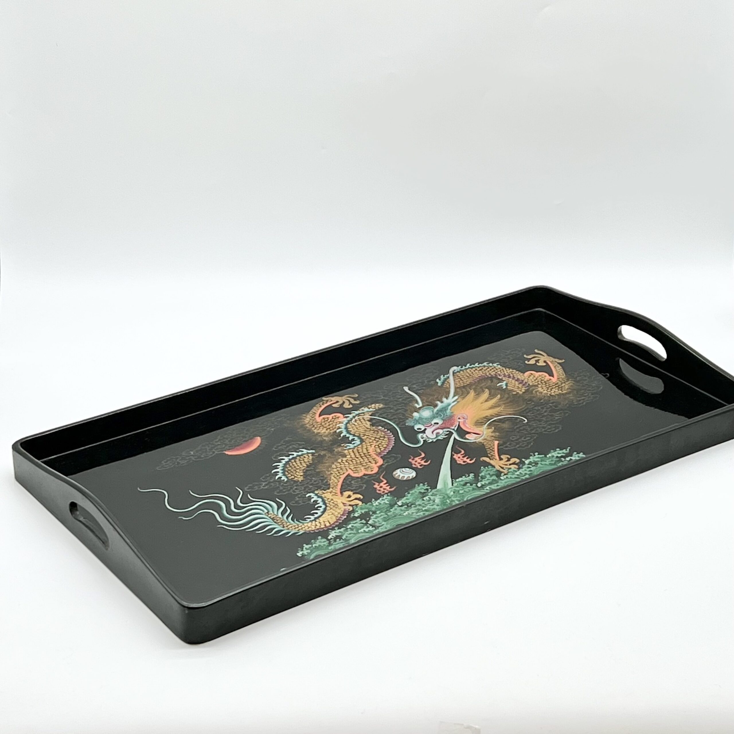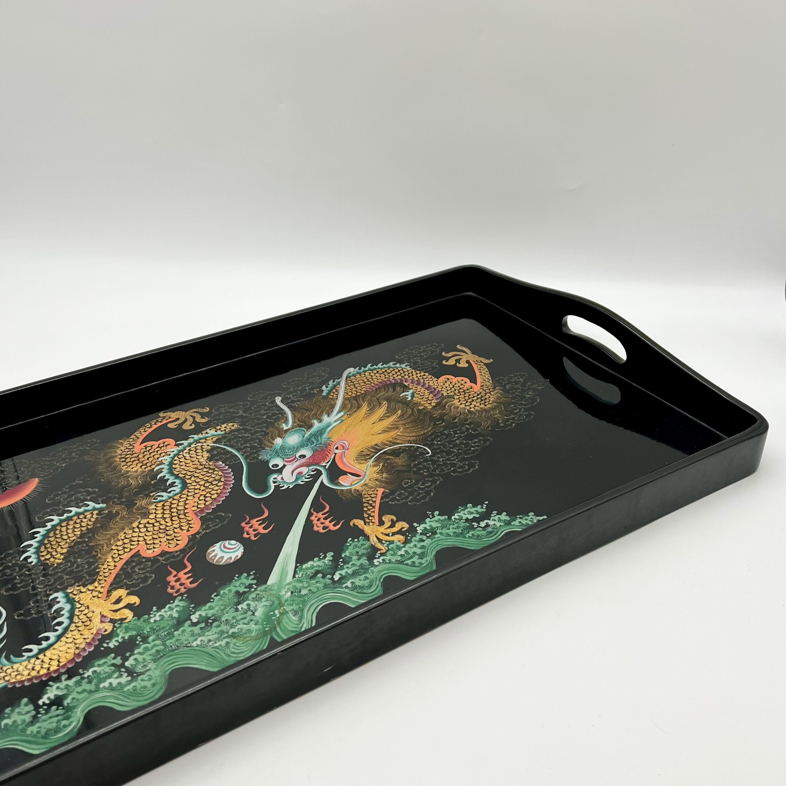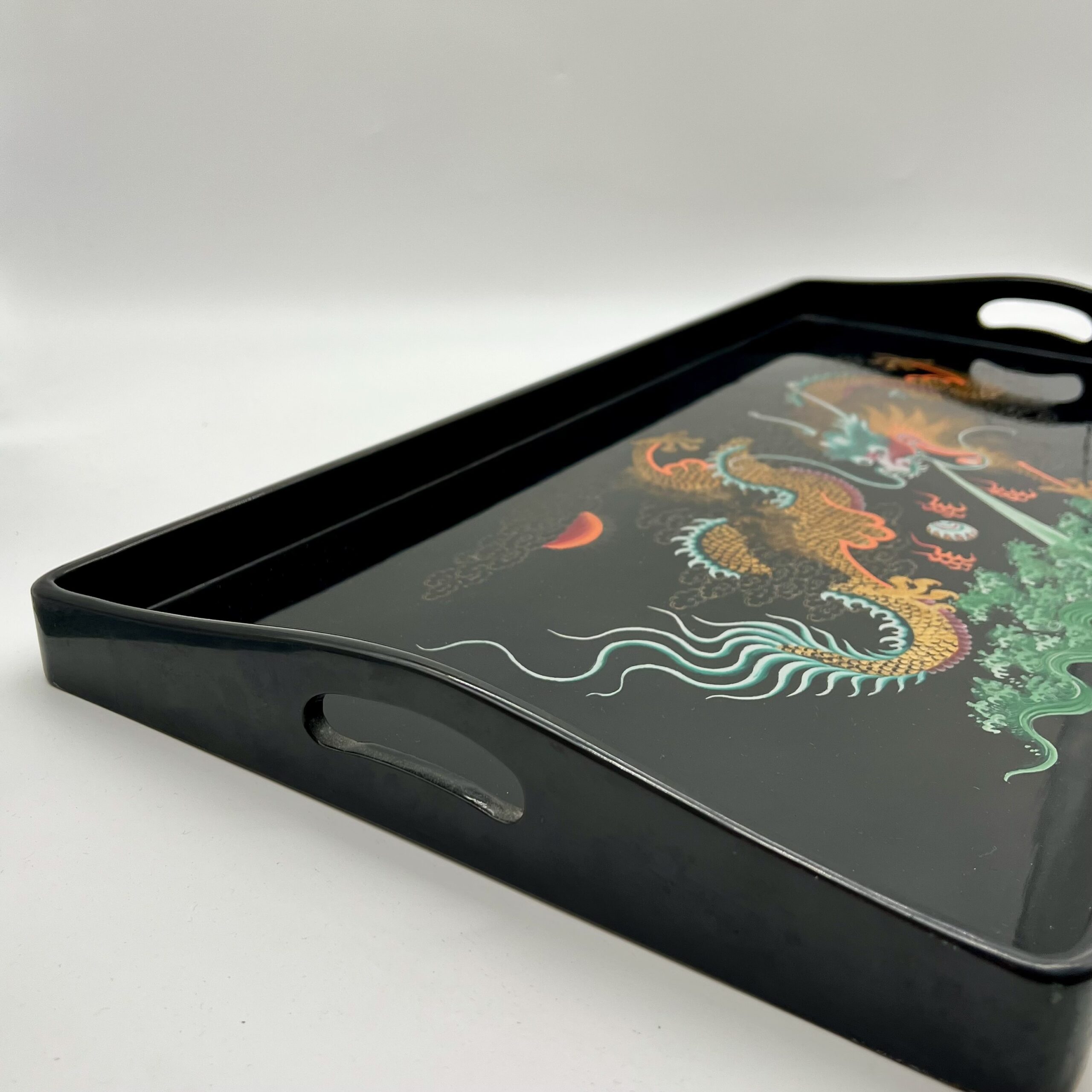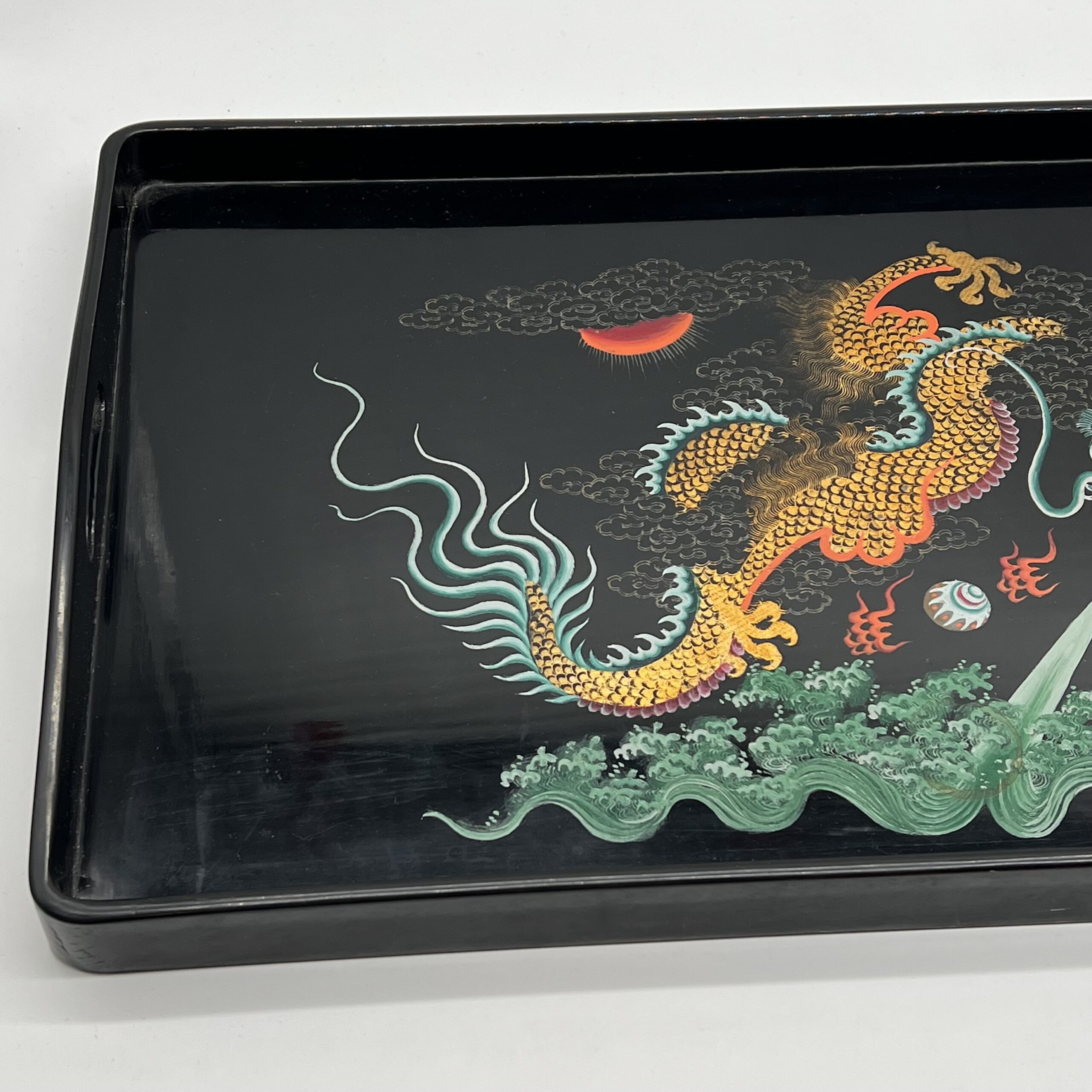 Grand plateau rectangulaire en bois laqué noir, orné d’un spectaculaire décor peint représentant un dragon impérial aux écailles dorées et multicolores, entouré de nuages et d’une lune rouge.