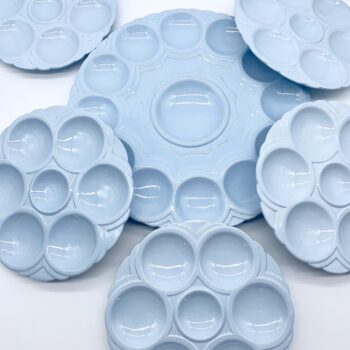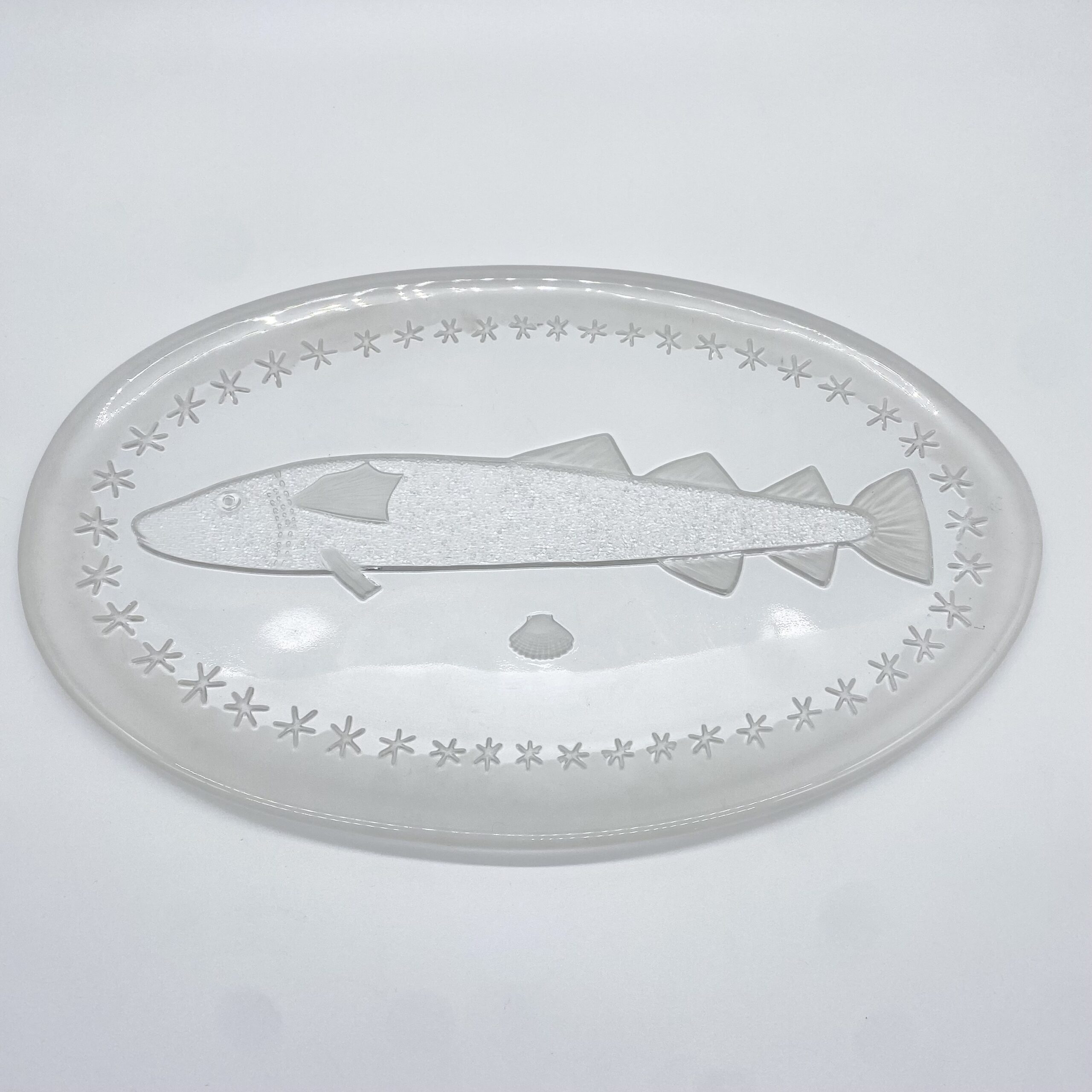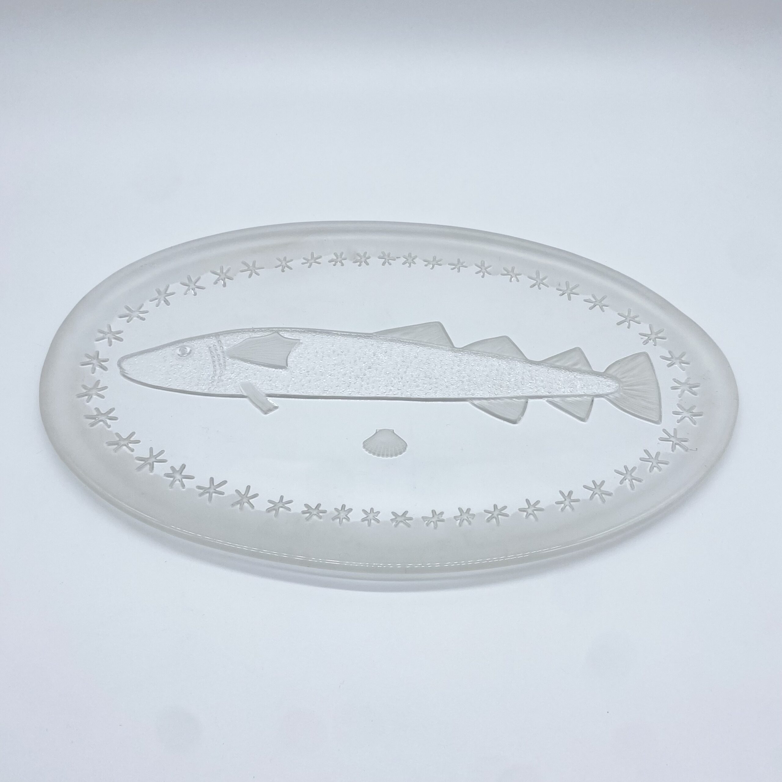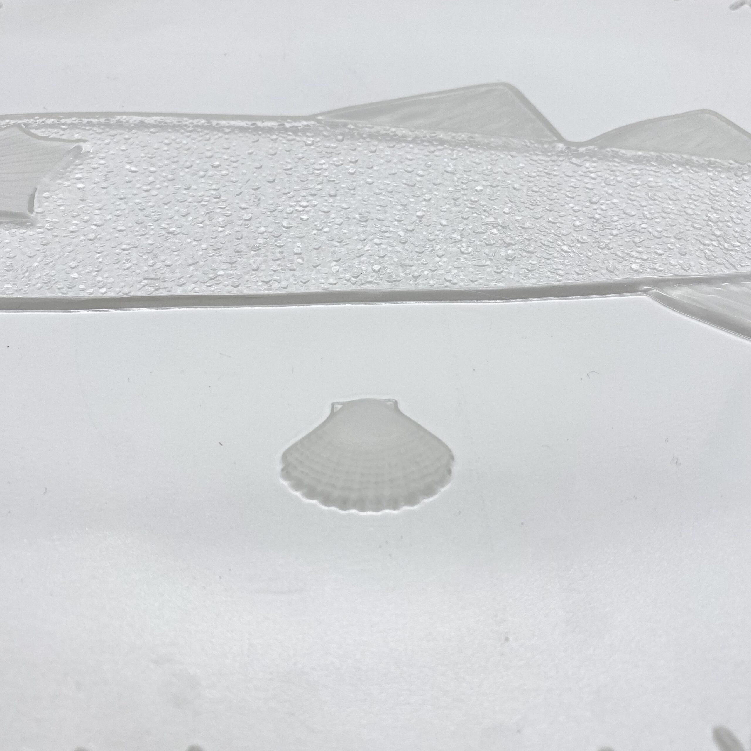 Réalisé en verre pressé transparent, il présente au centre un poisson stylisé en relief, entouré d’une frise décorative caractéristique de cette collection.