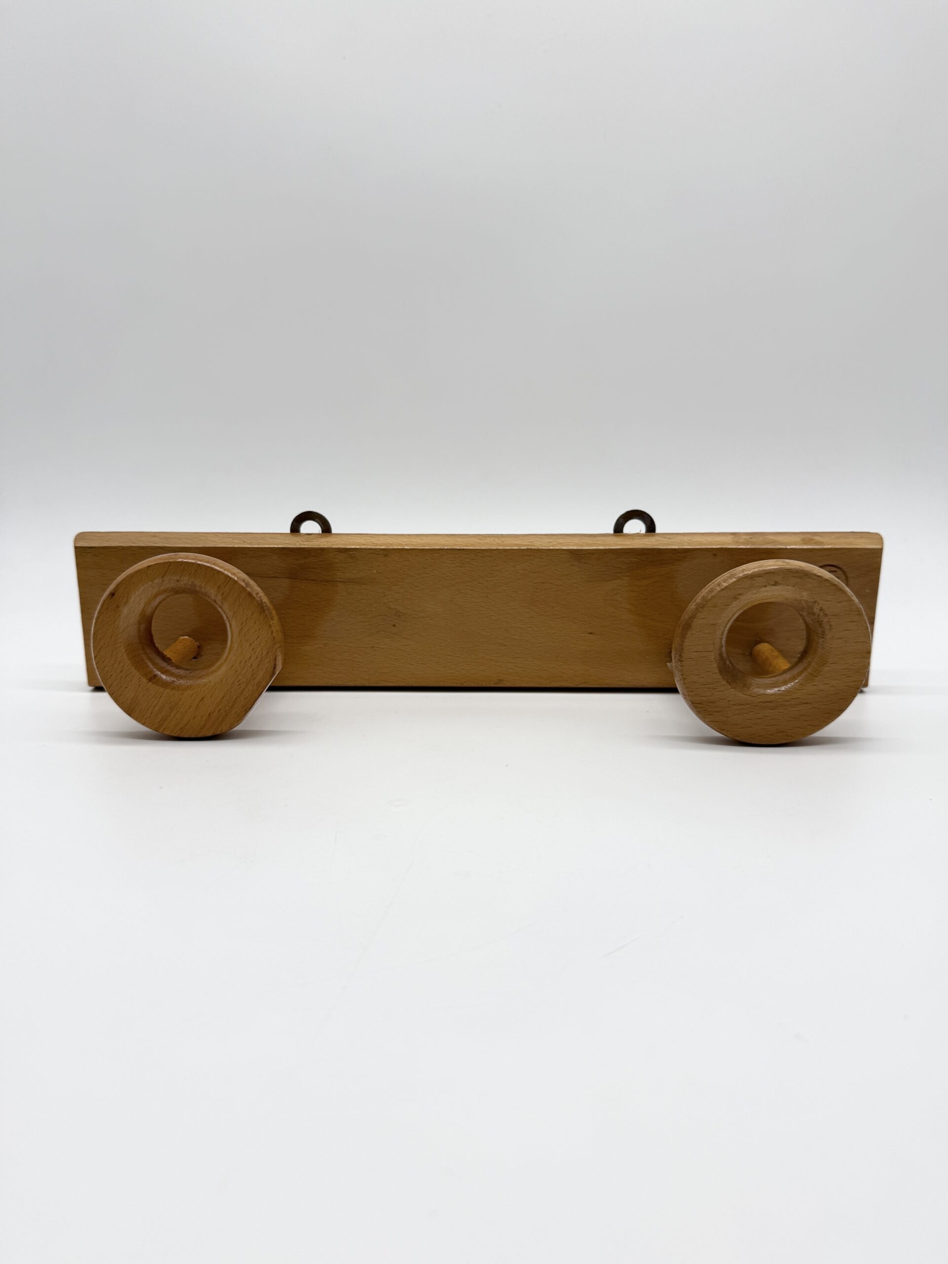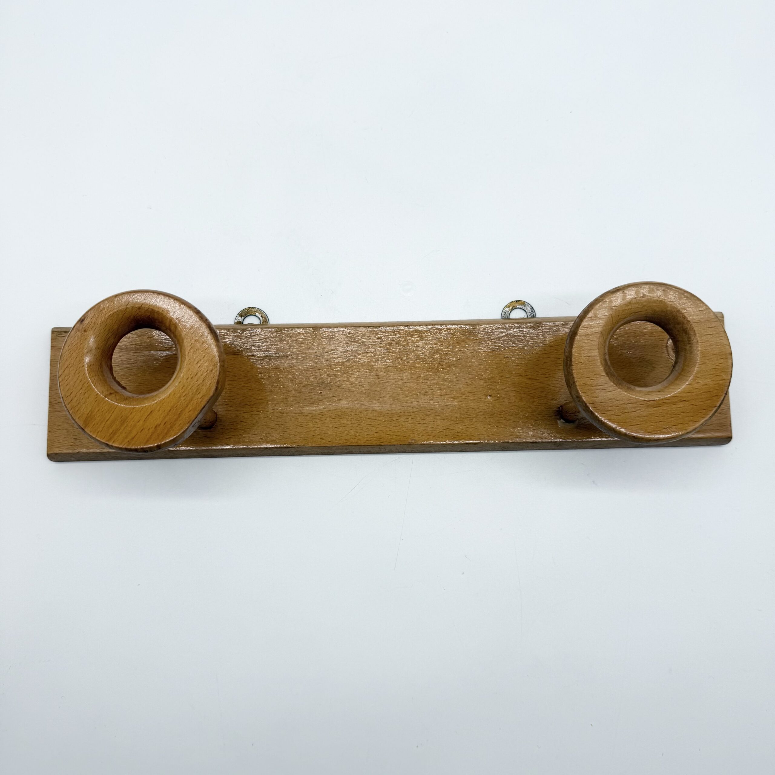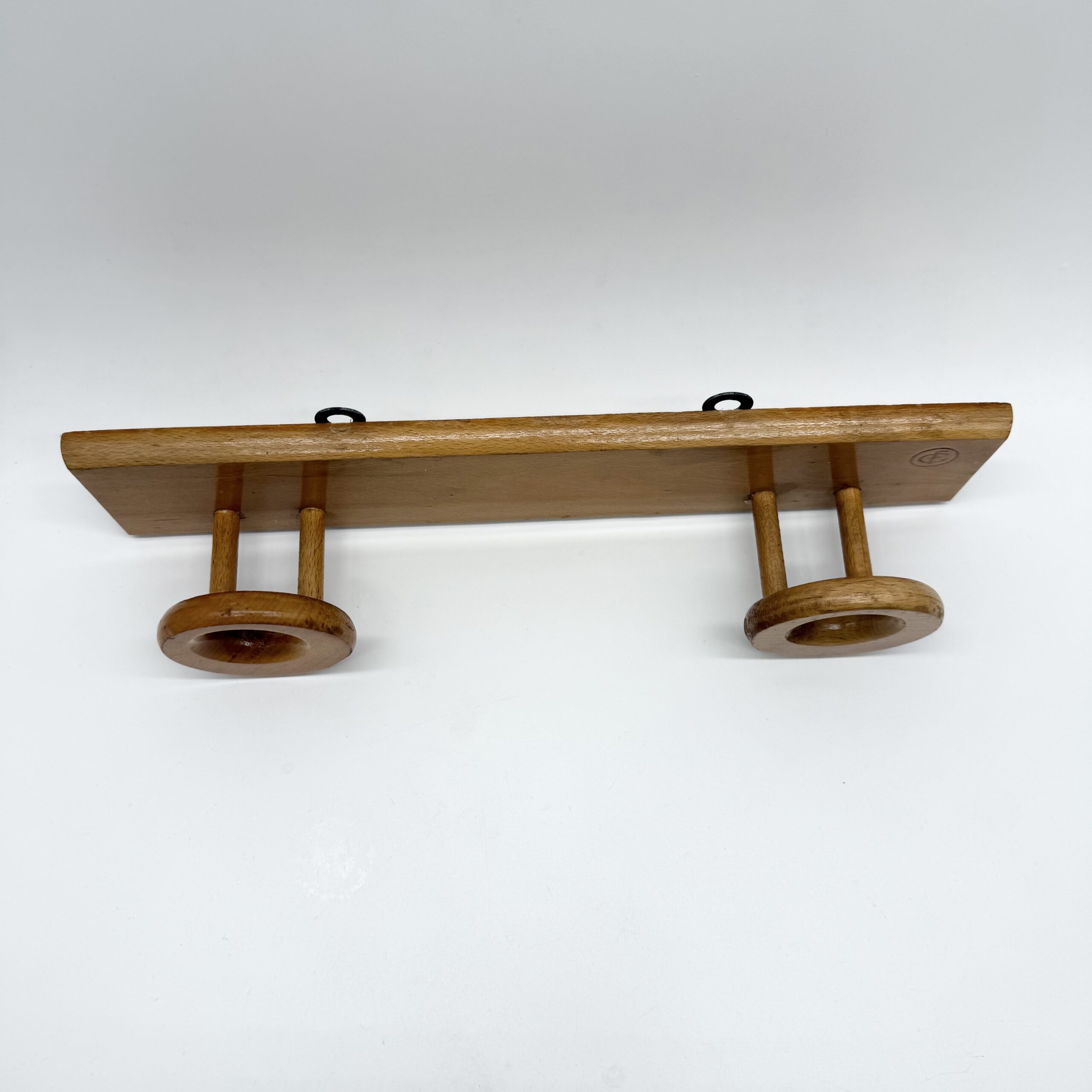Porte-manteau mural en bois clair au design minimaliste et chaleureux, composé d’une tablette rectangulaire et de deux patères sculptées en forme d’anneaux. Les crochets circulaires, aux lignes douces et généreuses, apportent une présence graphique et organique, typique du design scandinave des années 1960-1970.
