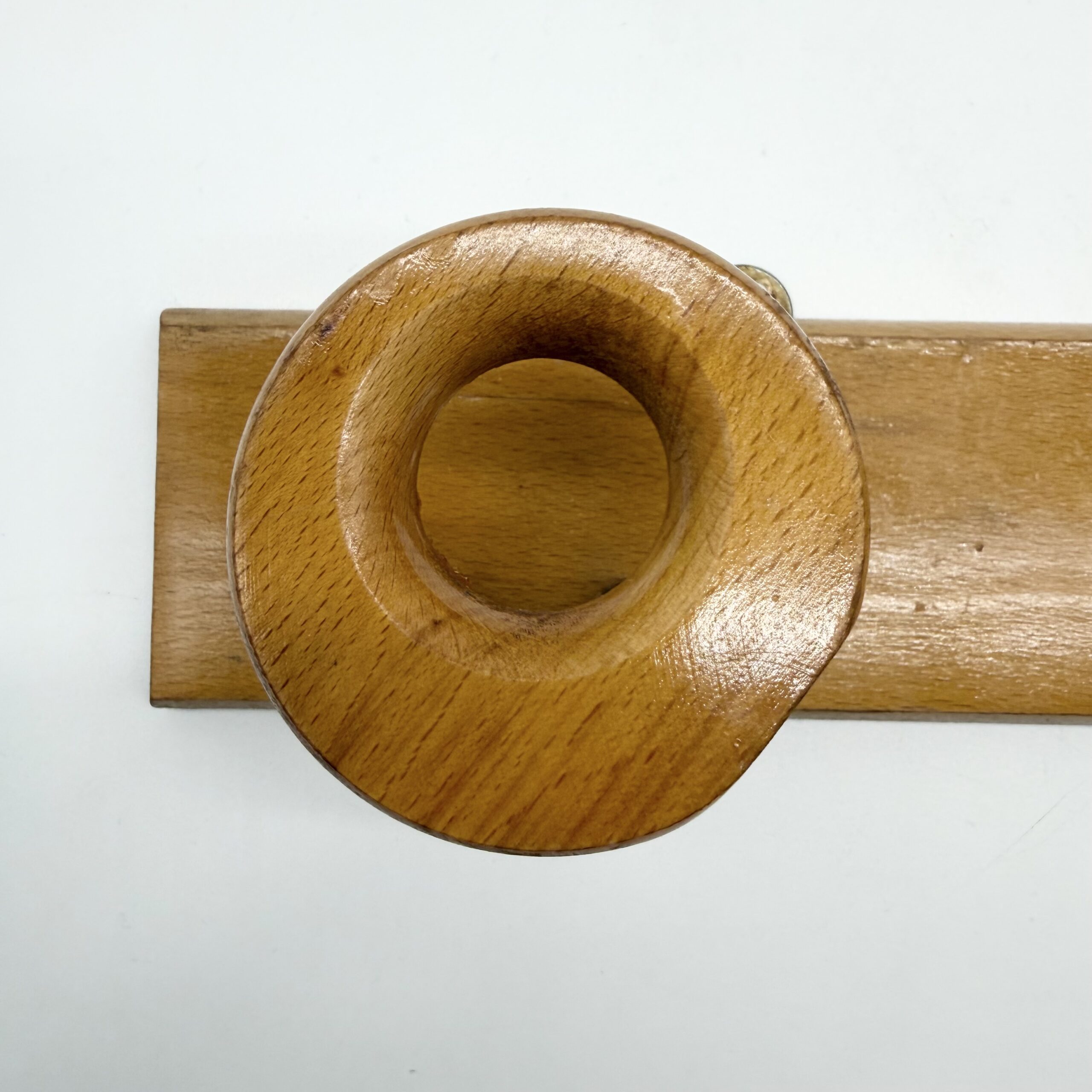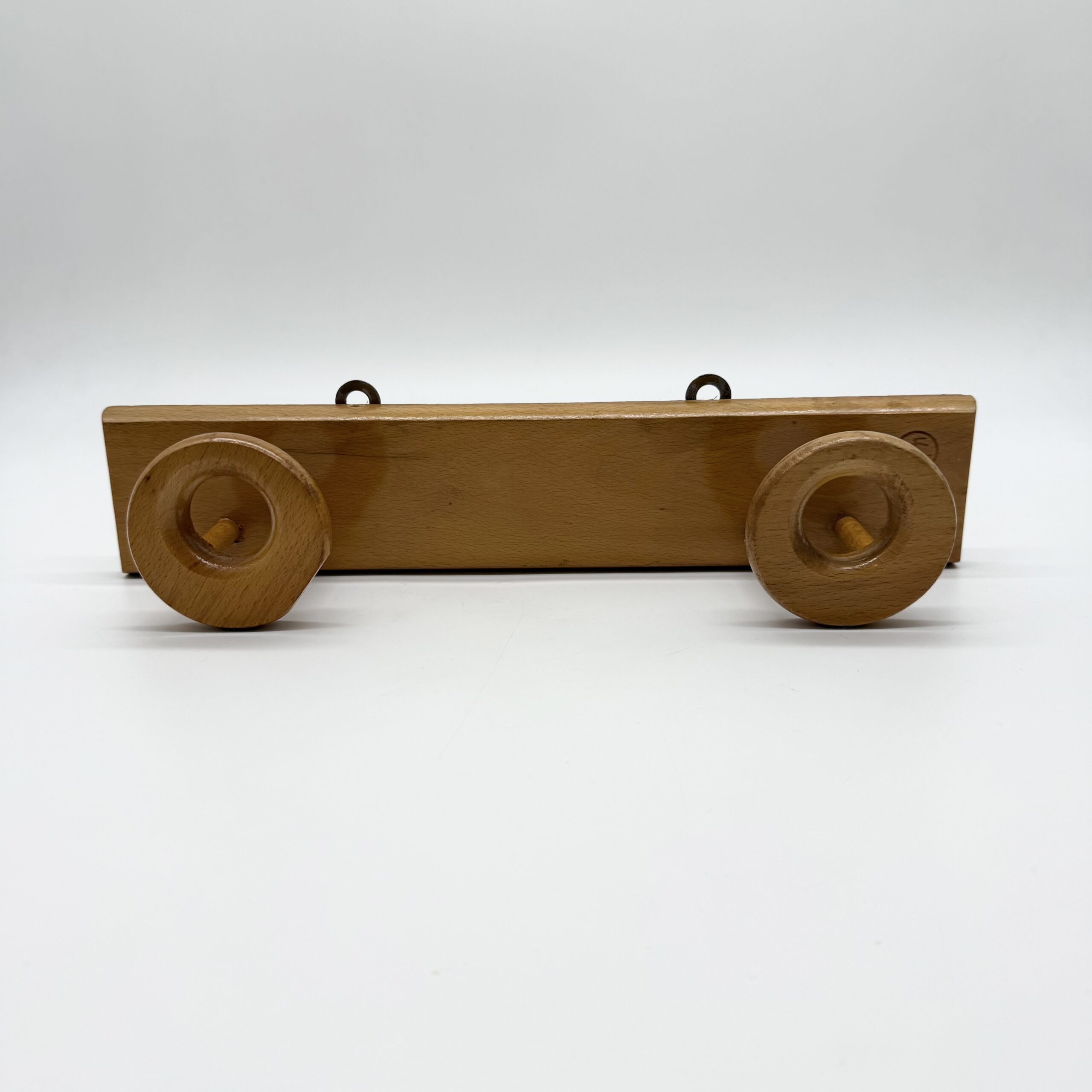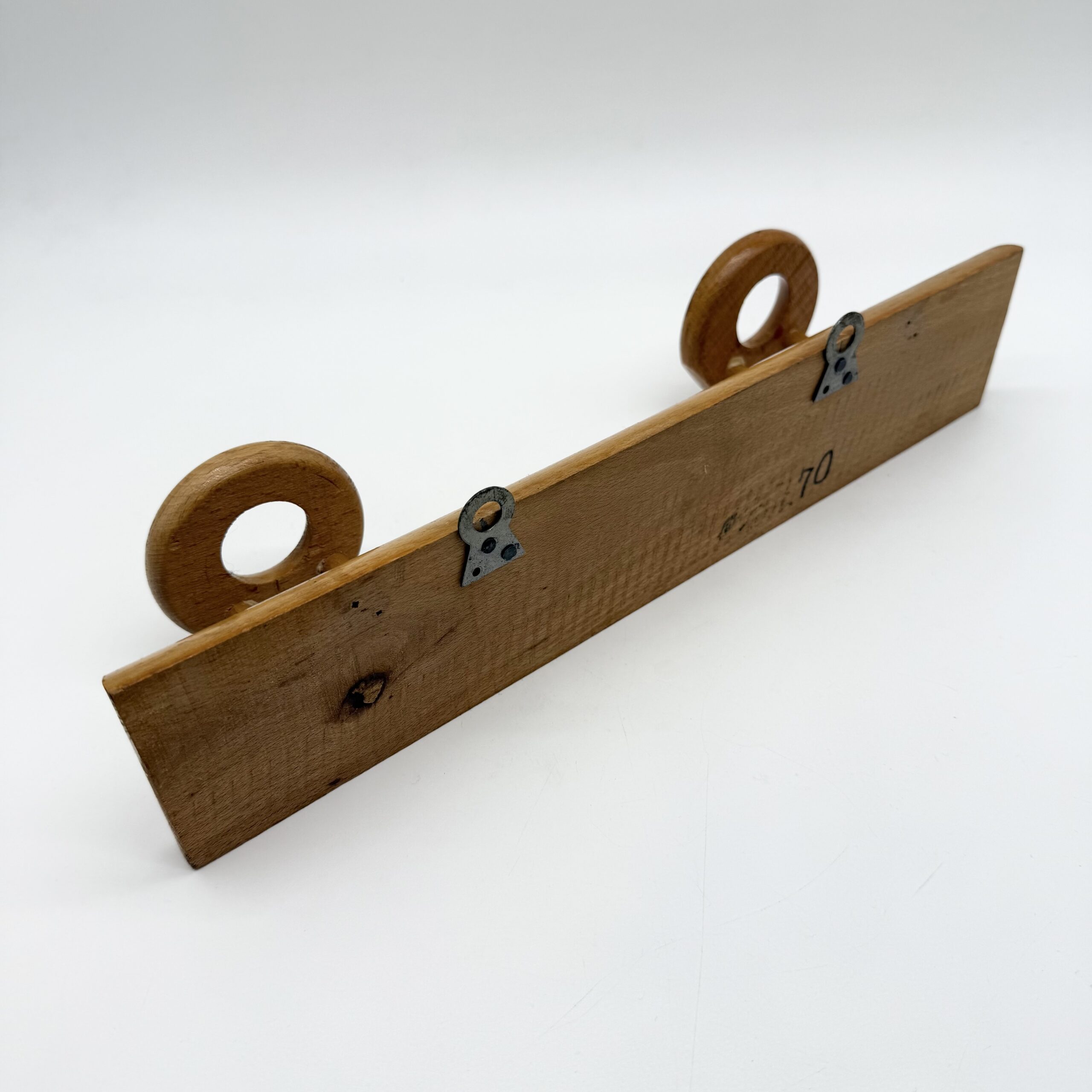 Porte-manteau mural en bois clair au design minimaliste et chaleureux, composé d’une tablette rectangulaire et de deux patères sculptées en forme d’anneaux. Les crochets circulaires, aux lignes douces et généreuses, apportent une présence graphique et organique, typique du design scandinave des années 1960-1970.