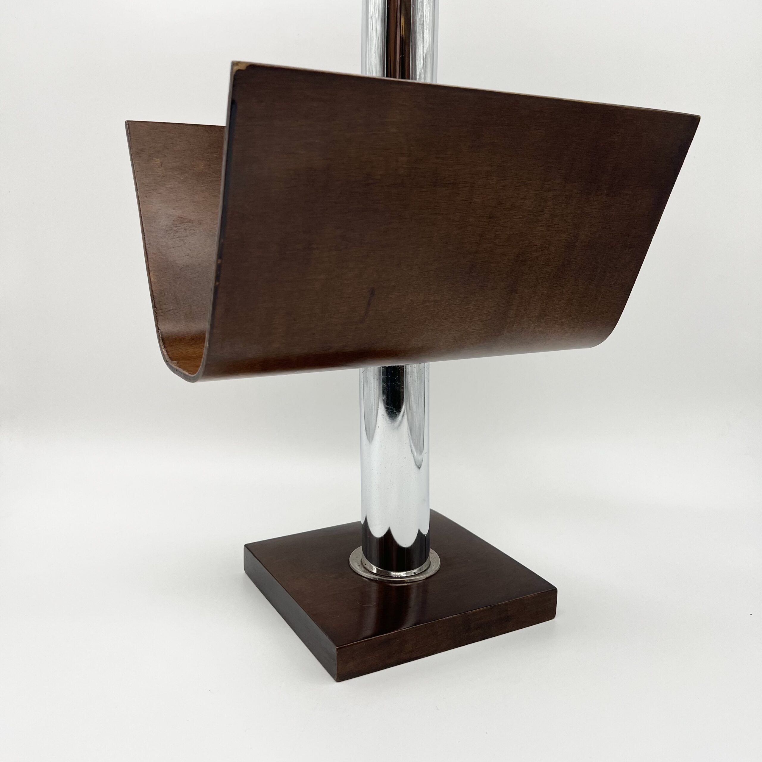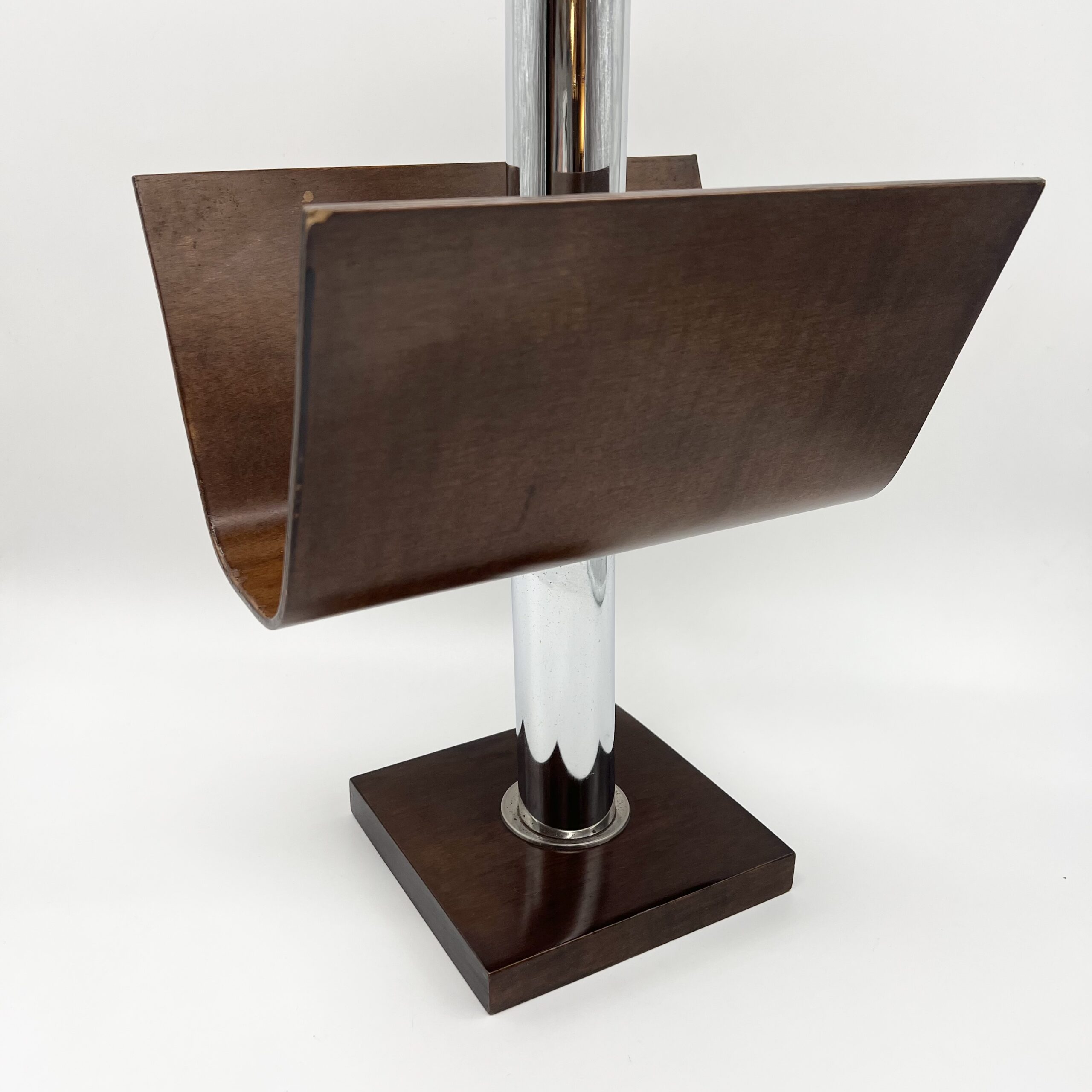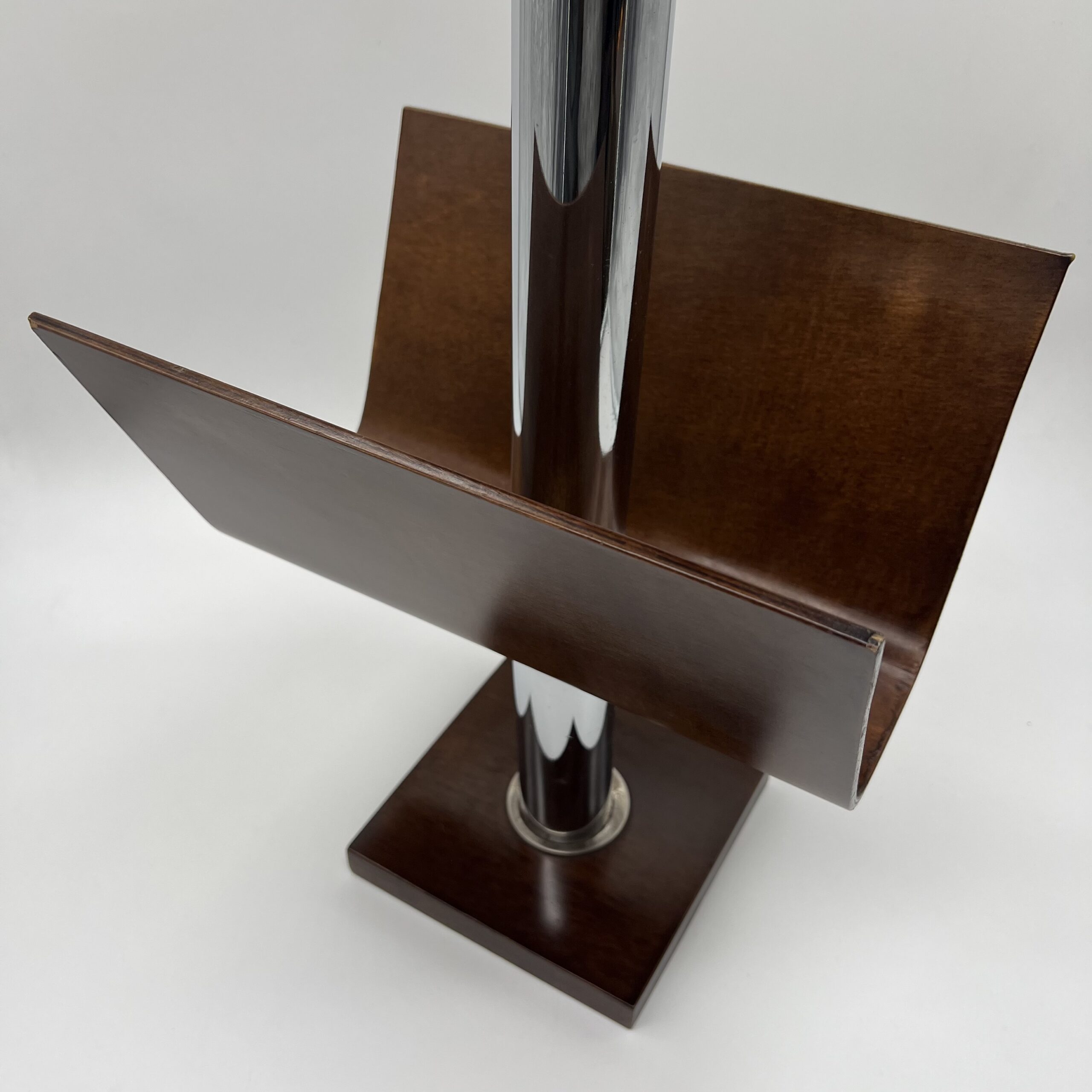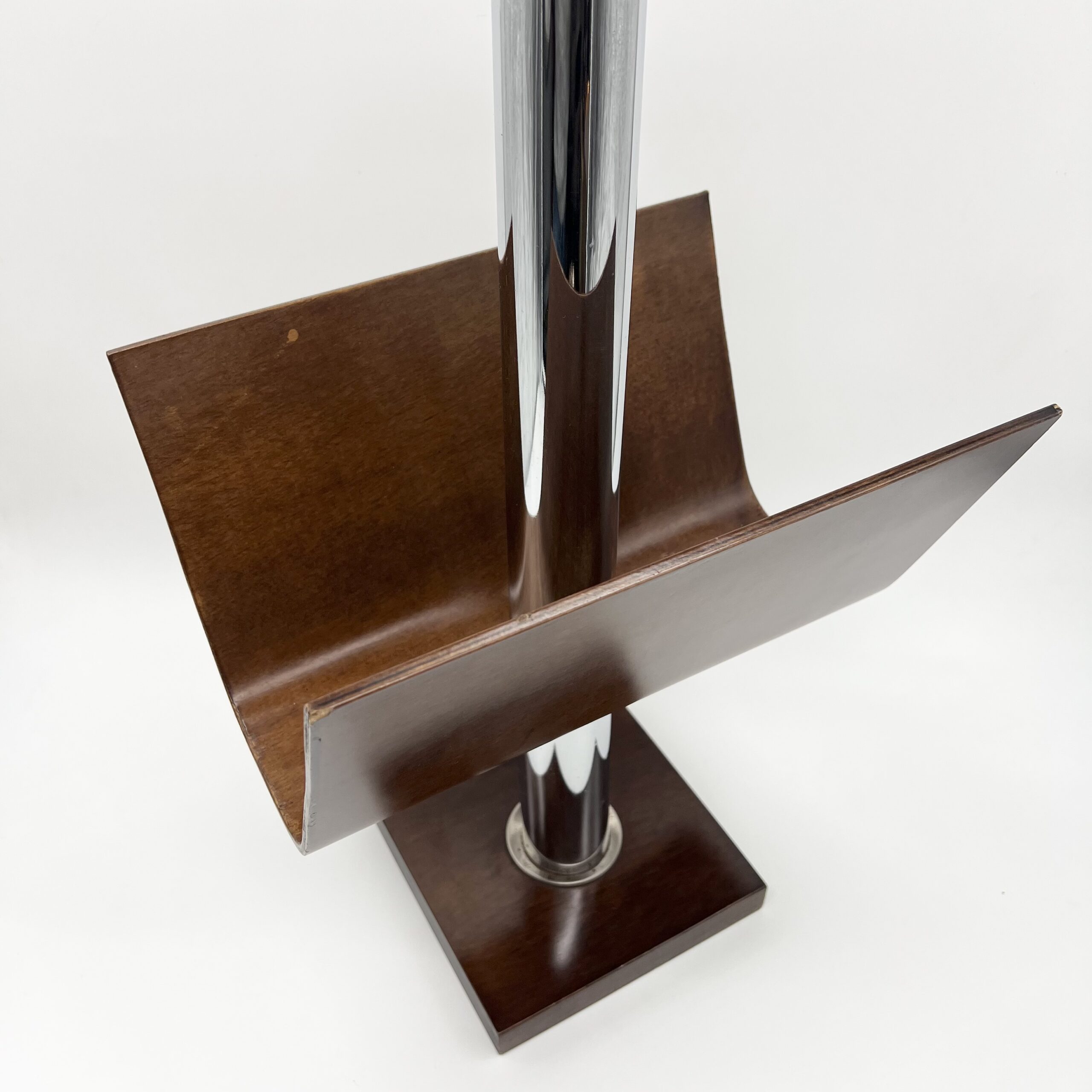Élégant porte-revue italien mêlant bois teinté et métal chromé, représentatif du design transalpin des années 1970.
