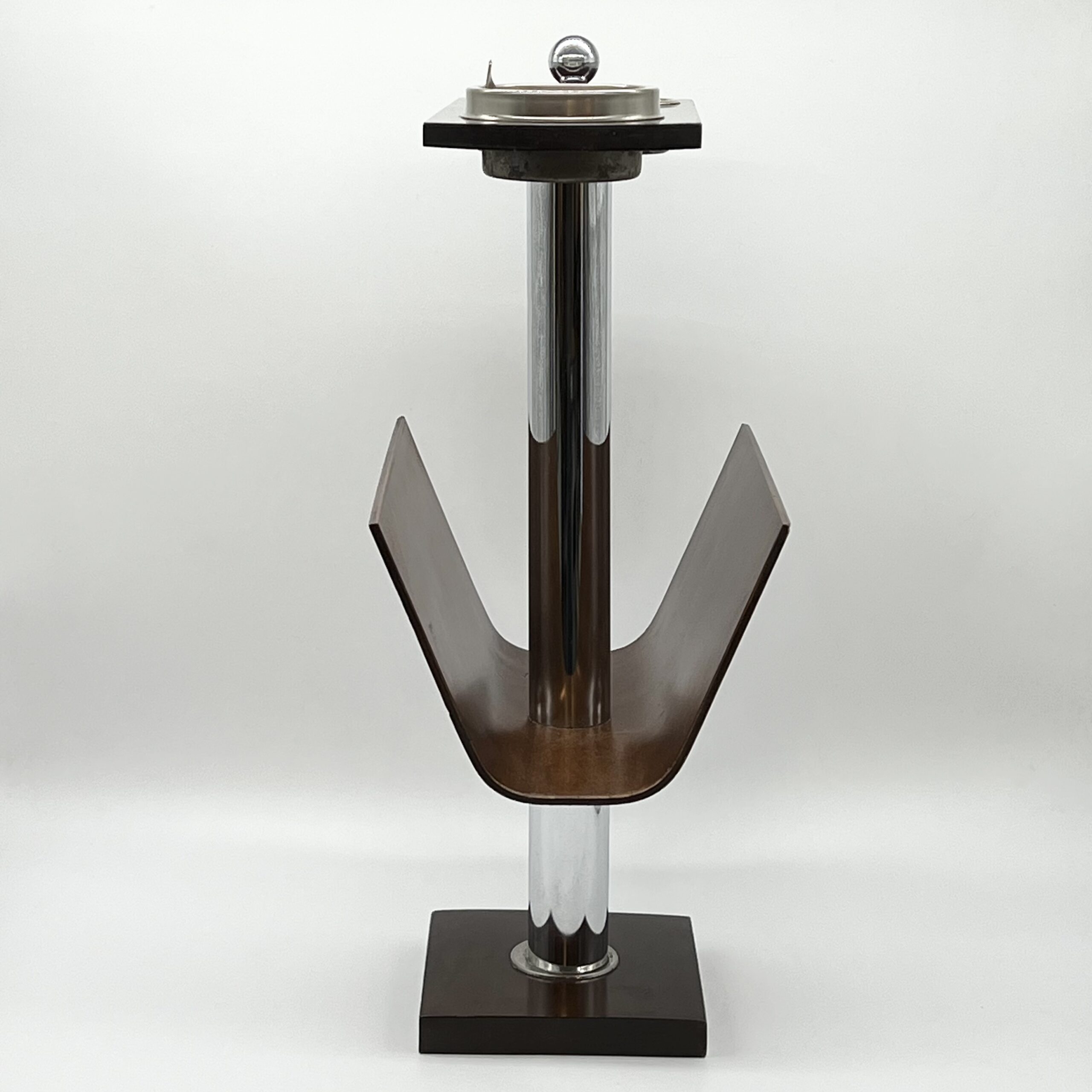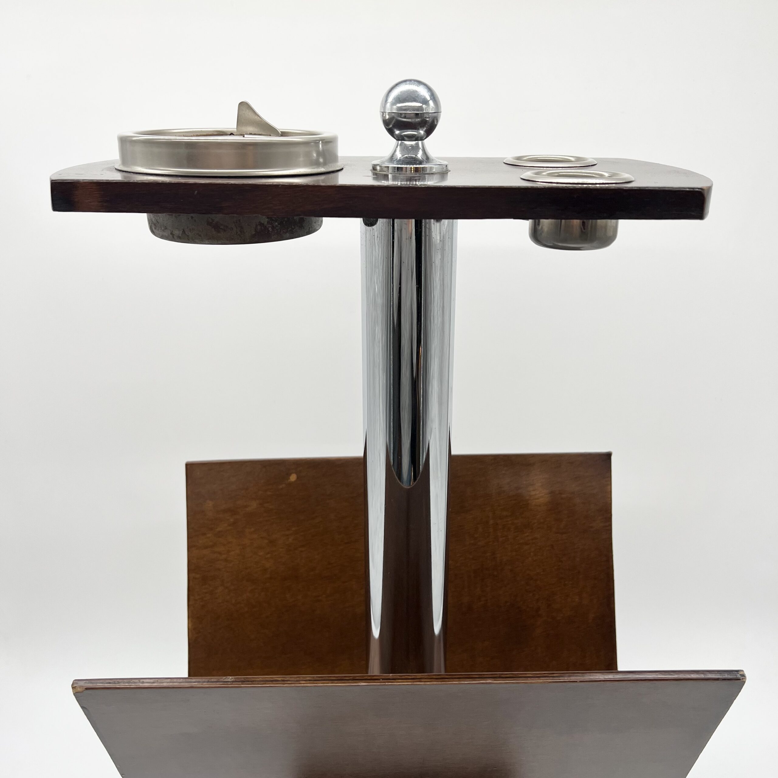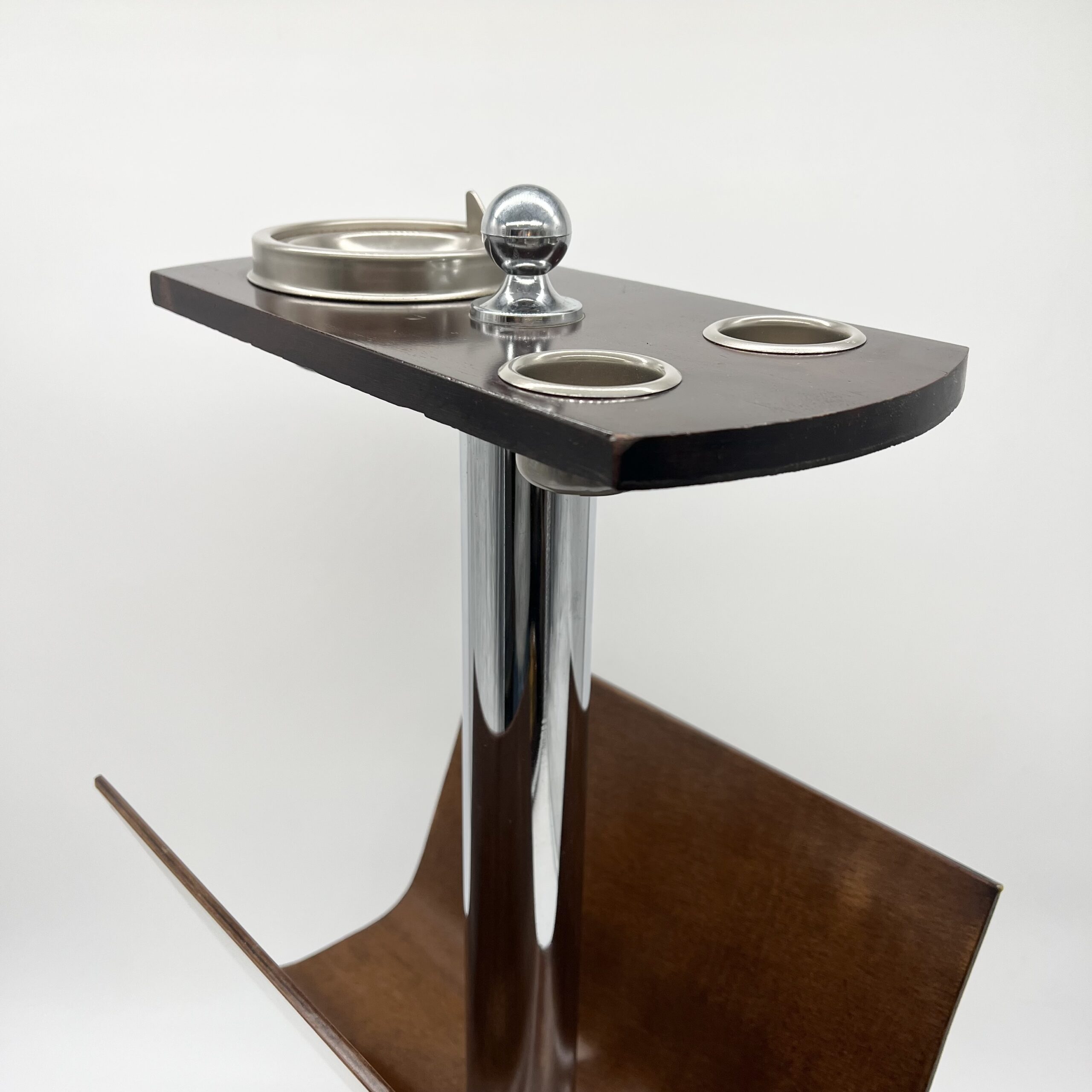 La colonne centrale en tube chromé supporte un plateau supérieur doté d’un cendrier intégré et de deux emplacements circulaires, tandis que la partie inférieure accueille un large compartiment en bois courbé destiné aux magazines.