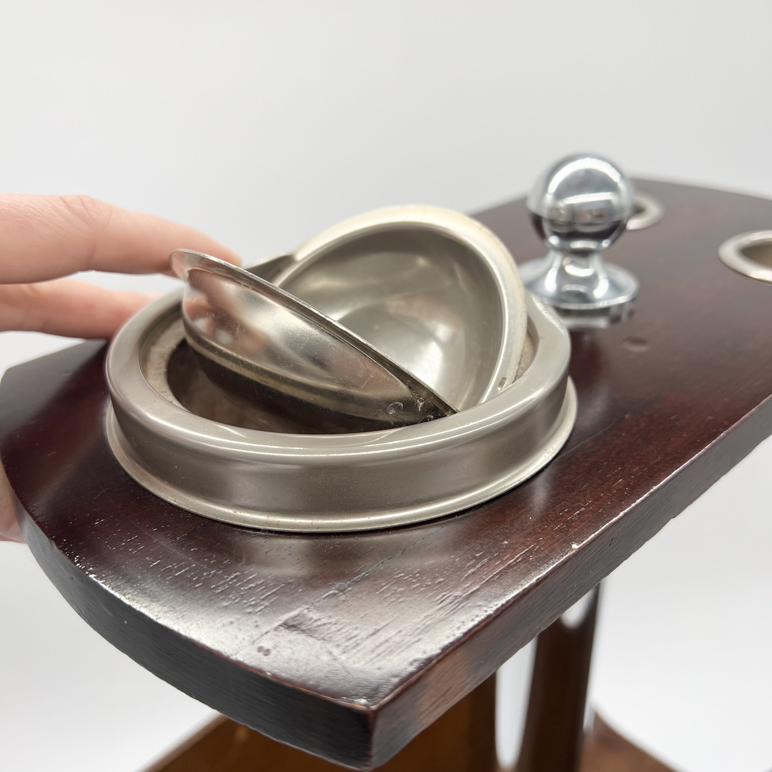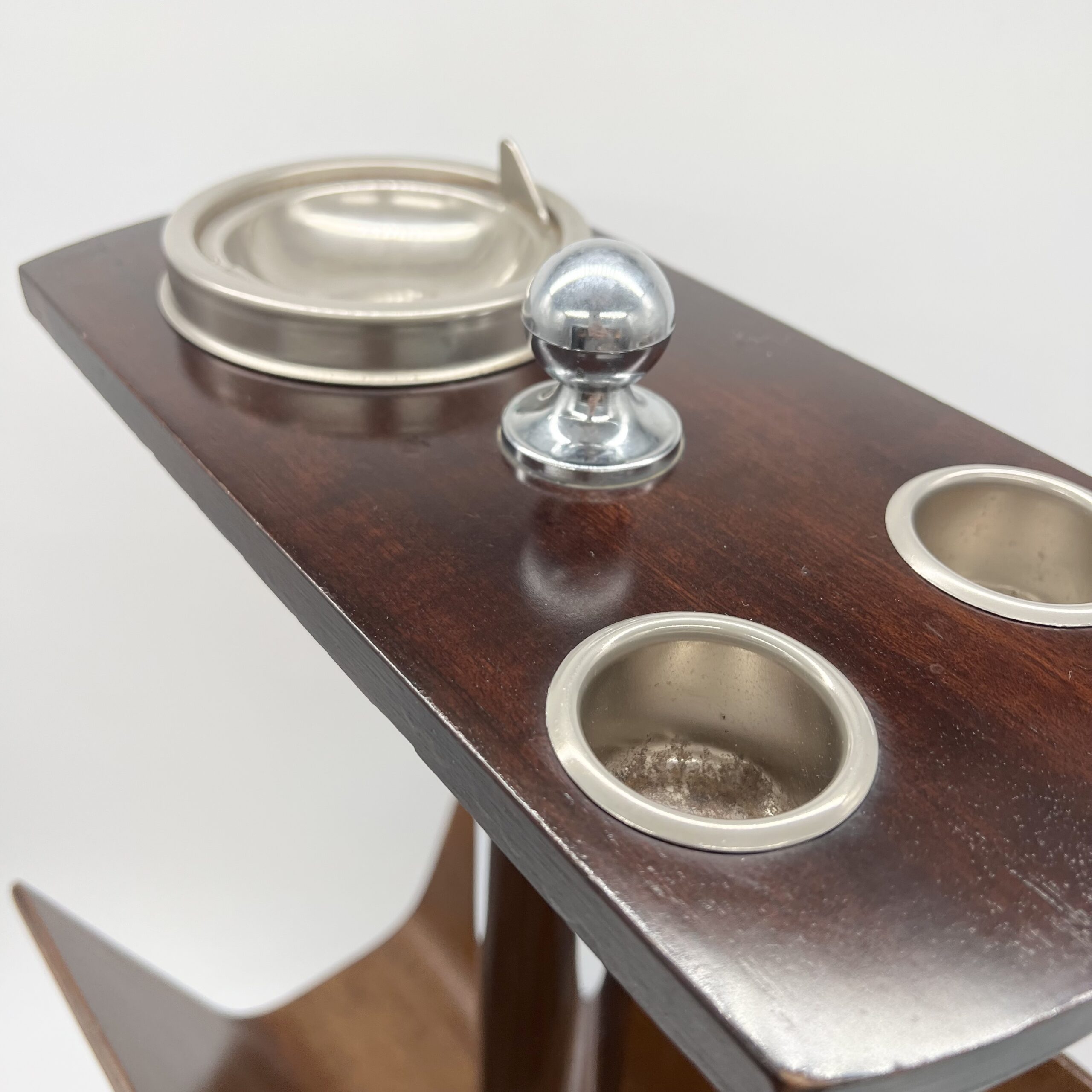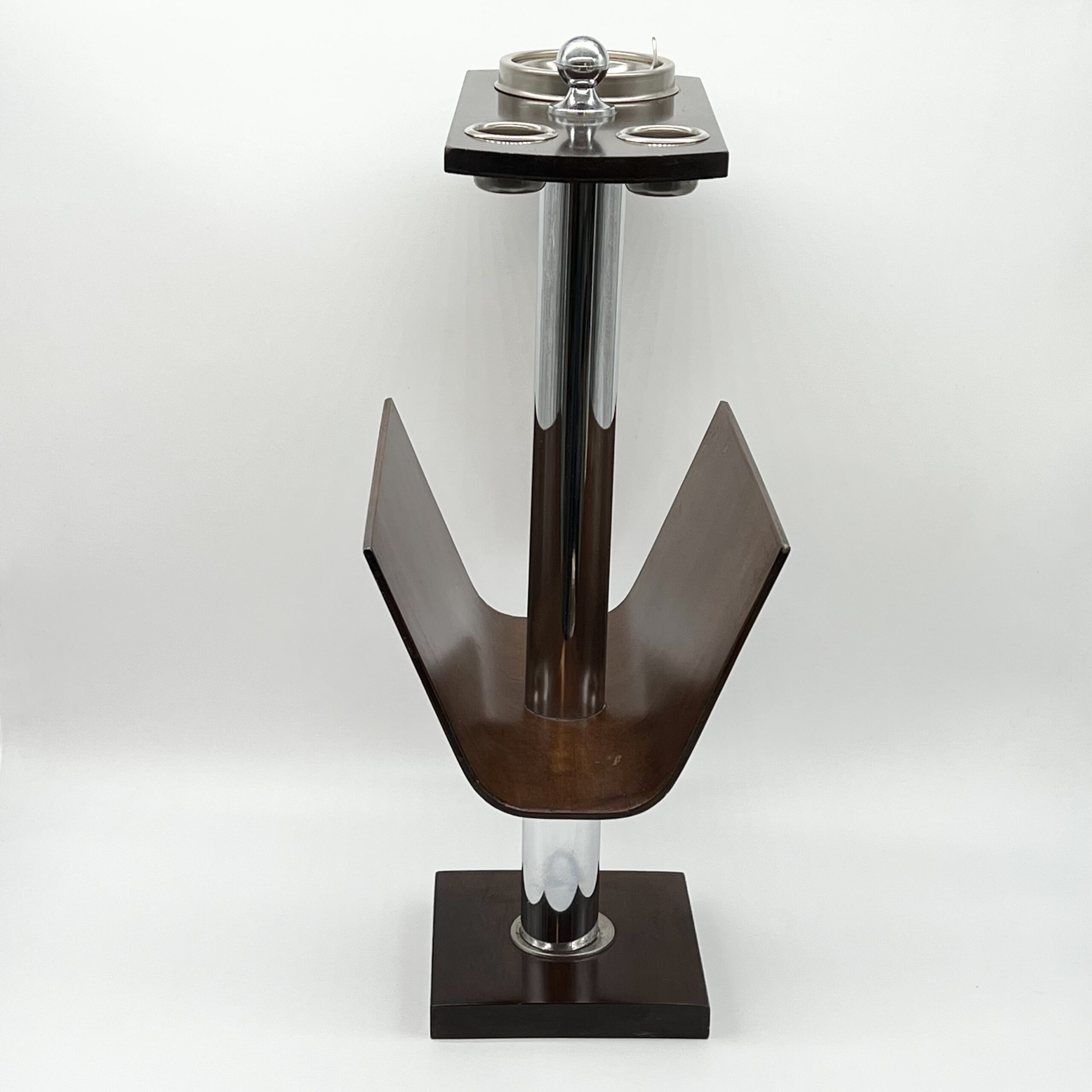La colonne centrale en tube chromé supporte un plateau supérieur doté d’un cendrier intégré et de deux emplacements circulaires, tandis que la partie inférieure accueille un large compartiment en bois courbé destiné aux magazines.
