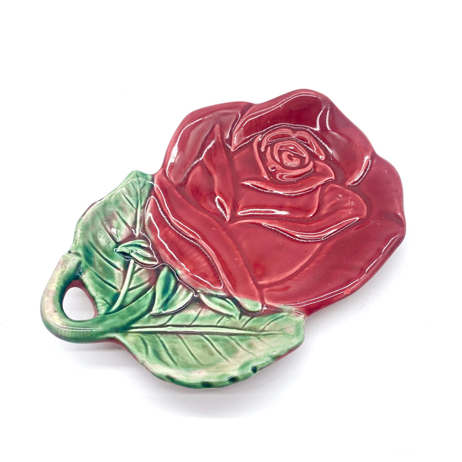 Élégant plat en céramique émaillée en forme de rose, réalisé au Japon dans les années 60. Son émail aux nuances de rouge intense et de vert profond met en valeur son relief délicat et son design romantique. Une pièce décorative raffinée, parfaite en vide-poche, plateau ou objet de collection.