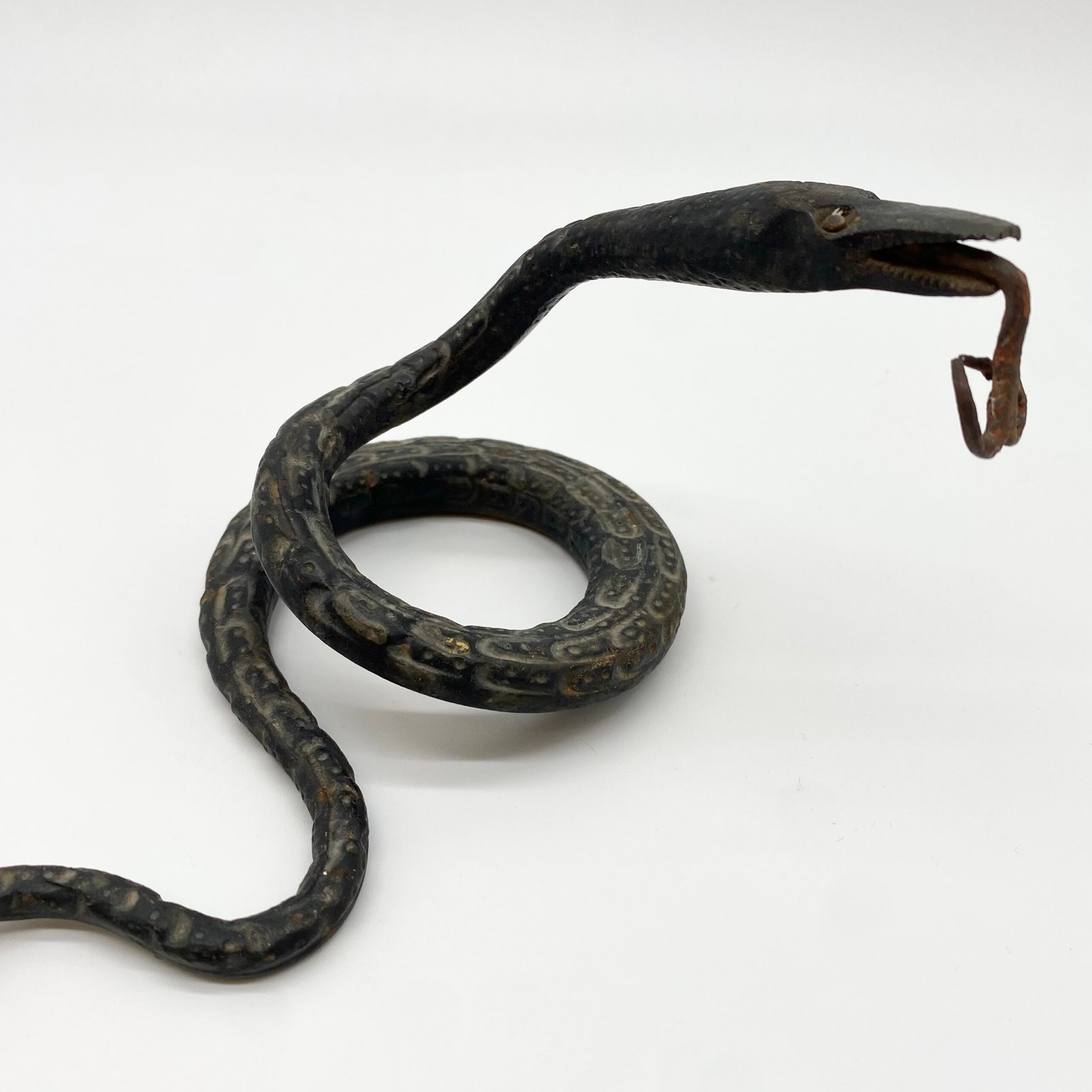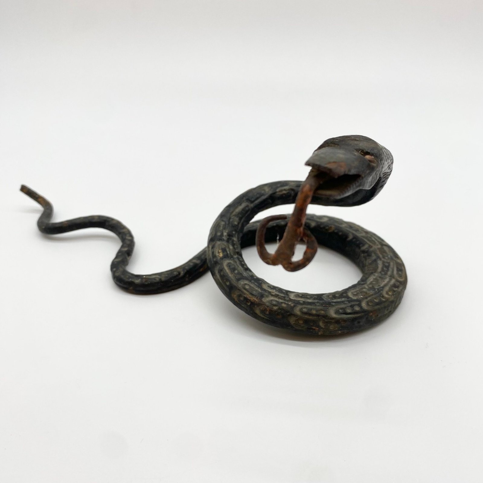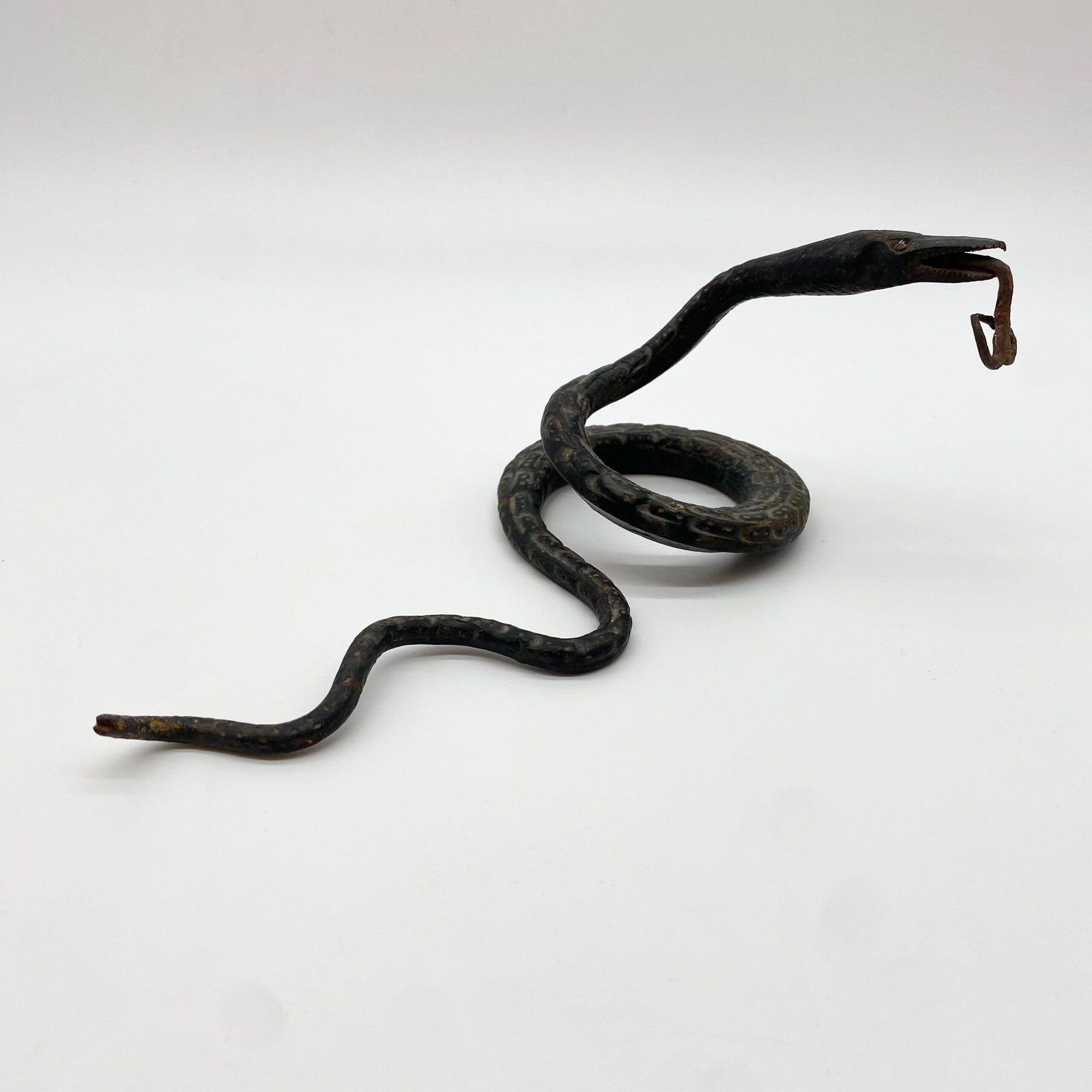 Sculpture artisanale représentant un serpent dressé, entièrement façonnée en fer forgé. Le travail du métal, martelé et patiné, restitue avec réalisme le mouvement sinueux du reptile.
