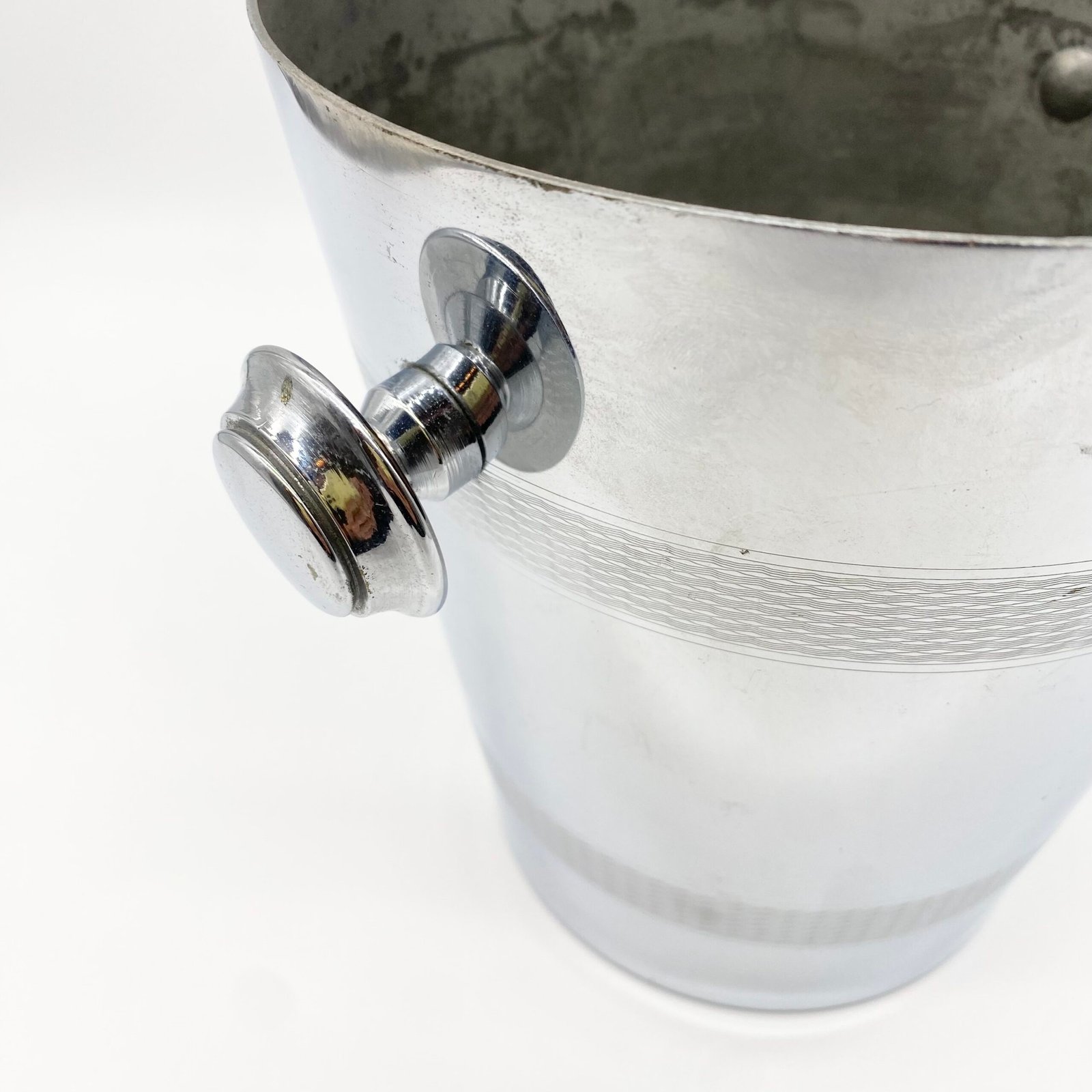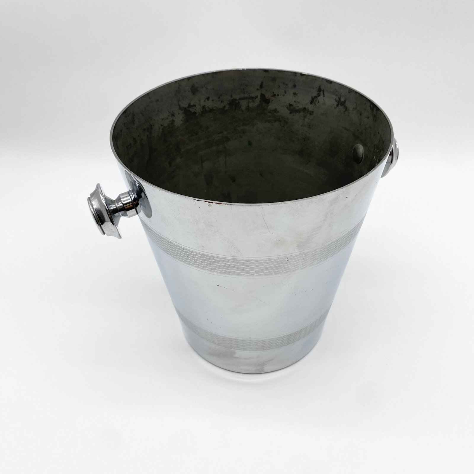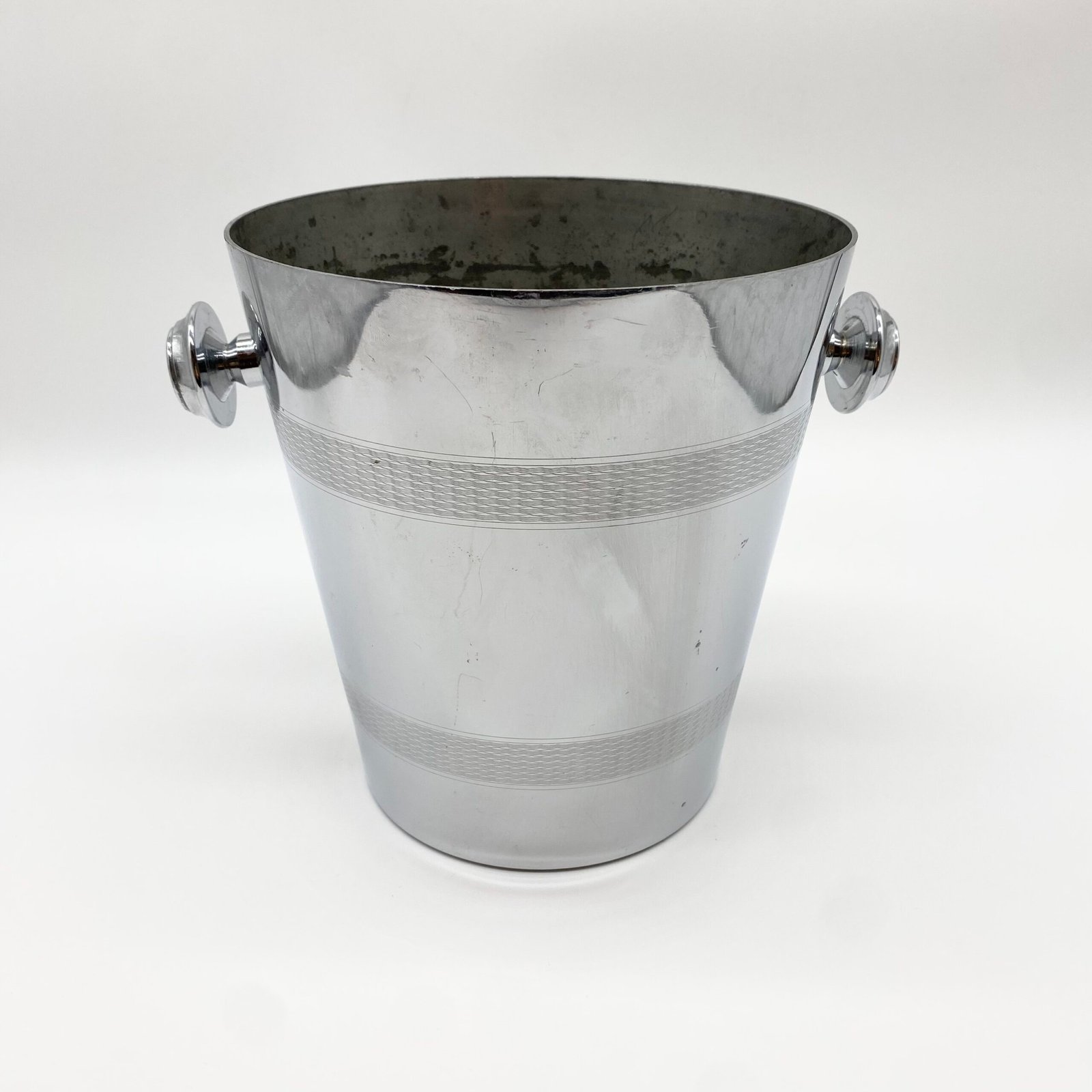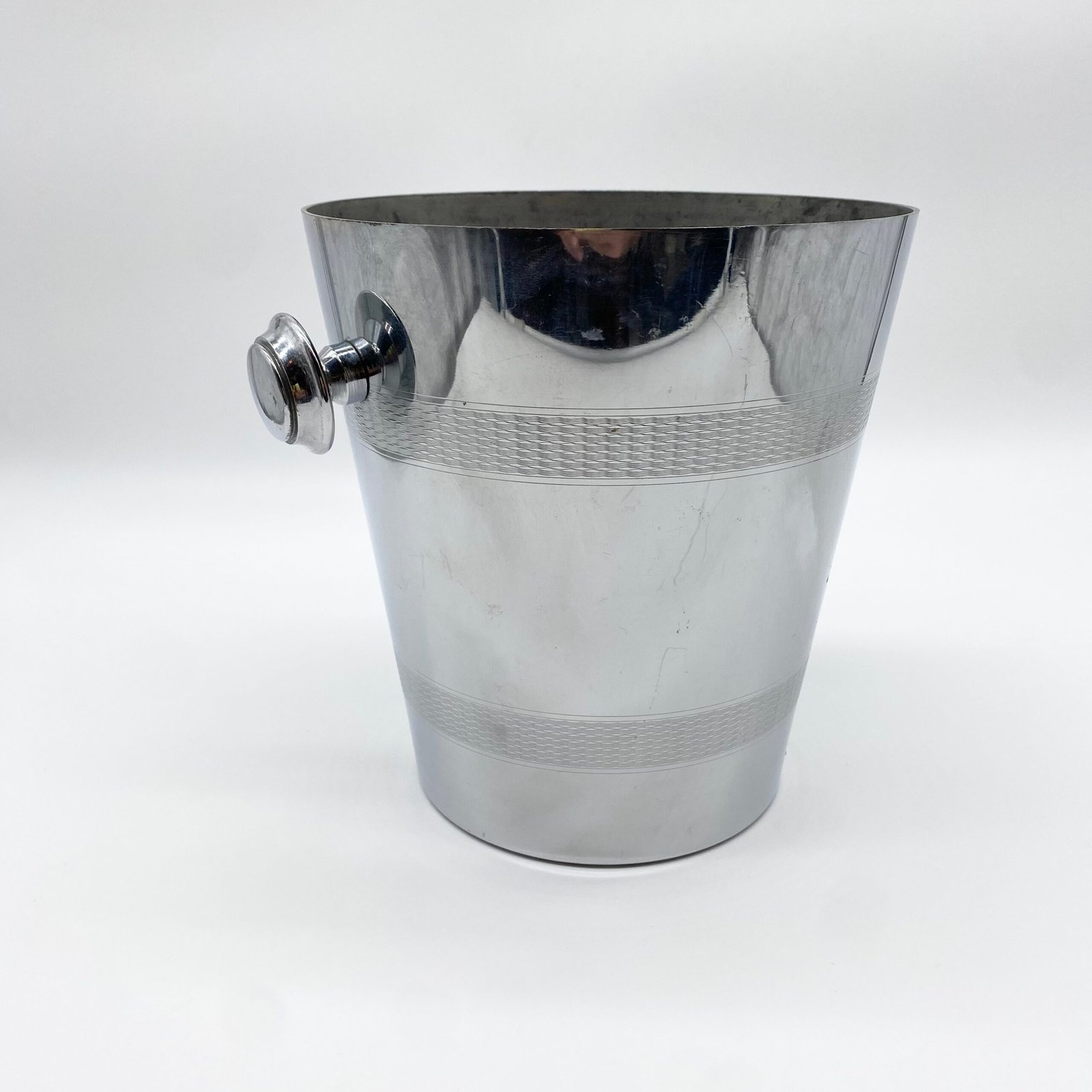 Seau à champagne en métal argenté signé André Leroy, au design épuré des années 1970. Sa forme cylindrique évasée est soulignée par deux larges frises guillochées, tandis que les anses latérales rondes apportent une touche fonctionnelle et décorative.