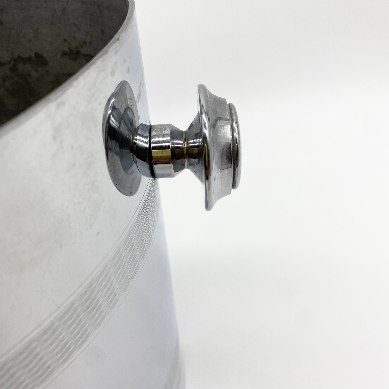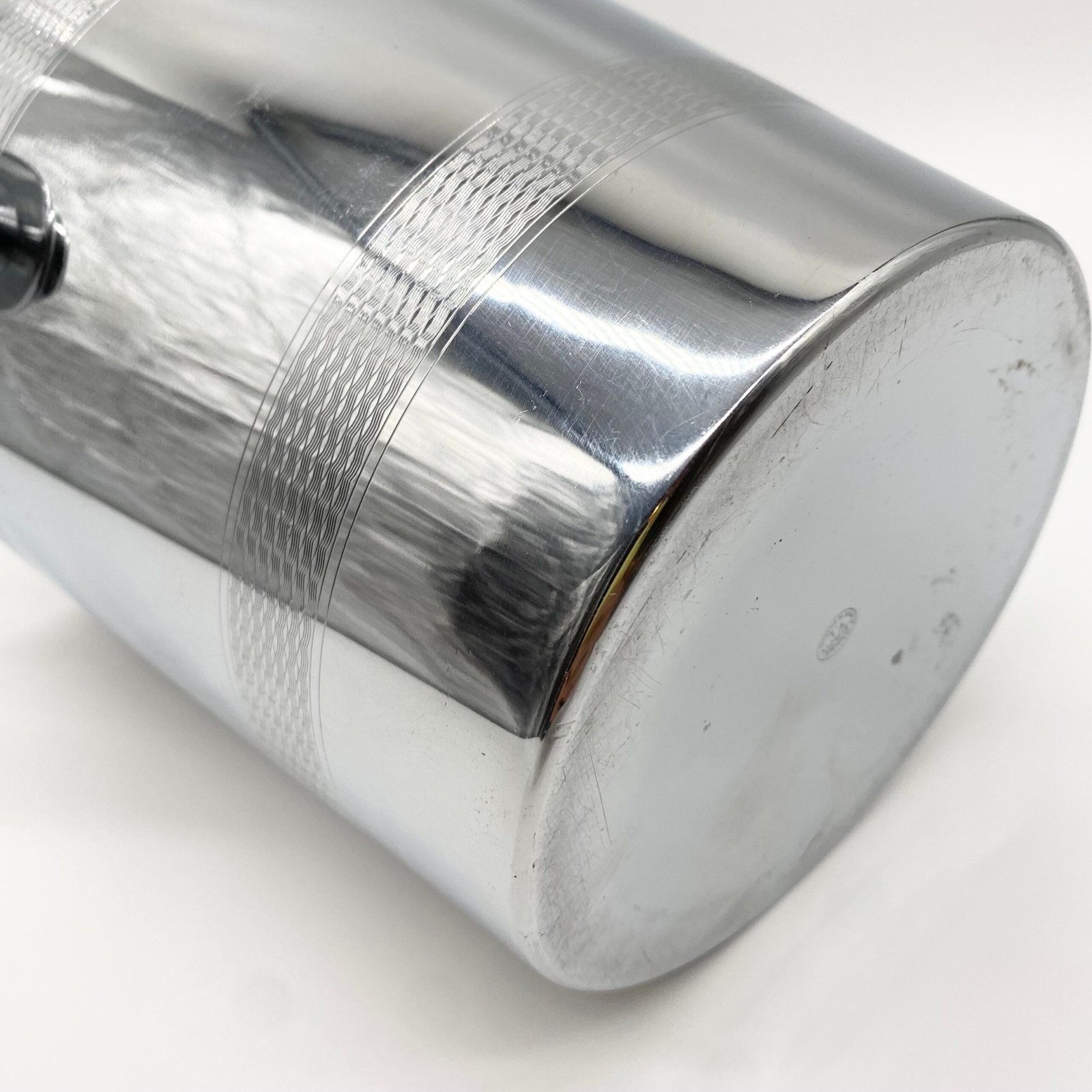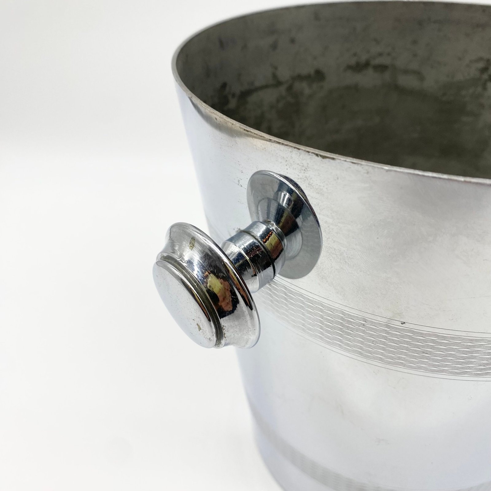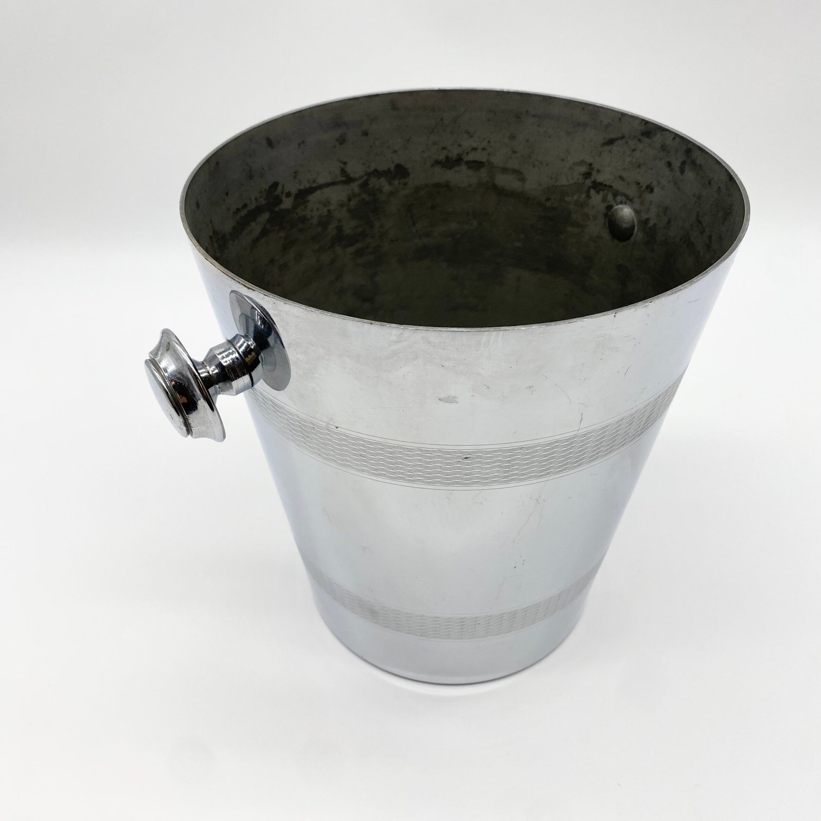 Seau à champagne en métal argenté signé André Leroy, au design épuré des années 1970. Sa forme cylindrique évasée est soulignée par deux larges frises guillochées, tandis que les anses latérales rondes apportent une touche fonctionnelle et décorative.