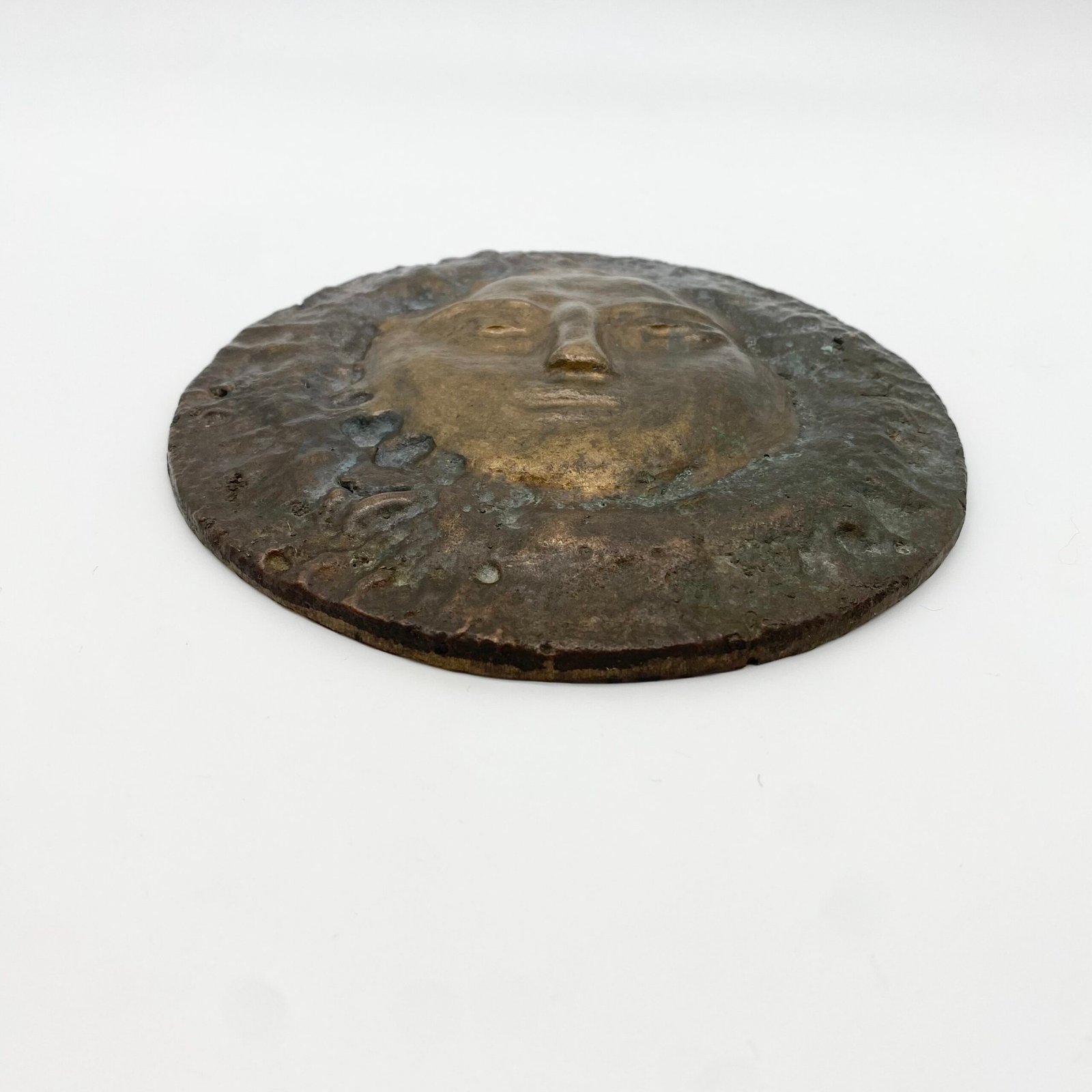 Une sculpture murale au visage rayonnant, entièrement réalisé en bronze plein martelé.