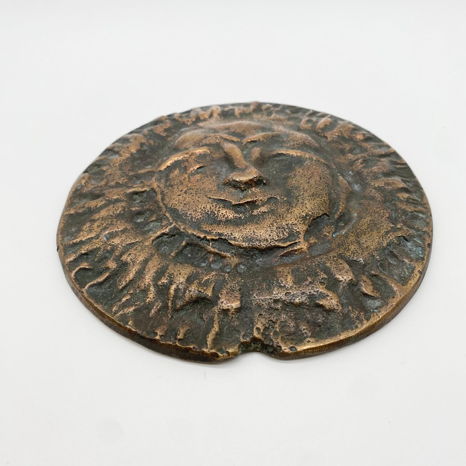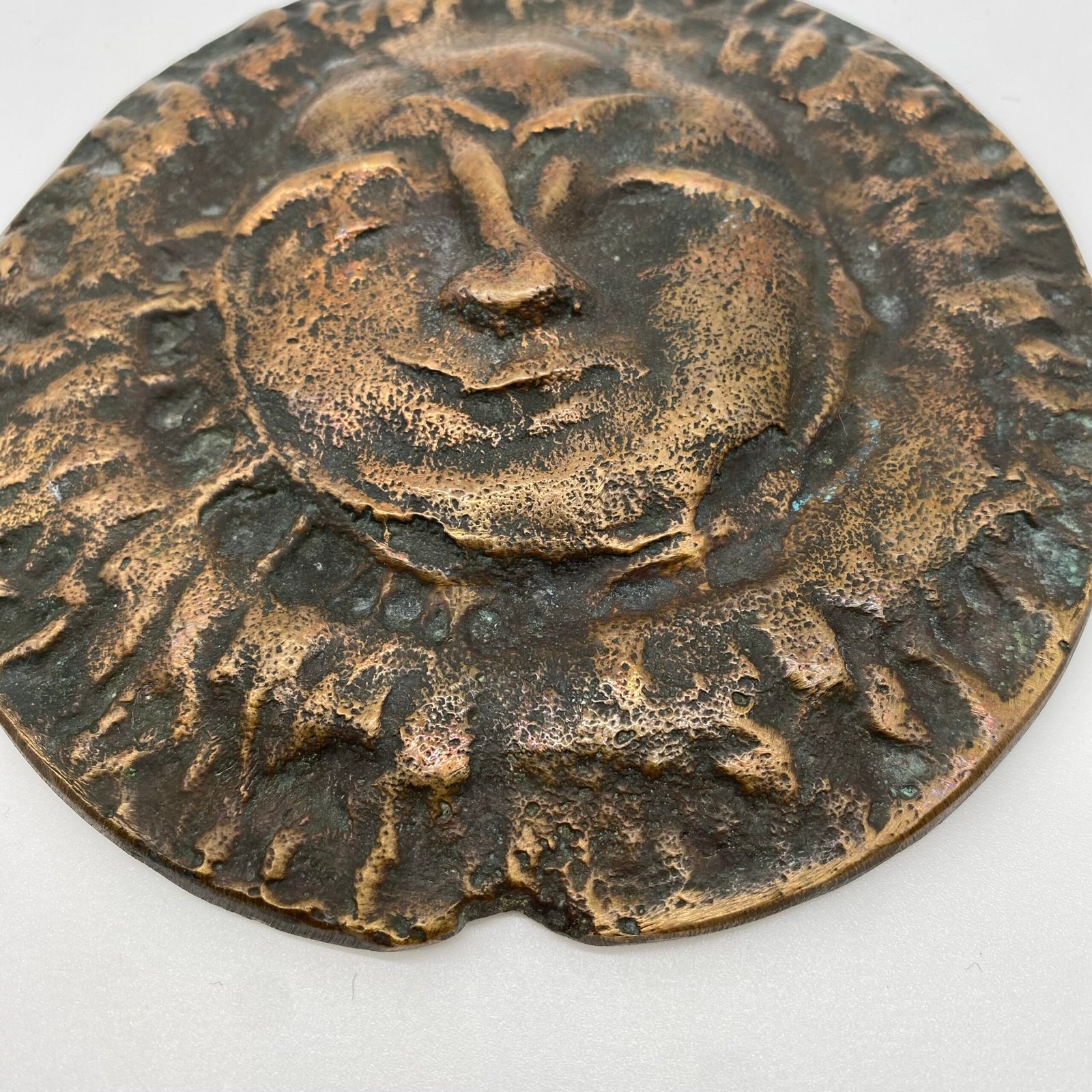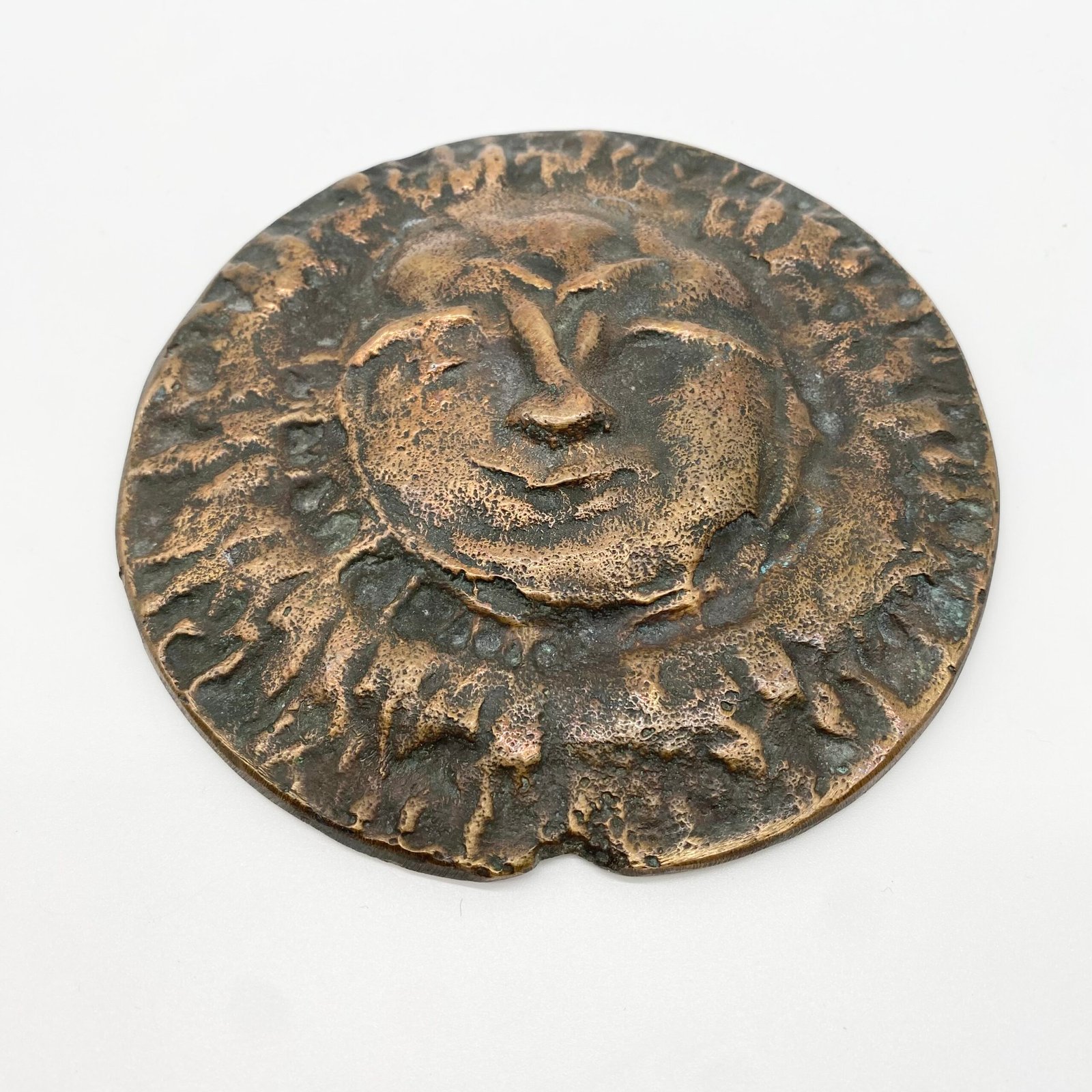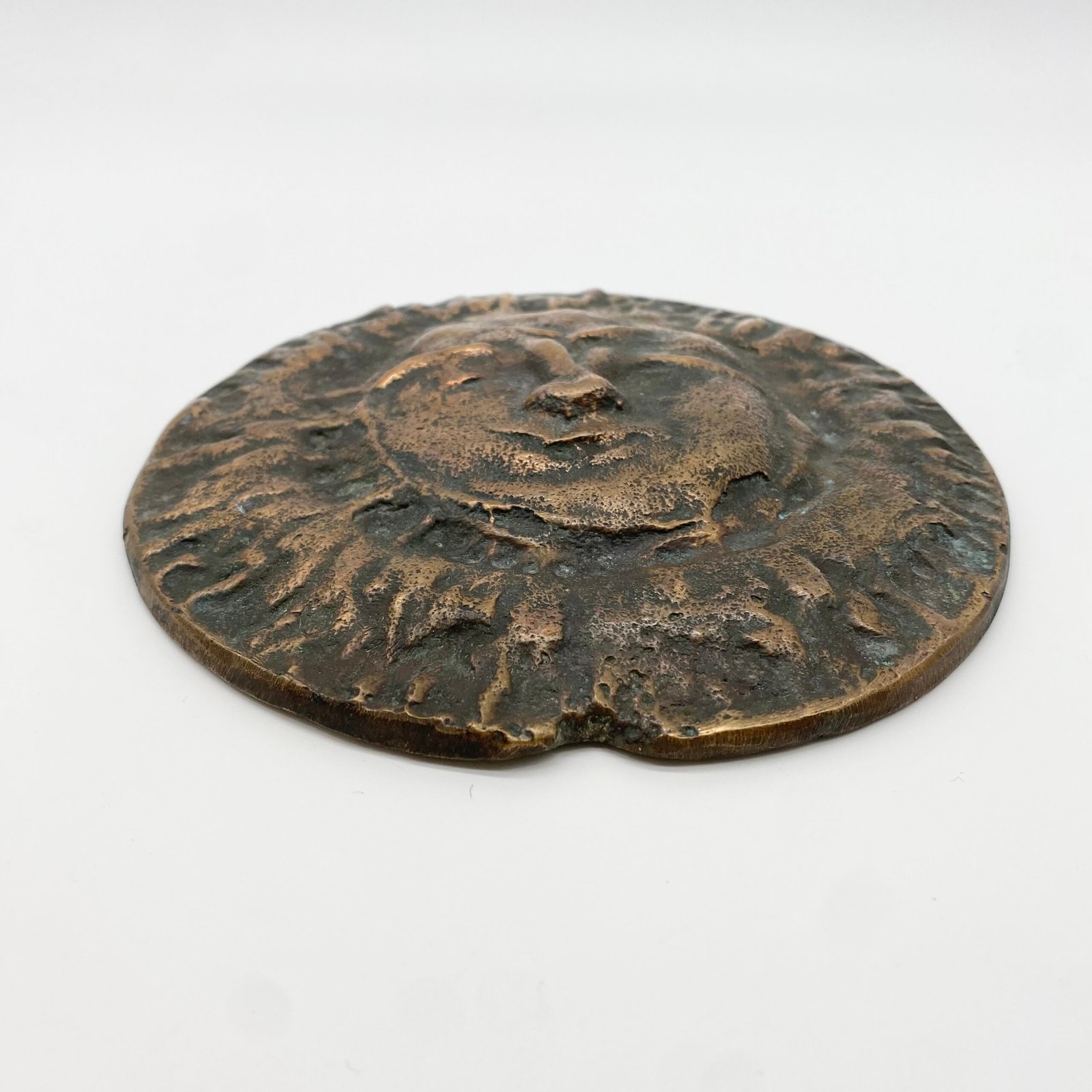 Une sculpture murale au visage rayonnant, entièrement réalisé en bronze plein martelé.