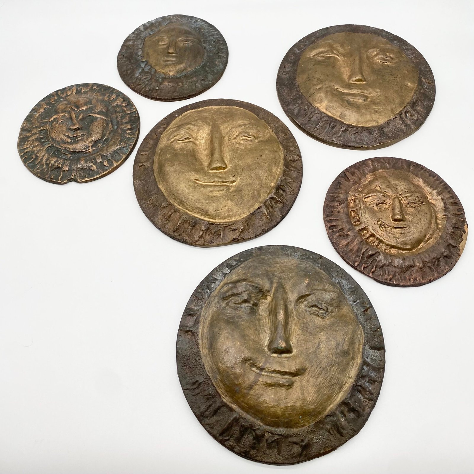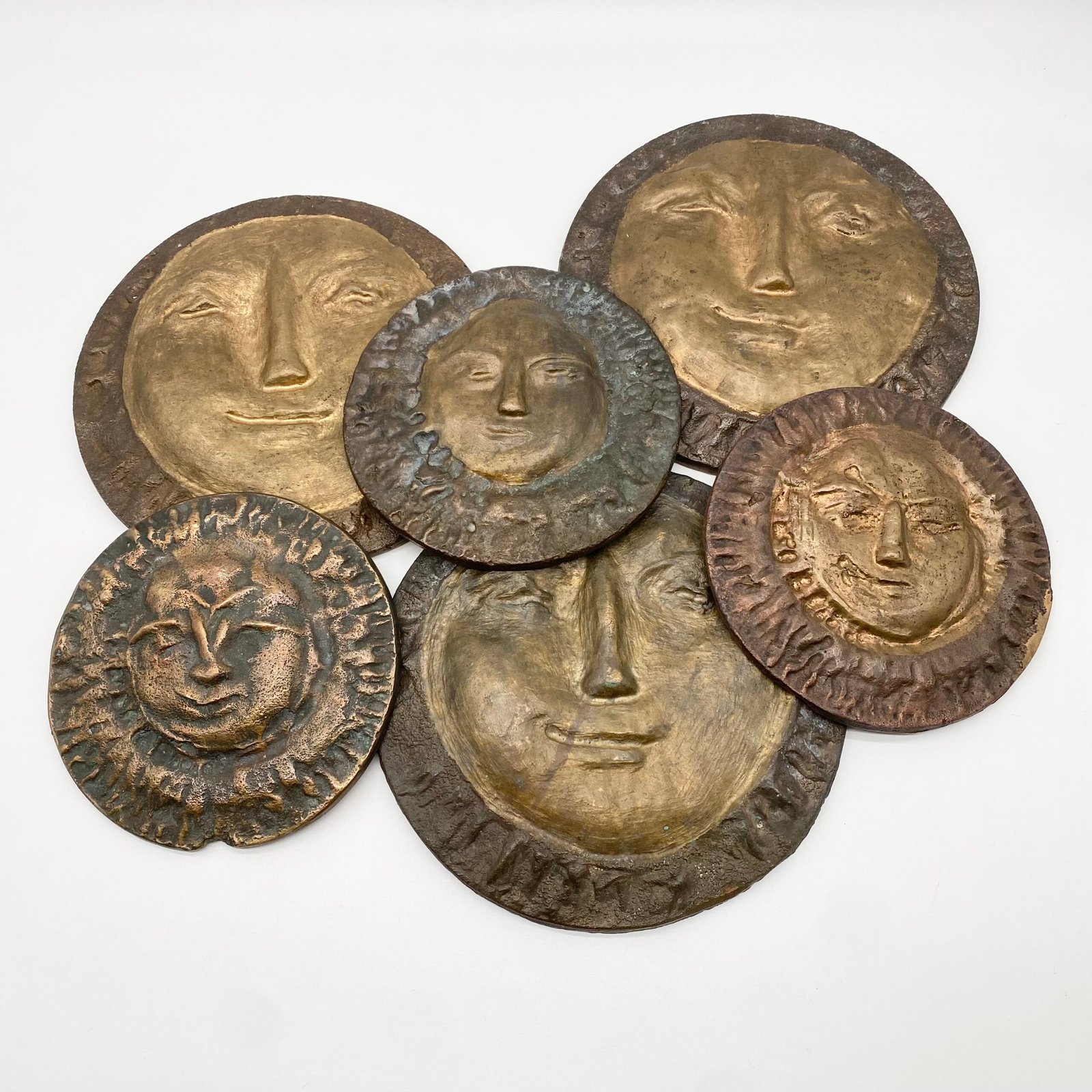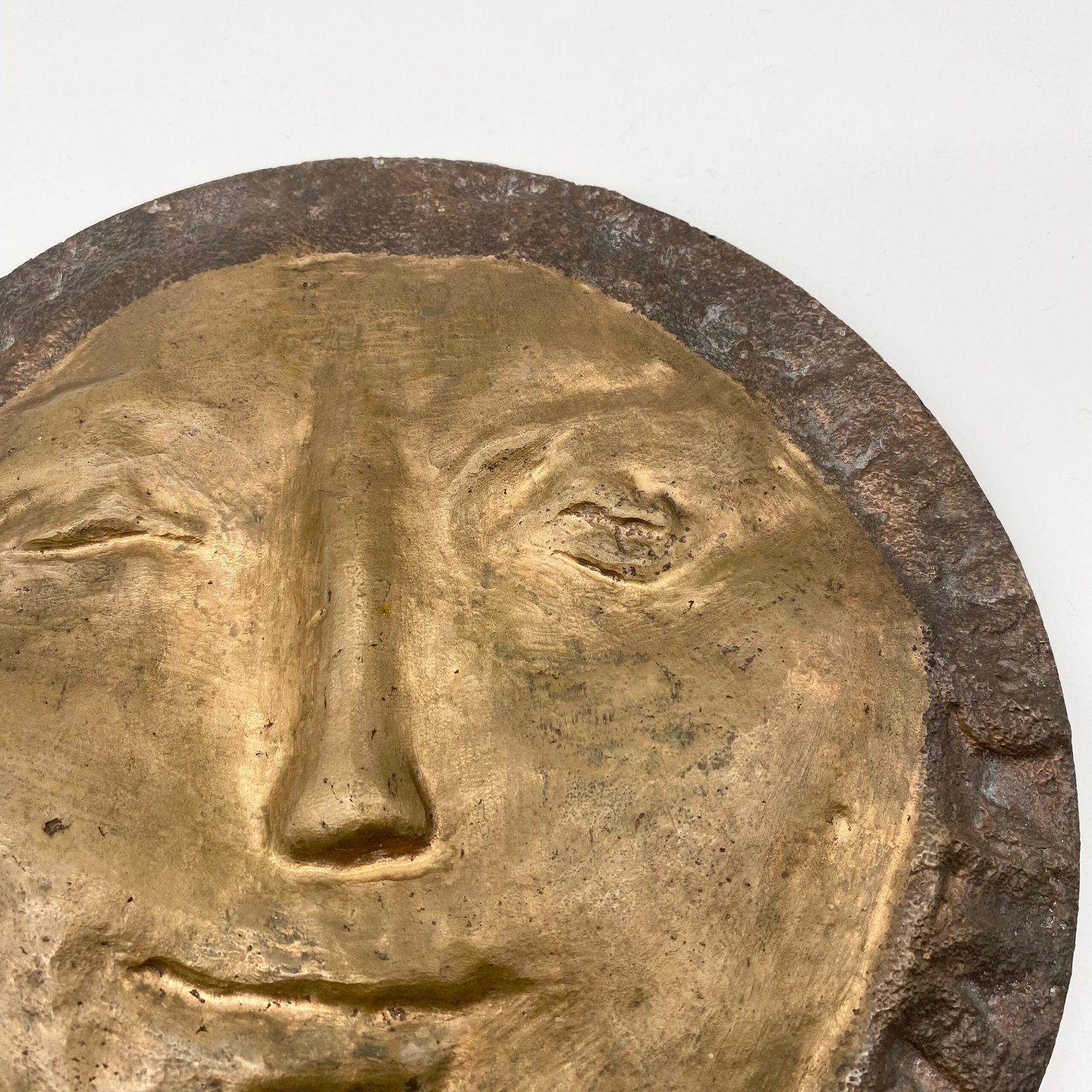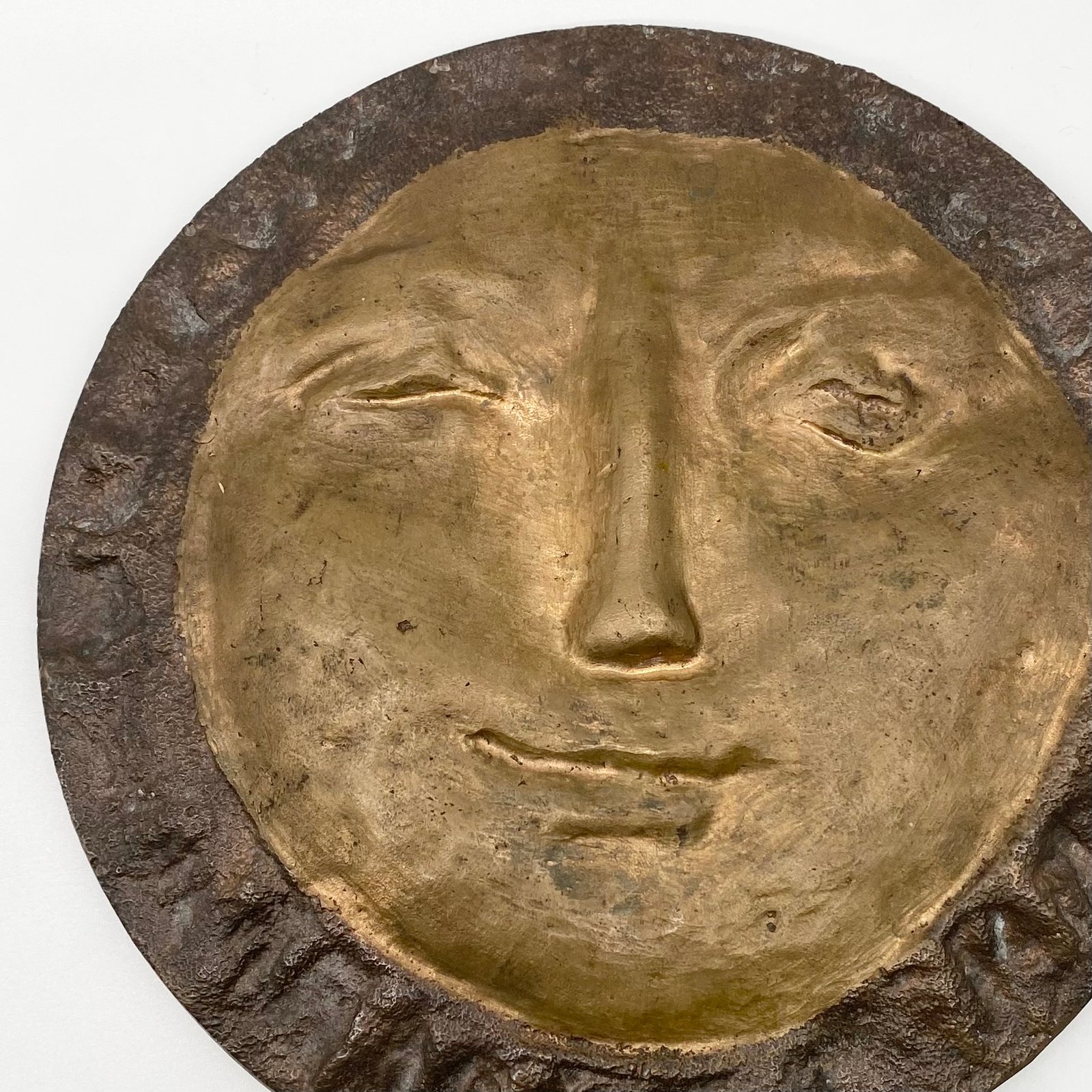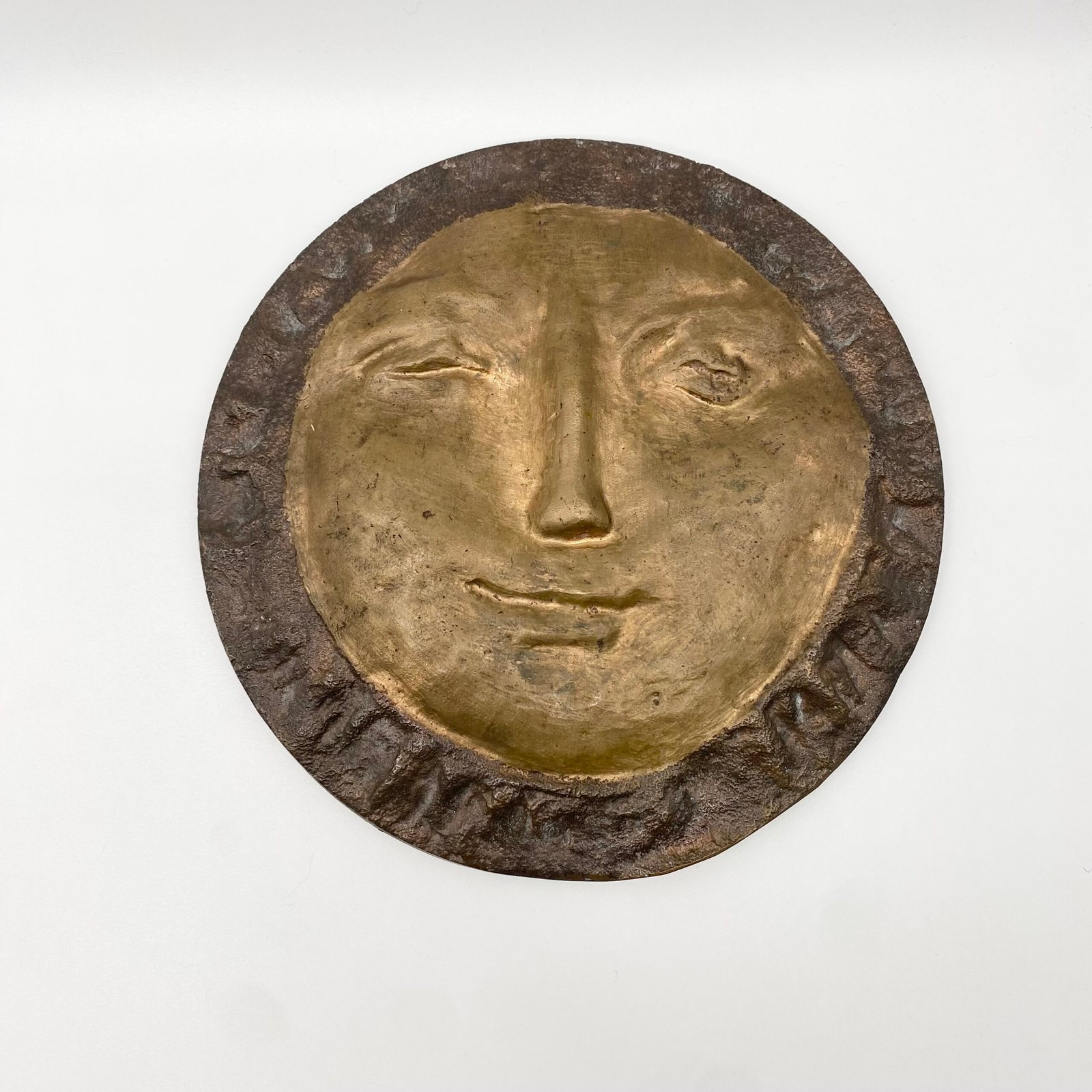 Une sculpture murale au visage rayonnant, entièrement réalisé en bronze plein martelé.