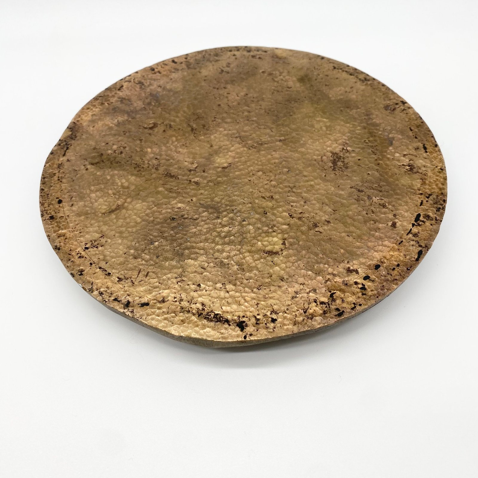 La surface patinée joue avec la lumière, oscillant entre éclat doré et profondeur cuivrée, donnant à l’ensemble une présence presque cosmique.