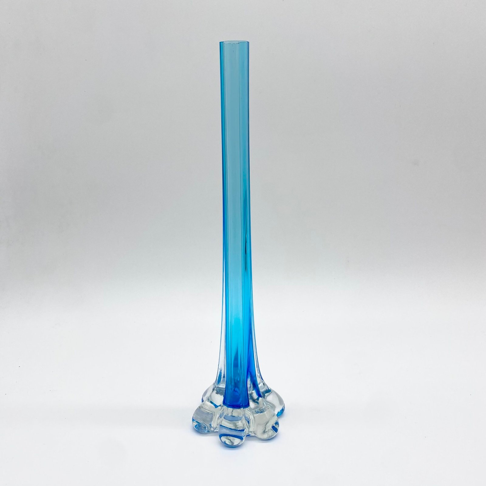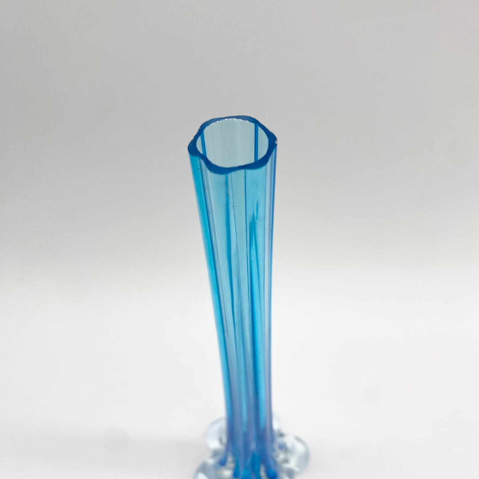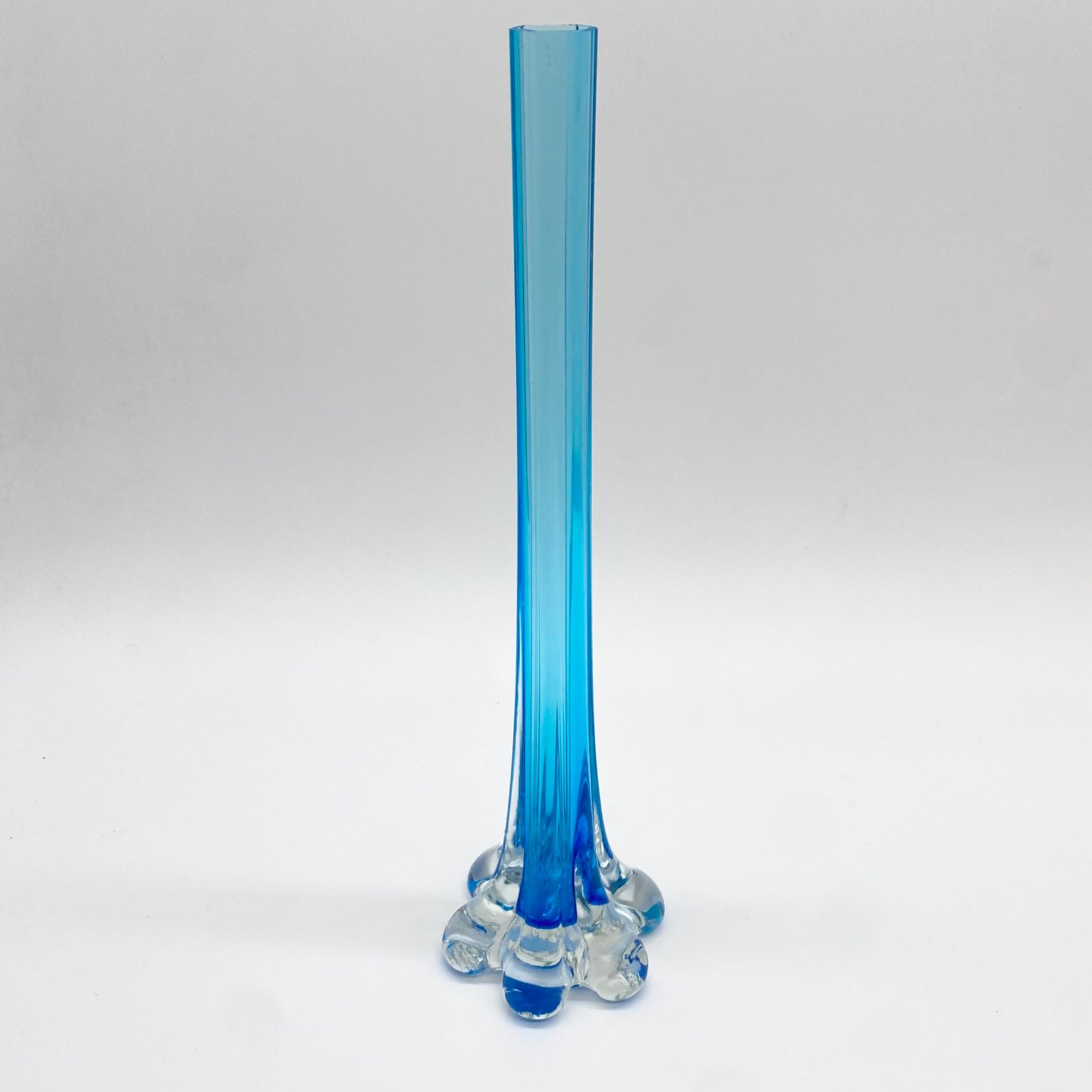 Élégant soliflore en verre de Murano, réalisé selon la technique du verre soufflé et étiré. La pièce se distingue par sa silhouette élancée et fuselée, animée de fines nervures verticales qui accentuent la hauteur et la légèreté de l’ensemble.