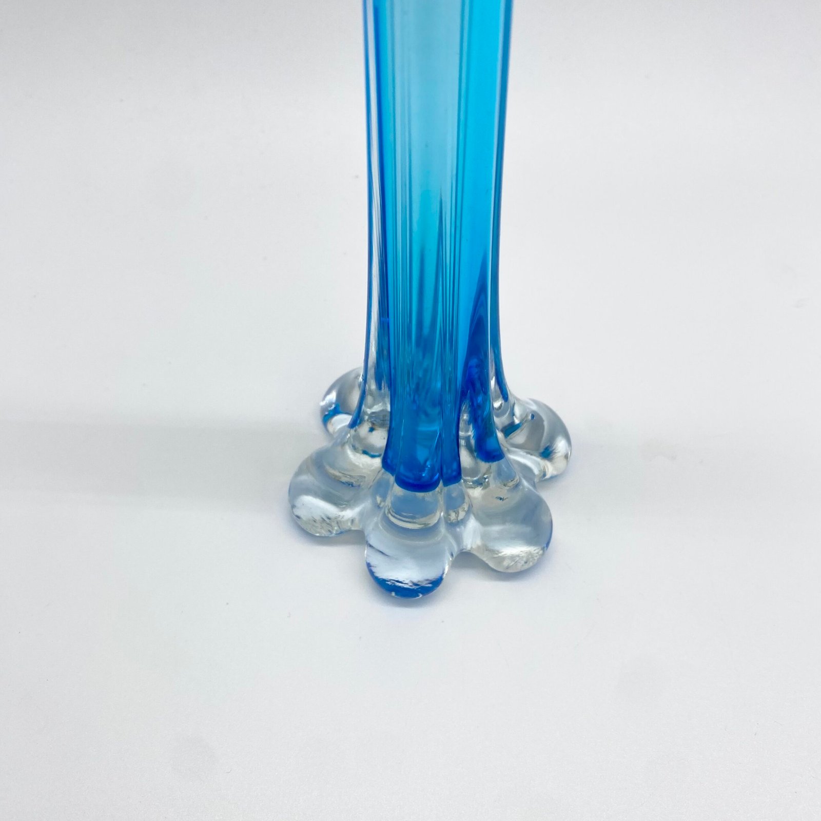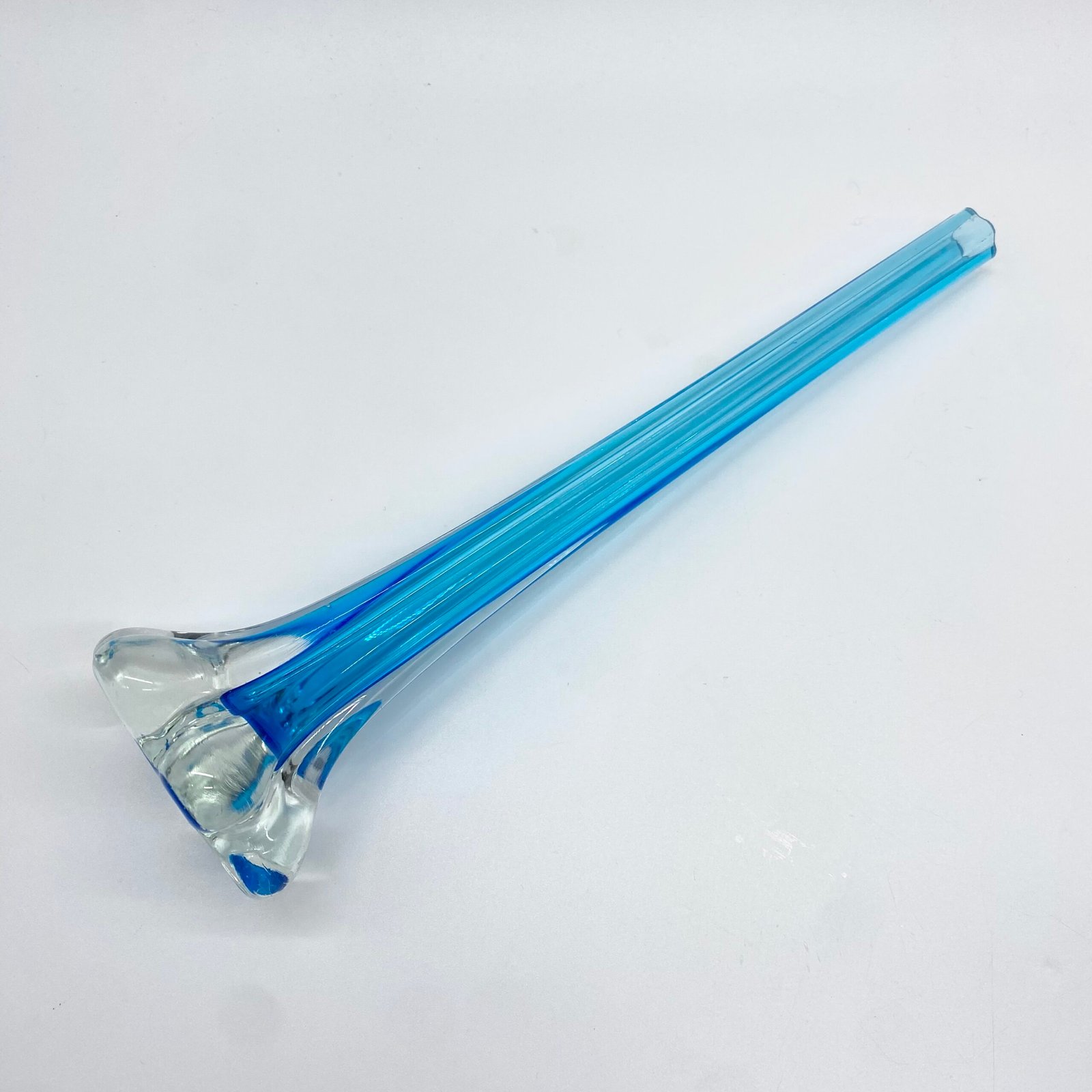 Le verre présente un dégradé  de bleu reposant sur une base épaisse en verre transparent formant un piédouche organique typique des productions muranaises du milieu du XXᵉ siècle.