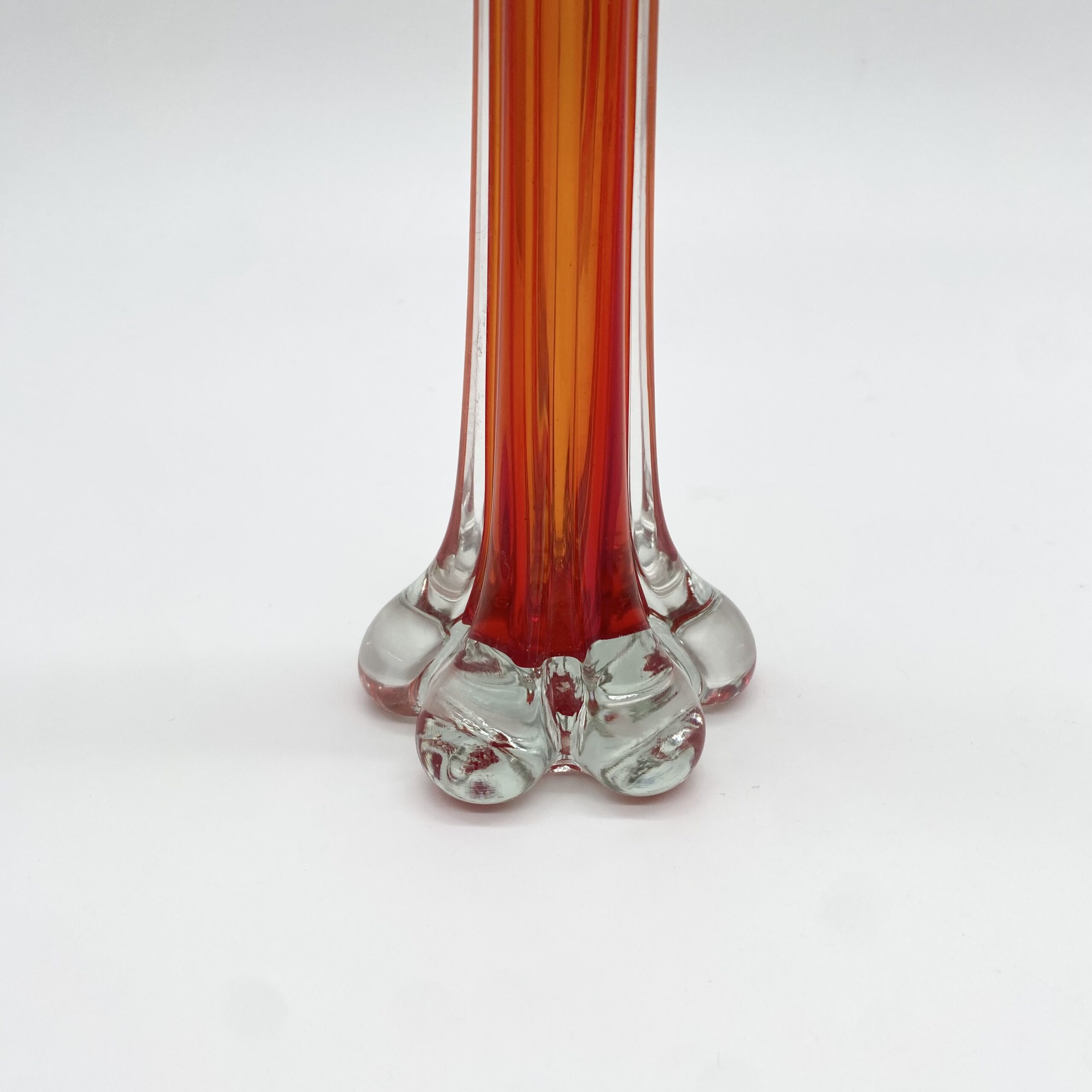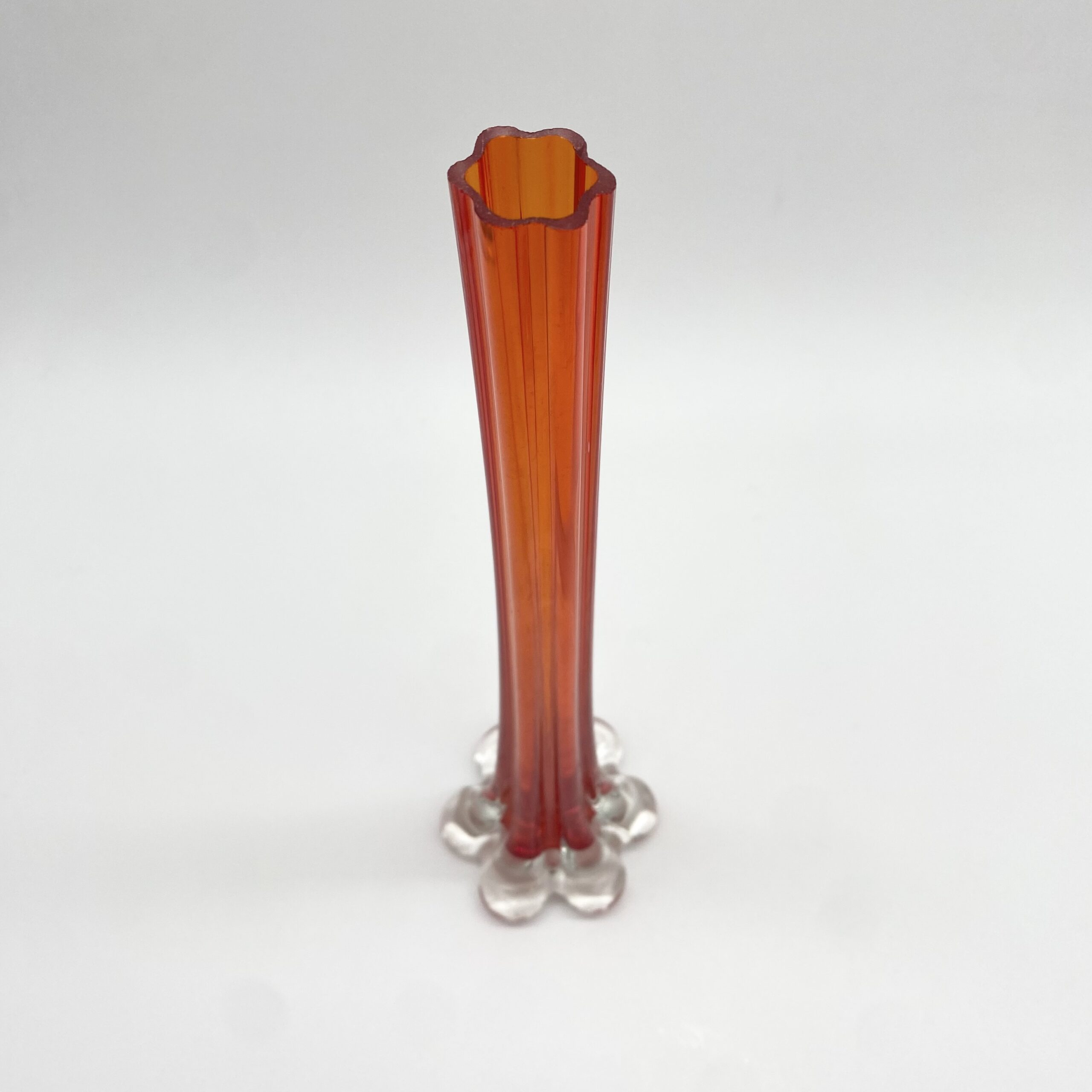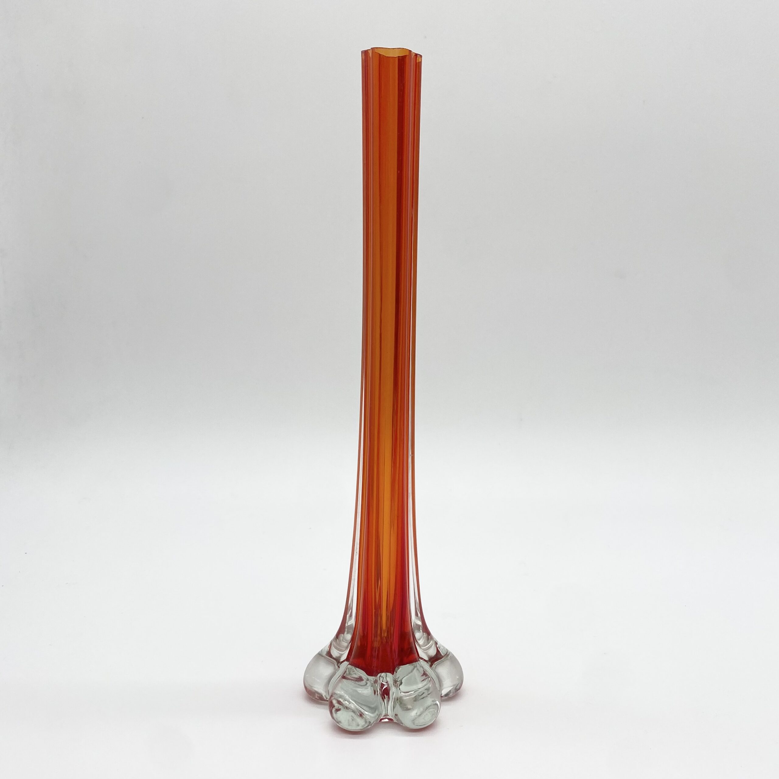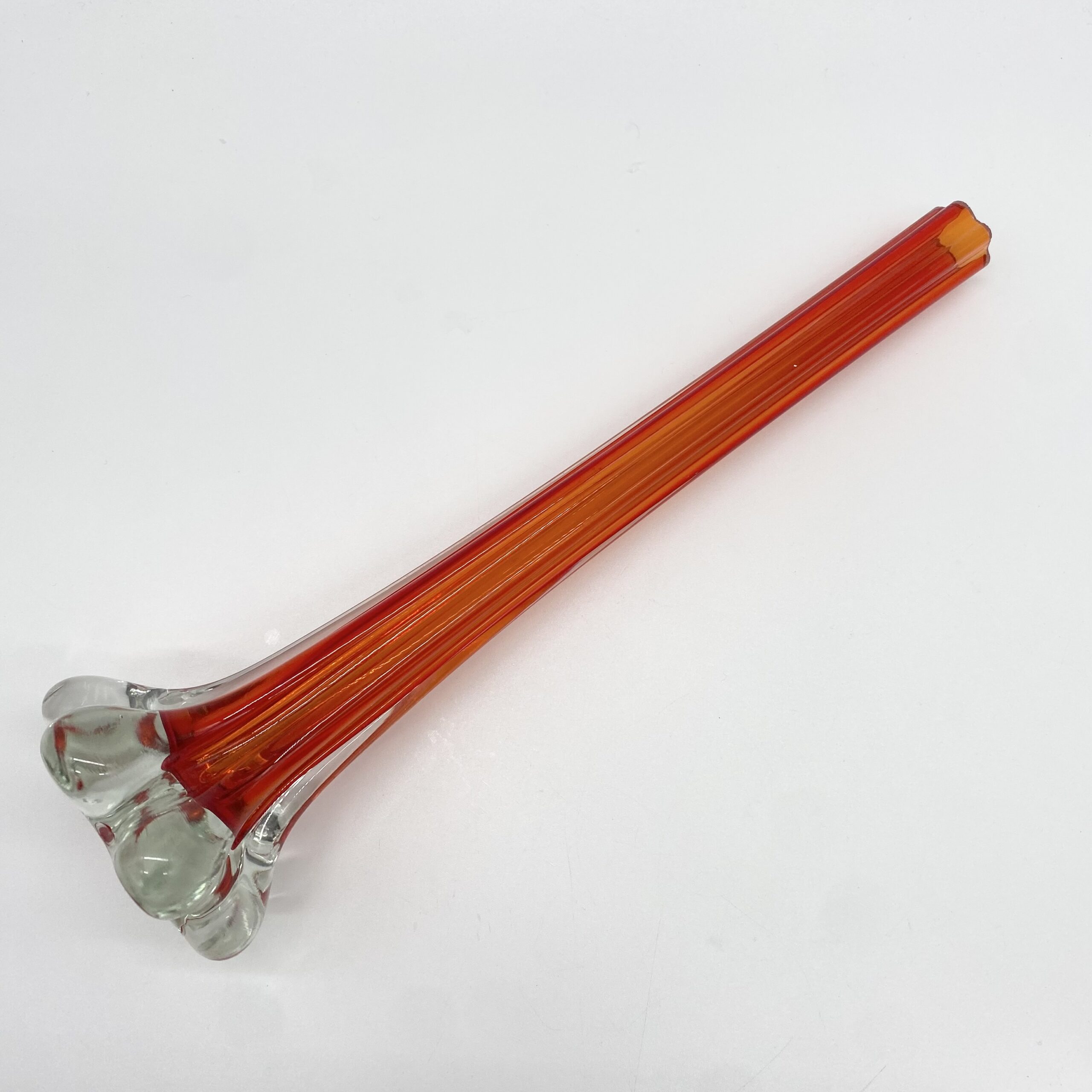 Le verre présente un dégradé chaleureux allant de l’orange ambré au rouge profond, reposant sur une base épaisse en verre transparent formant un piédouche organique typique des productions muranaises du milieu du XXᵉ siècle.
