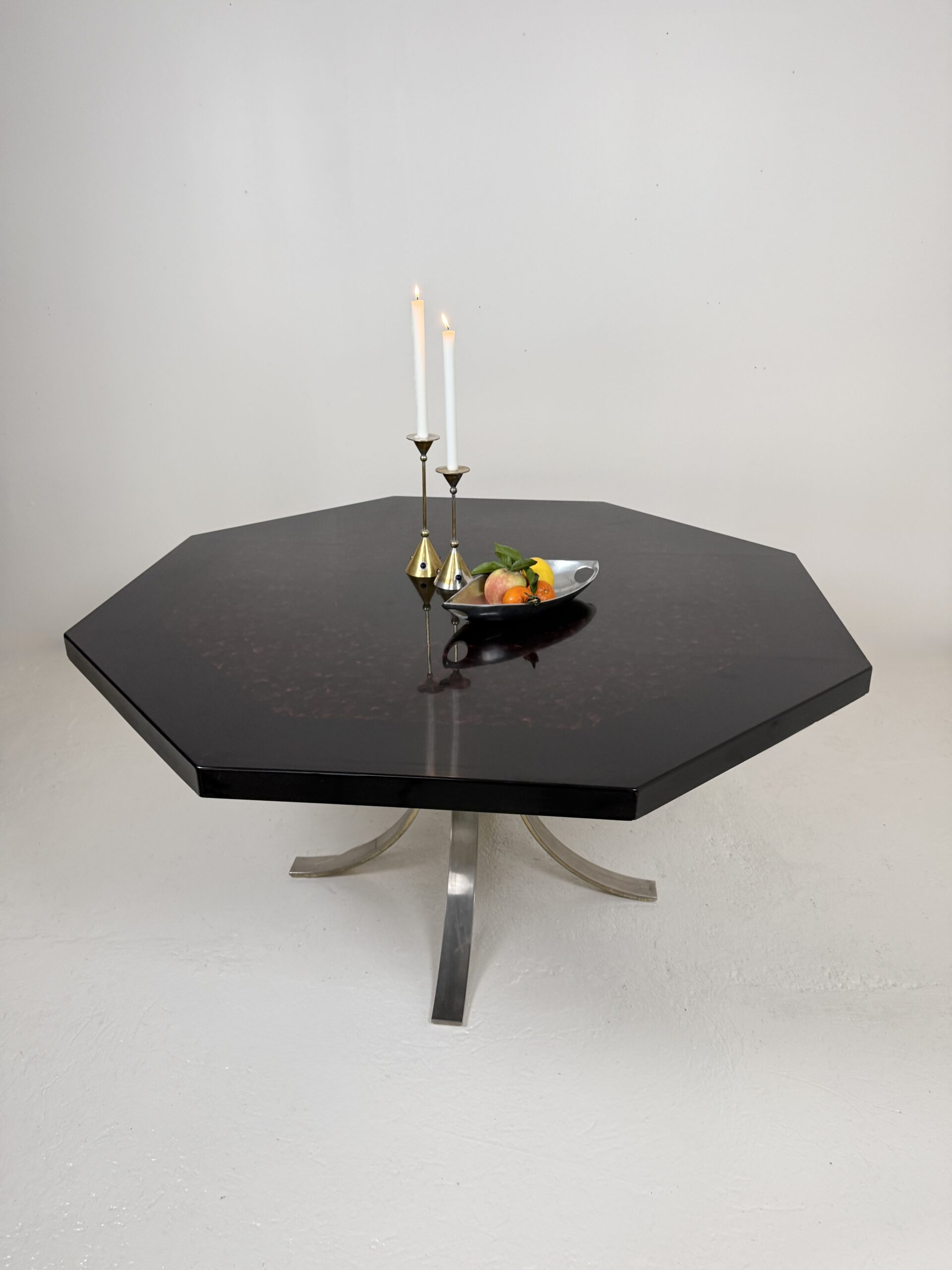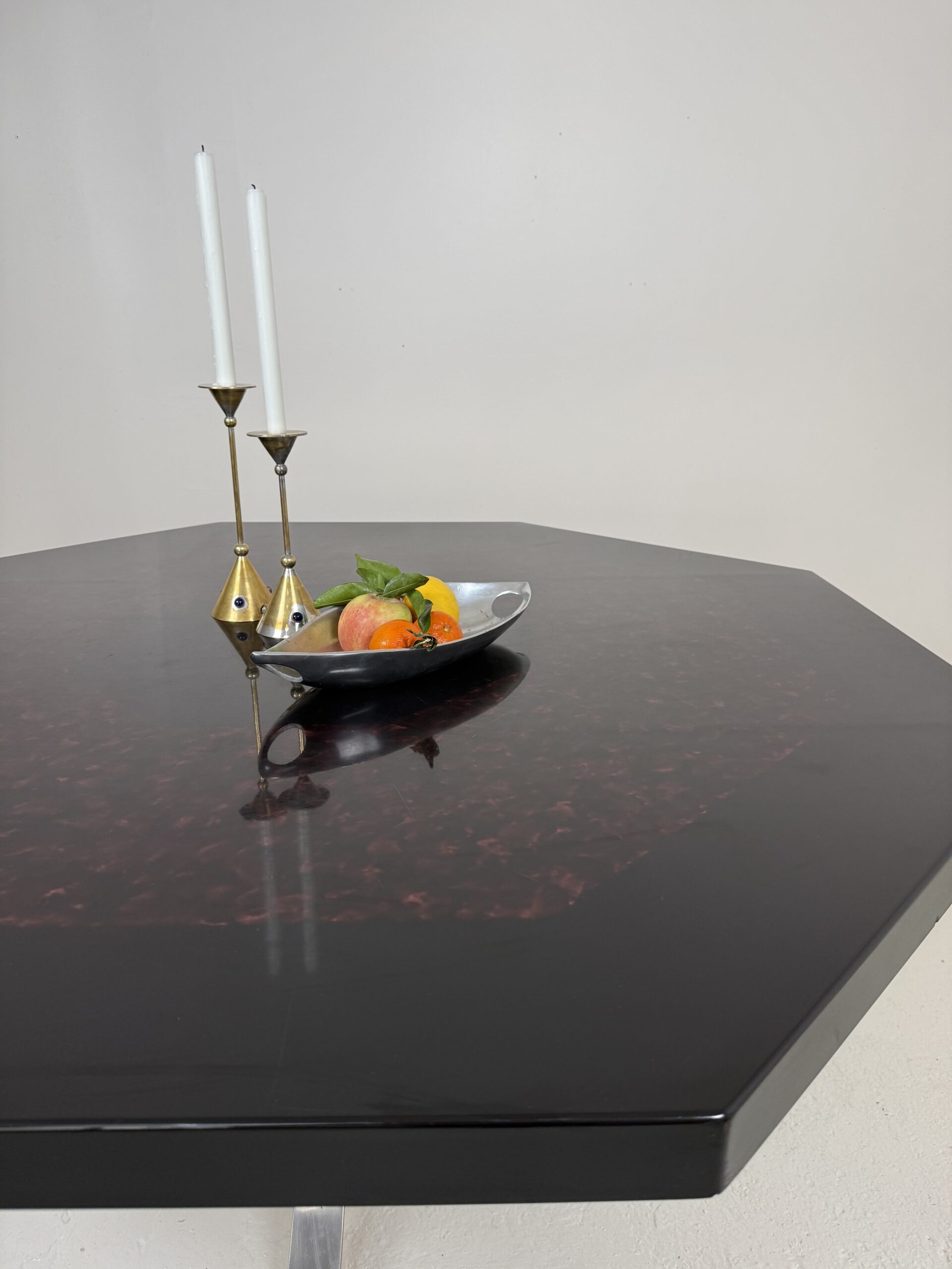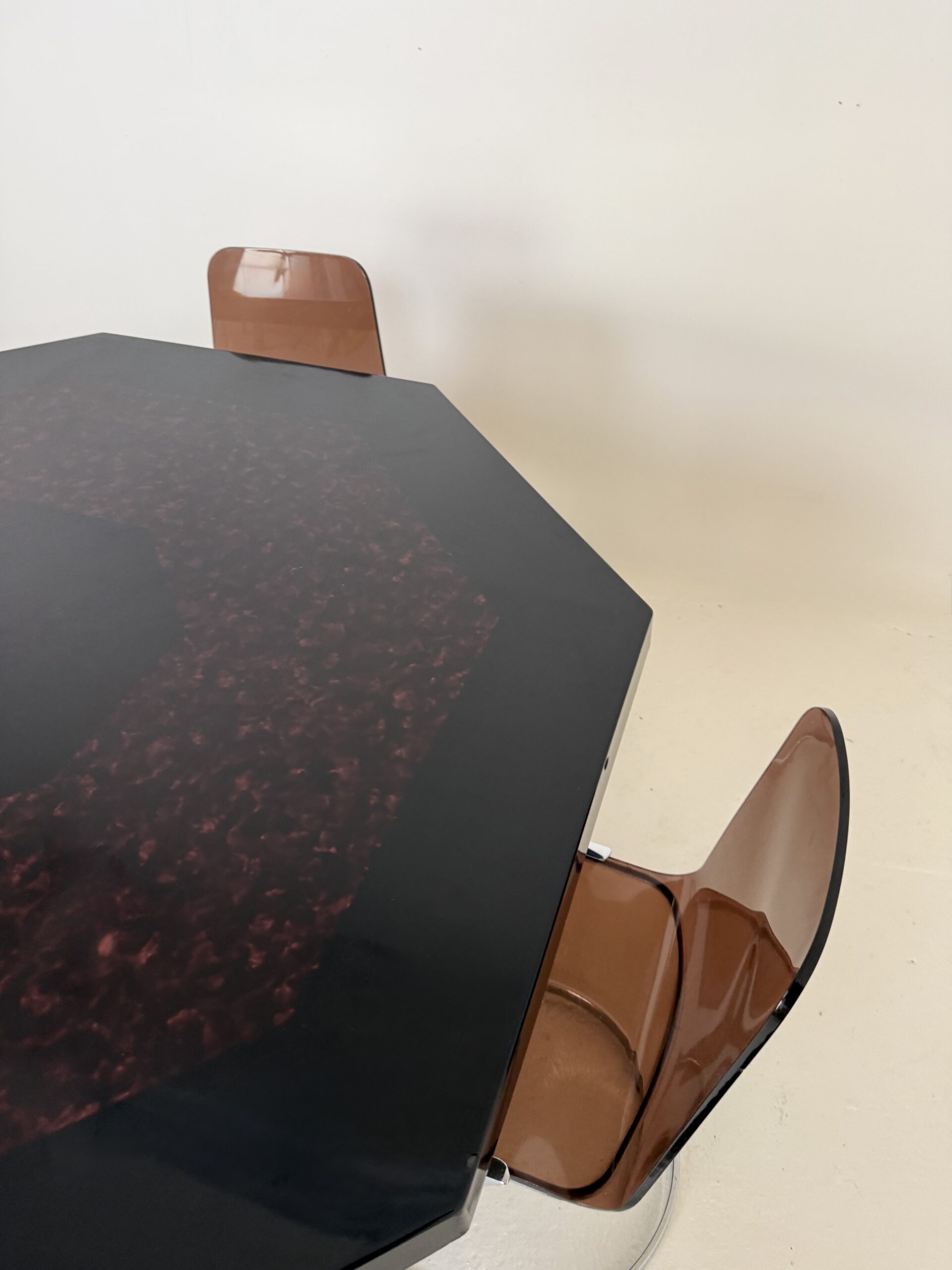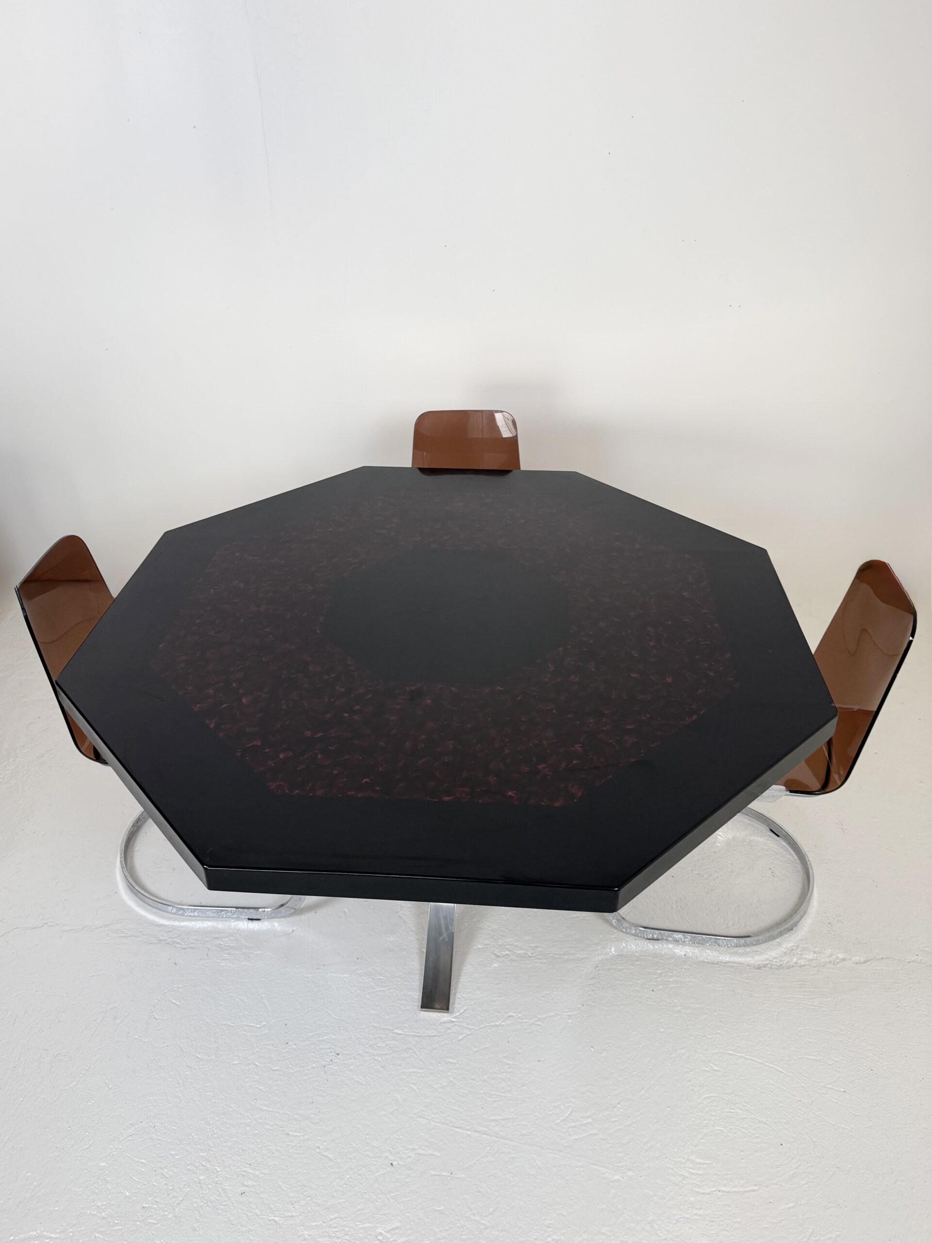 Élégante table à manger italienne des années 1970 au dessin sculptural et à la présence affirmée. Son plateau octogonal, particulièrement épais et lourd, est réalisé en résine pigmentée aux nuances noir profond et rouge minéral. La surface aux effets nuagés offre une belle profondeur et capte subtilement la lumière.