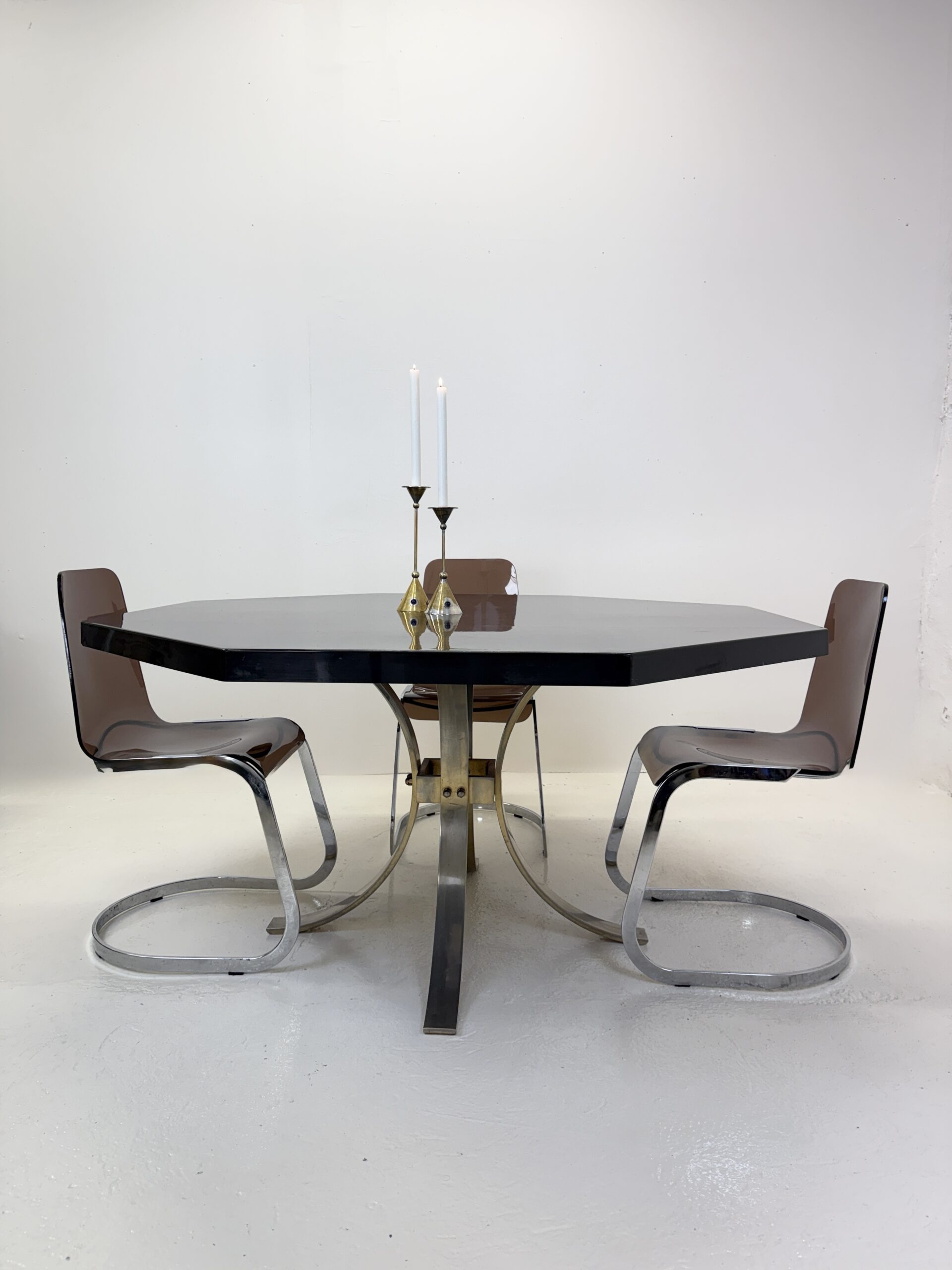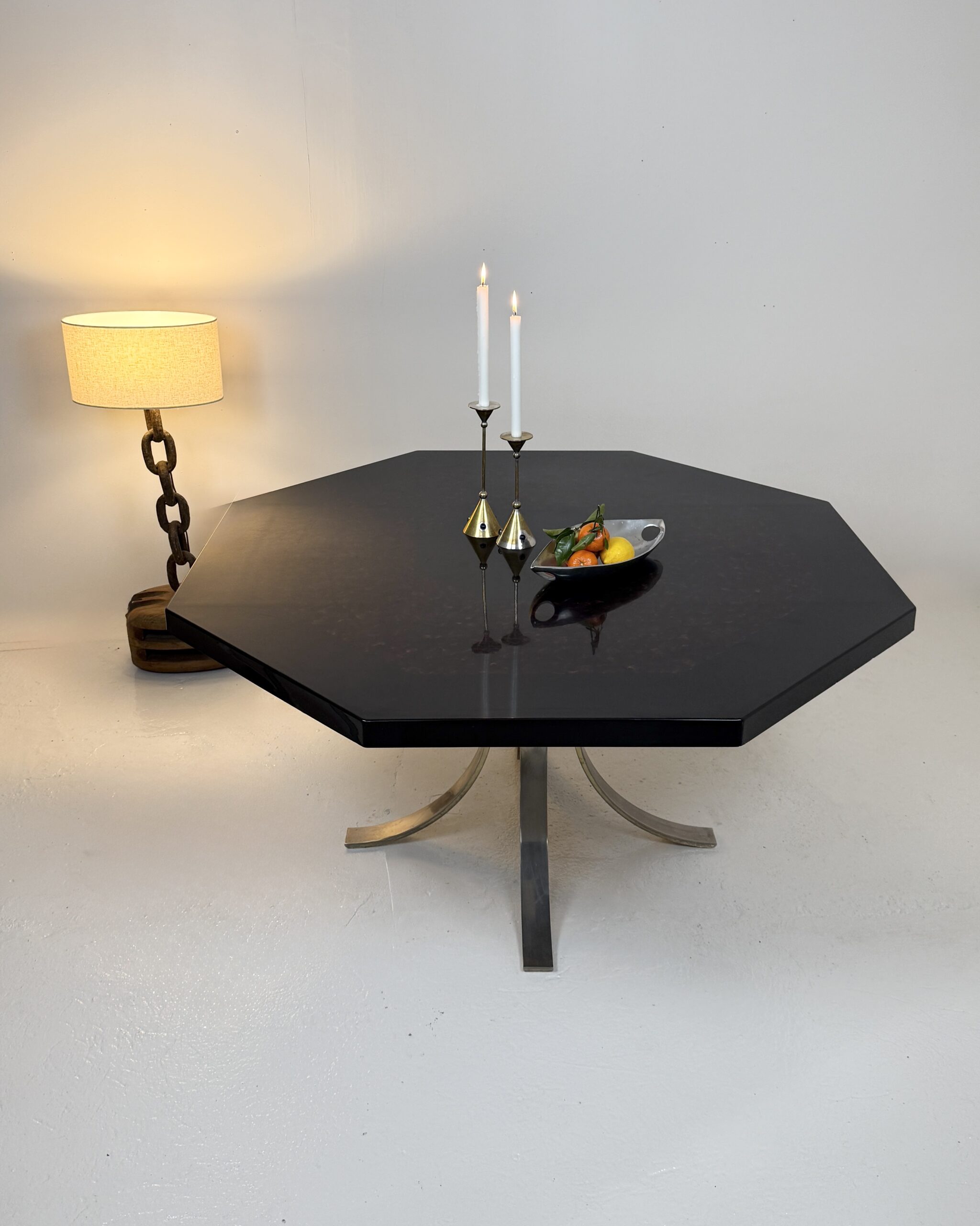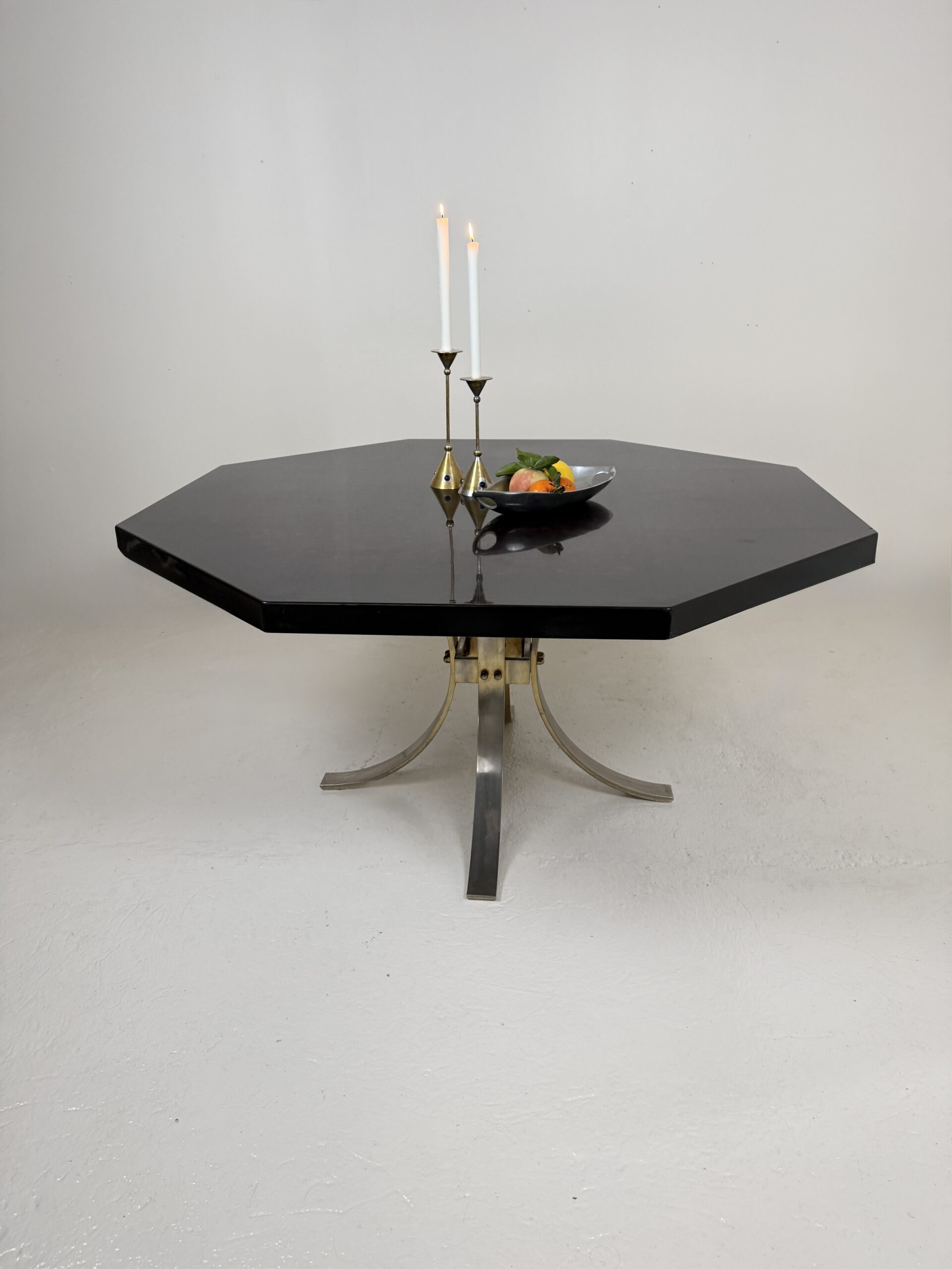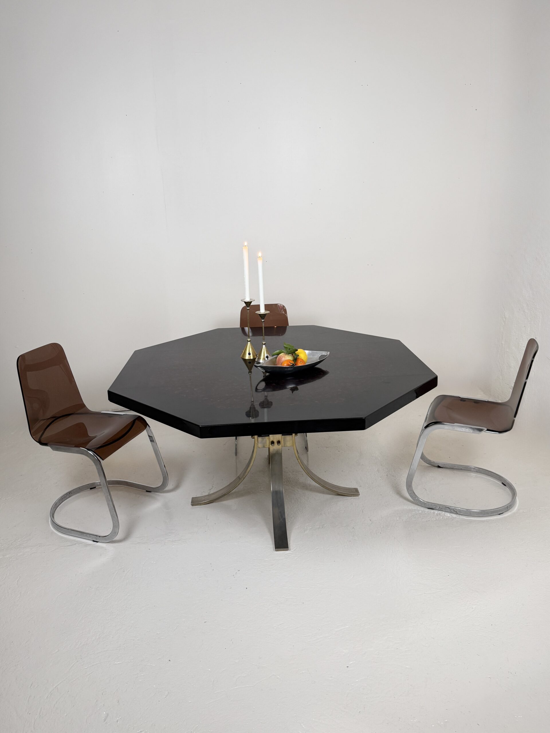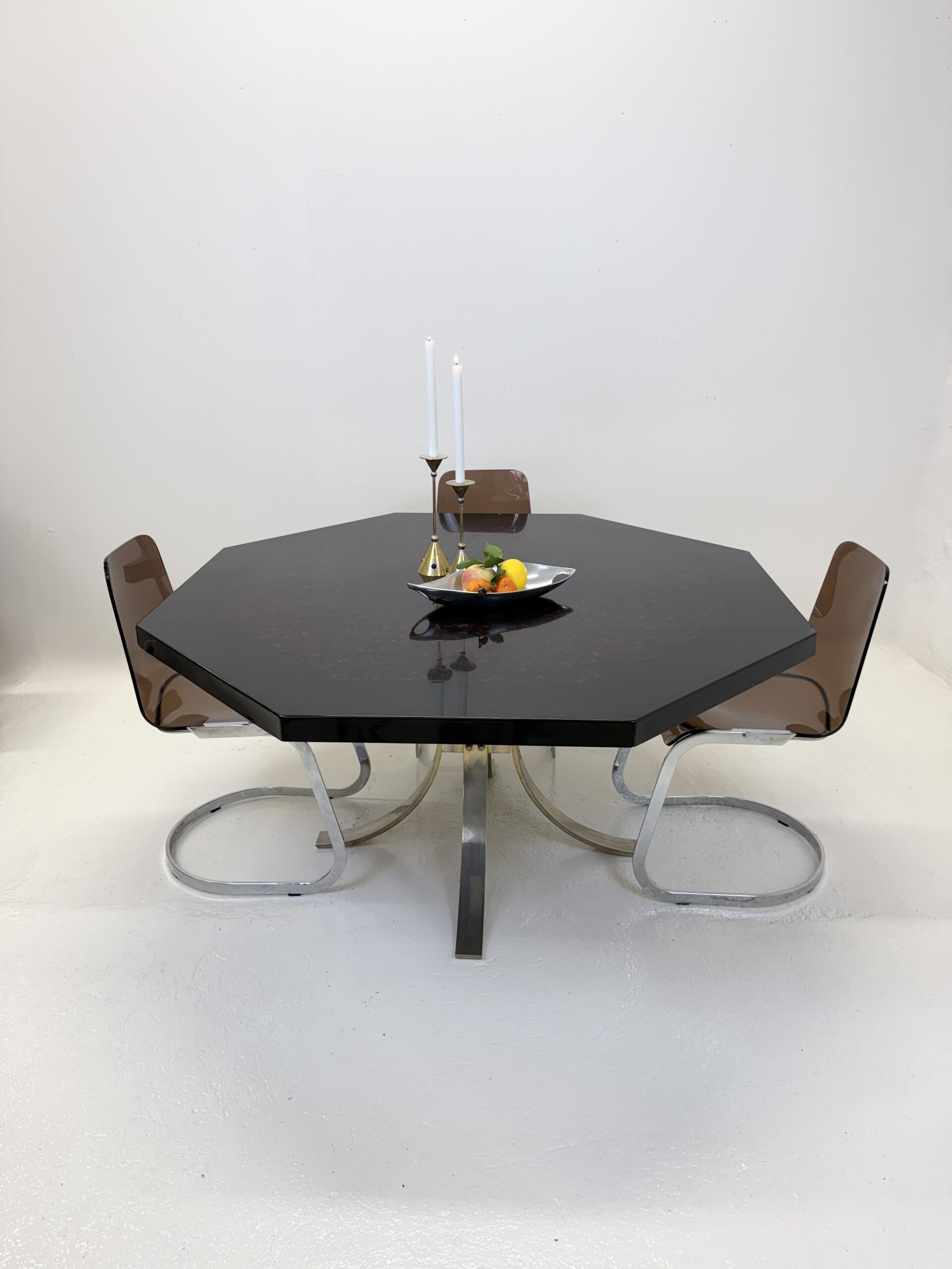 Élégante table à manger italienne des années 1970 au dessin sculptural et à la présence affirmée. Son plateau octogonal, particulièrement épais et lourd, est réalisé en résine pigmentée aux nuances noir profond et rouge minéral. La surface aux effets nuagés offre une belle profondeur et capte subtilement la lumière.
