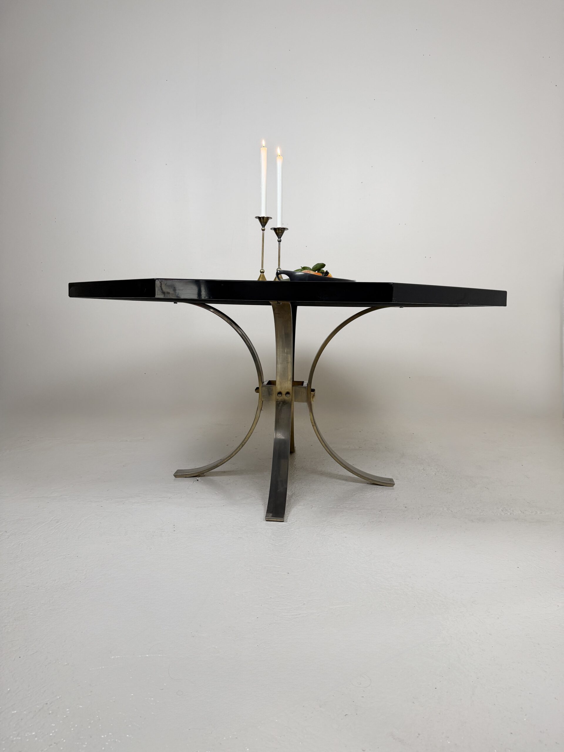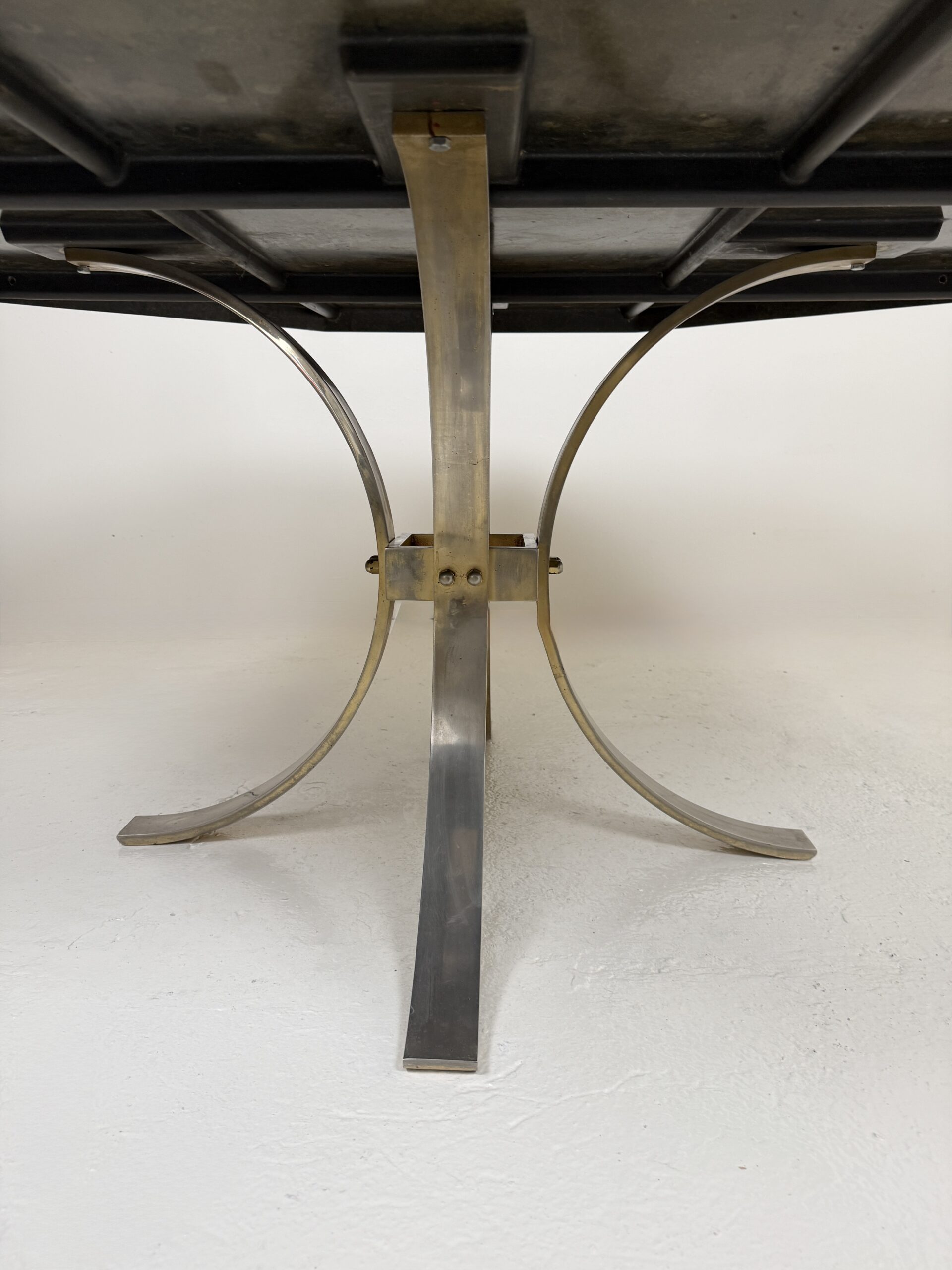 La table repose sur un piètement central en métal brossé formé de quatre arches, apportant un équilibre harmonieux entre force architecturale et légèreté visuelle.