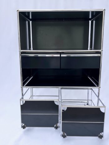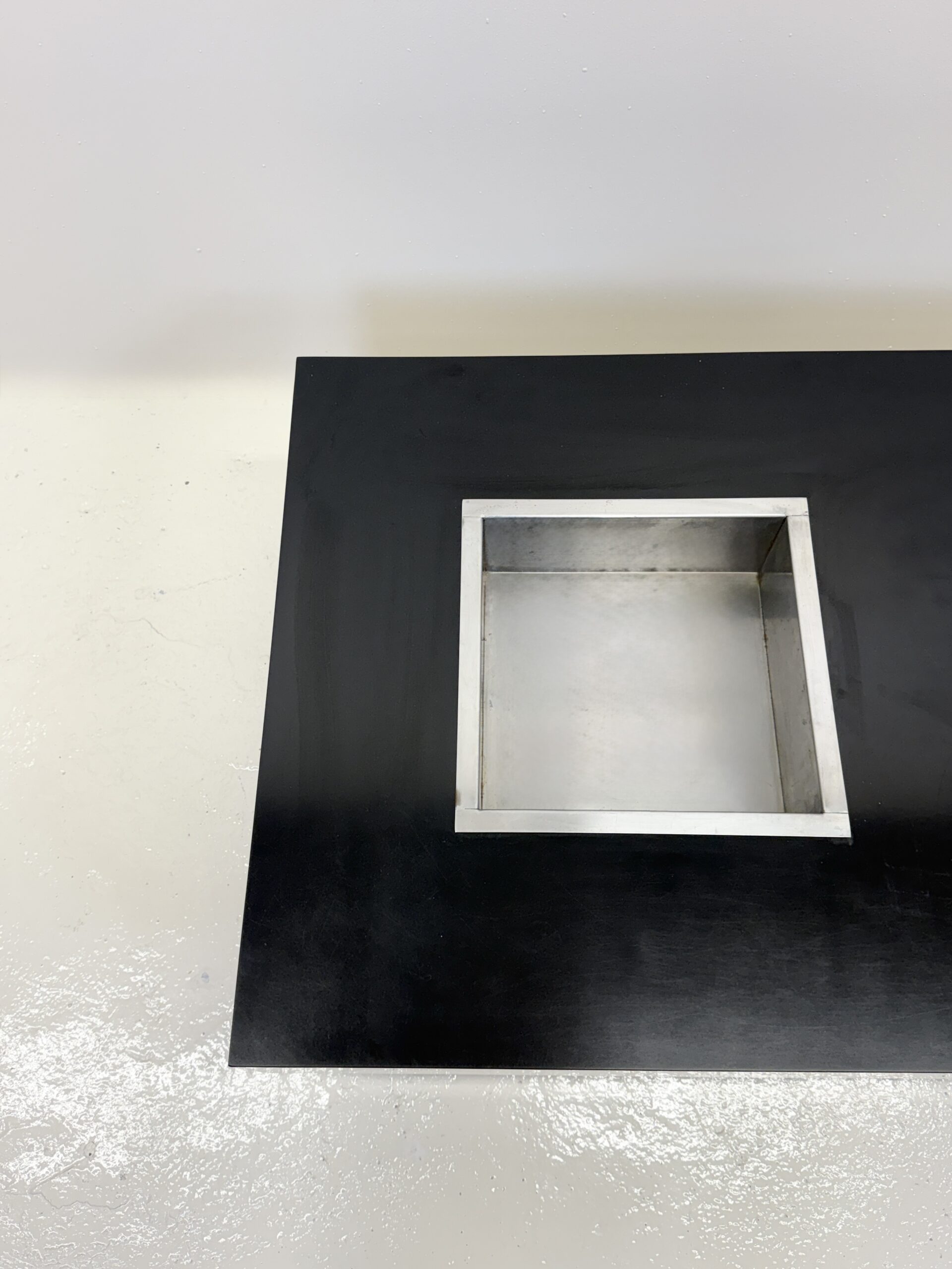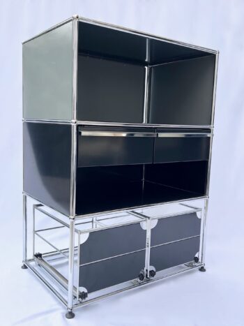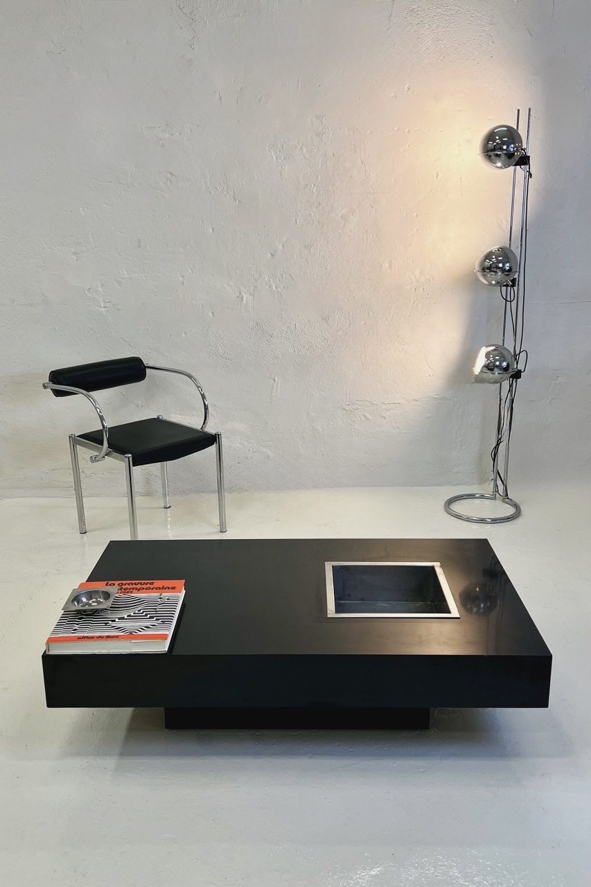Un compartiment carré encastré en métal chromé structure l’ensemble et souligne son esthétique radicale.