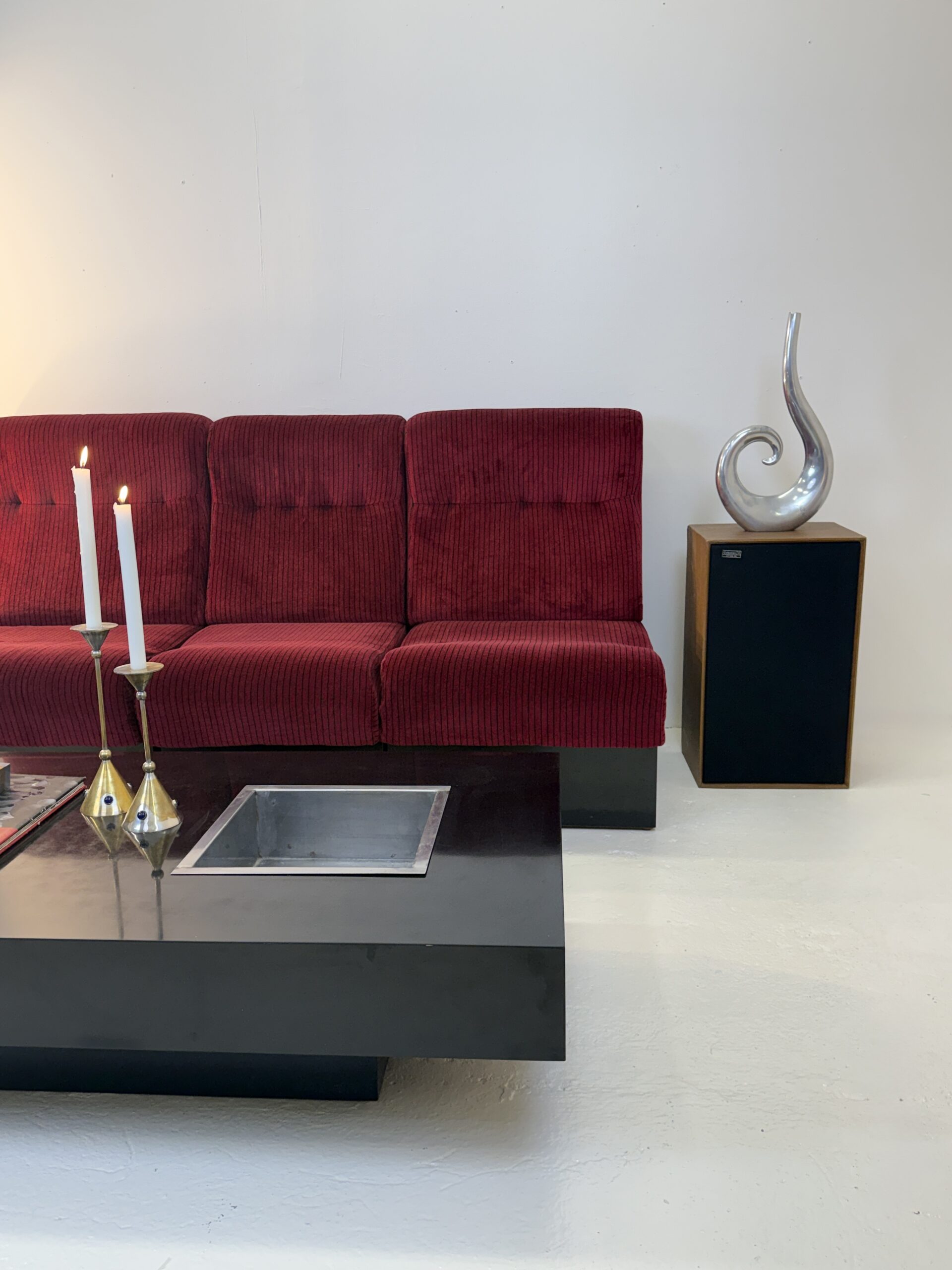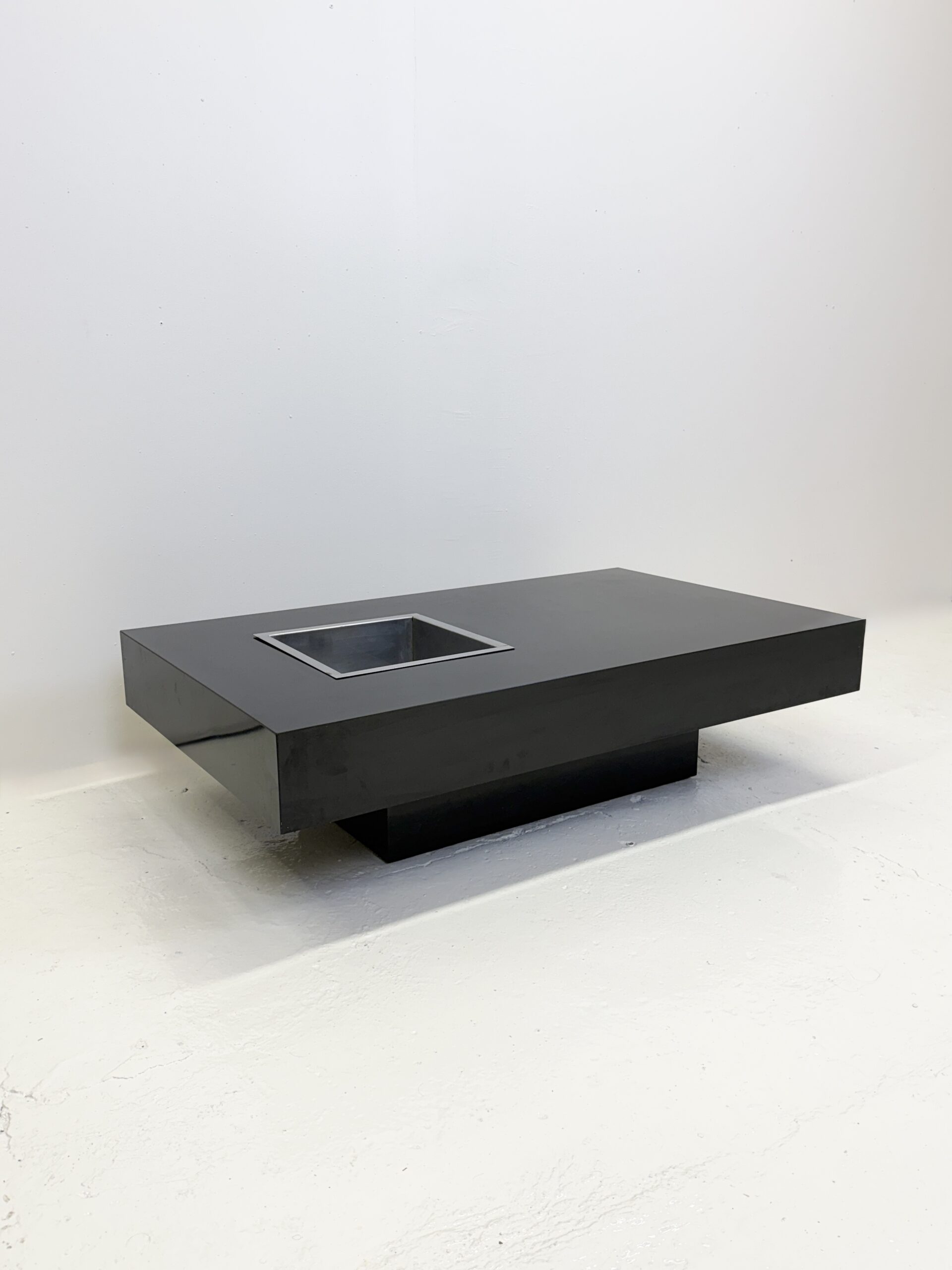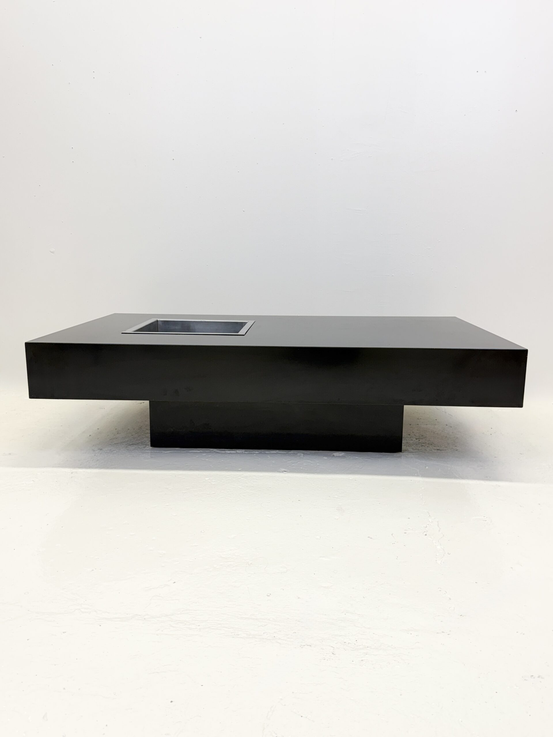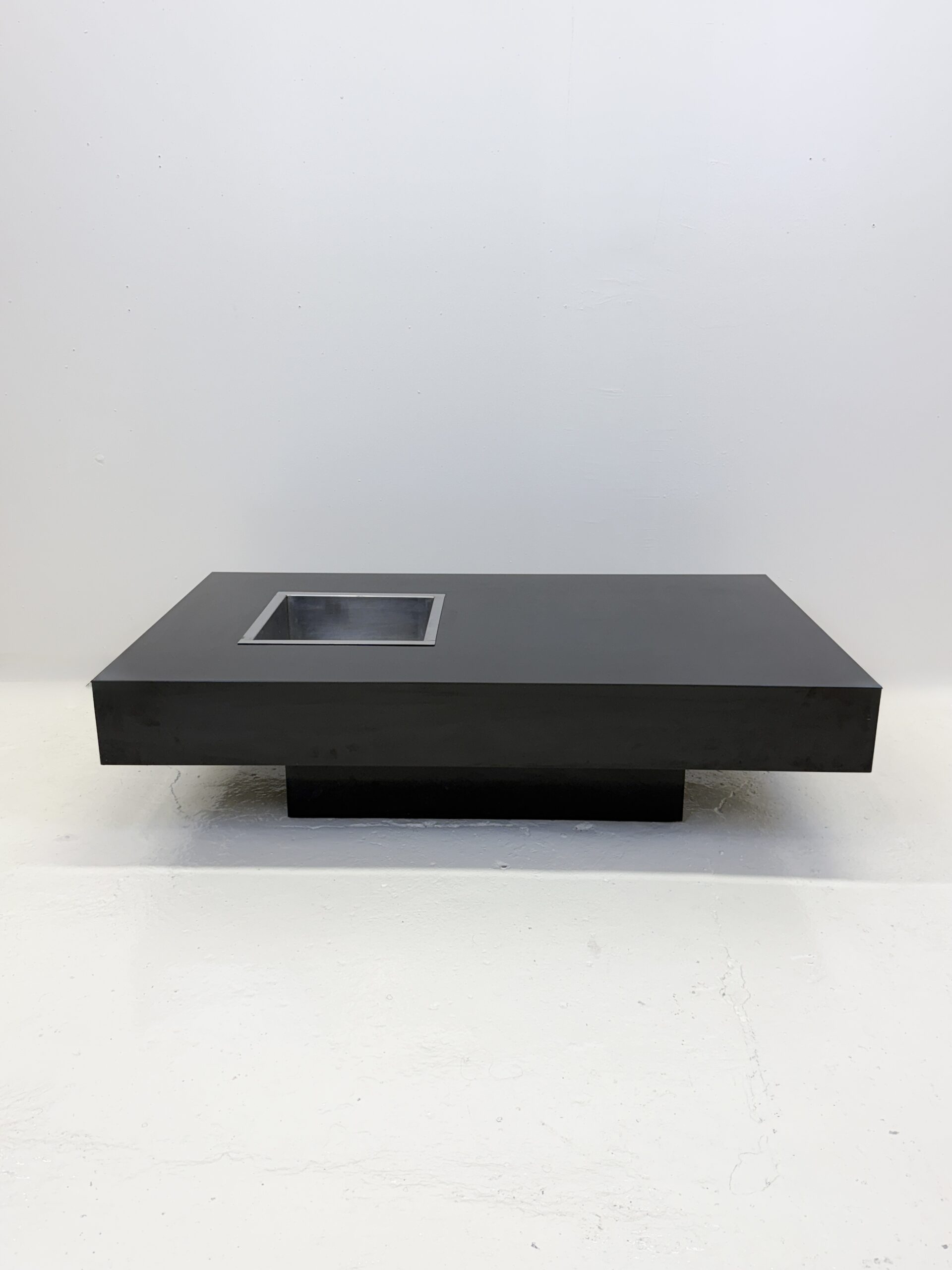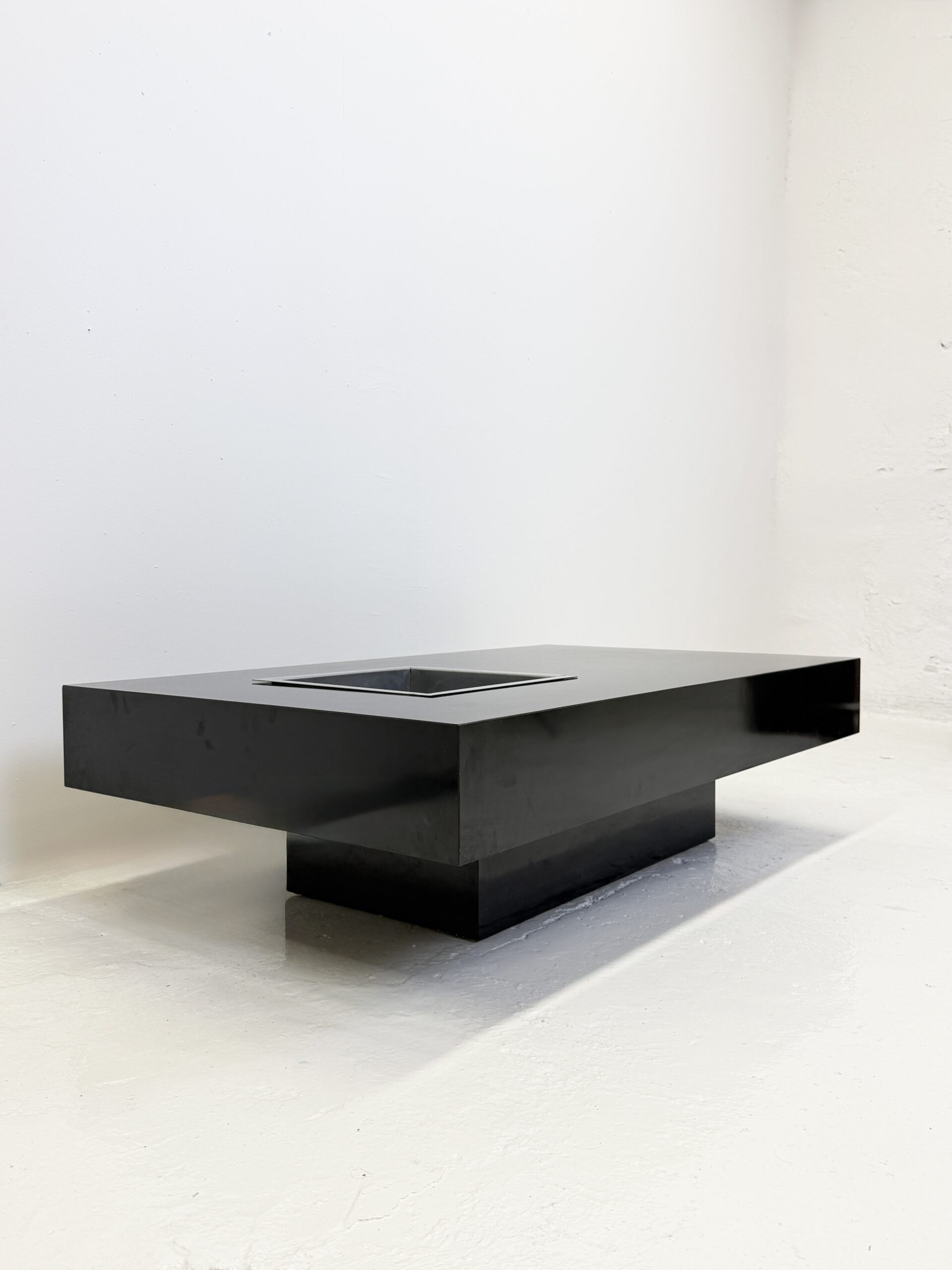 Table basse italienne au design architectural, composée d’un large plateau rectangulaire à la finition noire satinée reposant sur un piètement central en retrait.