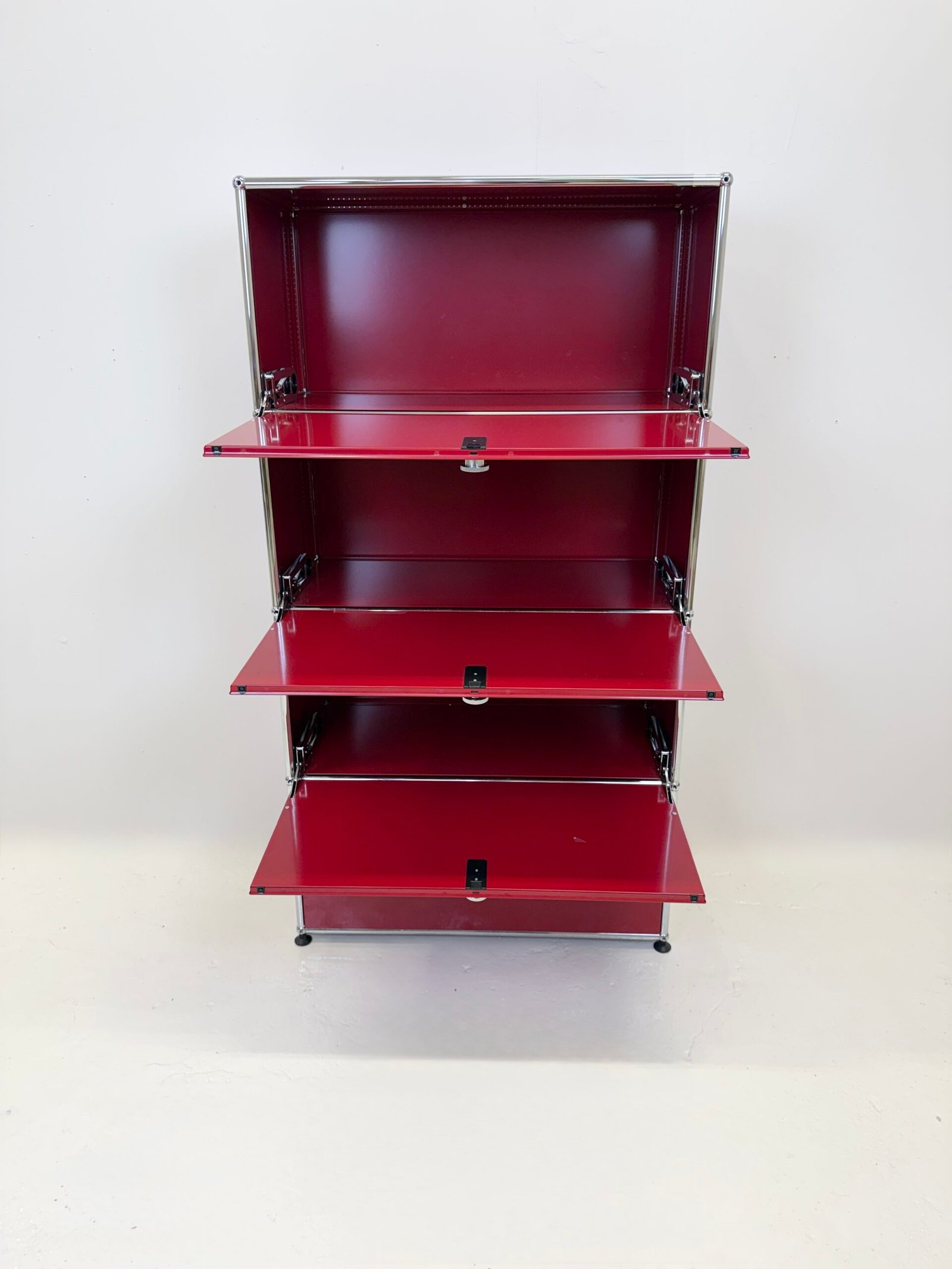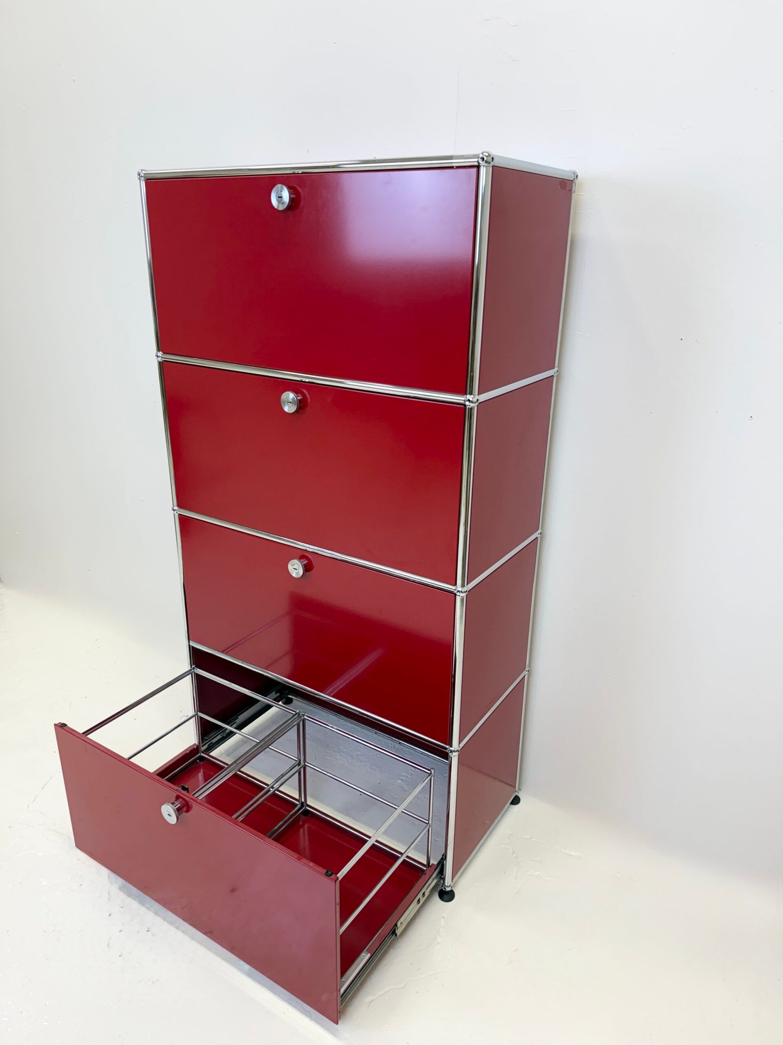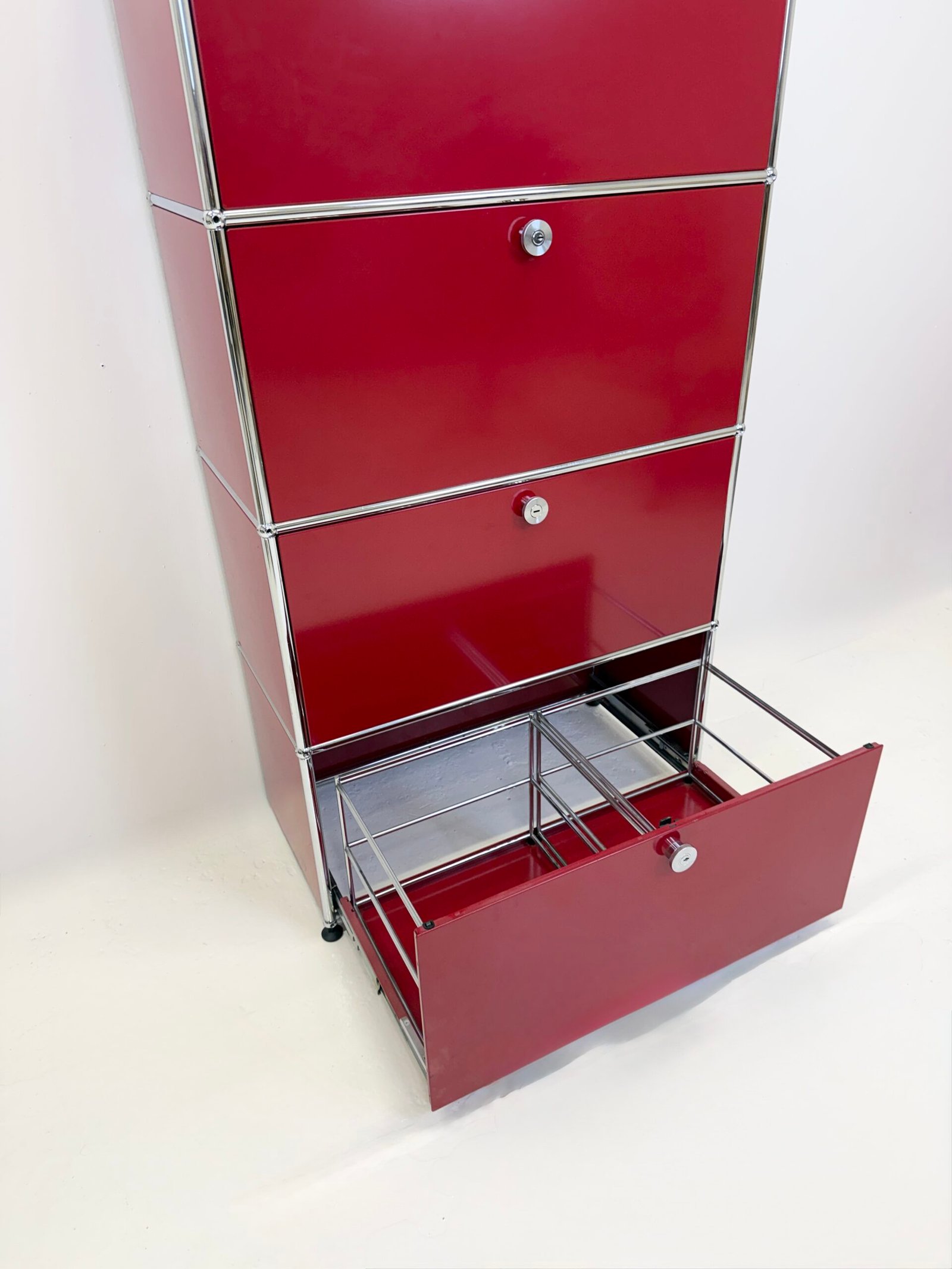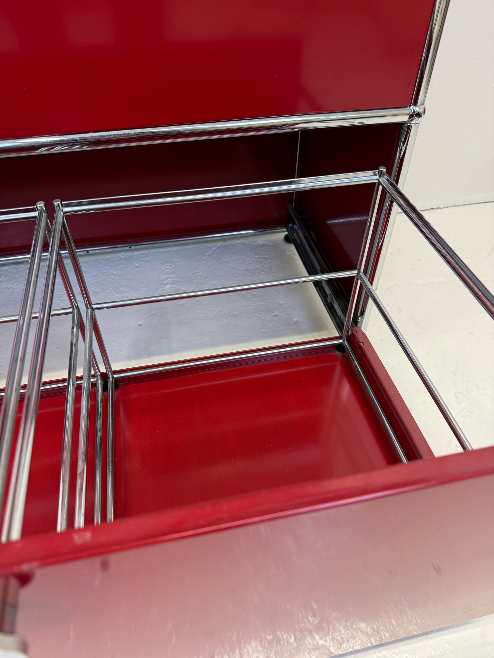 Grand meuble de rangement modulable USM Haller en métal laqué rouge avec structure tubulaire en acier chromé. Ce système iconique du design suisse se distingue par son esthétique minimaliste et sa grande fonctionnalité.