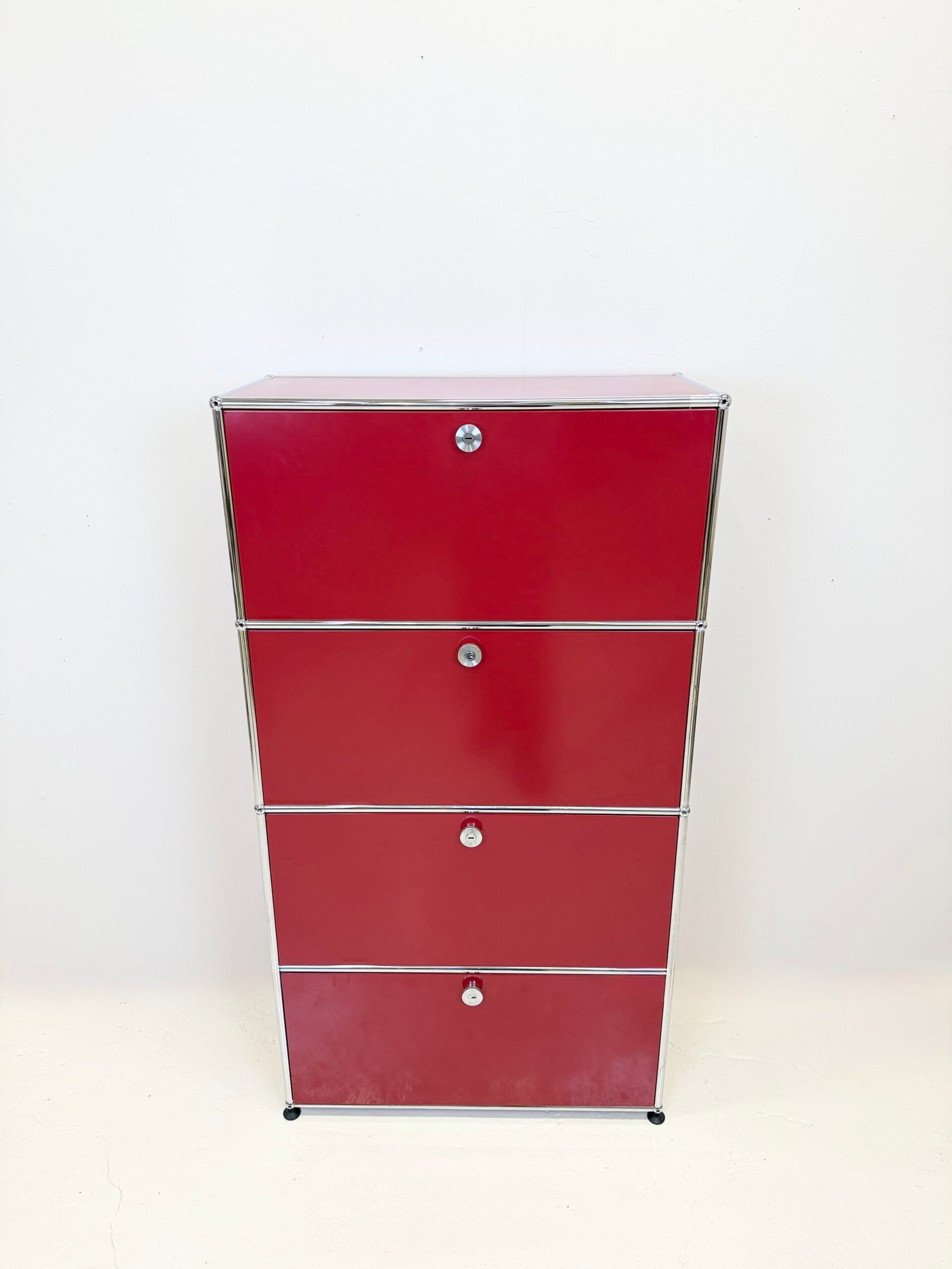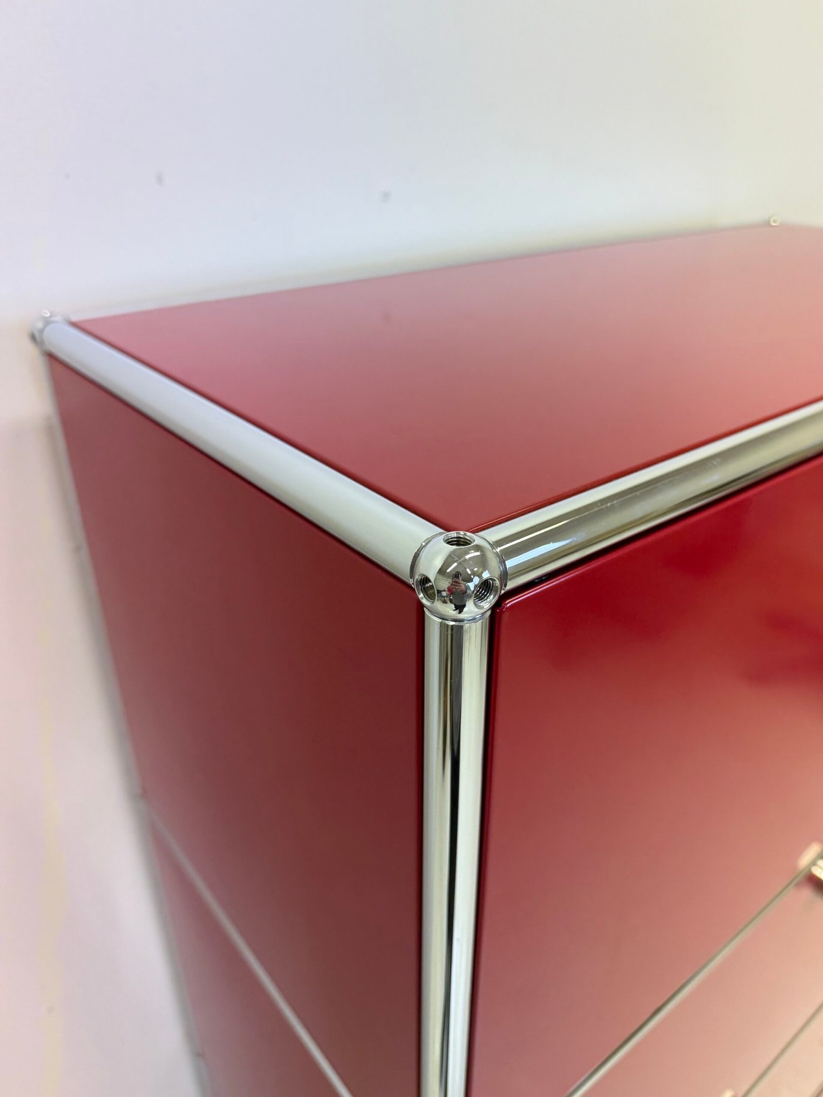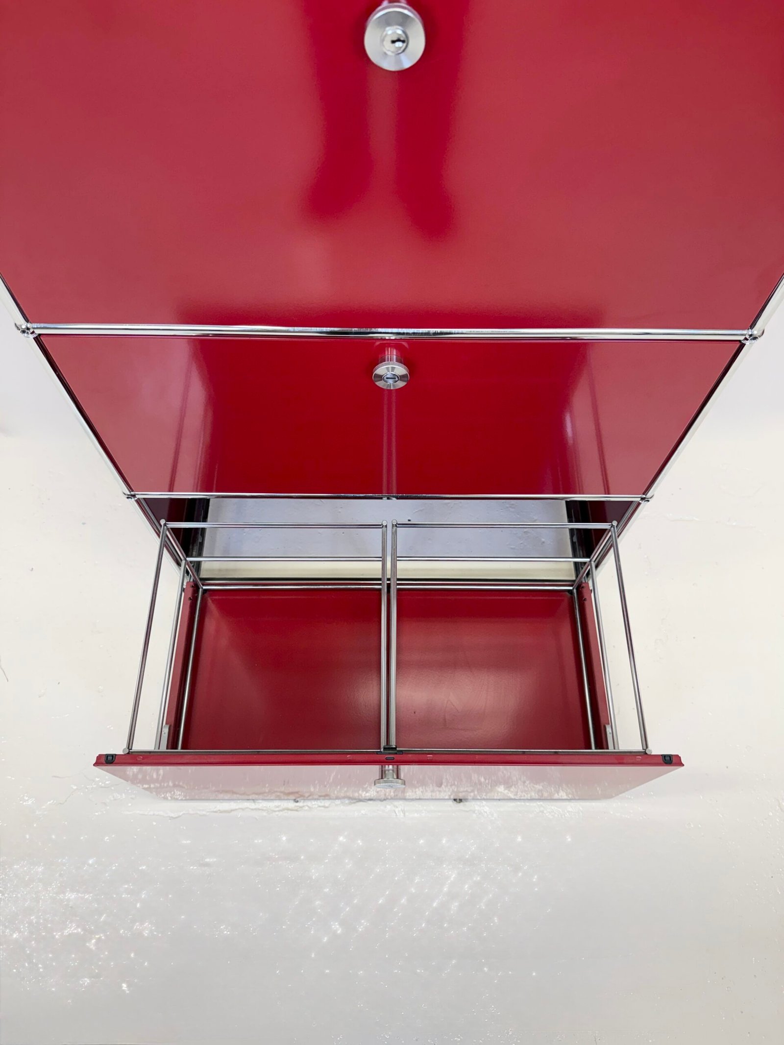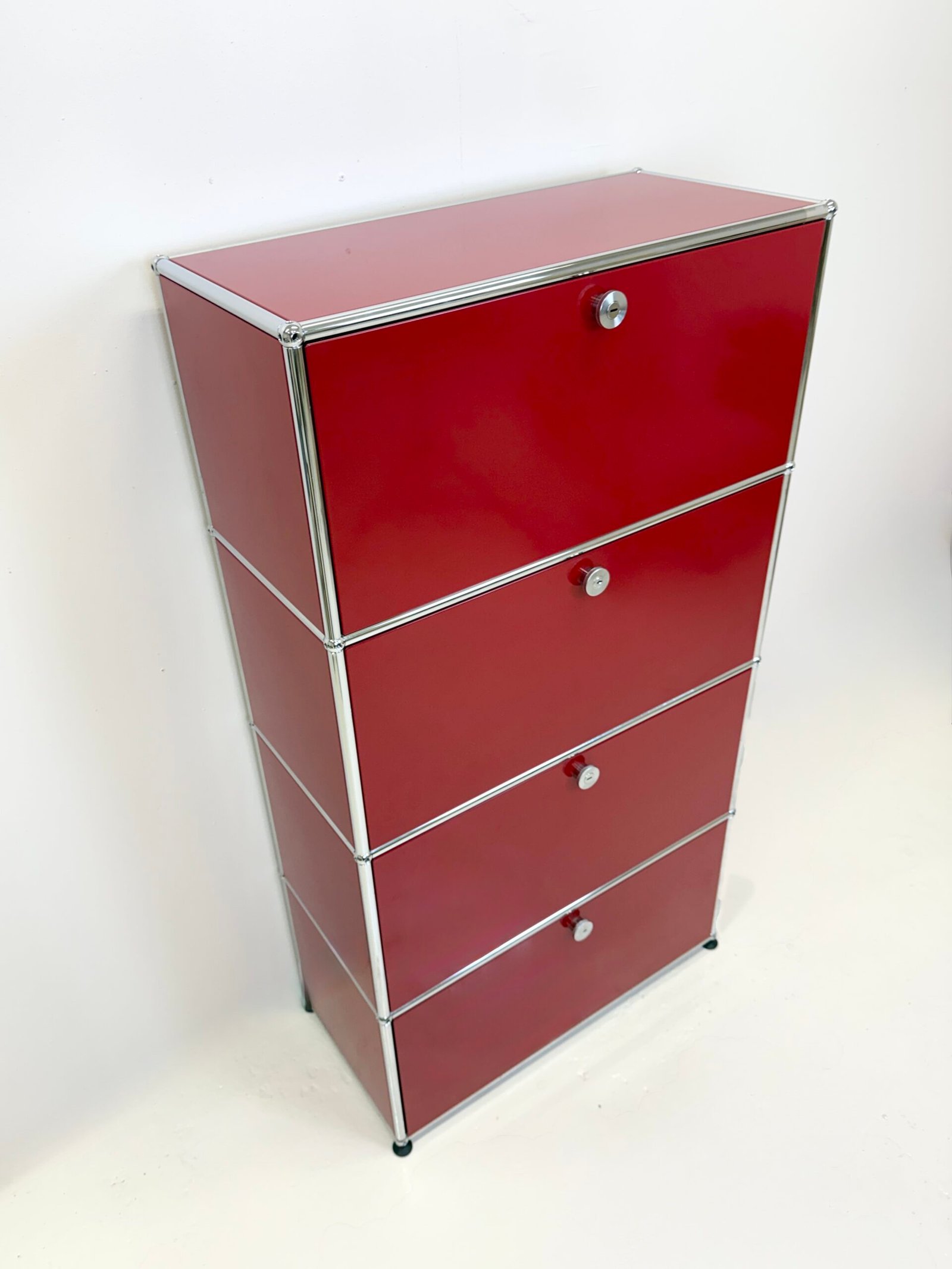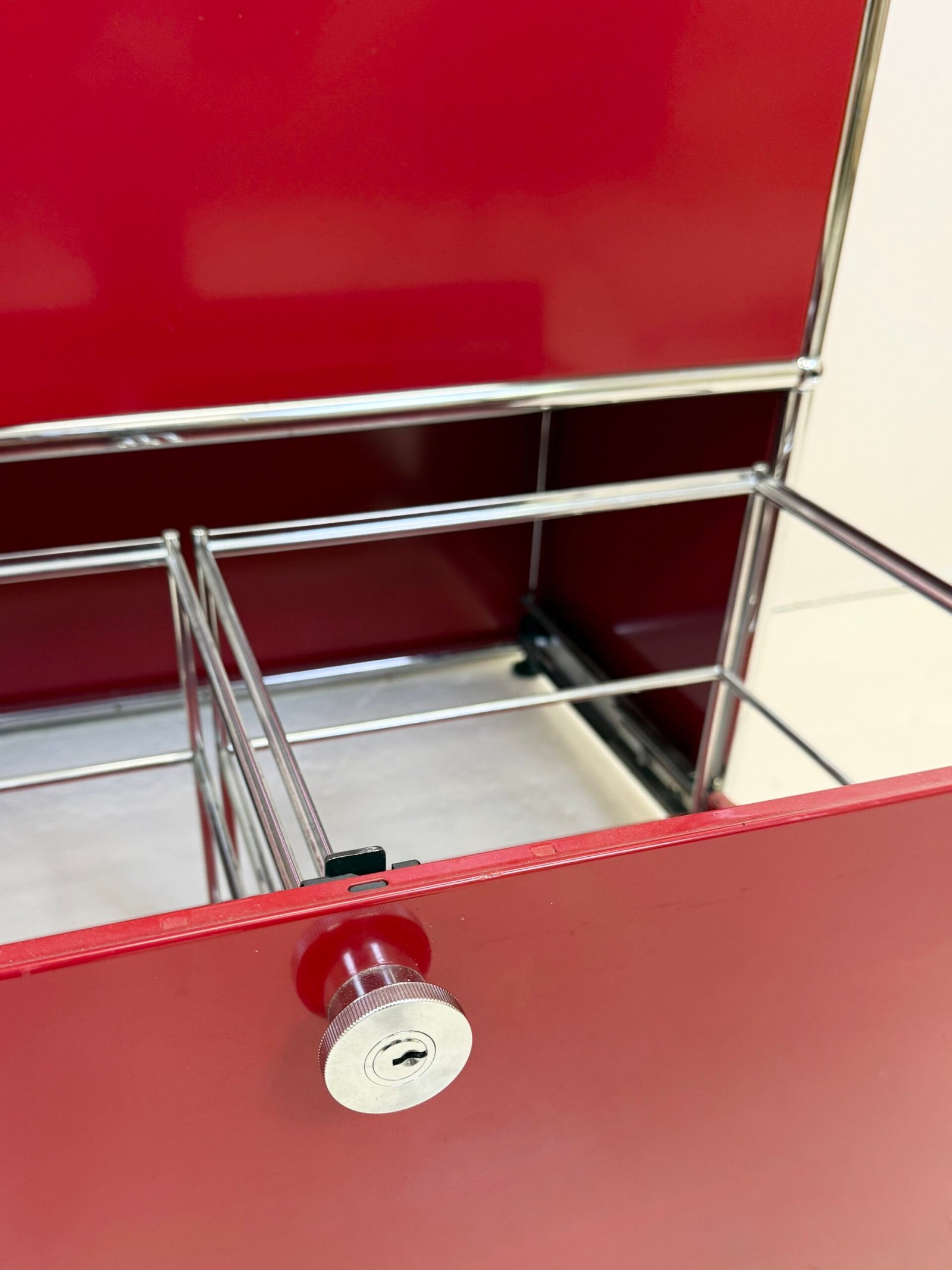 Grand meuble de rangement modulable USM Haller en métal laqué rouge avec structure tubulaire en acier chromé. Ce système iconique du design suisse se distingue par son esthétique minimaliste et sa grande fonctionnalité.