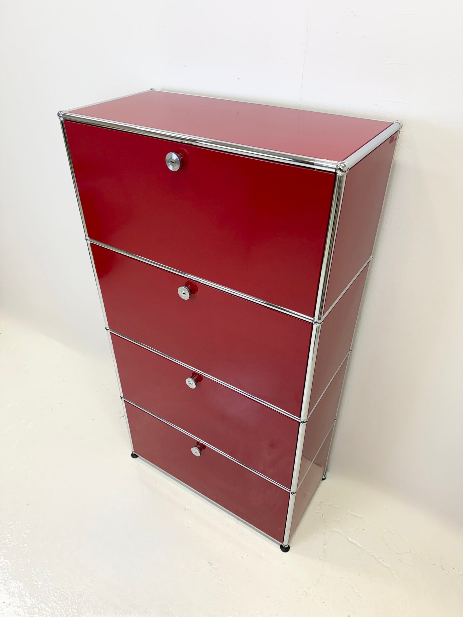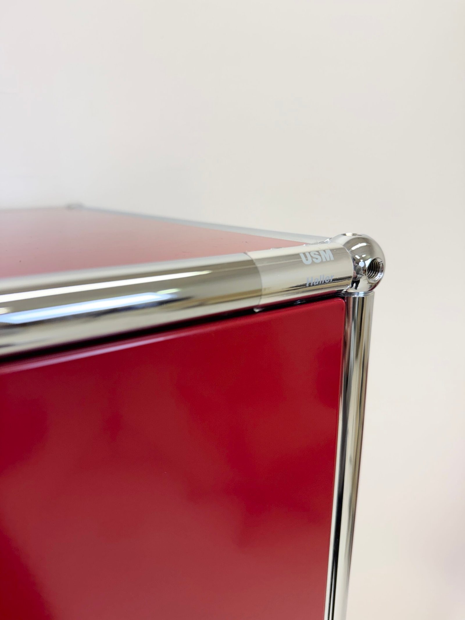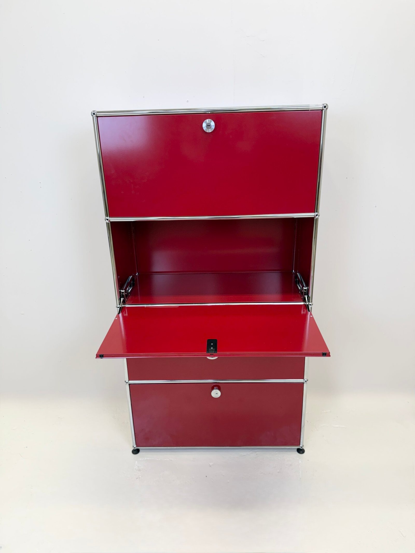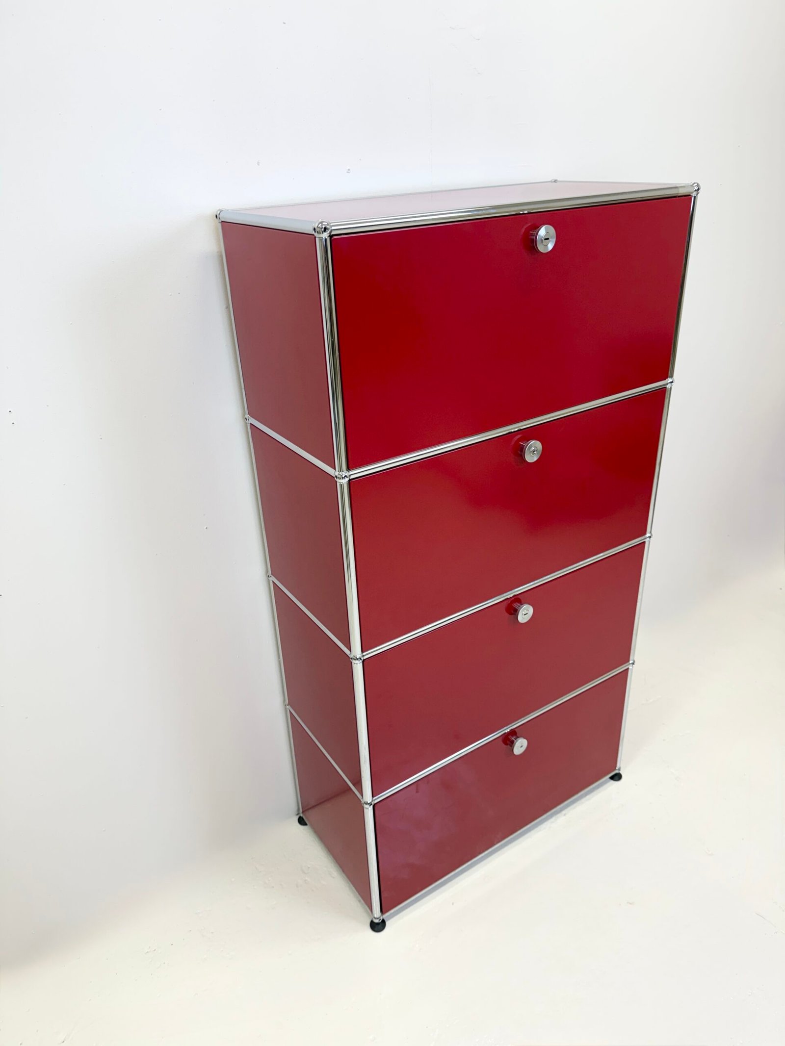 Grand meuble de rangement modulable USM Haller en métal laqué rouge avec structure tubulaire en acier chromé. Ce système iconique du design suisse se distingue par son esthétique minimaliste et sa grande fonctionnalité.