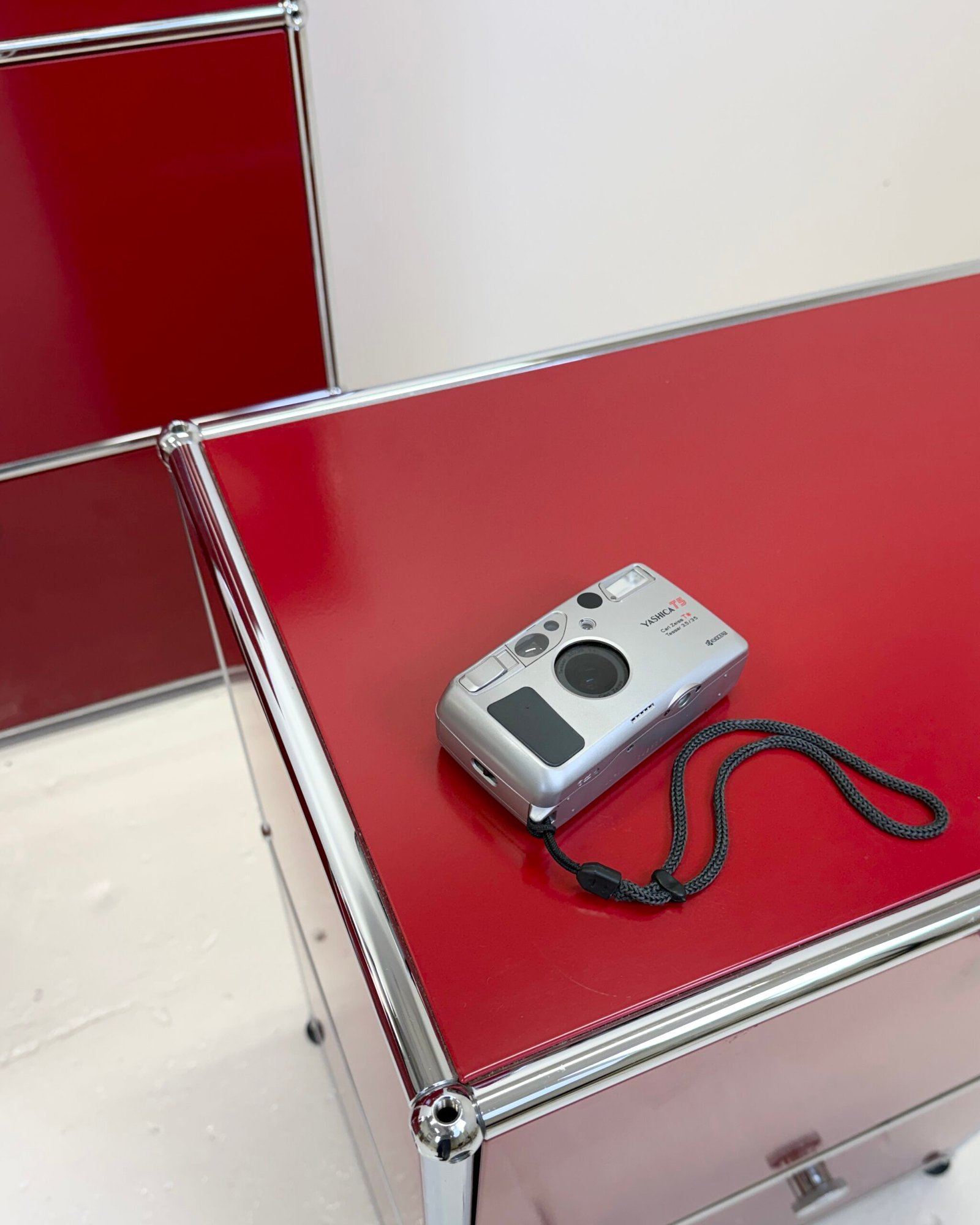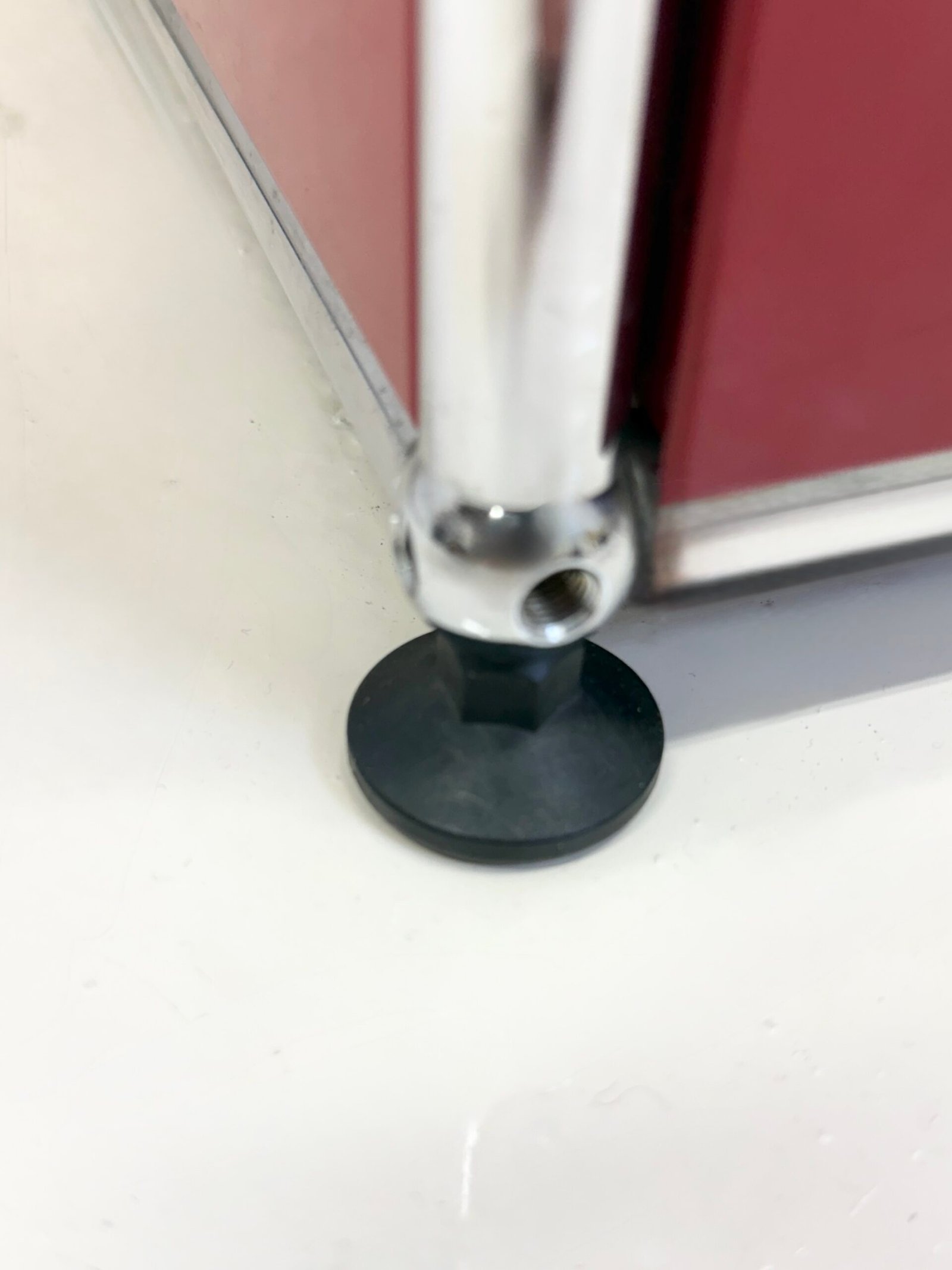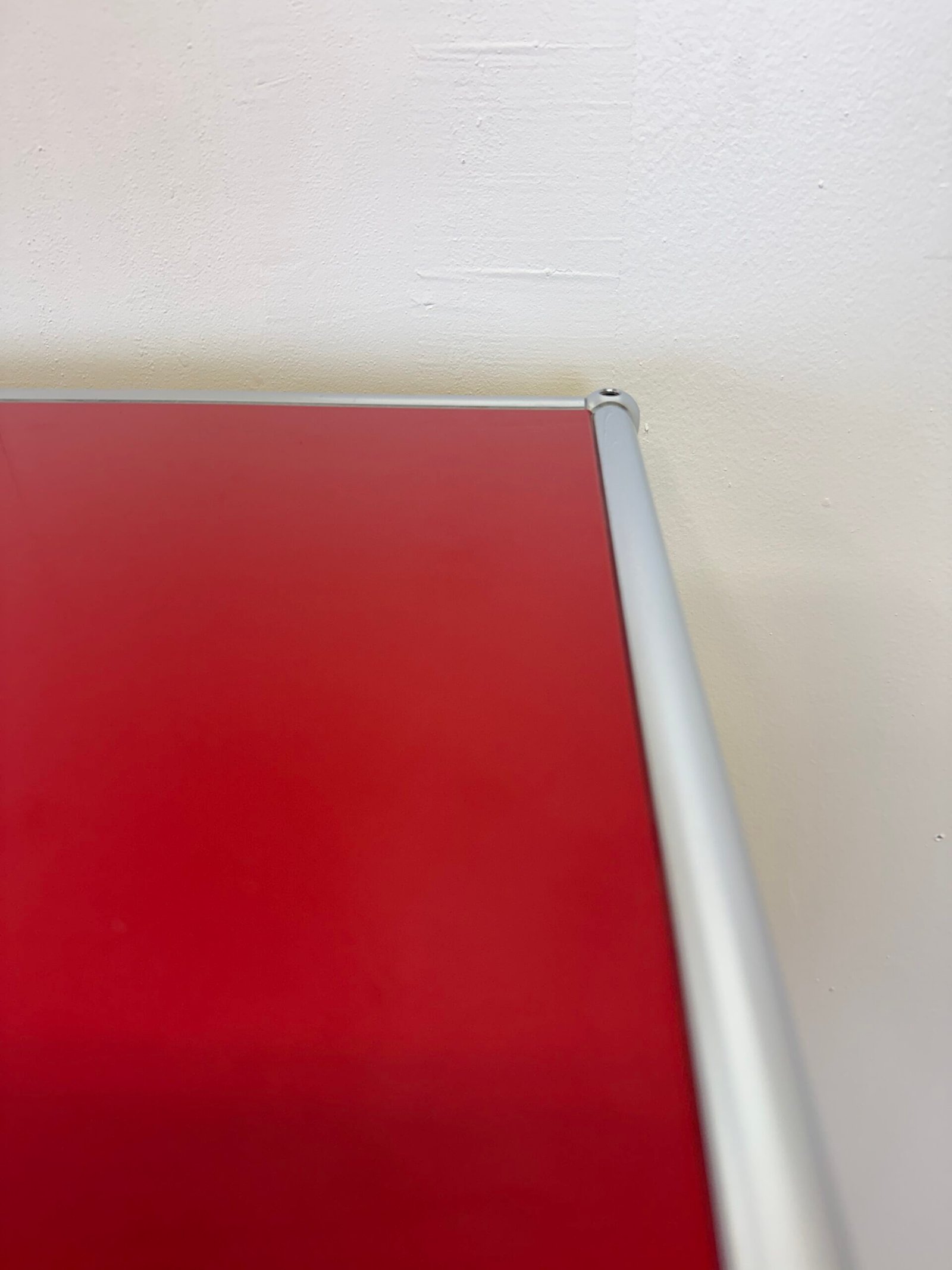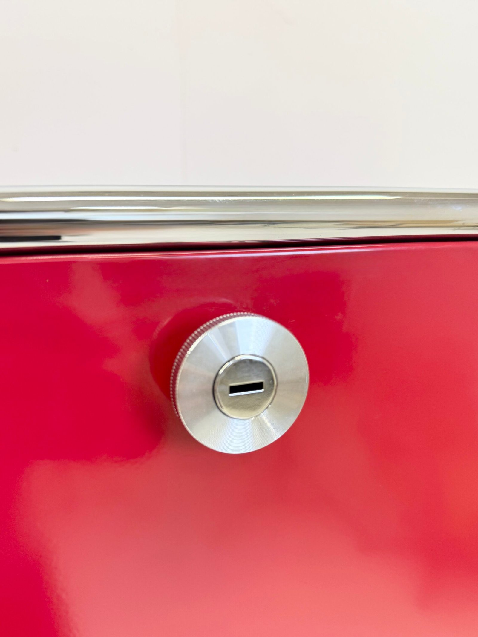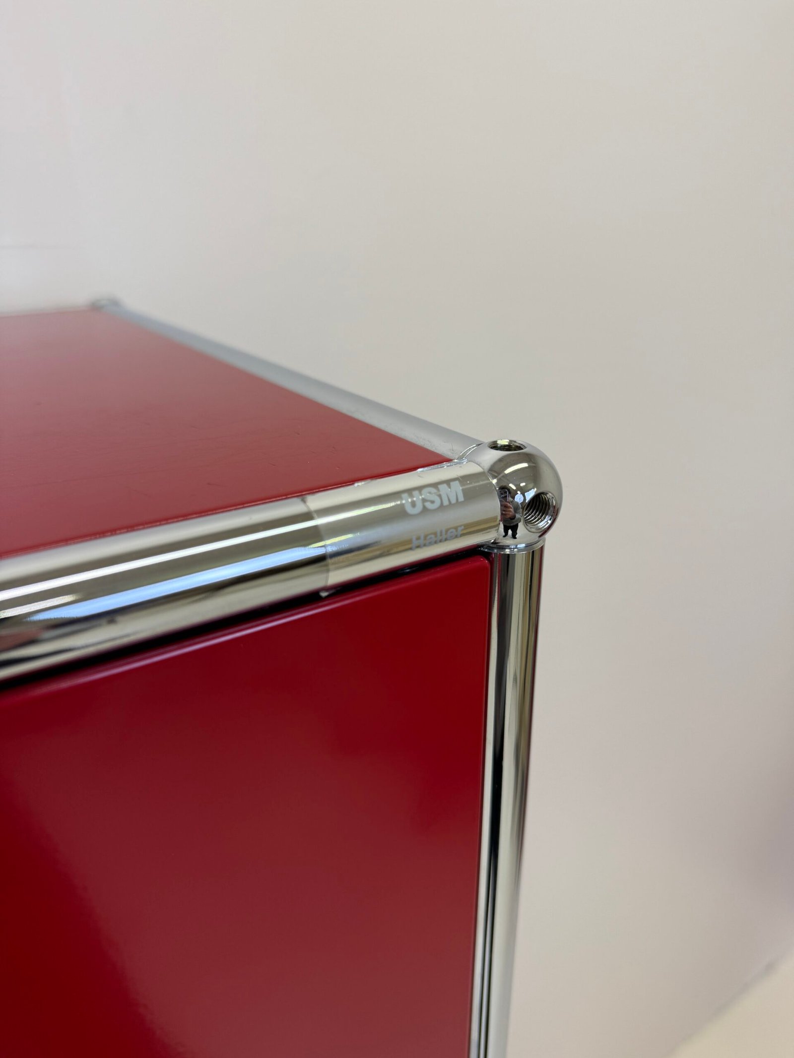 Grand meuble de rangement modulable USM Haller en métal laqué rouge avec structure tubulaire en acier chromé. Ce système iconique du design suisse se distingue par son esthétique minimaliste et sa grande fonctionnalité.