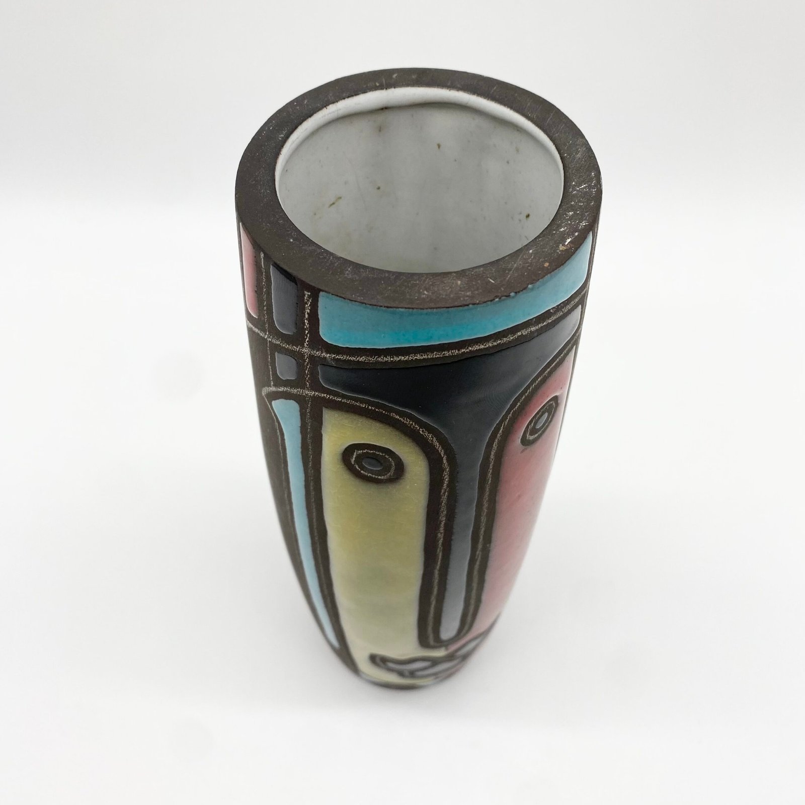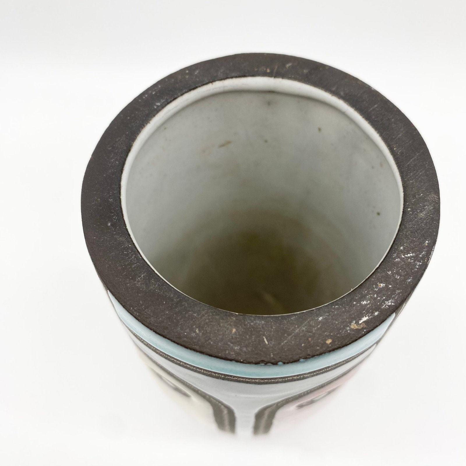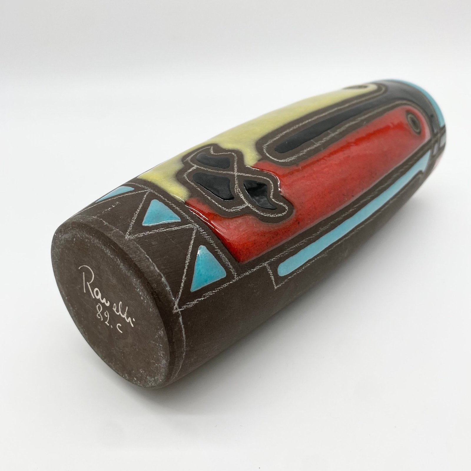 Ce modèle dit « vase-masque » se distingue par son émail polychrome et ses lignes blanches tracées à la main dans l’argile, une technique introduite par Ravelli à la fin des années 1950 après un séjour en Italie.