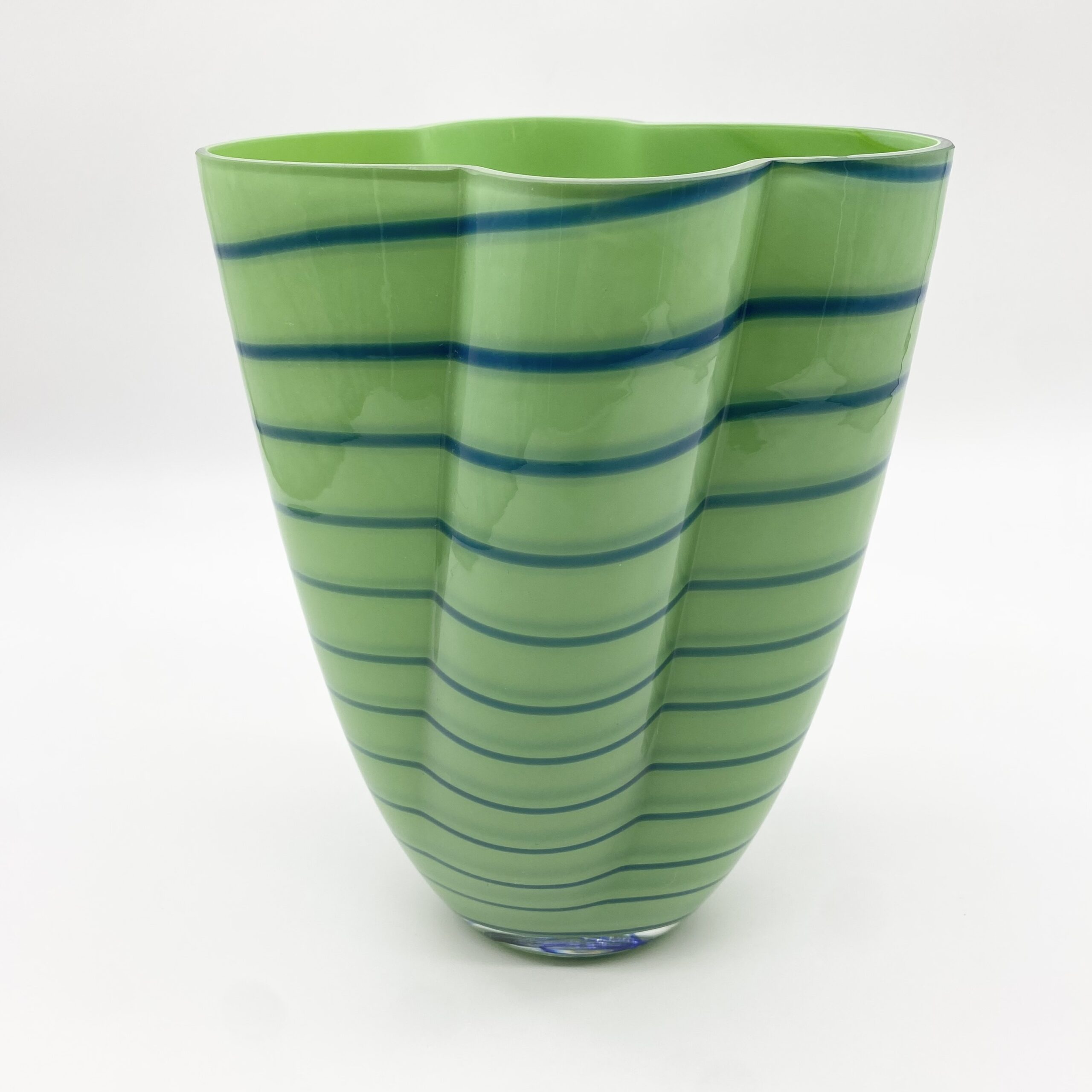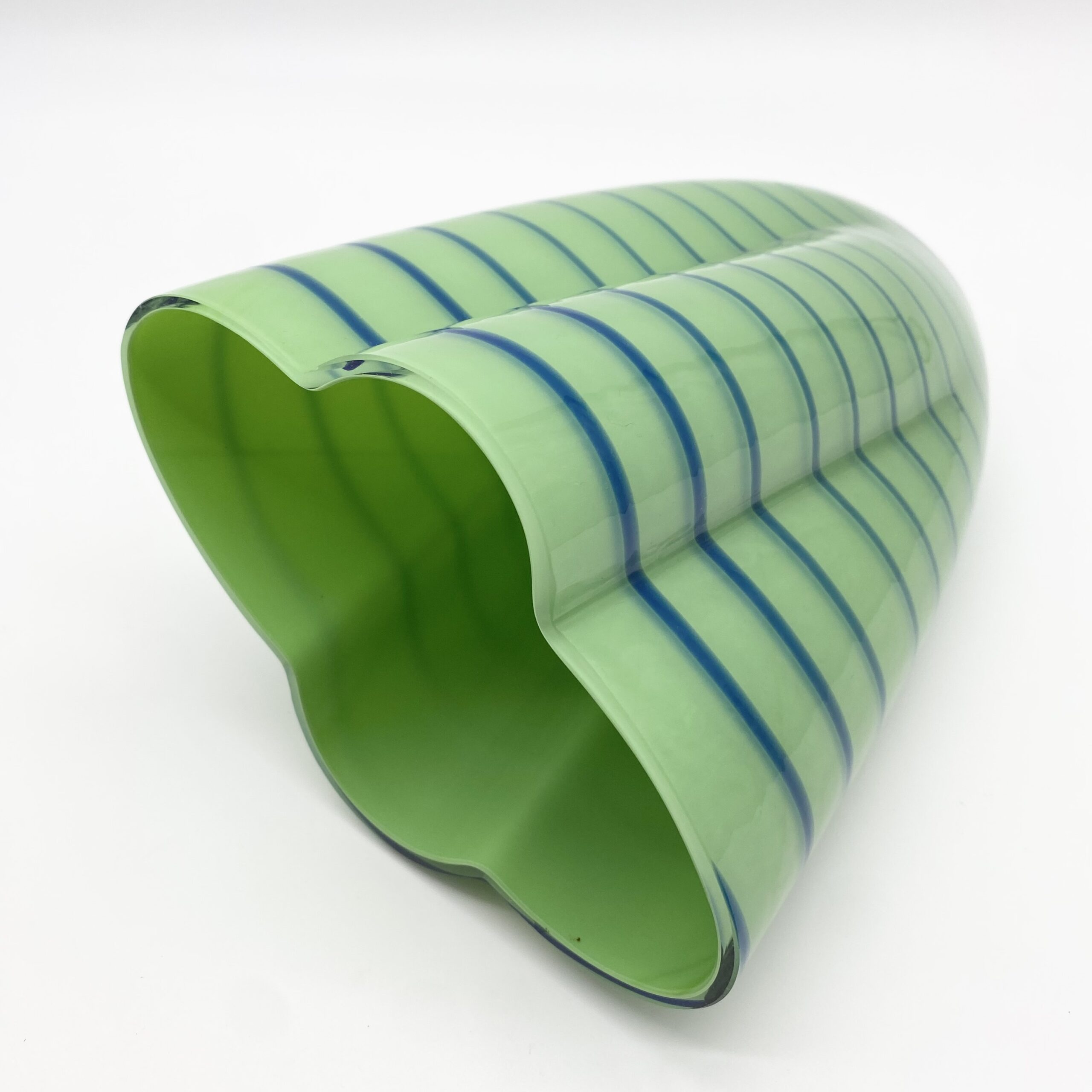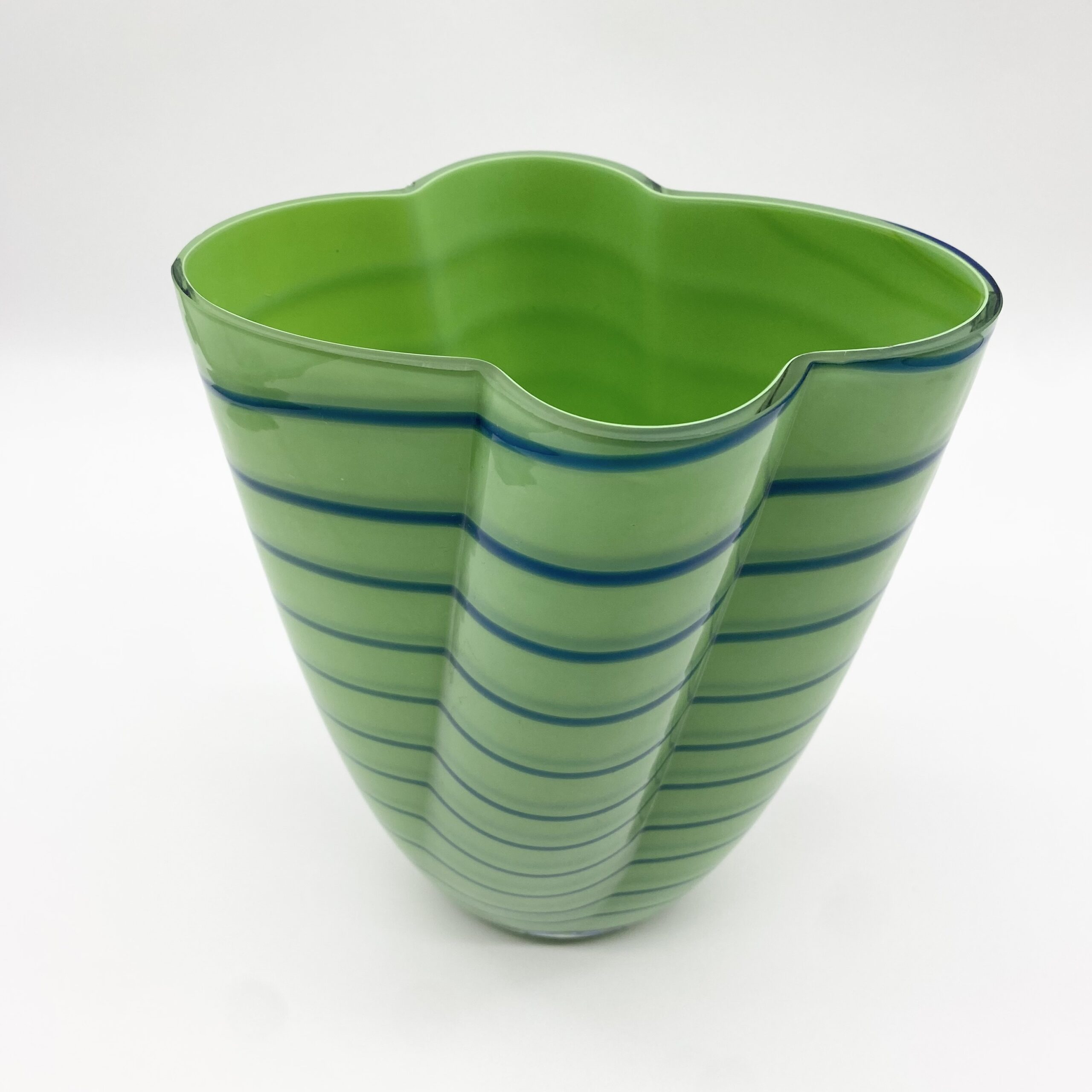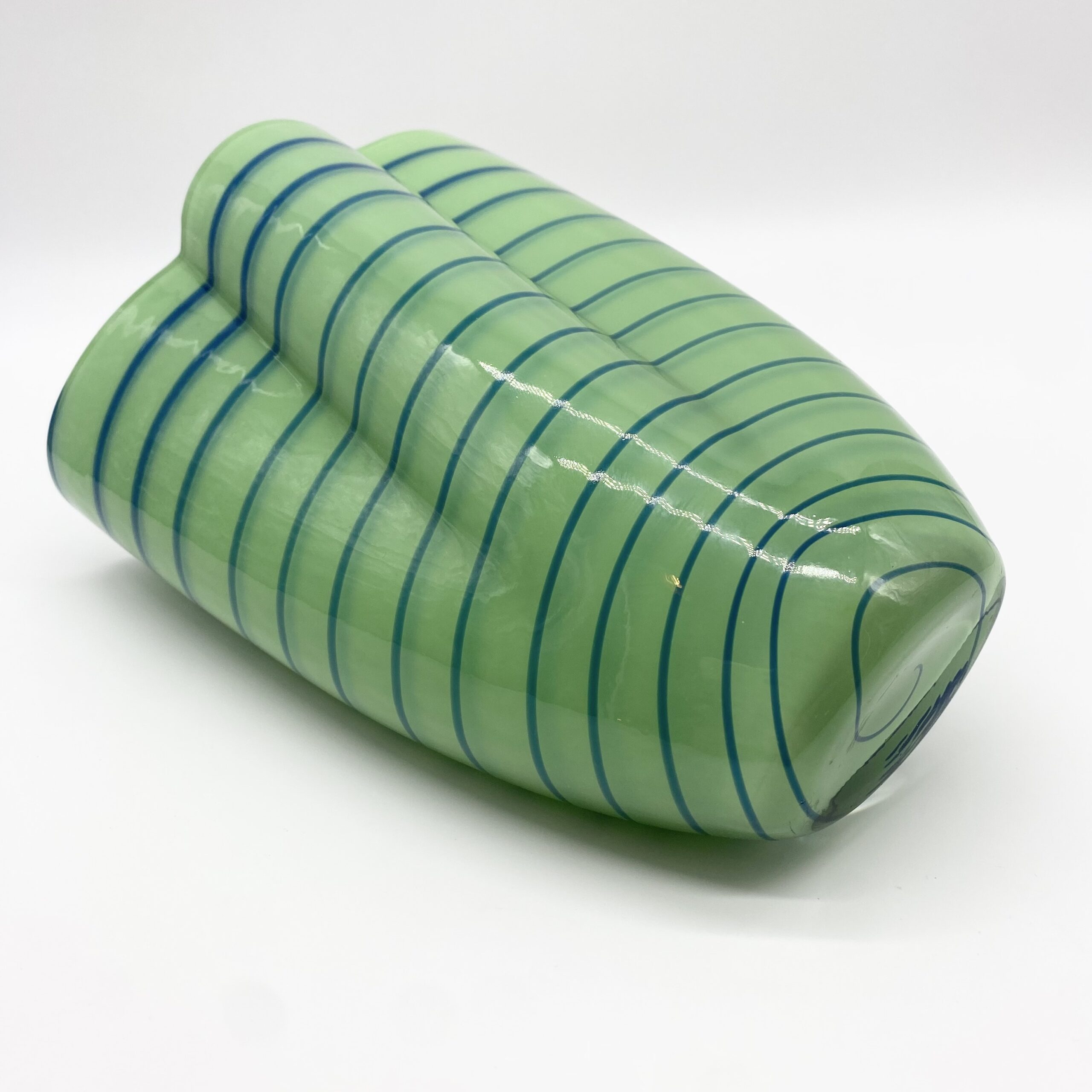 Sa teinte vert vif est rythmée de filets bleus horizontaux qui soulignent sa silhouette, rappelant les techniques traditionnelles de la verrerie vénitienne.