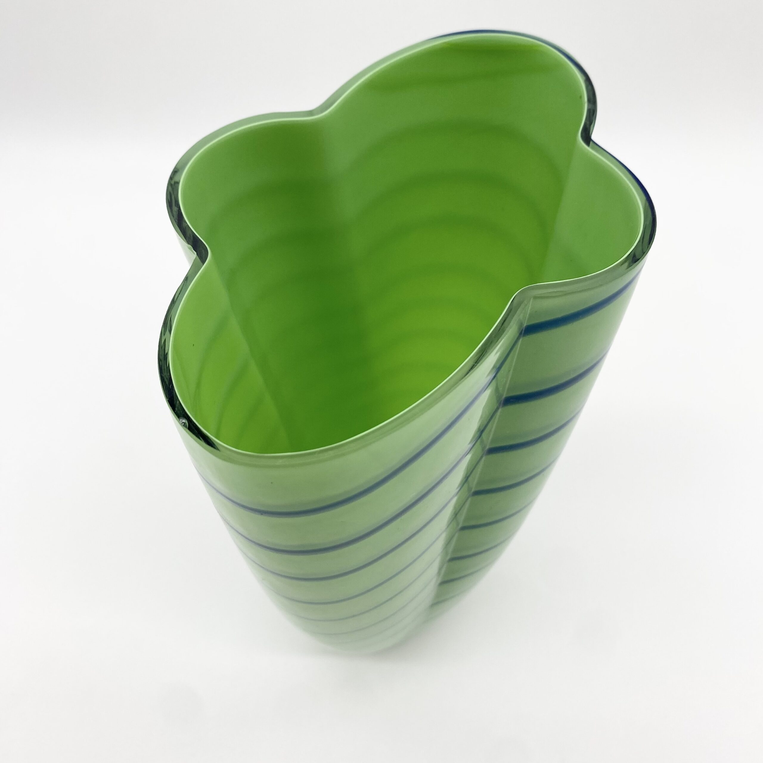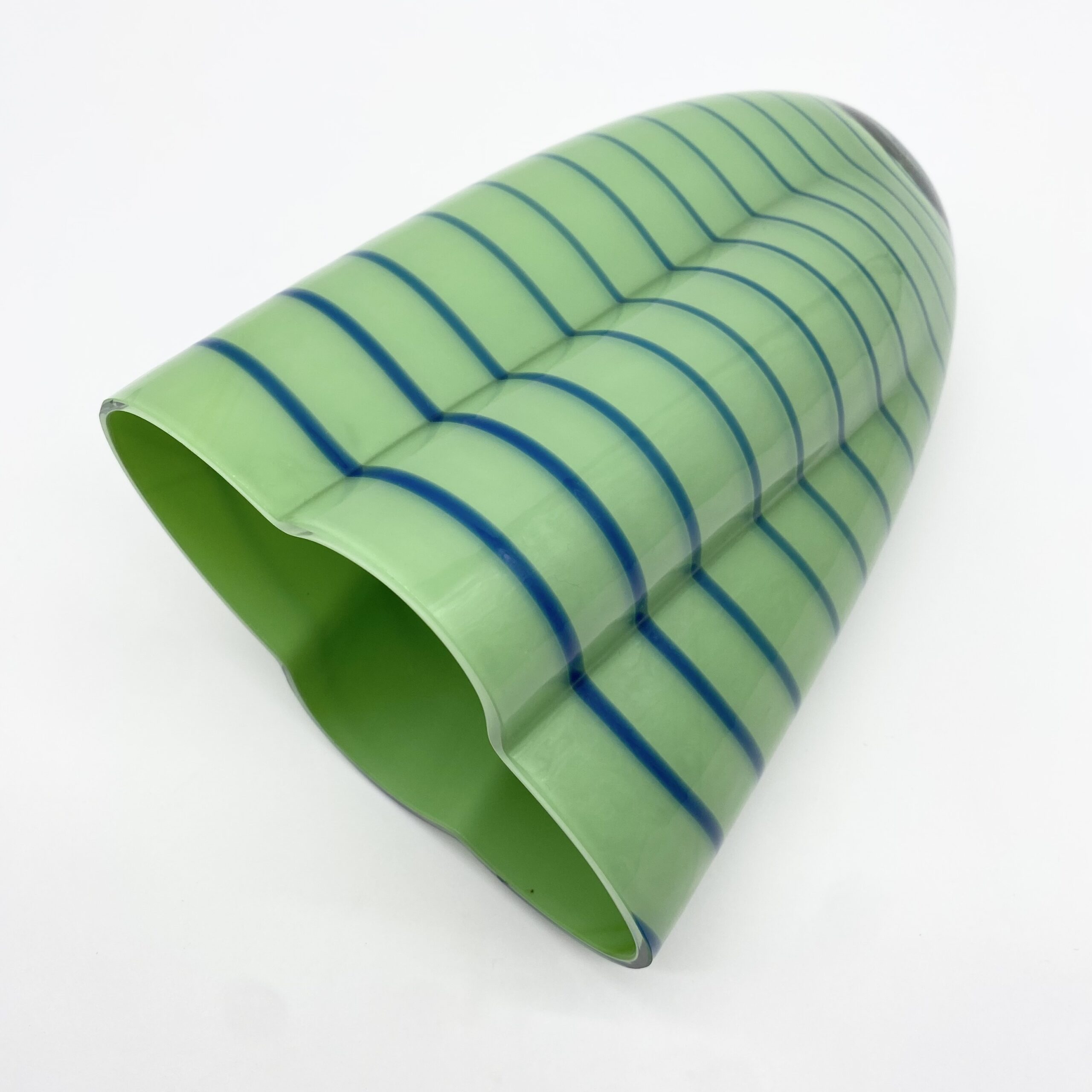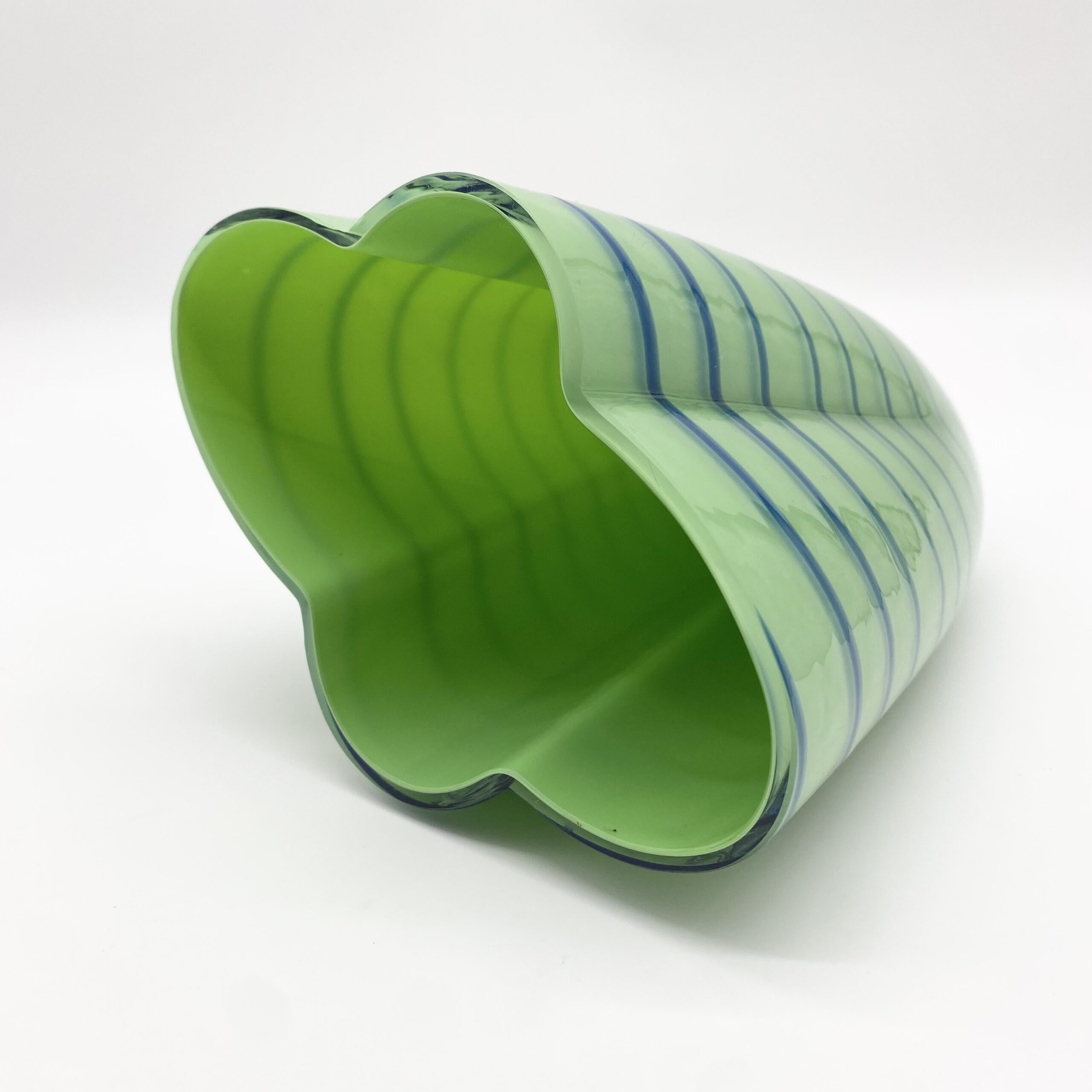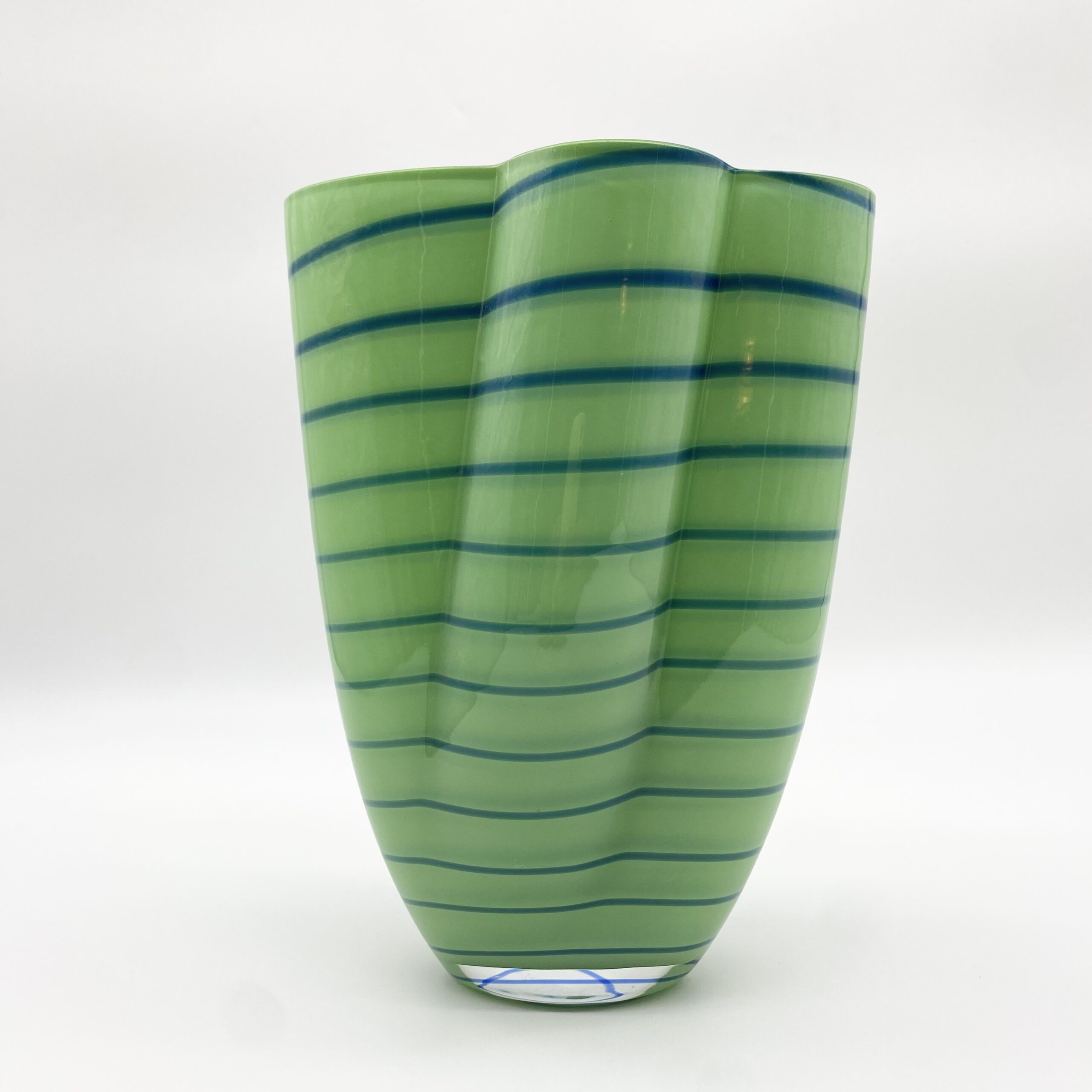 Sa teinte vert vif est rythmée de filets bleus horizontaux qui soulignent sa silhouette, rappelant les techniques traditionnelles de la verrerie vénitienne.