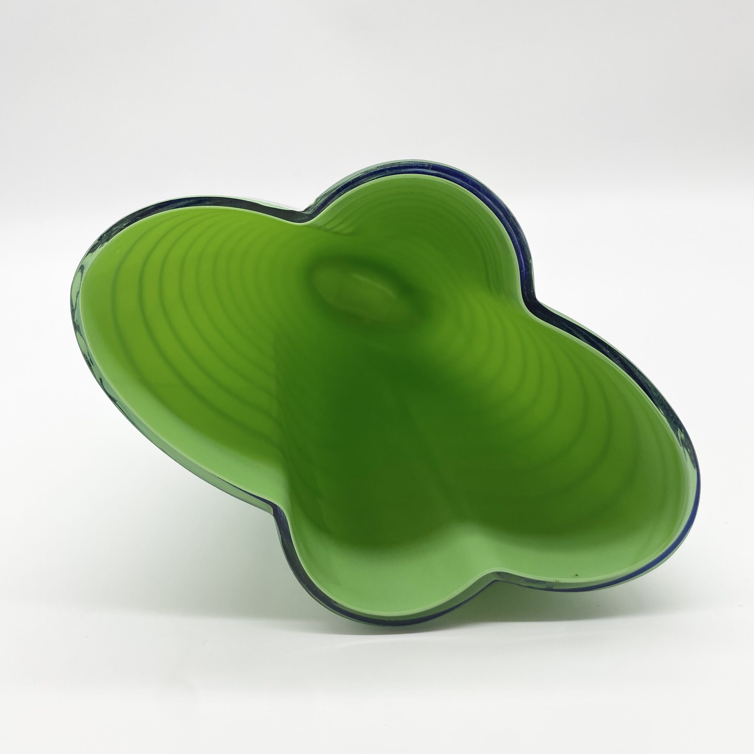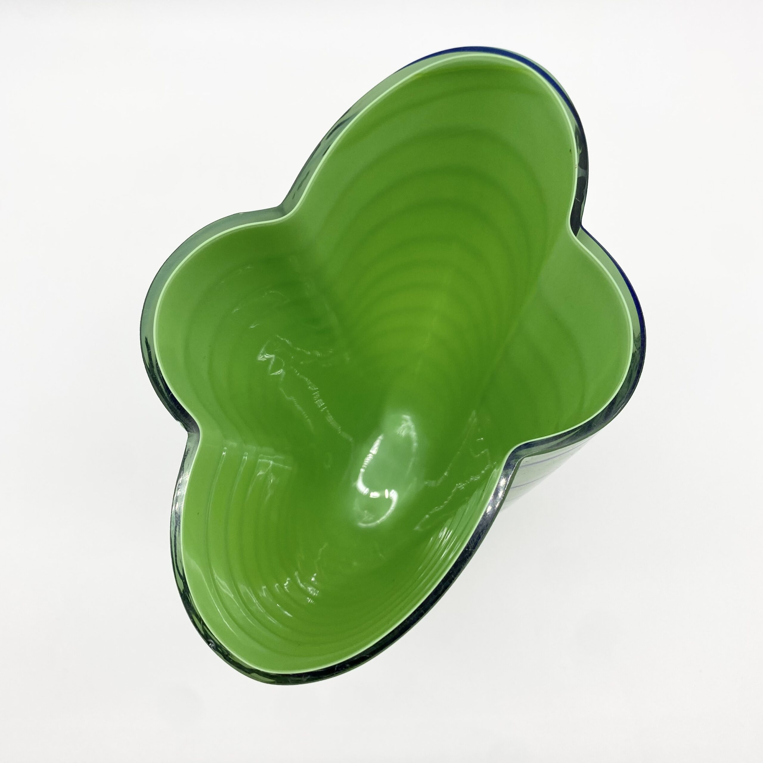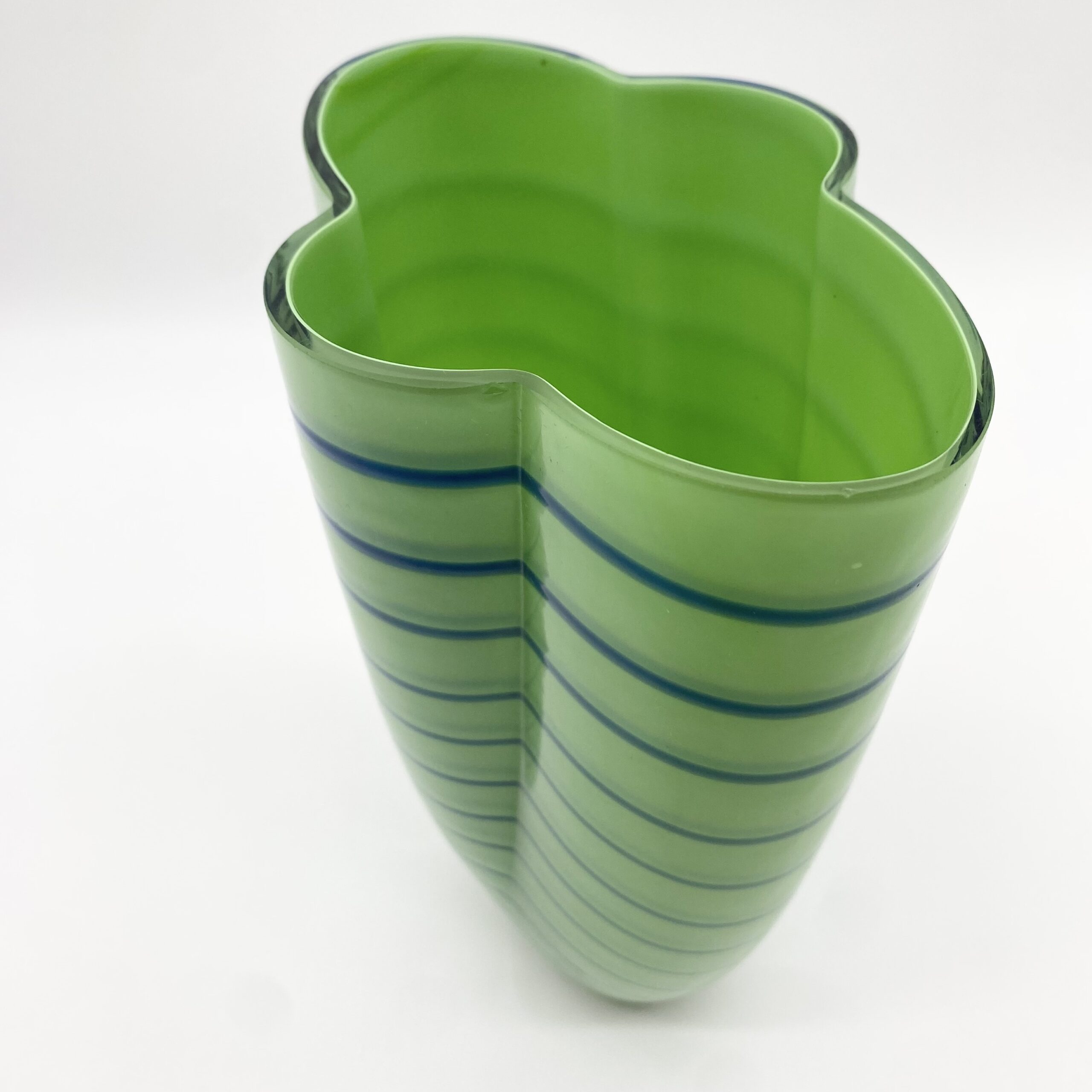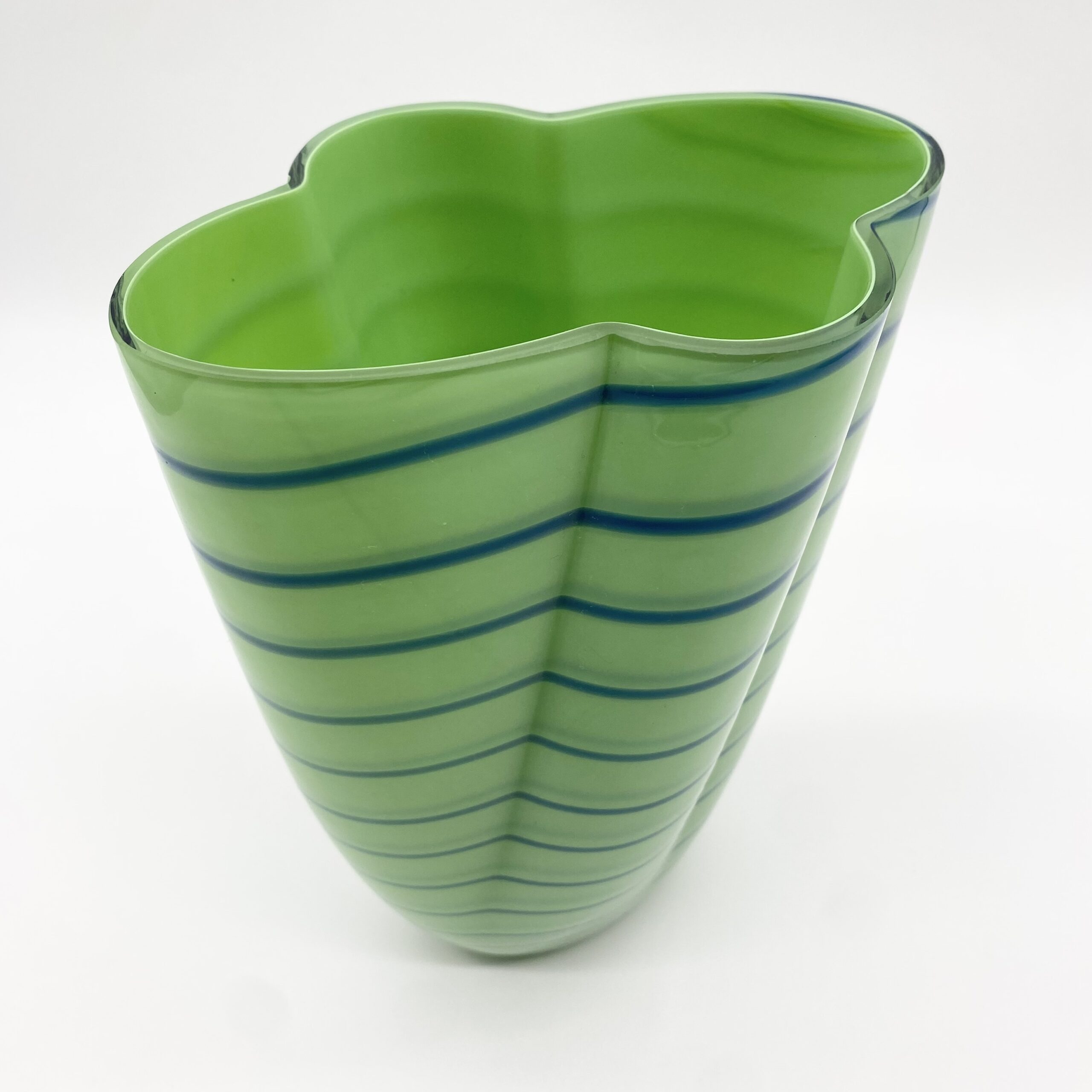 Sa teinte vert vif est rythmée de filets bleus horizontaux qui soulignent sa silhouette, rappelant les techniques traditionnelles de la verrerie vénitienne.