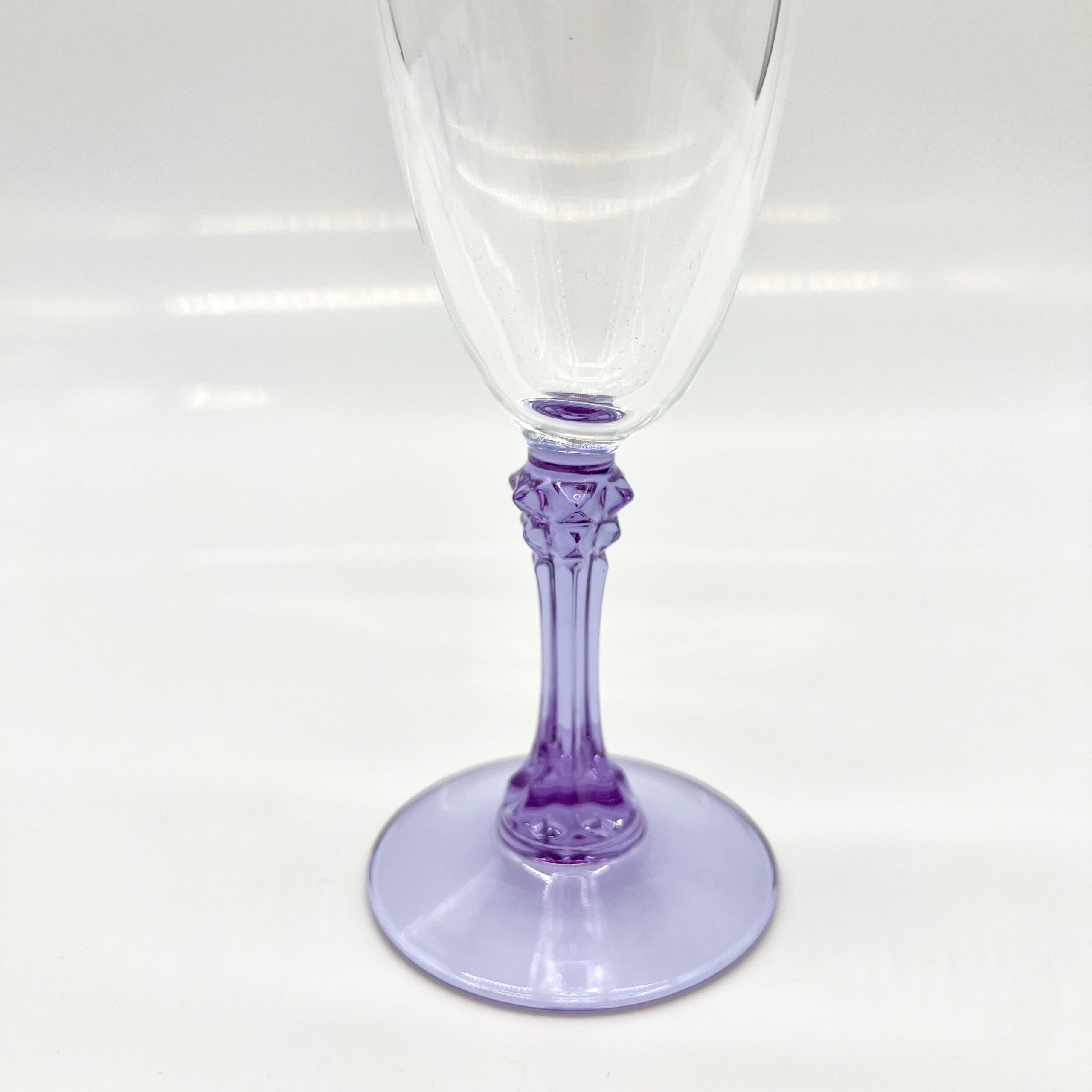 Élégant ensemble de six verres à pied en cristal d’Arques vintage, reconnaissables à leur jambe sculptée teintée d’un violet lumineux. Leur silhouette élancée, mêlant transparence cristalline et couleur subtile, apporte une touche raffinée à une scénographie colorée.