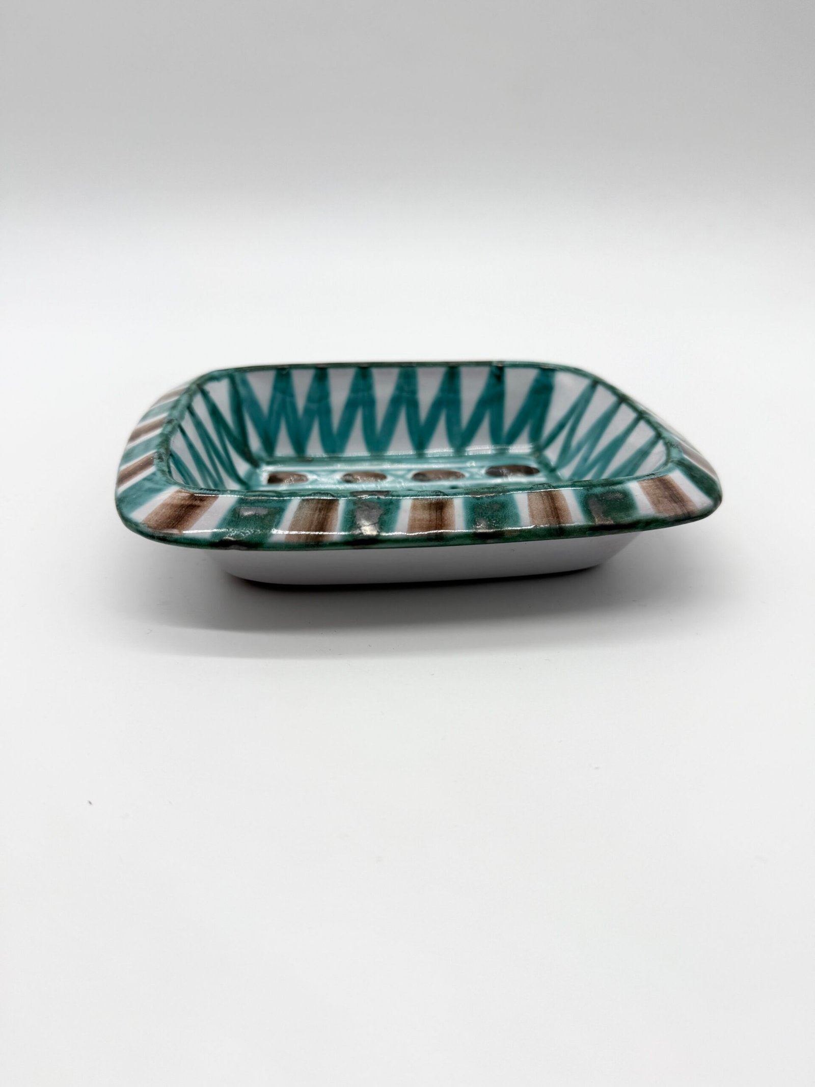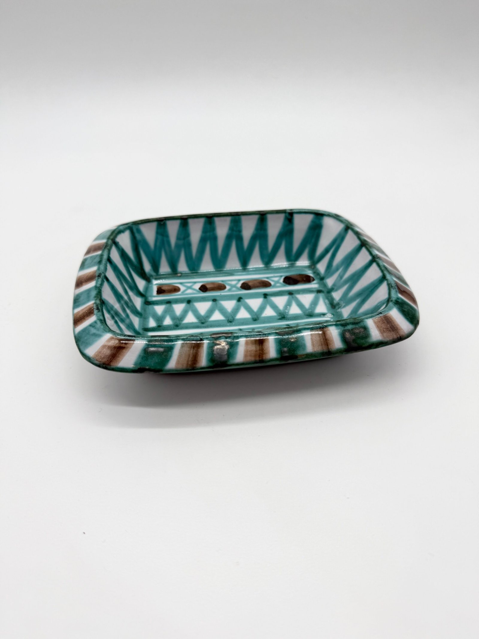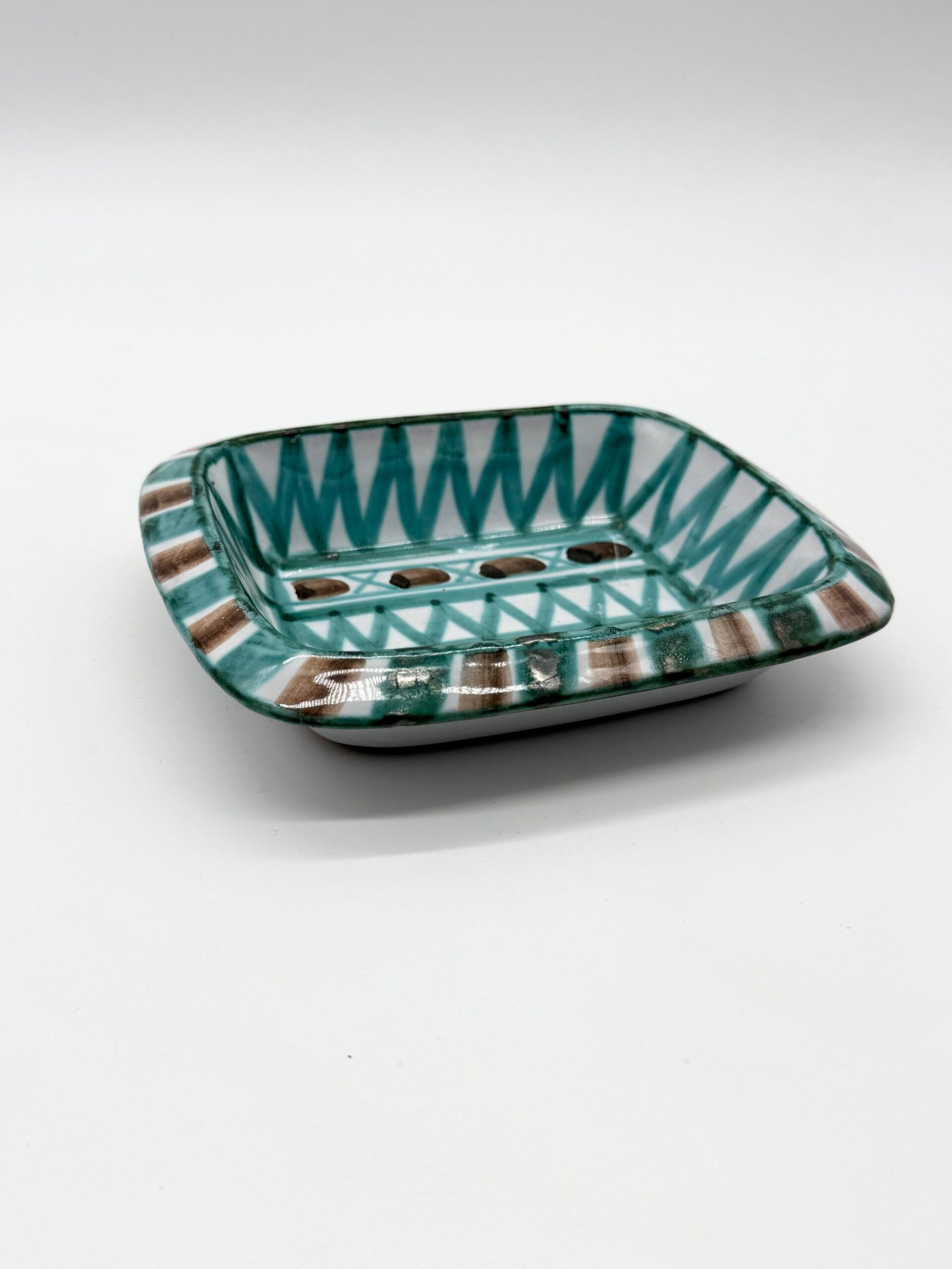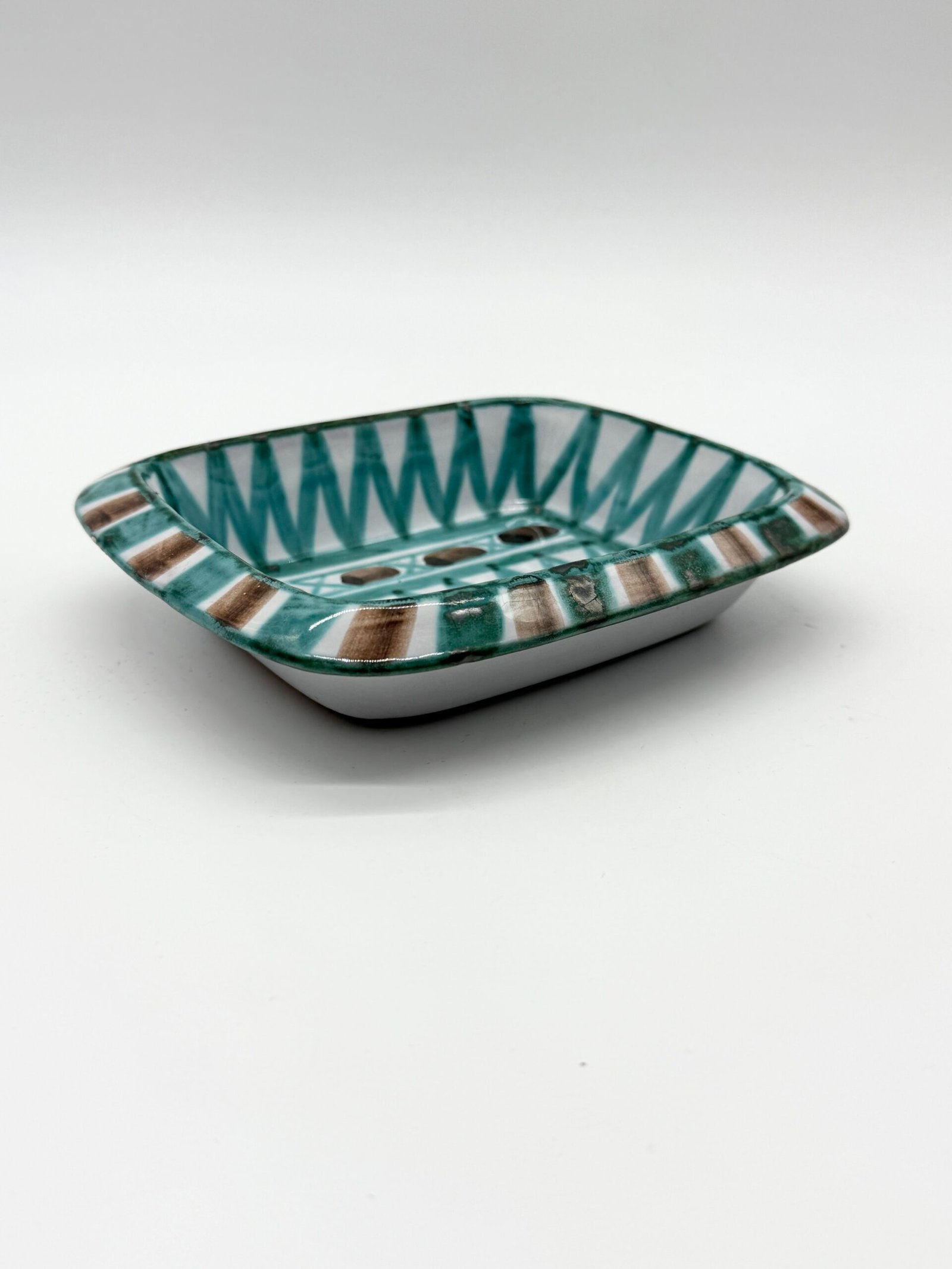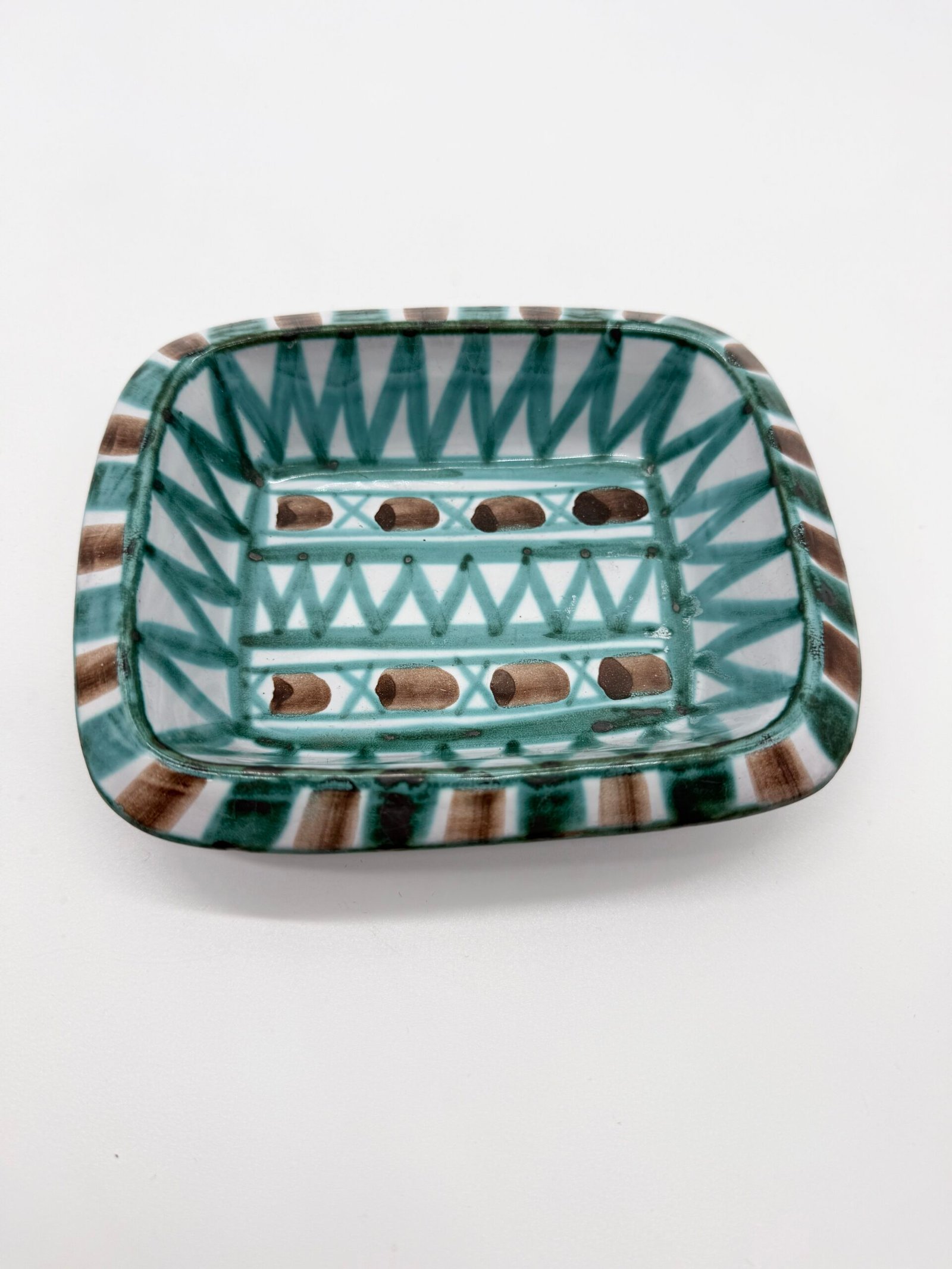 Vide-poche rectangulaire en céramique émaillée signé Robert Picault sous la base. La pièce présente un décor géométrique peint à la main composé de motifs triangulaires et de bandes stylisées, dans une palette caractéristique de verts et de bruns sur fond clair.