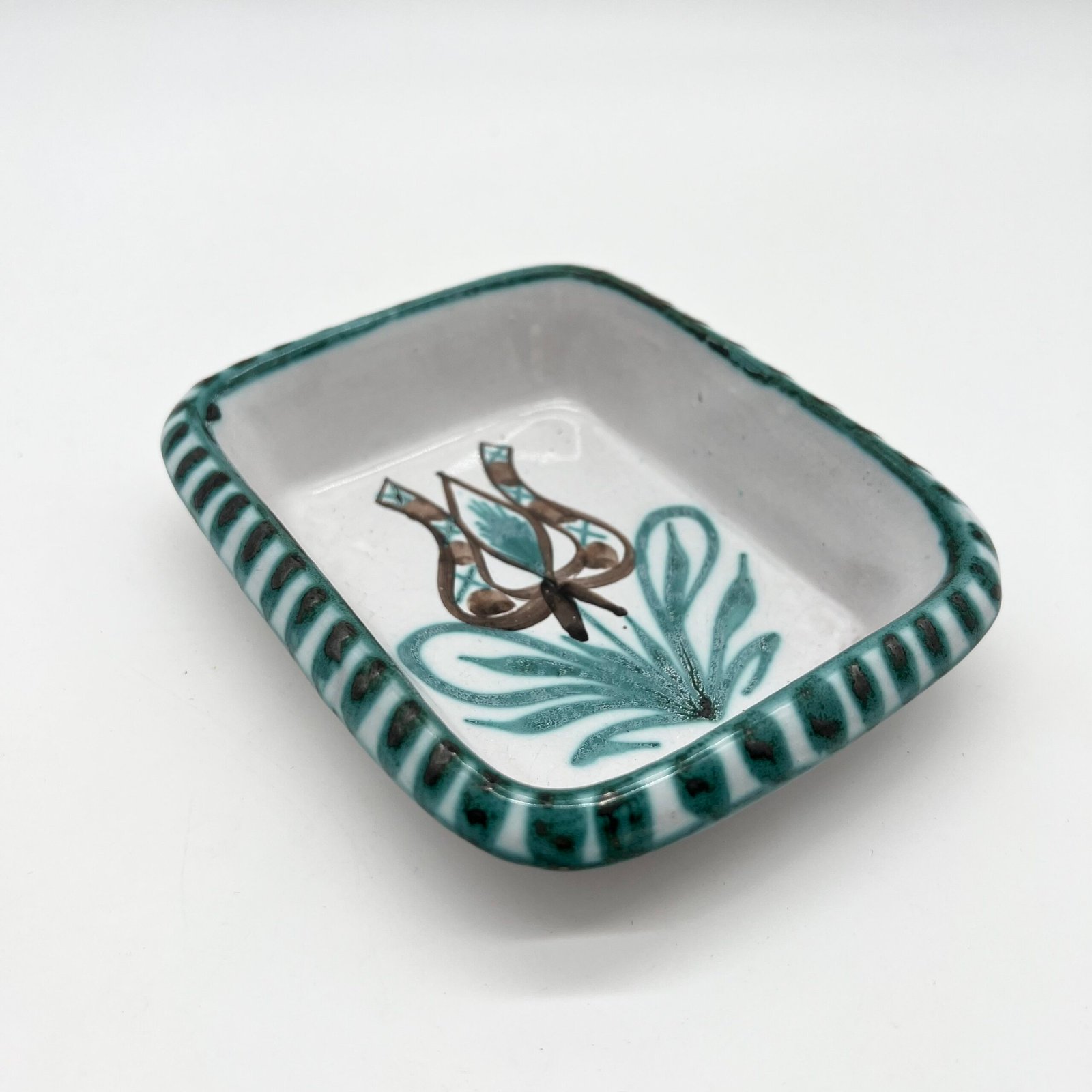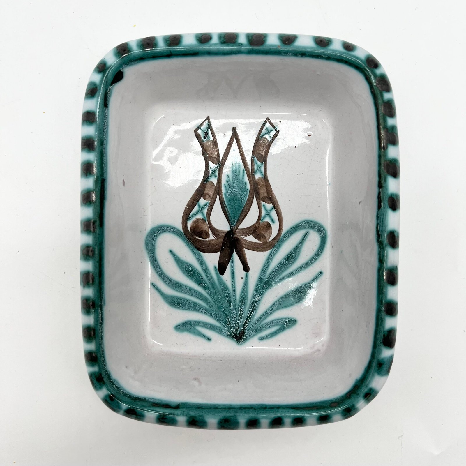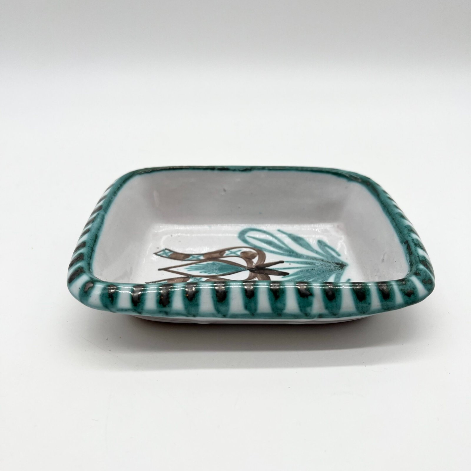 Charmant petit vide-poche rectangulaire en céramique signé Robert Picault, décoré d’un motif floral stylisé brun et vert sur fond blanc.