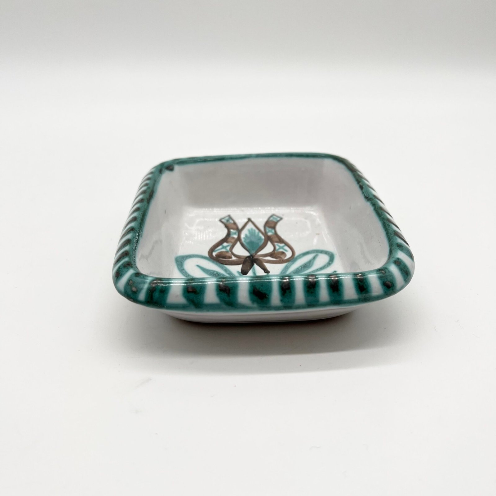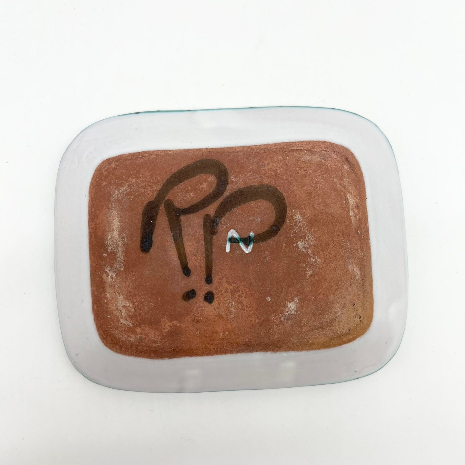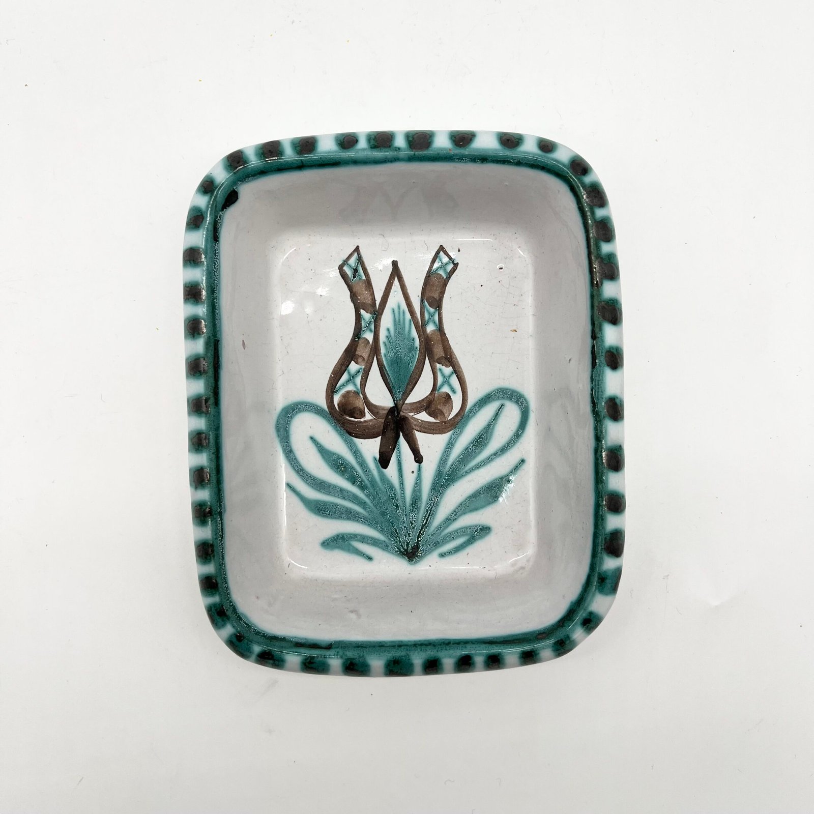 Charmant petit vide-poche rectangulaire en céramique signé Robert Picault, décoré d’un motif floral stylisé brun et vert sur fond blanc.